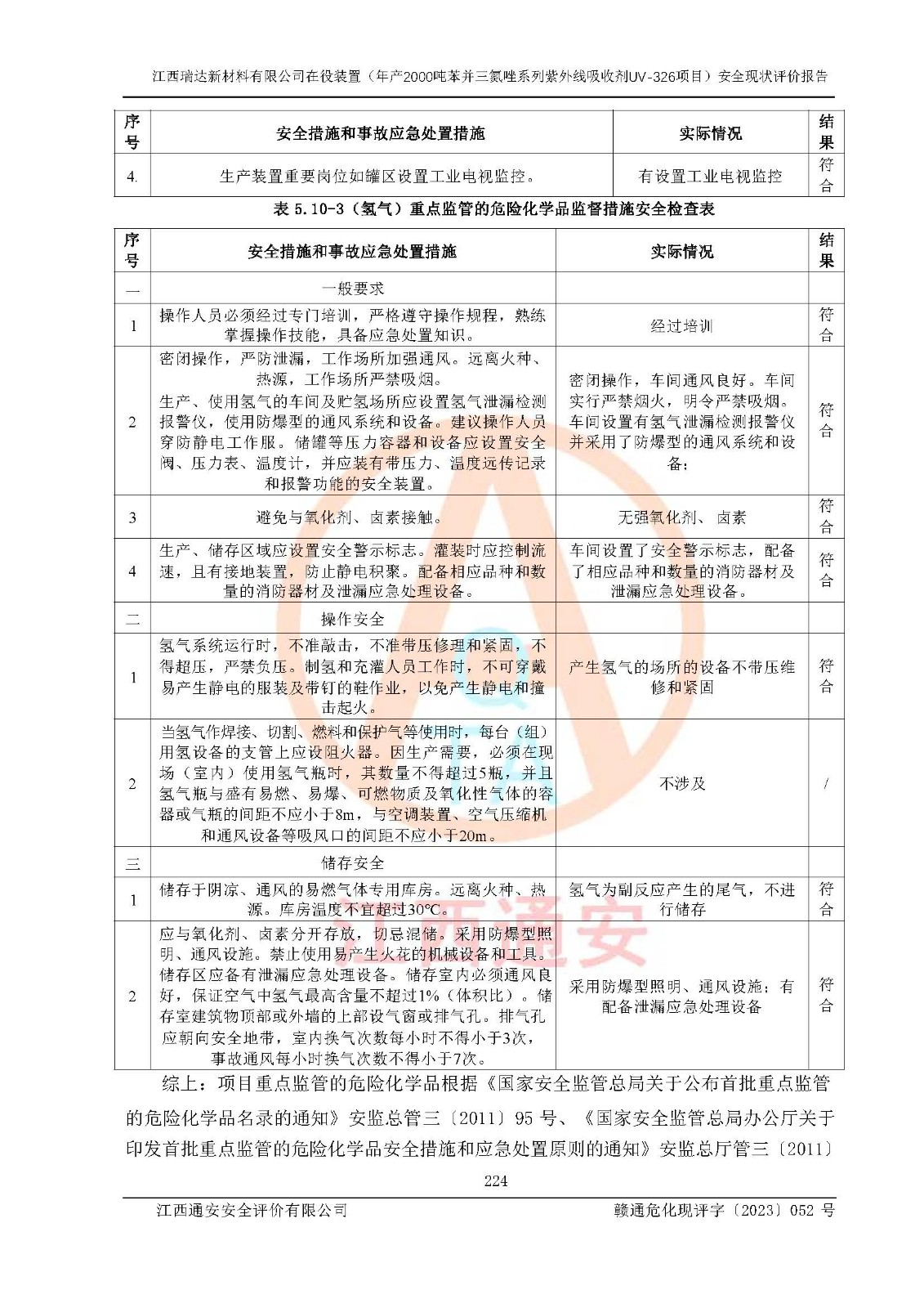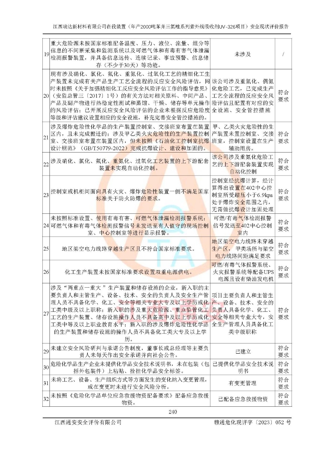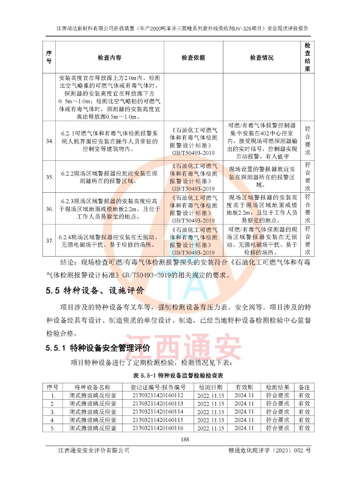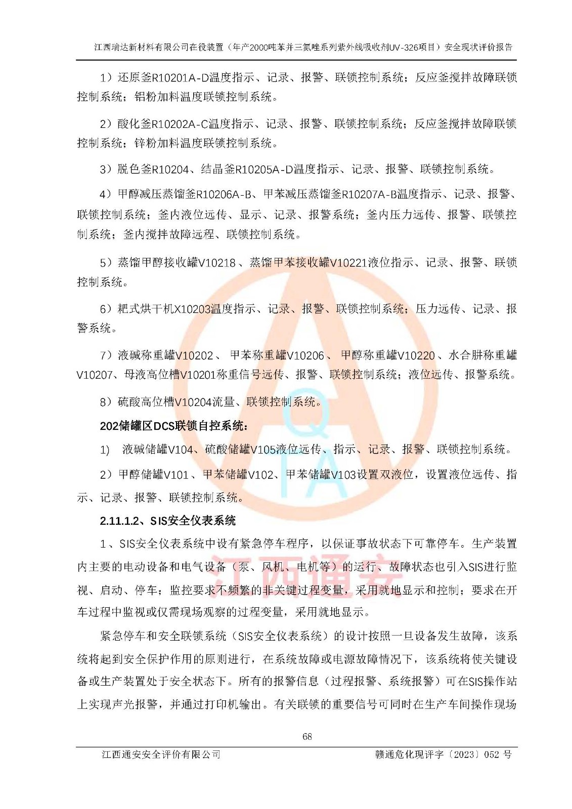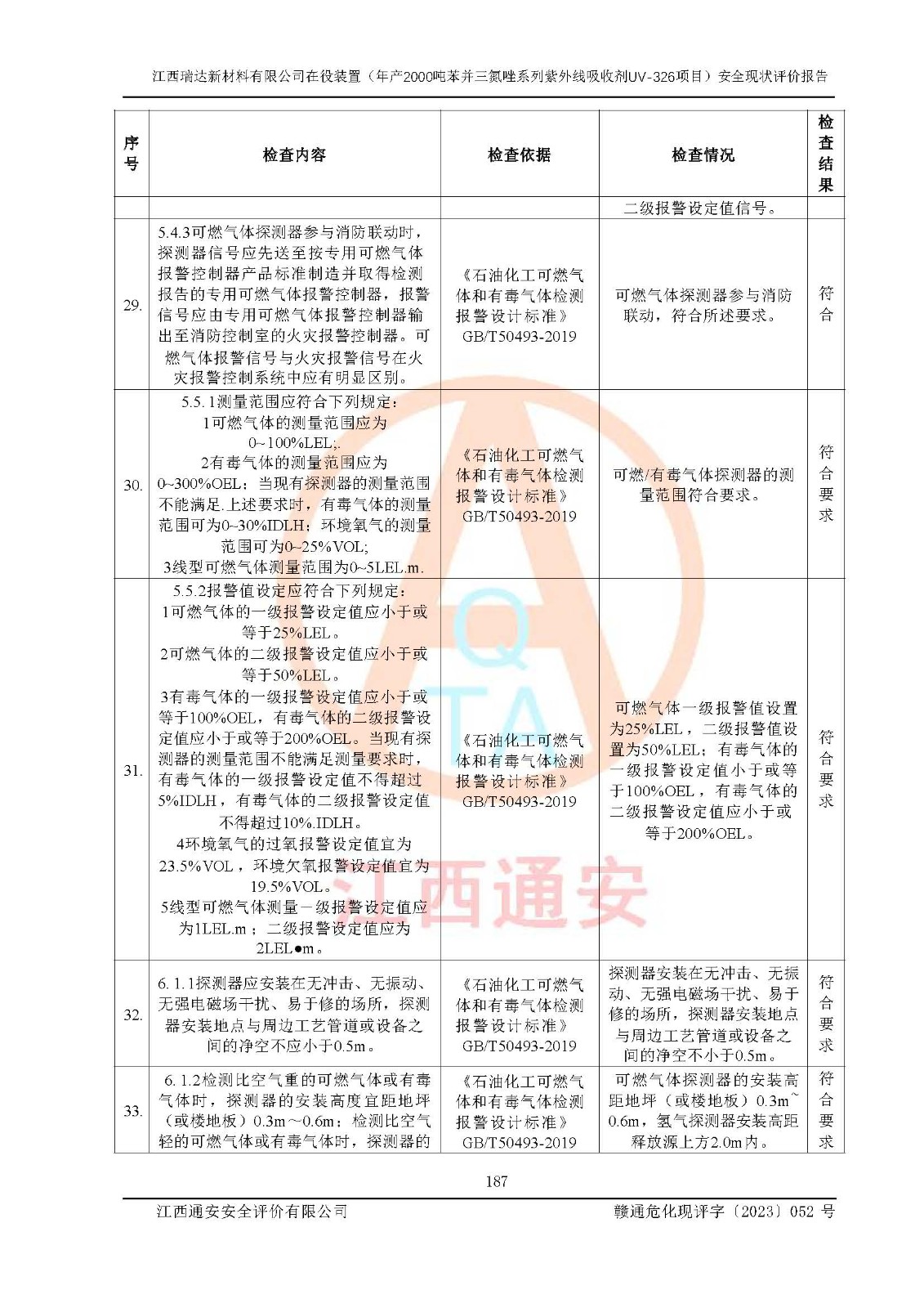 評價結(jié)論 | 1. 江西瑞達新材料有限公司年產(chǎn)2000噸苯并三氮唑系列紫外線吸收劑UV-326技術(shù)改造項目的安全設(shè)施與主體工程同時設(shè)計、同時施工、同時投入生產(chǎn)和使用,符合**有關(guān)建設(shè)項目“三同時”的規(guī)定和要求。 江西瑞達新材料有限公司年產(chǎn)2000噸苯并三氮唑系列紫外線吸收劑UV-326生產(chǎn)裝置技術(shù)改造項目符合永新縣茅坪化工產(chǎn)業(yè)園發(fā)展規(guī)劃的布局; 2. 該項目現(xiàn)場情況、企業(yè)總平面布置、設(shè)備設(shè)施的布置與設(shè)計圖、竣工圖紙一致,主體工程安全設(shè)施、安全措施符合法律法規(guī)的規(guī)定和要求,安全設(shè)施正常投用并運行**;供配電、給排水、供熱、空壓、供冷等公用工程及輔助設(shè)施滿足主體工程生產(chǎn)安全的需要;企業(yè)安全管理體系滿足生產(chǎn)安全的要求; 3. 總平面布置符合《建筑設(shè)計防火規(guī)范》GB50016-2014(2018年版)、《精細化工企業(yè)工程設(shè)計防火標準》GB51283-2020等標準、規(guī)范的要求; 4. DCS系統(tǒng)、SIS系統(tǒng)和可燃/有毒氣體報警系統(tǒng)等自動化控制系統(tǒng)設(shè)計符合《江西省應(yīng)急管理廳關(guān)于印發(fā)<江西省化工企業(yè)自動化提升實施方案>(試行)的通知》、《江西省危險化學品安全專項整治三年行動實施方案》要求,并已調(diào)試到位,自動化系統(tǒng)安裝單位出具了調(diào)試報告。目前DCS系統(tǒng)、SIS系統(tǒng)和可燃/有毒氣體報警系統(tǒng)已投入使用且運行正常; 5. 企業(yè)分管安全負責人、分管生產(chǎn)負責人、分管技術(shù)負責人、專職安全生產(chǎn)管理人員、危險工藝操作工等從業(yè)人員資格滿足《江西省危險化學品安全專項整治三年行動攻堅戰(zhàn)實施方案》要求; 6. 公司已針對本報告提出的安全隱患整改意見組織人員進行整改,整改措施已落實到位,企業(yè)安全生產(chǎn)的風險控制在可以接受的范圍內(nèi); 7. 該項目采用成熟的生產(chǎn)工藝和設(shè)備,本質(zhì)安全程度較高。 綜上所述:本報告認為,江西瑞達新材料有限公司年產(chǎn)2000噸苯并三氮唑系列紫外線吸收劑UV-326技術(shù)改造項目的生產(chǎn)裝置現(xiàn)場情況與設(shè)計圖紙一致,DCS和SIS系統(tǒng)設(shè)計符合要求且運行正常,有關(guān)從業(yè)人員資質(zhì)符合《江西省危險化學品安全專項整治三年行動實施方案》要求,安全設(shè)施及安全管理符合**及有關(guān)部門關(guān)于安全生產(chǎn)法律、法規(guī)、標準的要求,安全風險是受控制的,其風險程度是可以接受的,符合安全生產(chǎn)條件,能夠滿足安全生產(chǎn)的要求,具備安全設(shè)施“三同時”驗收條件。 | |||
