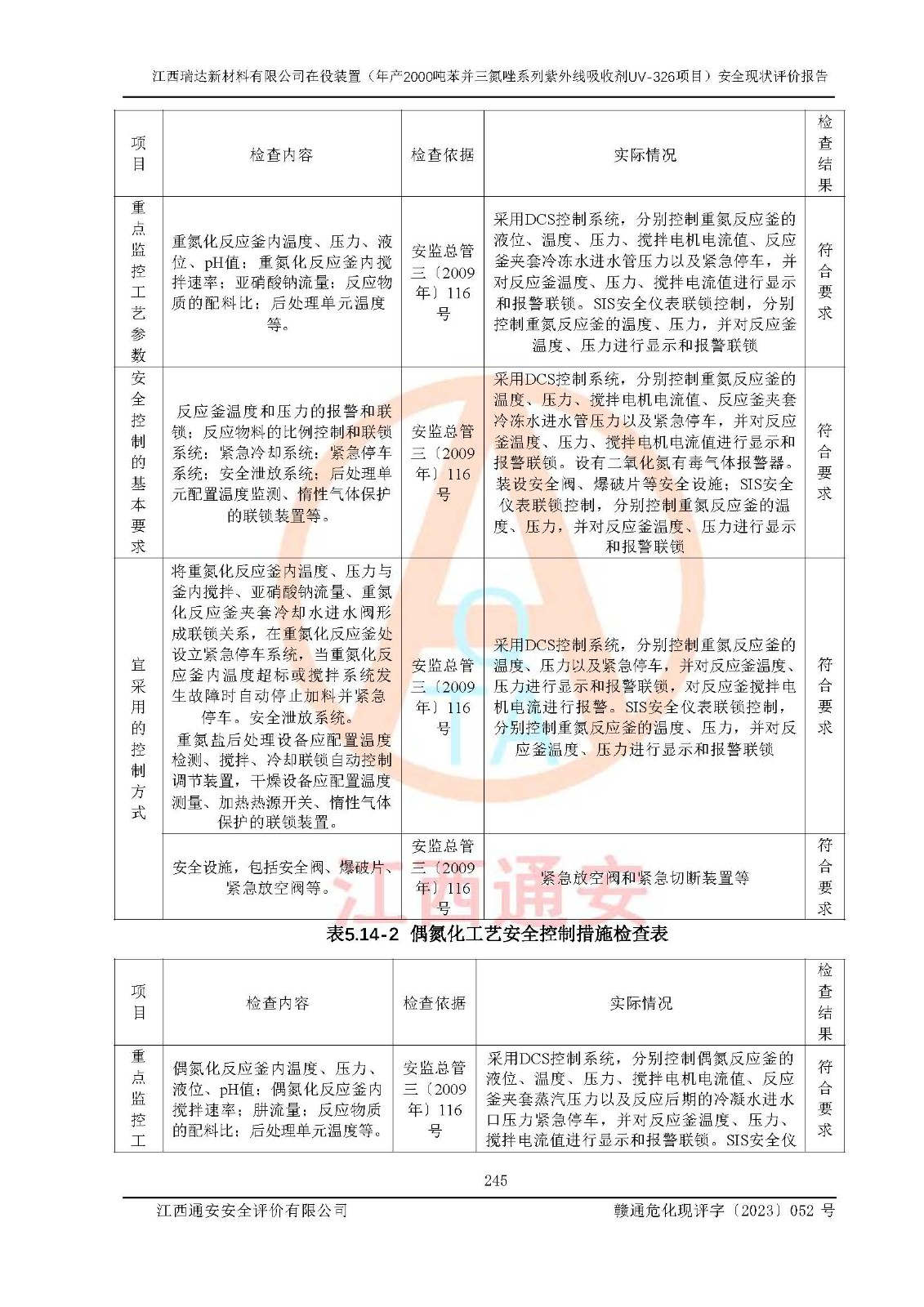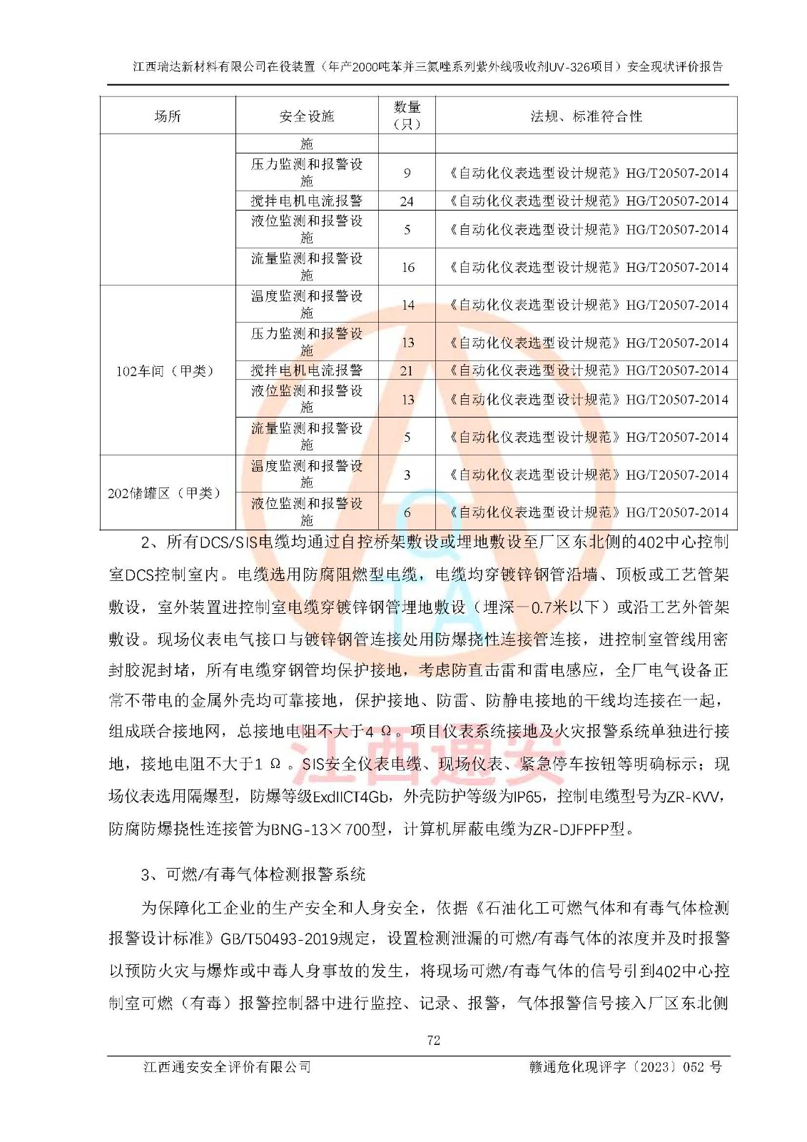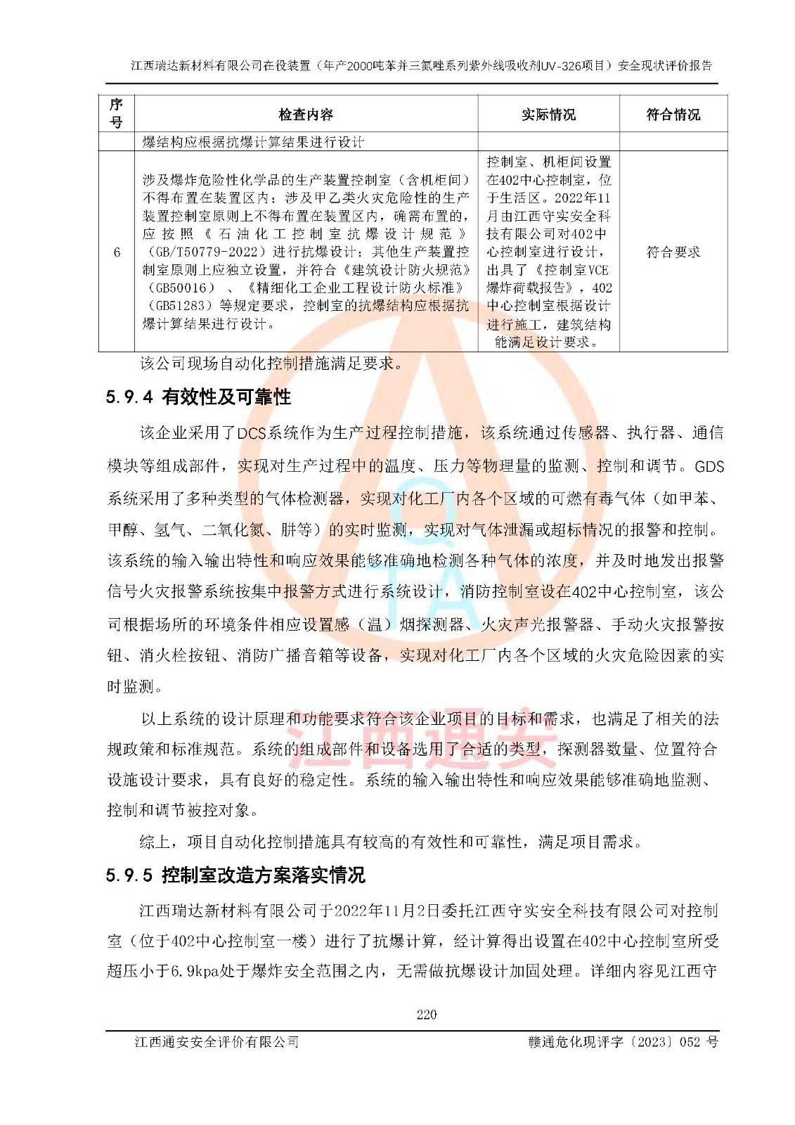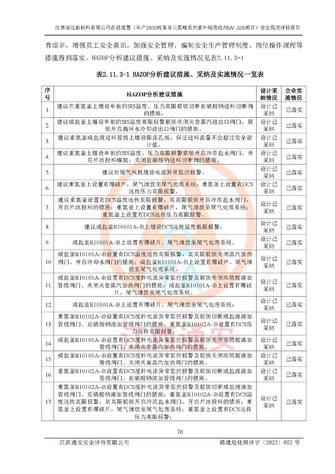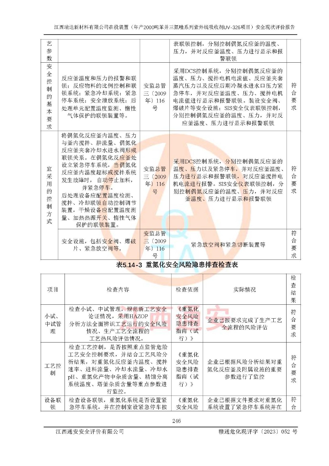 評價結(jié)論 | 1. 江西瑞達新材料有限公司年產(chǎn)2000噸苯并三氮唑系列紫外線吸收劑UV-326技術(shù)改造項目的安全設(shè)施與主體工程同時設(shè)計、同時施工、同時投入生產(chǎn)和使用,符合**有關(guān)建設(shè)項目“三同時”的規(guī)定和要求。 江西瑞達新材料有限公司年產(chǎn)2000噸苯并三氮唑系列紫外線吸收劑UV-326生產(chǎn)裝置技術(shù)改造項目符合永新縣茅坪化工產(chǎn)業(yè)園發(fā)展規(guī)劃的布局; 2. 該項目現(xiàn)場情況、企業(yè)總平面布置、設(shè)備設(shè)施的布置與設(shè)計圖、竣工圖紙一致,主體工程安全設(shè)施、安全措施符合法律法規(guī)的規(guī)定和要求,安全設(shè)施正常投用并運行**;供配電、給排水、供熱、空壓、供冷等公用工程及輔助設(shè)施滿足主體工程生產(chǎn)安全的需要;企業(yè)安全管理體系滿足生產(chǎn)安全的要求; 3. 總平面布置符合《建筑設(shè)計防火規(guī)范》GB50016-2014(2018年版)、《精細化工企業(yè)工程設(shè)計防火標準》GB51283-2020等標準、規(guī)范的要求; 4. DCS系統(tǒng)、SIS系統(tǒng)和可燃/有毒氣體報警系統(tǒng)等自動化控制系統(tǒng)設(shè)計符合《江西省應(yīng)急管理廳關(guān)于印發(fā)<江西省化工企業(yè)自動化提升實施方案>(試行)的通知》、《江西省危險化學品安全專項整治三年行動實施方案》要求,并已調(diào)試到位,自動化系統(tǒng)安裝單位出具了調(diào)試報告。目前DCS系統(tǒng)、SIS系統(tǒng)和可燃/有毒氣體報警系統(tǒng)已投入使用且運行正常; 5. 企業(yè)分管安全負責人、分管生產(chǎn)負責人、分管技術(shù)負責人、專職安全生產(chǎn)管理人員、危險工藝操作工等從業(yè)人員資格滿足《江西省危險化學品安全專項整治三年行動攻堅戰(zhàn)實施方案》要求; 6. 公司已針對本報告提出的安全隱患整改意見組織人員進行整改,整改措施已落實到位,企業(yè)安全生產(chǎn)的風險控制在可以接受的范圍內(nèi); 7. 該項目采用成熟的生產(chǎn)工藝和設(shè)備,本質(zhì)安全程度較高。 綜上所述:本報告認為,江西瑞達新材料有限公司年產(chǎn)2000噸苯并三氮唑系列紫外線吸收劑UV-326技術(shù)改造項目的生產(chǎn)裝置現(xiàn)場情況與設(shè)計圖紙一致,DCS和SIS系統(tǒng)設(shè)計符合要求且運行正常,有關(guān)從業(yè)人員資質(zhì)符合《江西省危險化學品安全專項整治三年行動實施方案》要求,安全設(shè)施及安全管理符合**及有關(guān)部門關(guān)于安全生產(chǎn)法律、法規(guī)、標準的要求,安全風險是受控制的,其風險程度是可以接受的,符合安全生產(chǎn)條件,能夠滿足安全生產(chǎn)的要求,具備安全設(shè)施“三同時”驗收條件。 | |||