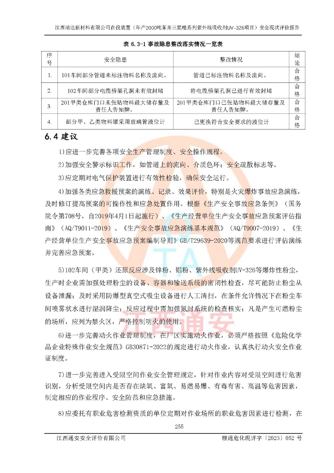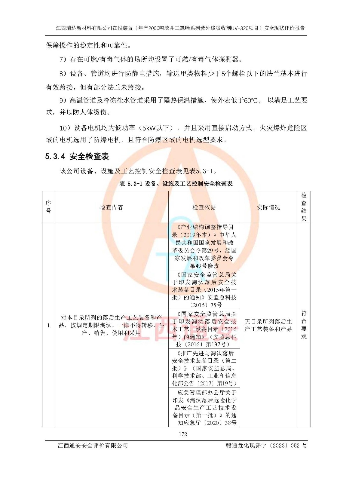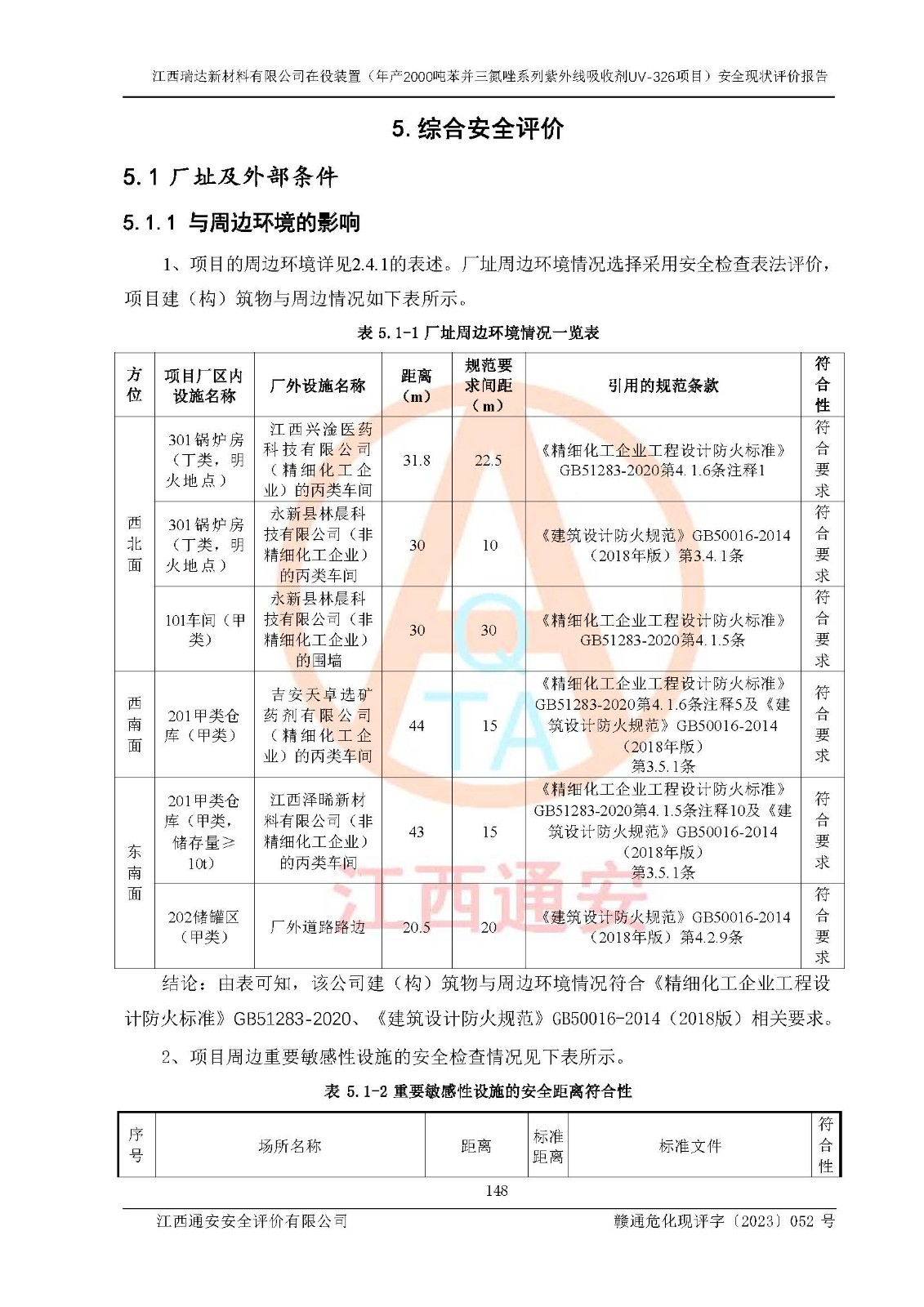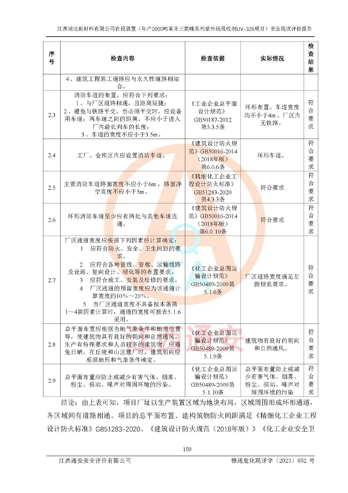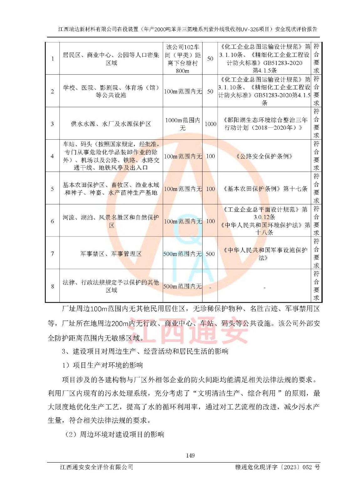 評價結(jié)論 | 1. 江西瑞達新材料有限公司年產(chǎn)2000噸苯并三氮唑系列紫外線吸收劑UV-326技術(shù)改造項目的安全設(shè)施與主體工程同時設(shè)計、同時施工、同時投入生產(chǎn)和使用,符合**有關(guān)建設(shè)項目“三同時”的規(guī)定和要求。 江西瑞達新材料有限公司年產(chǎn)2000噸苯并三氮唑系列紫外線吸收劑UV-326生產(chǎn)裝置技術(shù)改造項目符合永新縣茅坪化工產(chǎn)業(yè)園發(fā)展規(guī)劃的布局; 2. 該項目現(xiàn)場情況、企業(yè)總平面布置、設(shè)備設(shè)施的布置與設(shè)計圖、竣工圖紙一致,主體工程安全設(shè)施、安全措施符合法律法規(guī)的規(guī)定和要求,安全設(shè)施正常投用并運行**;供配電、給排水、供熱、空壓、供冷等公用工程及輔助設(shè)施滿足主體工程生產(chǎn)安全的需要;企業(yè)安全管理體系滿足生產(chǎn)安全的要求; 3. 總平面布置符合《建筑設(shè)計防火規(guī)范》GB50016-2014(2018年版)、《精細化工企業(yè)工程設(shè)計防火標準》GB51283-2020等標準、規(guī)范的要求; 4. DCS系統(tǒng)、SIS系統(tǒng)和可燃/有毒氣體報警系統(tǒng)等自動化控制系統(tǒng)設(shè)計符合《江西省應(yīng)急管理廳關(guān)于印發(fā)<江西省化工企業(yè)自動化提升實施方案>(試行)的通知》、《江西省危險化學品安全專項整治三年行動實施方案》要求,并已調(diào)試到位,自動化系統(tǒng)安裝單位出具了調(diào)試報告。目前DCS系統(tǒng)、SIS系統(tǒng)和可燃/有毒氣體報警系統(tǒng)已投入使用且運行正常; 5. 企業(yè)分管安全負責人、分管生產(chǎn)負責人、分管技術(shù)負責人、專職安全生產(chǎn)管理人員、危險工藝操作工等從業(yè)人員資格滿足《江西省危險化學品安全專項整治三年行動攻堅戰(zhàn)實施方案》要求; 6. 公司已針對本報告提出的安全隱患整改意見組織人員進行整改,整改措施已落實到位,企業(yè)安全生產(chǎn)的風險控制在可以接受的范圍內(nèi); 7. 該項目采用成熟的生產(chǎn)工藝和設(shè)備,本質(zhì)安全程度較高。 綜上所述:本報告認為,江西瑞達新材料有限公司年產(chǎn)2000噸苯并三氮唑系列紫外線吸收劑UV-326技術(shù)改造項目的生產(chǎn)裝置現(xiàn)場情況與設(shè)計圖紙一致,DCS和SIS系統(tǒng)設(shè)計符合要求且運行正常,有關(guān)從業(yè)人員資質(zhì)符合《江西省危險化學品安全專項整治三年行動實施方案》要求,安全設(shè)施及安全管理符合**及有關(guān)部門關(guān)于安全生產(chǎn)法律、法規(guī)、標準的要求,安全風險是受控制的,其風險程度是可以接受的,符合安全生產(chǎn)條件,能夠滿足安全生產(chǎn)的要求,具備安全設(shè)施“三同時”驗收條件。 | |||
