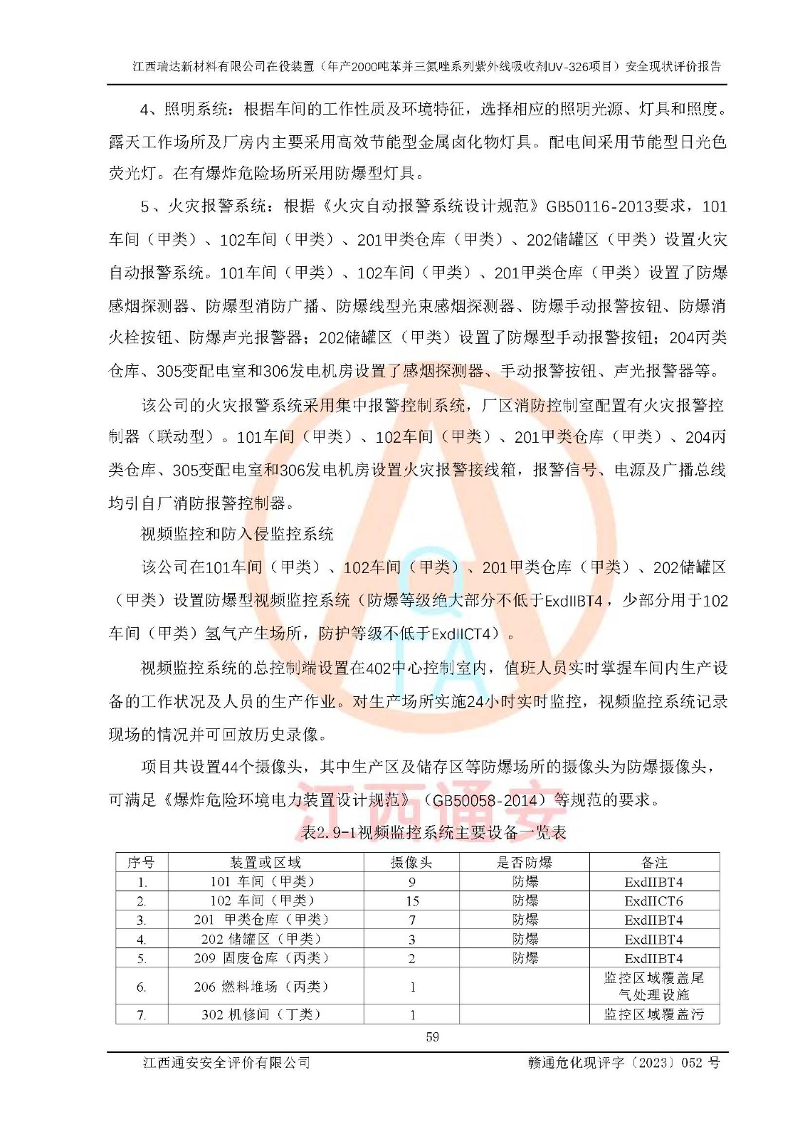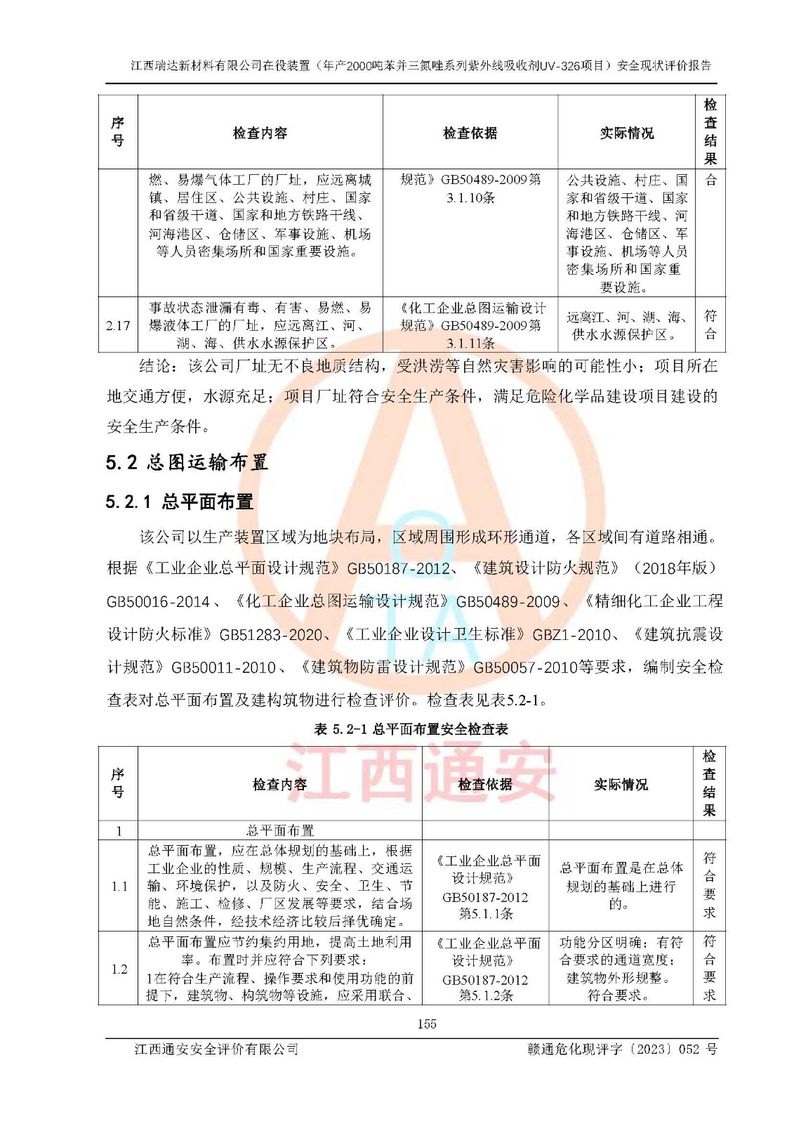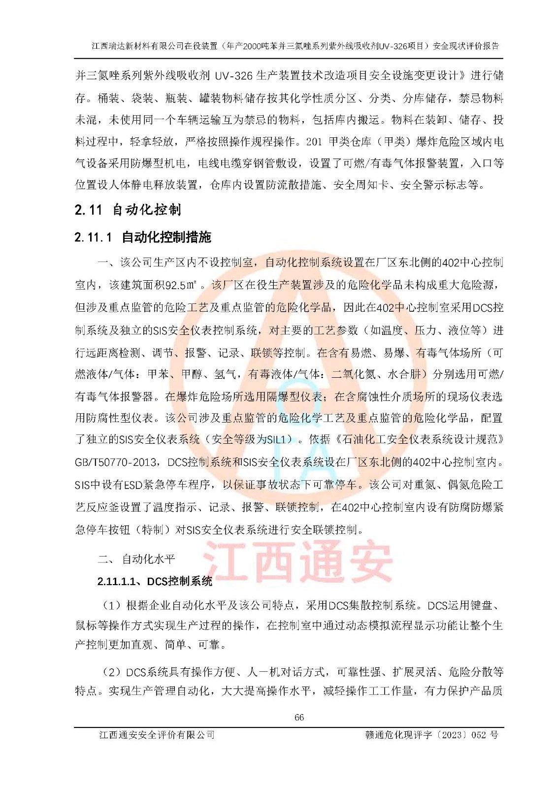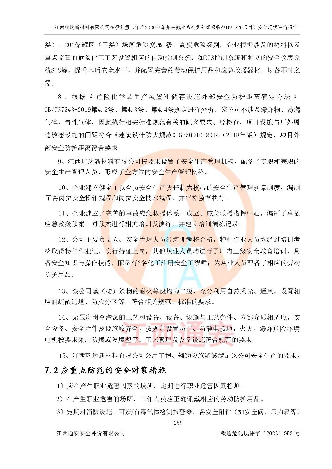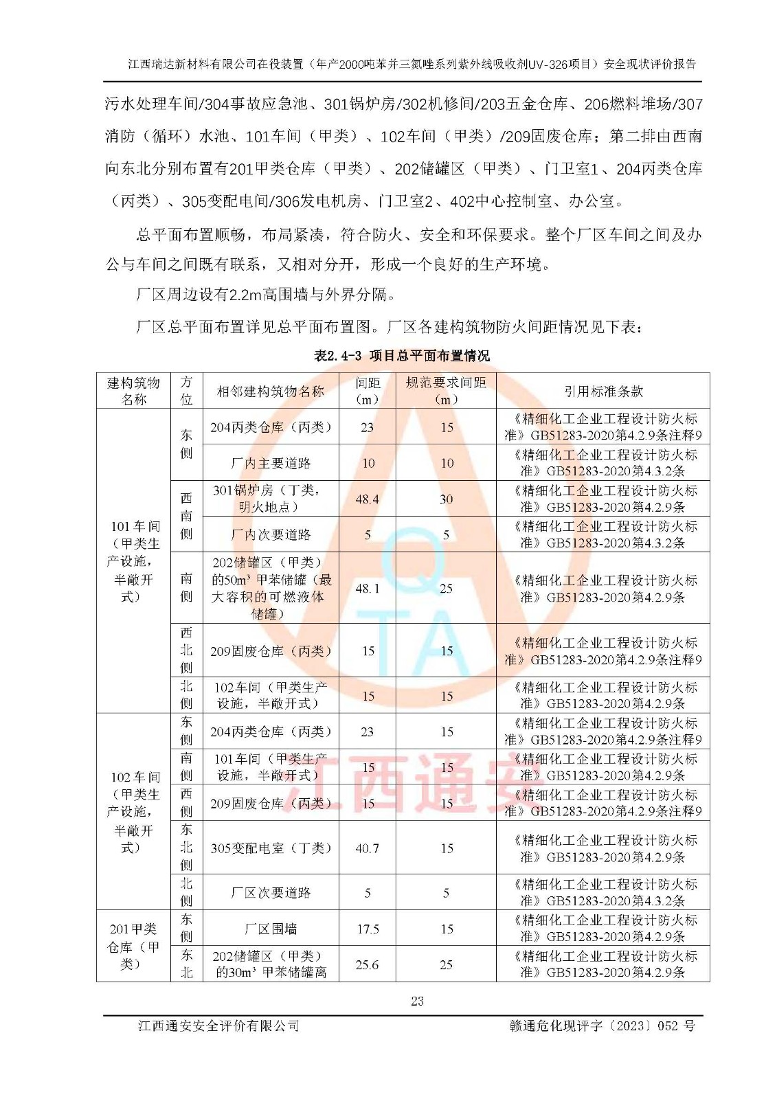 評價結(jié)論 | 1. 江西瑞達新材料有限公司年產(chǎn)2000噸苯并三氮唑系列紫外線吸收劑UV-326技術(shù)改造項目的安全設(shè)施與主體工程同時設(shè)計、同時施工、同時投入生產(chǎn)和使用,符合**有關(guān)建設(shè)項目“三同時”的規(guī)定和要求。 江西瑞達新材料有限公司年產(chǎn)2000噸苯并三氮唑系列紫外線吸收劑UV-326生產(chǎn)裝置技術(shù)改造項目符合永新縣茅坪化工產(chǎn)業(yè)園發(fā)展規(guī)劃的布局; 2. 該項目現(xiàn)場情況、企業(yè)總平面布置、設(shè)備設(shè)施的布置與設(shè)計圖、竣工圖紙一致,主體工程安全設(shè)施、安全措施符合法律法規(guī)的規(guī)定和要求,安全設(shè)施正常投用并運行**;供配電、給排水、供熱、空壓、供冷等公用工程及輔助設(shè)施滿足主體工程生產(chǎn)安全的需要;企業(yè)安全管理體系滿足生產(chǎn)安全的要求; 3. 總平面布置符合《建筑設(shè)計防火規(guī)范》GB50016-2014(2018年版)、《精細化工企業(yè)工程設(shè)計防火標準》GB51283-2020等標準、規(guī)范的要求; 4. DCS系統(tǒng)、SIS系統(tǒng)和可燃/有毒氣體報警系統(tǒng)等自動化控制系統(tǒng)設(shè)計符合《江西省應(yīng)急管理廳關(guān)于印發(fā)<江西省化工企業(yè)自動化提升實施方案>(試行)的通知》、《江西省危險化學品安全專項整治三年行動實施方案》要求,并已調(diào)試到位,自動化系統(tǒng)安裝單位出具了調(diào)試報告。目前DCS系統(tǒng)、SIS系統(tǒng)和可燃/有毒氣體報警系統(tǒng)已投入使用且運行正常; 5. 企業(yè)分管安全負責人、分管生產(chǎn)負責人、分管技術(shù)負責人、專職安全生產(chǎn)管理人員、危險工藝操作工等從業(yè)人員資格滿足《江西省危險化學品安全專項整治三年行動攻堅戰(zhàn)實施方案》要求; 6. 公司已針對本報告提出的安全隱患整改意見組織人員進行整改,整改措施已落實到位,企業(yè)安全生產(chǎn)的風險控制在可以接受的范圍內(nèi); 7. 該項目采用成熟的生產(chǎn)工藝和設(shè)備,本質(zhì)安全程度較高。 綜上所述:本報告認為,江西瑞達新材料有限公司年產(chǎn)2000噸苯并三氮唑系列紫外線吸收劑UV-326技術(shù)改造項目的生產(chǎn)裝置現(xiàn)場情況與設(shè)計圖紙一致,DCS和SIS系統(tǒng)設(shè)計符合要求且運行正常,有關(guān)從業(yè)人員資質(zhì)符合《江西省危險化學品安全專項整治三年行動實施方案》要求,安全設(shè)施及安全管理符合**及有關(guān)部門關(guān)于安全生產(chǎn)法律、法規(guī)、標準的要求,安全風險是受控制的,其風險程度是可以接受的,符合安全生產(chǎn)條件,能夠滿足安全生產(chǎn)的要求,具備安全設(shè)施“三同時”驗收條件。 | |||