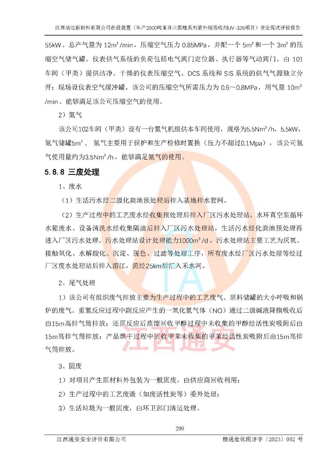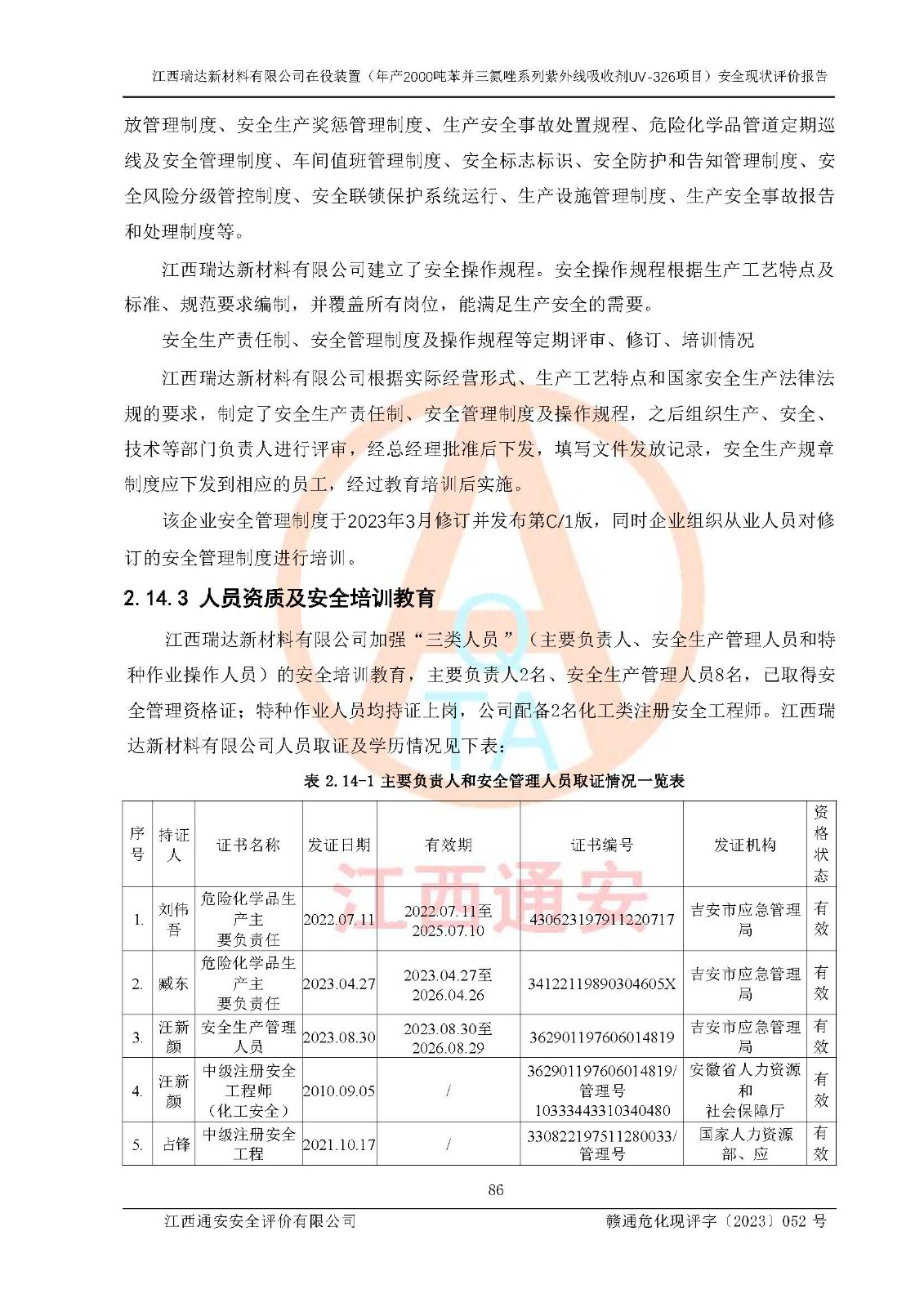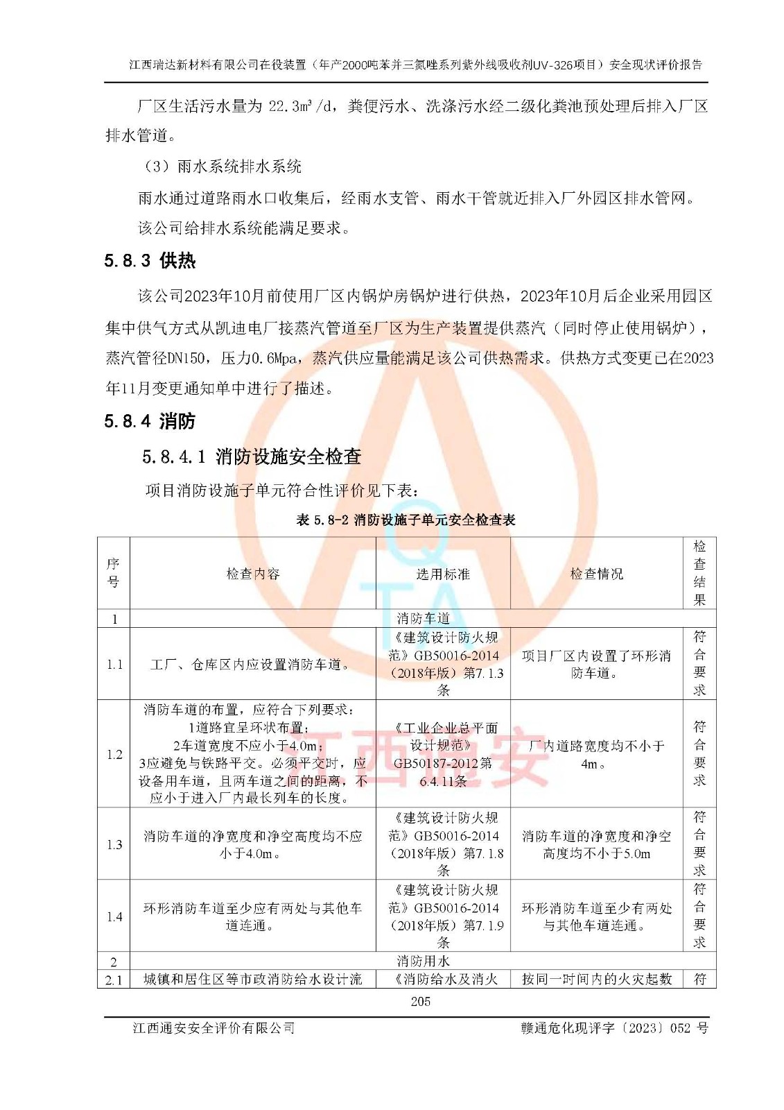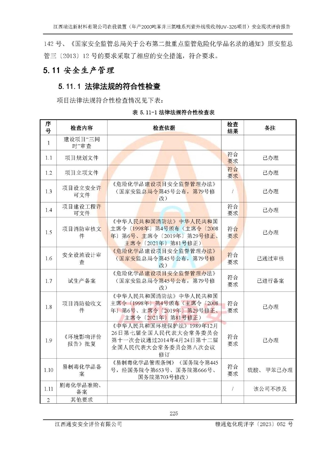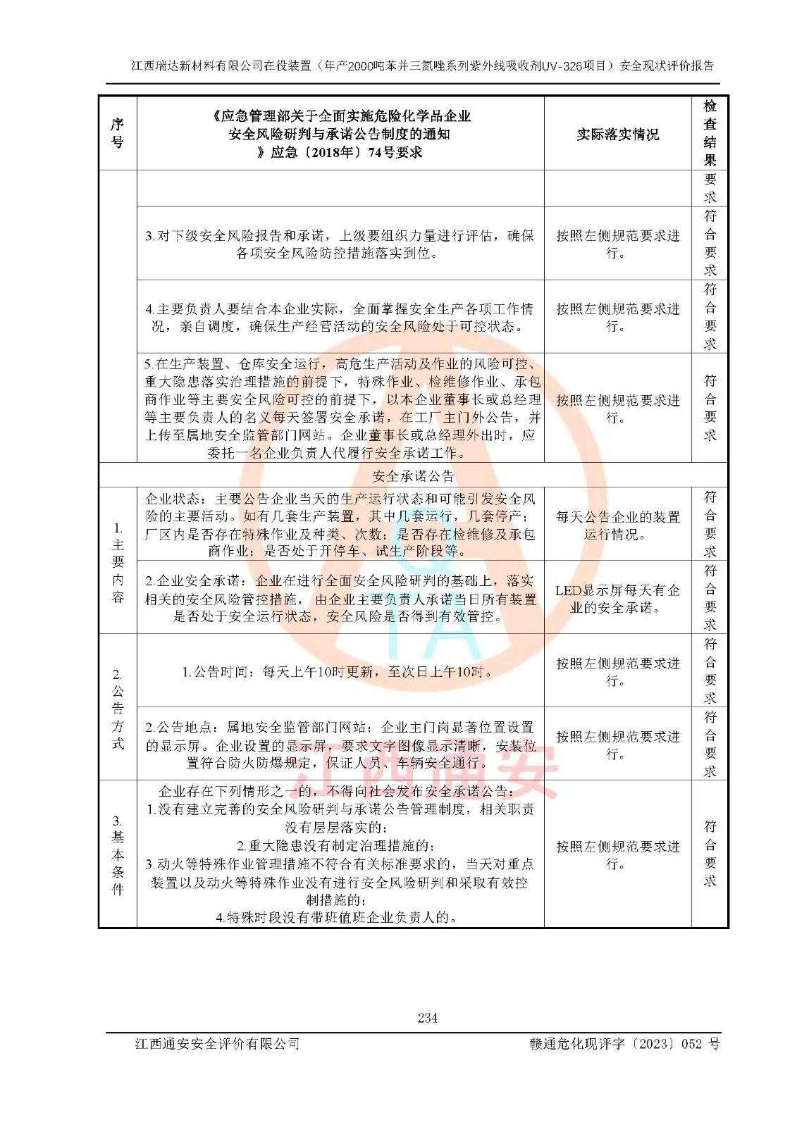 評價結(jié)論 | 1. 江西瑞達新材料有限公司年產(chǎn)2000噸苯并三氮唑系列紫外線吸收劑UV-326技術(shù)改造項目的安全設(shè)施與主體工程同時設(shè)計、同時施工、同時投入生產(chǎn)和使用,符合**有關(guān)建設(shè)項目“三同時”的規(guī)定和要求。 江西瑞達新材料有限公司年產(chǎn)2000噸苯并三氮唑系列紫外線吸收劑UV-326生產(chǎn)裝置技術(shù)改造項目符合永新縣茅坪化工產(chǎn)業(yè)園發(fā)展規(guī)劃的布局; 2. 該項目現(xiàn)場情況、企業(yè)總平面布置、設(shè)備設(shè)施的布置與設(shè)計圖、竣工圖紙一致,主體工程安全設(shè)施、安全措施符合法律法規(guī)的規(guī)定和要求,安全設(shè)施正常投用并運行**;供配電、給排水、供熱、空壓、供冷等公用工程及輔助設(shè)施滿足主體工程生產(chǎn)安全的需要;企業(yè)安全管理體系滿足生產(chǎn)安全的要求; 3. 總平面布置符合《建筑設(shè)計防火規(guī)范》GB50016-2014(2018年版)、《精細化工企業(yè)工程設(shè)計防火標準》GB51283-2020等標準、規(guī)范的要求; 4. DCS系統(tǒng)、SIS系統(tǒng)和可燃/有毒氣體報警系統(tǒng)等自動化控制系統(tǒng)設(shè)計符合《江西省應(yīng)急管理廳關(guān)于印發(fā)<江西省化工企業(yè)自動化提升實施方案>(試行)的通知》、《江西省危險化學品安全專項整治三年行動實施方案》要求,并已調(diào)試到位,自動化系統(tǒng)安裝單位出具了調(diào)試報告。目前DCS系統(tǒng)、SIS系統(tǒng)和可燃/有毒氣體報警系統(tǒng)已投入使用且運行正常; 5. 企業(yè)分管安全負責人、分管生產(chǎn)負責人、分管技術(shù)負責人、專職安全生產(chǎn)管理人員、危險工藝操作工等從業(yè)人員資格滿足《江西省危險化學品安全專項整治三年行動攻堅戰(zhàn)實施方案》要求; 6. 公司已針對本報告提出的安全隱患整改意見組織人員進行整改,整改措施已落實到位,企業(yè)安全生產(chǎn)的風險控制在可以接受的范圍內(nèi); 7. 該項目采用成熟的生產(chǎn)工藝和設(shè)備,本質(zhì)安全程度較高。 綜上所述:本報告認為,江西瑞達新材料有限公司年產(chǎn)2000噸苯并三氮唑系列紫外線吸收劑UV-326技術(shù)改造項目的生產(chǎn)裝置現(xiàn)場情況與設(shè)計圖紙一致,DCS和SIS系統(tǒng)設(shè)計符合要求且運行正常,有關(guān)從業(yè)人員資質(zhì)符合《江西省危險化學品安全專項整治三年行動實施方案》要求,安全設(shè)施及安全管理符合**及有關(guān)部門關(guān)于安全生產(chǎn)法律、法規(guī)、標準的要求,安全風險是受控制的,其風險程度是可以接受的,符合安全生產(chǎn)條件,能夠滿足安全生產(chǎn)的要求,具備安全設(shè)施“三同時”驗收條件。 | |||