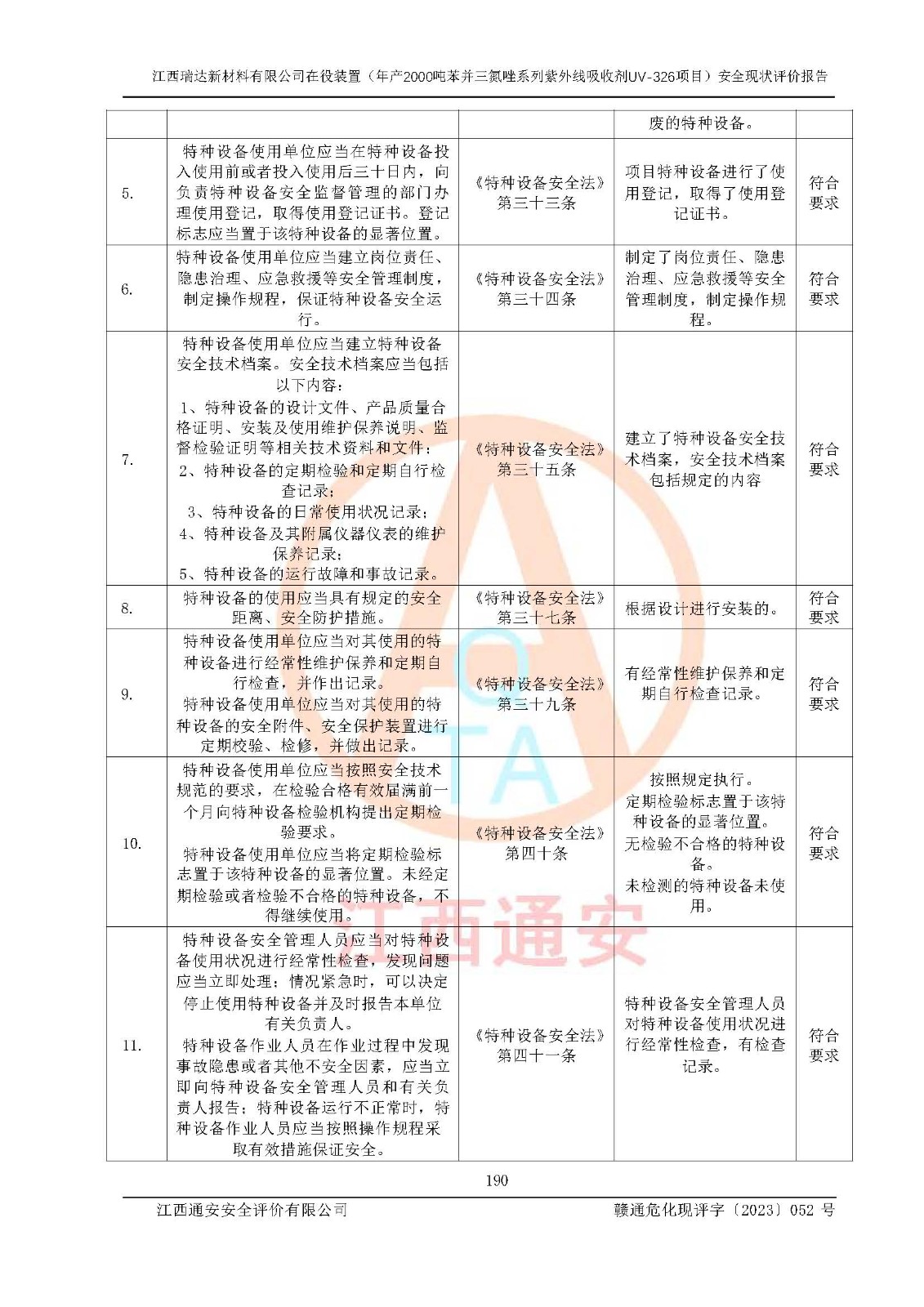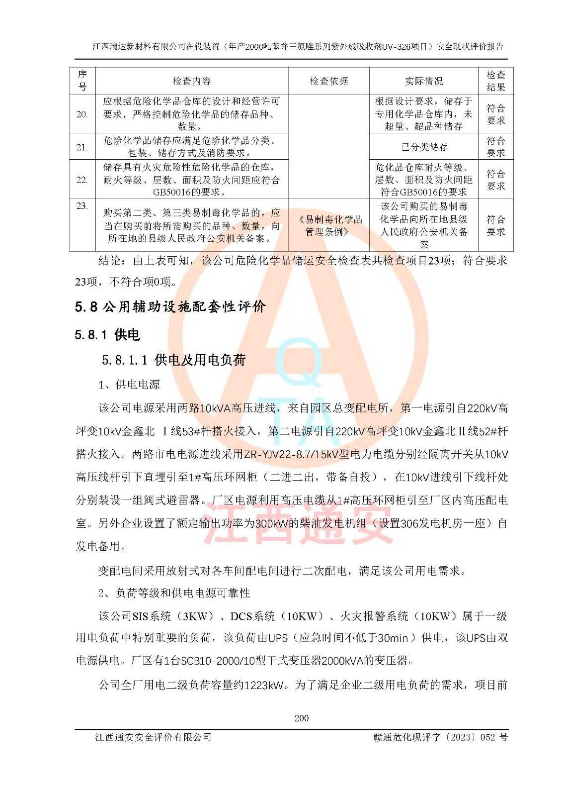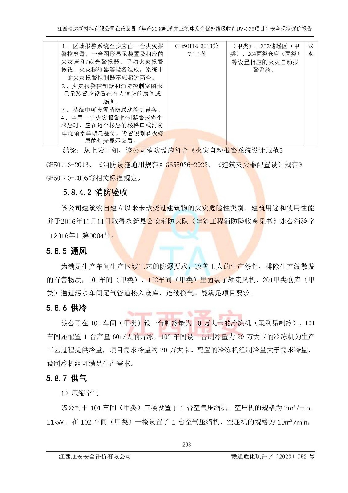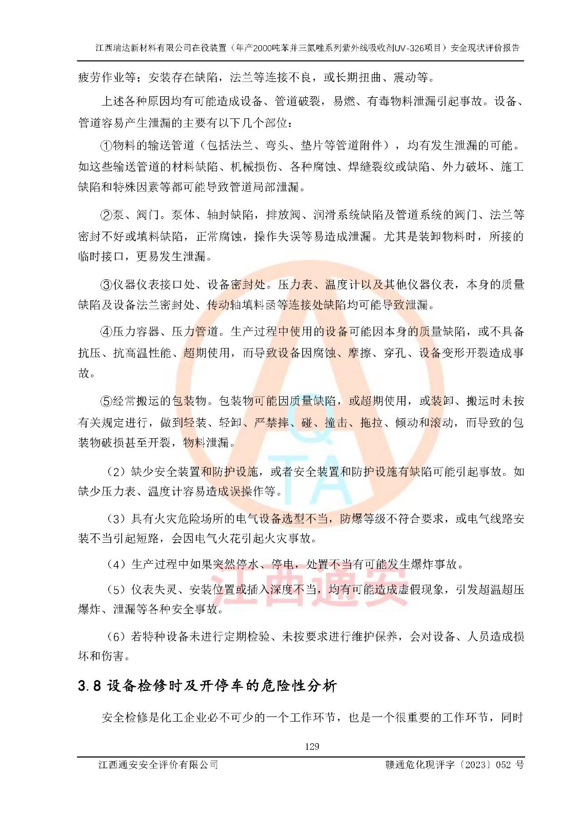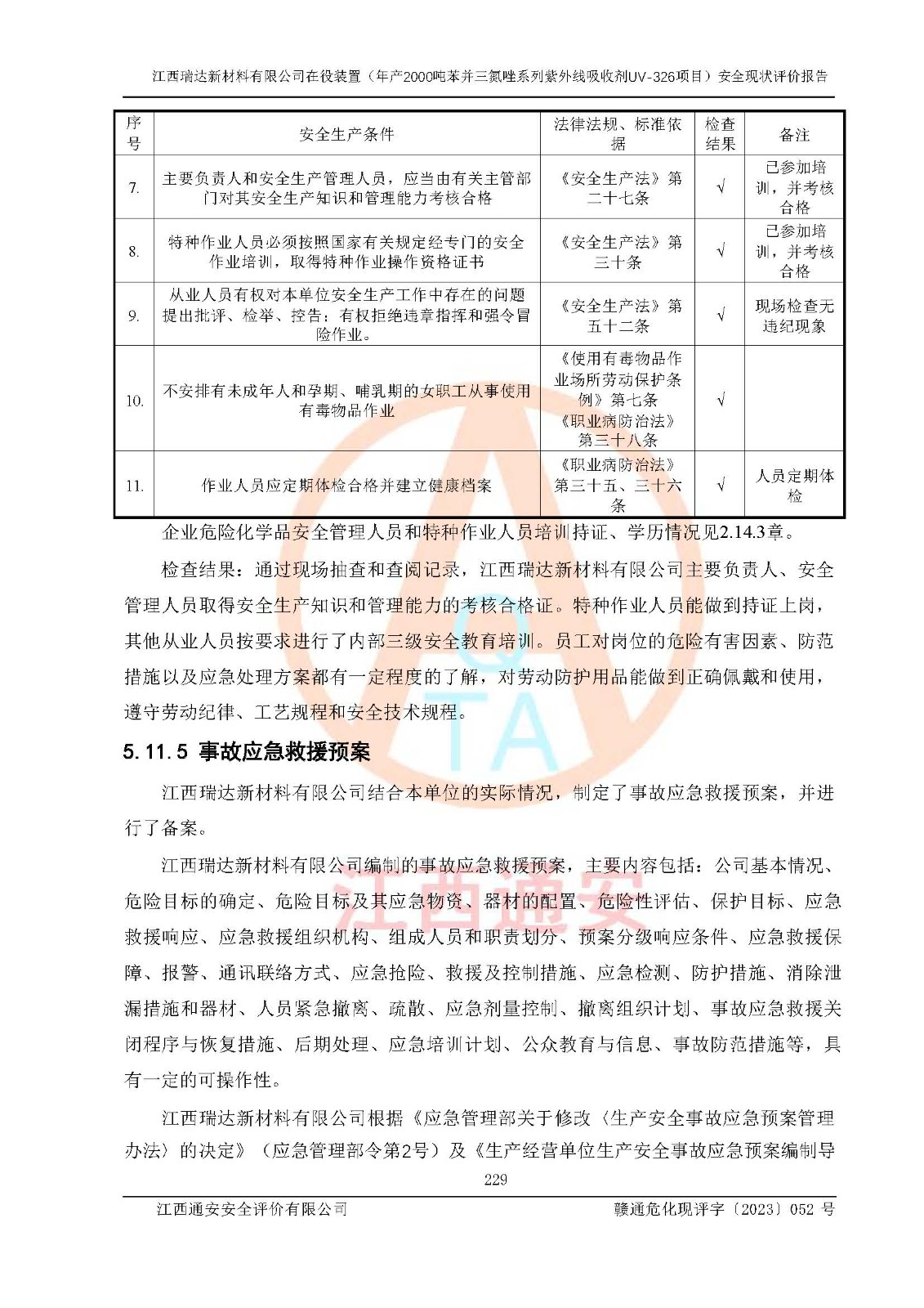 評價結(jié)論 | 1. 江西瑞達新材料有限公司年產(chǎn)2000噸苯并三氮唑系列紫外線吸收劑UV-326技術(shù)改造項目的安全設(shè)施與主體工程同時設(shè)計、同時施工、同時投入生產(chǎn)和使用,符合**有關(guān)建設(shè)項目“三同時”的規(guī)定和要求。 江西瑞達新材料有限公司年產(chǎn)2000噸苯并三氮唑系列紫外線吸收劑UV-326生產(chǎn)裝置技術(shù)改造項目符合永新縣茅坪化工產(chǎn)業(yè)園發(fā)展規(guī)劃的布局; 2. 該項目現(xiàn)場情況、企業(yè)總平面布置、設(shè)備設(shè)施的布置與設(shè)計圖、竣工圖紙一致,主體工程安全設(shè)施、安全措施符合法律法規(guī)的規(guī)定和要求,安全設(shè)施正常投用并運行**;供配電、給排水、供熱、空壓、供冷等公用工程及輔助設(shè)施滿足主體工程生產(chǎn)安全的需要;企業(yè)安全管理體系滿足生產(chǎn)安全的要求; 3. 總平面布置符合《建筑設(shè)計防火規(guī)范》GB50016-2014(2018年版)、《精細化工企業(yè)工程設(shè)計防火標準》GB51283-2020等標準、規(guī)范的要求; 4. DCS系統(tǒng)、SIS系統(tǒng)和可燃/有毒氣體報警系統(tǒng)等自動化控制系統(tǒng)設(shè)計符合《江西省應(yīng)急管理廳關(guān)于印發(fā)<江西省化工企業(yè)自動化提升實施方案>(試行)的通知》、《江西省危險化學品安全專項整治三年行動實施方案》要求,并已調(diào)試到位,自動化系統(tǒng)安裝單位出具了調(diào)試報告。目前DCS系統(tǒng)、SIS系統(tǒng)和可燃/有毒氣體報警系統(tǒng)已投入使用且運行正常; 5. 企業(yè)分管安全負責人、分管生產(chǎn)負責人、分管技術(shù)負責人、專職安全生產(chǎn)管理人員、危險工藝操作工等從業(yè)人員資格滿足《江西省危險化學品安全專項整治三年行動攻堅戰(zhàn)實施方案》要求; 6. 公司已針對本報告提出的安全隱患整改意見組織人員進行整改,整改措施已落實到位,企業(yè)安全生產(chǎn)的風險控制在可以接受的范圍內(nèi); 7. 該項目采用成熟的生產(chǎn)工藝和設(shè)備,本質(zhì)安全程度較高。 綜上所述:本報告認為,江西瑞達新材料有限公司年產(chǎn)2000噸苯并三氮唑系列紫外線吸收劑UV-326技術(shù)改造項目的生產(chǎn)裝置現(xiàn)場情況與設(shè)計圖紙一致,DCS和SIS系統(tǒng)設(shè)計符合要求且運行正常,有關(guān)從業(yè)人員資質(zhì)符合《江西省危險化學品安全專項整治三年行動實施方案》要求,安全設(shè)施及安全管理符合**及有關(guān)部門關(guān)于安全生產(chǎn)法律、法規(guī)、標準的要求,安全風險是受控制的,其風險程度是可以接受的,符合安全生產(chǎn)條件,能夠滿足安全生產(chǎn)的要求,具備安全設(shè)施“三同時”驗收條件。 | |||