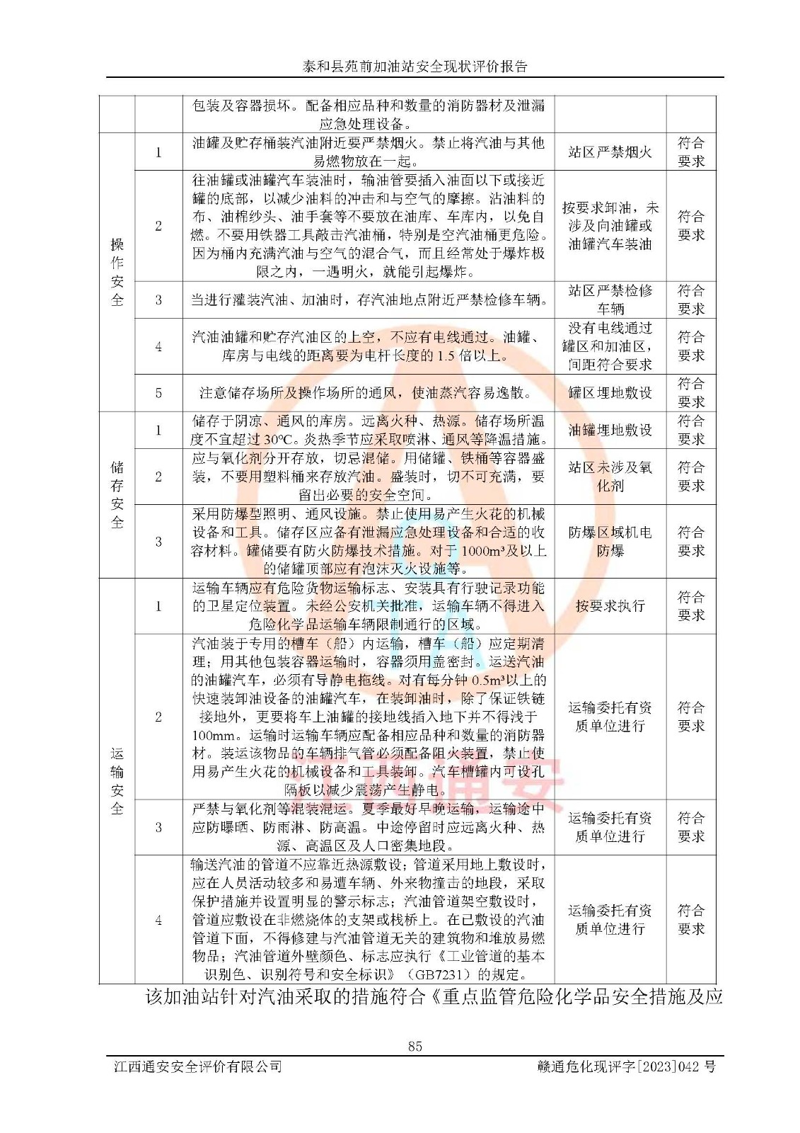評價結(jié)論 | 泰和縣苑前加油站站址合理,周邊環(huán)境良好,與敏感防護目標間距符合規(guī)范要求,站區(qū)建構(gòu)筑物之間的防火間距、耐火等級符合標準要求,與總平面布置圖一致,加油卸油工藝及設(shè)備設(shè)施合理,工藝布置得當(dāng),防雷設(shè)施經(jīng)檢測合格,采取的工藝安全設(shè)施符合規(guī)范要求;該加油站制定了安全管理制度和操作規(guī)程,人員經(jīng)培訓(xùn)合格后上崗,安全管理人員經(jīng)考核合格并取得安全合格證,能按照法律法規(guī)要求開展安全生產(chǎn)管理工作。 綜上:泰和縣苑前加油站符合《汽車加油加氣加氫站技術(shù)標準》GB50156-2021等標準規(guī)范的要求,安全風(fēng)險可控,滿足危險化學(xué)品經(jīng)營的安全條件。 | |||
