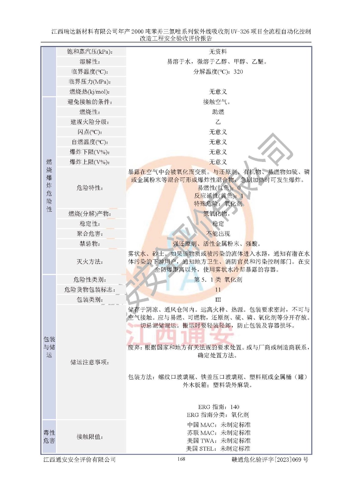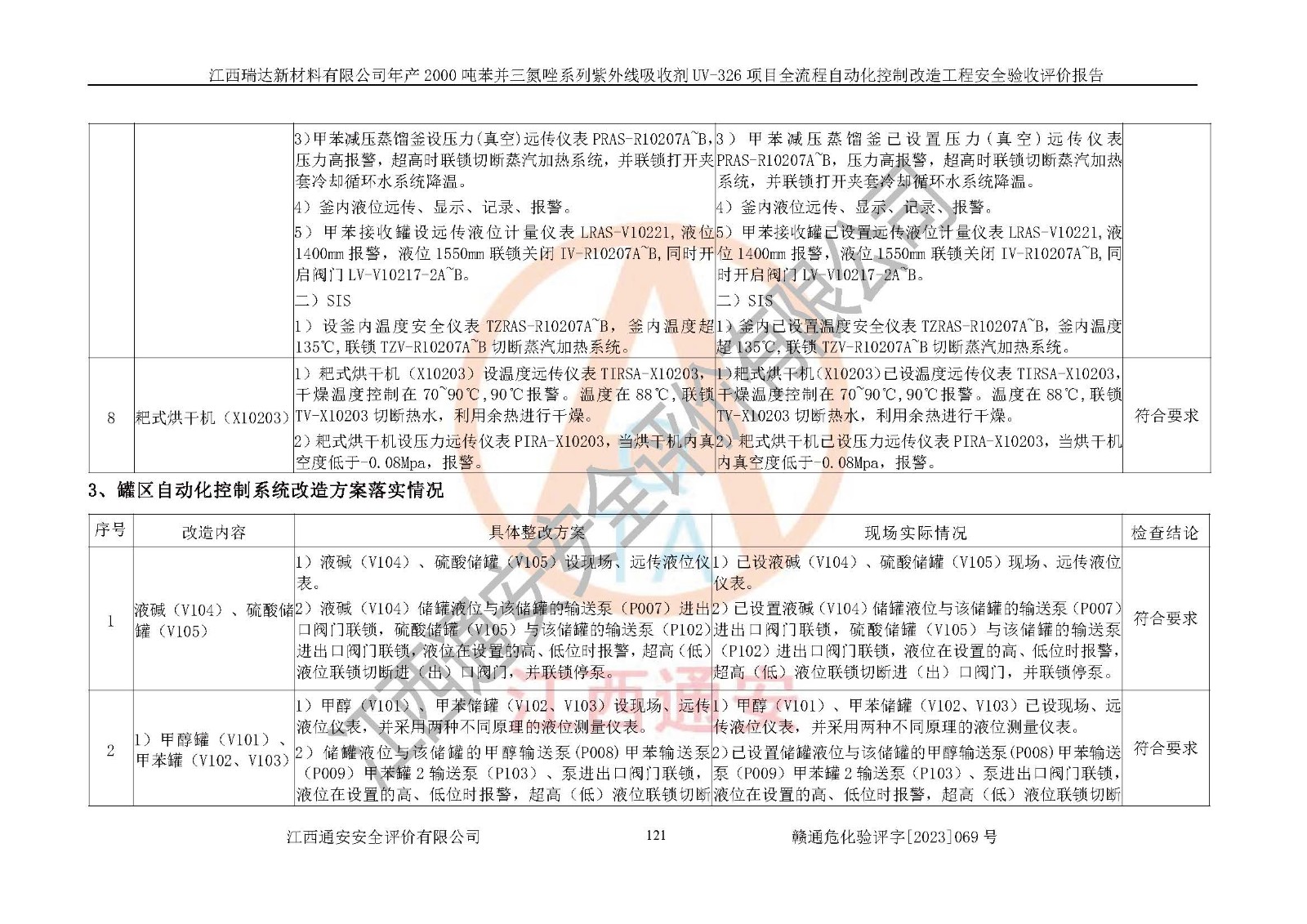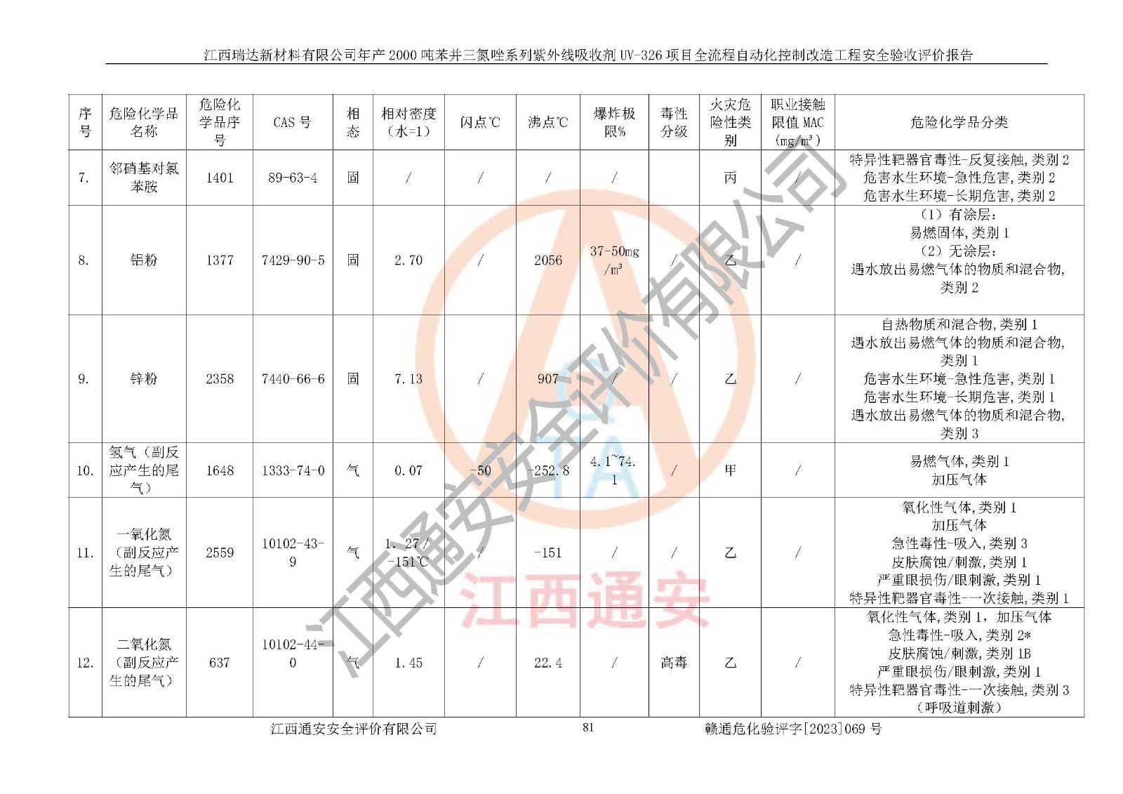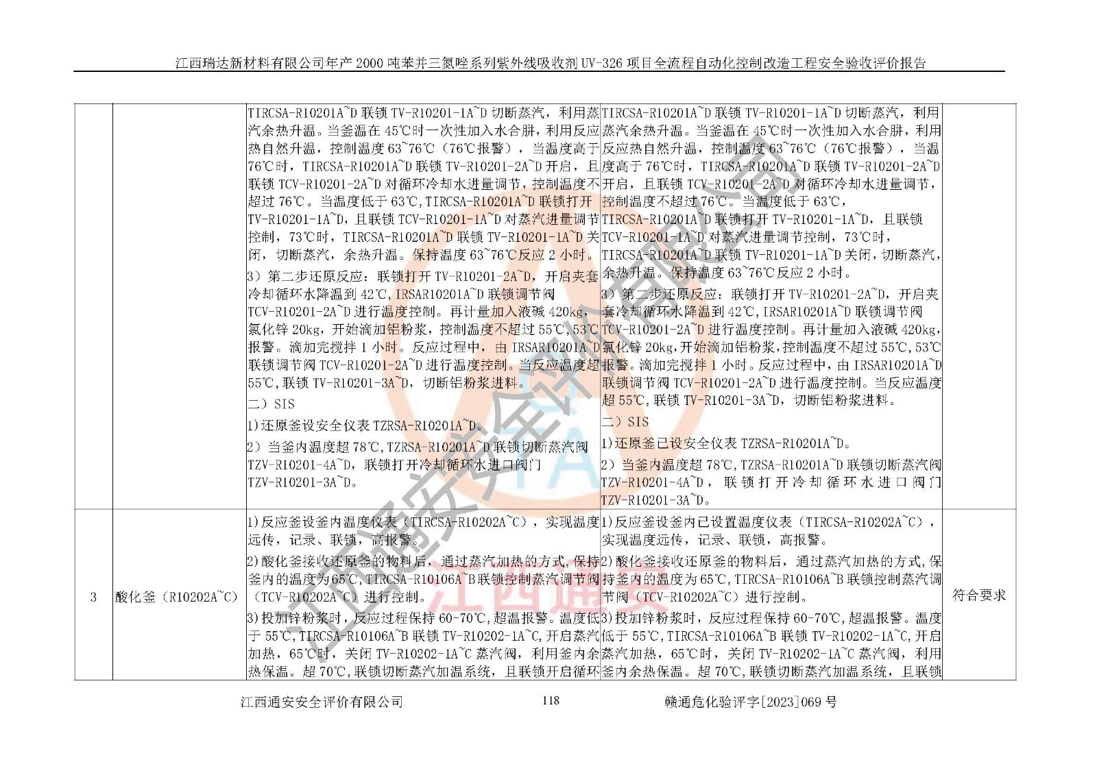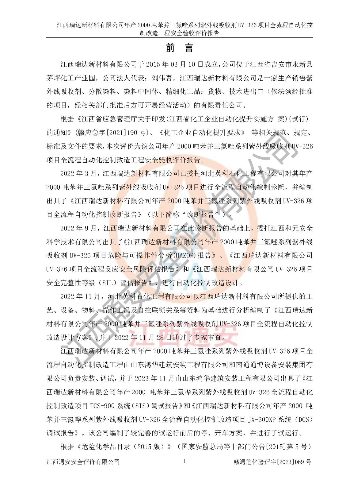 評價報告名稱 | 江西瑞達(dá)新材料有限公司年產(chǎn)2000噸苯并三氮唑系列紫外線吸收劑UV-326項目全流程自動化控制改造工程安全驗收評價報告 | |||