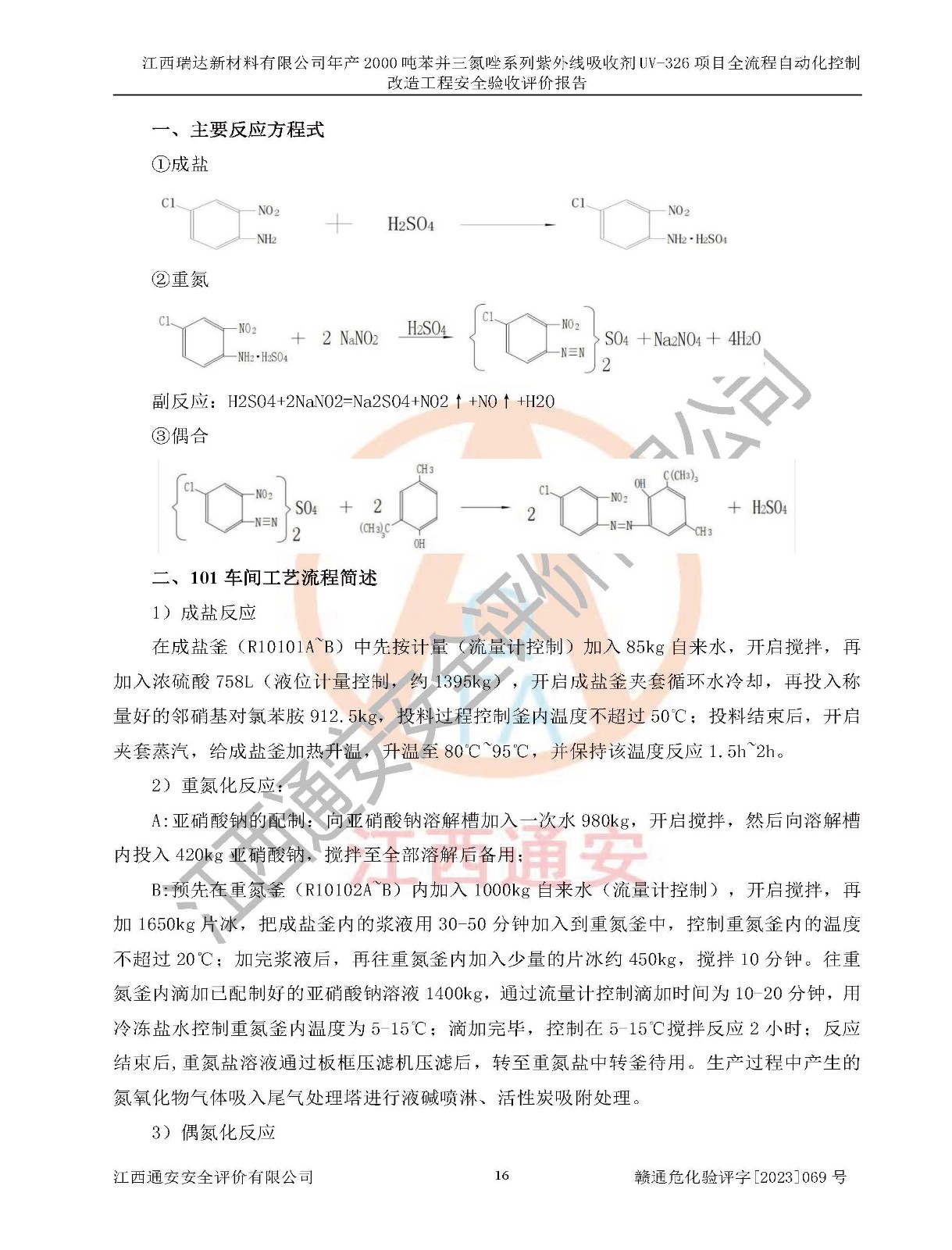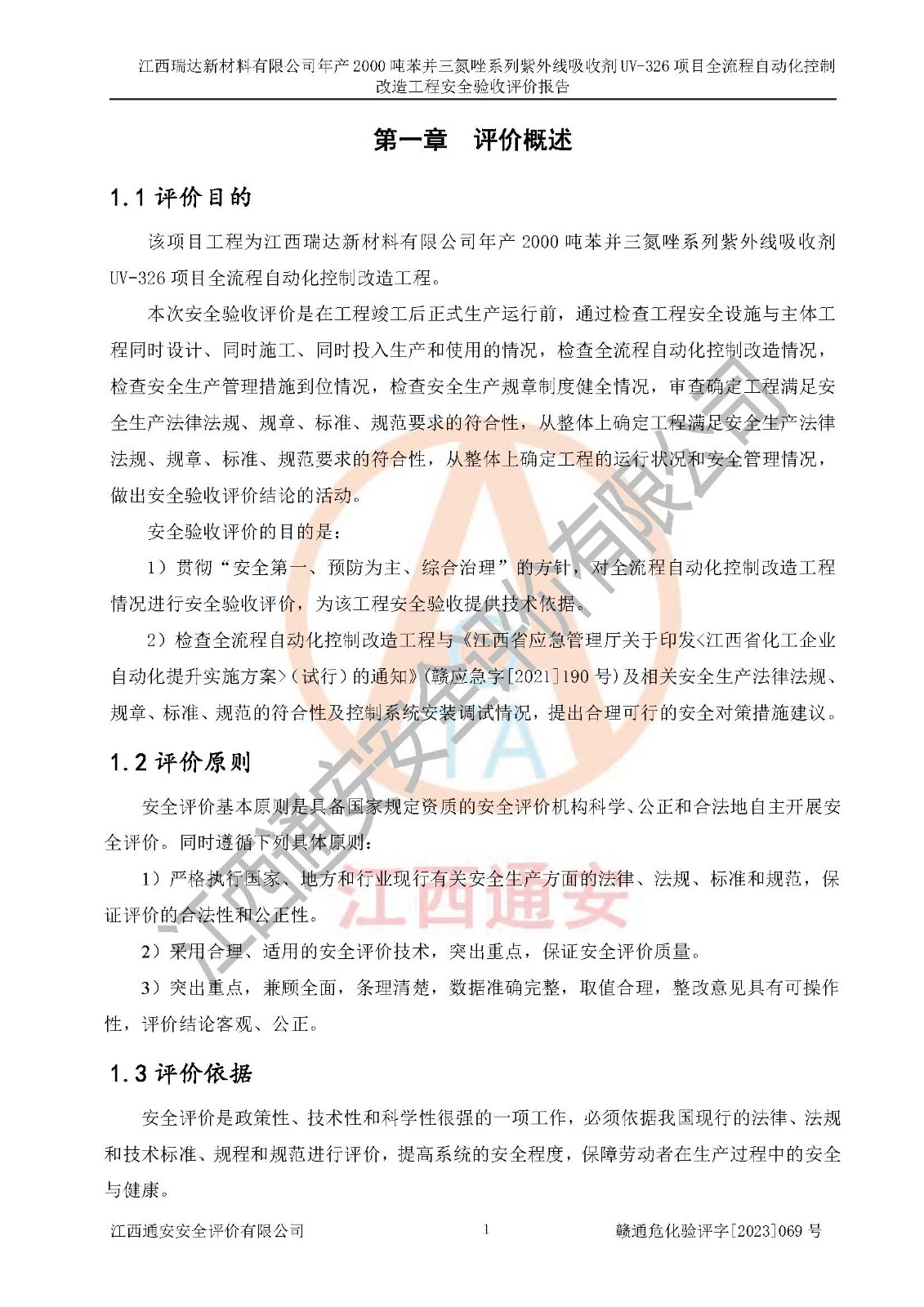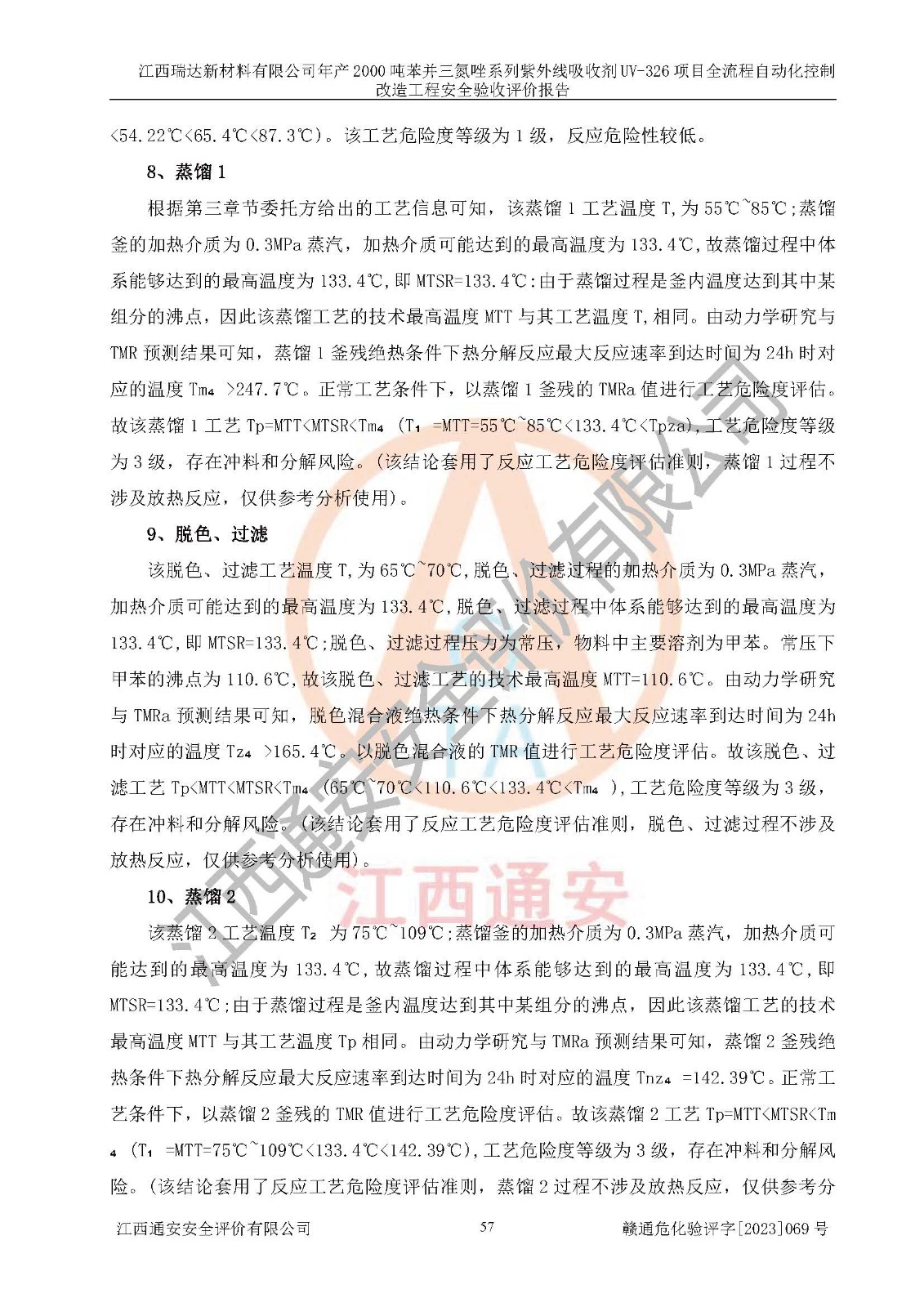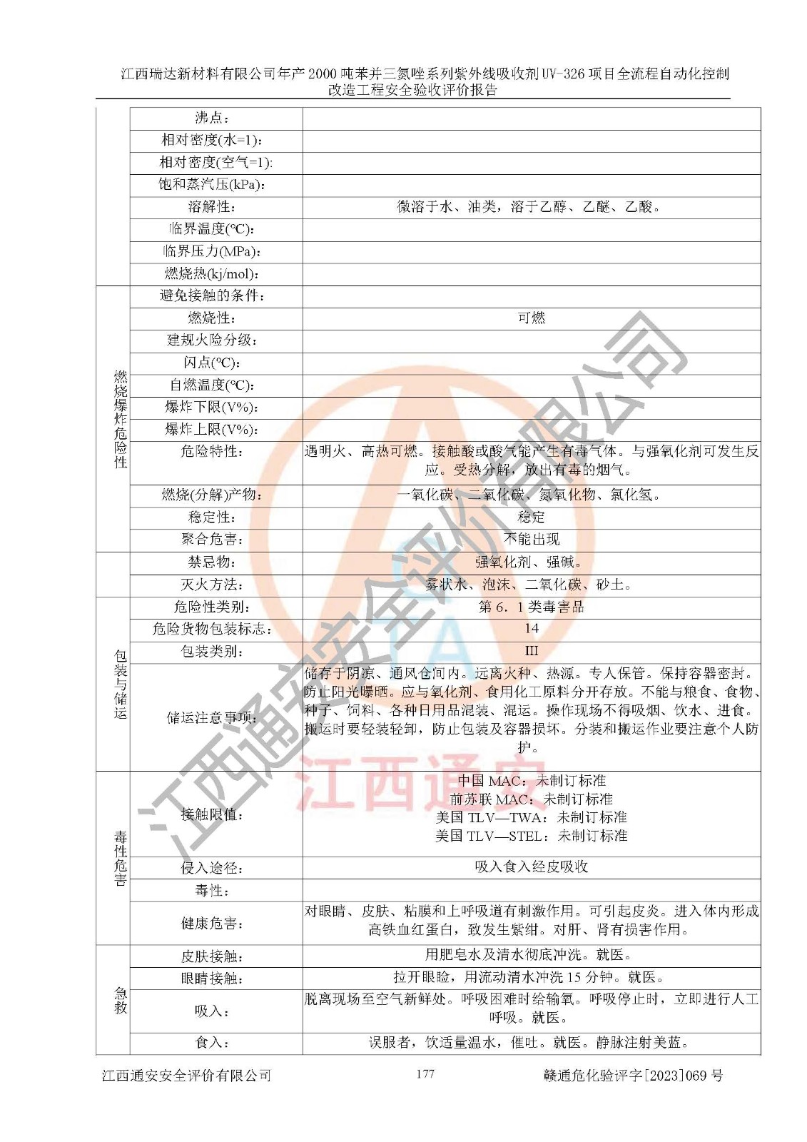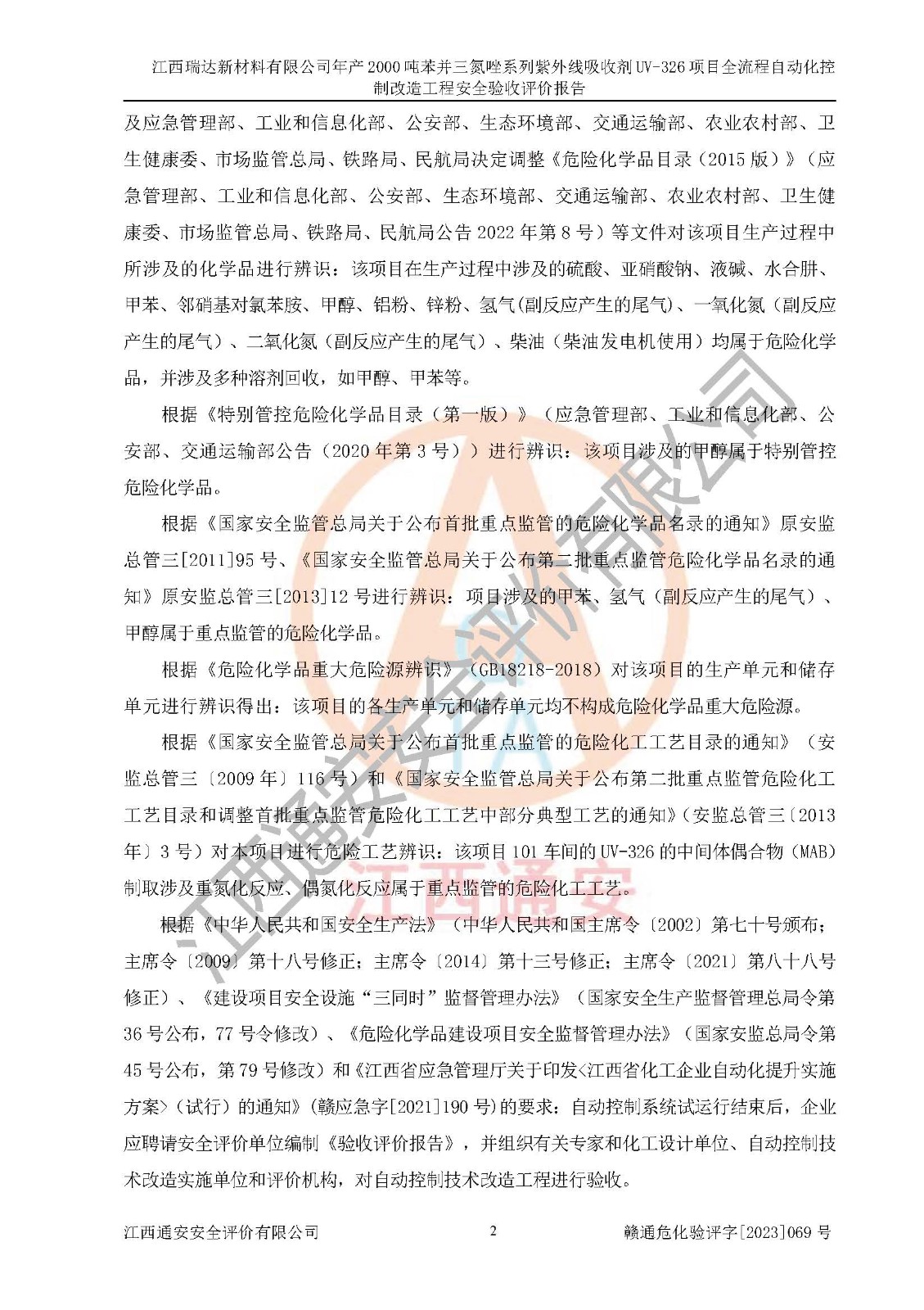 評價報告名稱 | 江西瑞達(dá)新材料有限公司年產(chǎn)2000噸苯并三氮唑系列紫外線吸收劑UV-326項目全流程自動化控制改造工程安全驗收評價報告 | |||