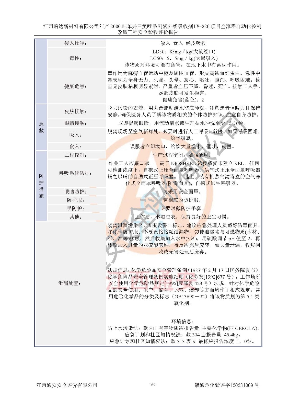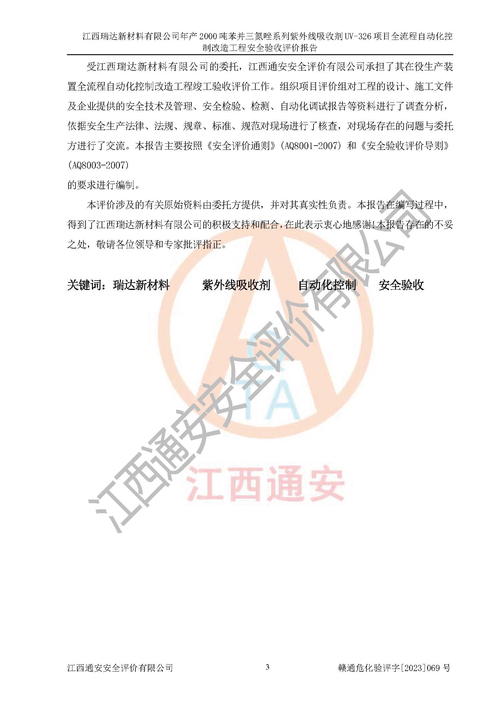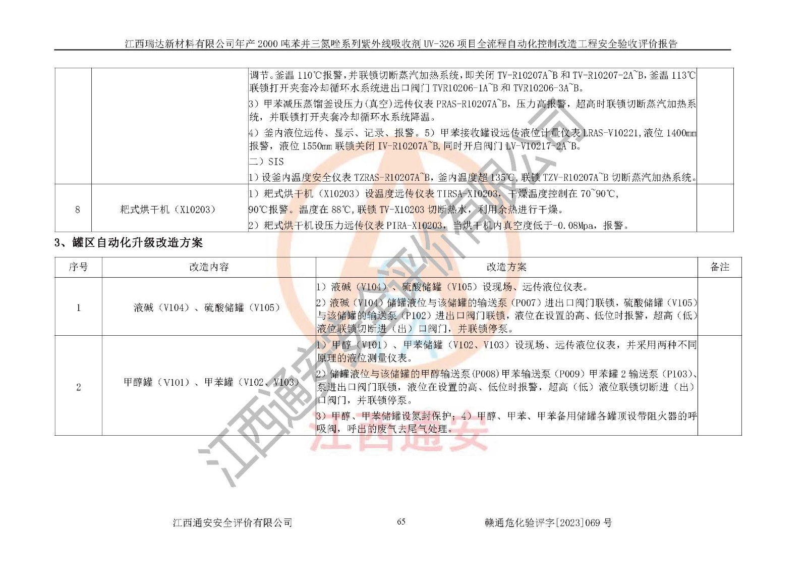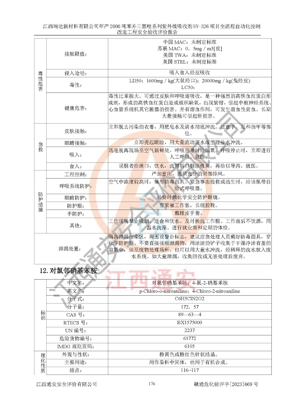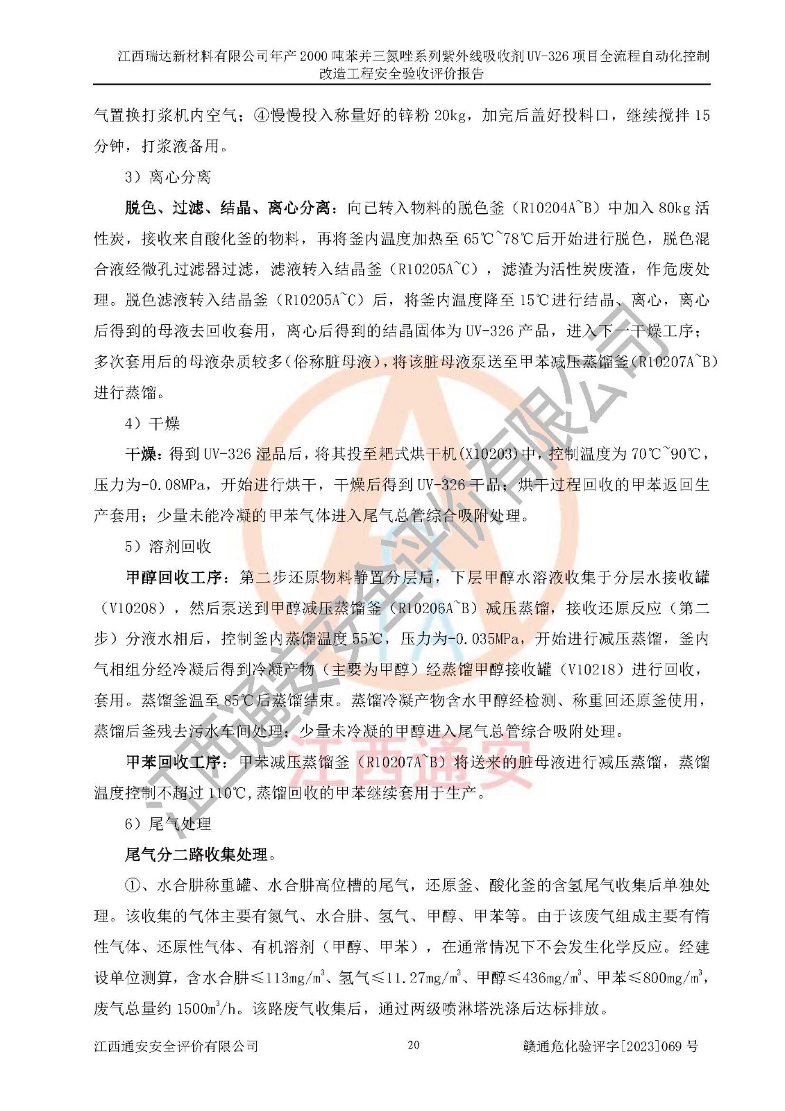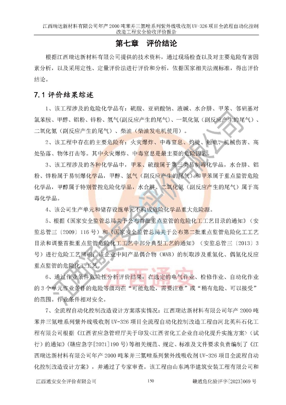評價報告名稱 | 江西瑞達(dá)新材料有限公司年產(chǎn)2000噸苯并三氮唑系列紫外線吸收劑UV-326項目全流程自動化控制改造工程安全驗收評價報告 | |||