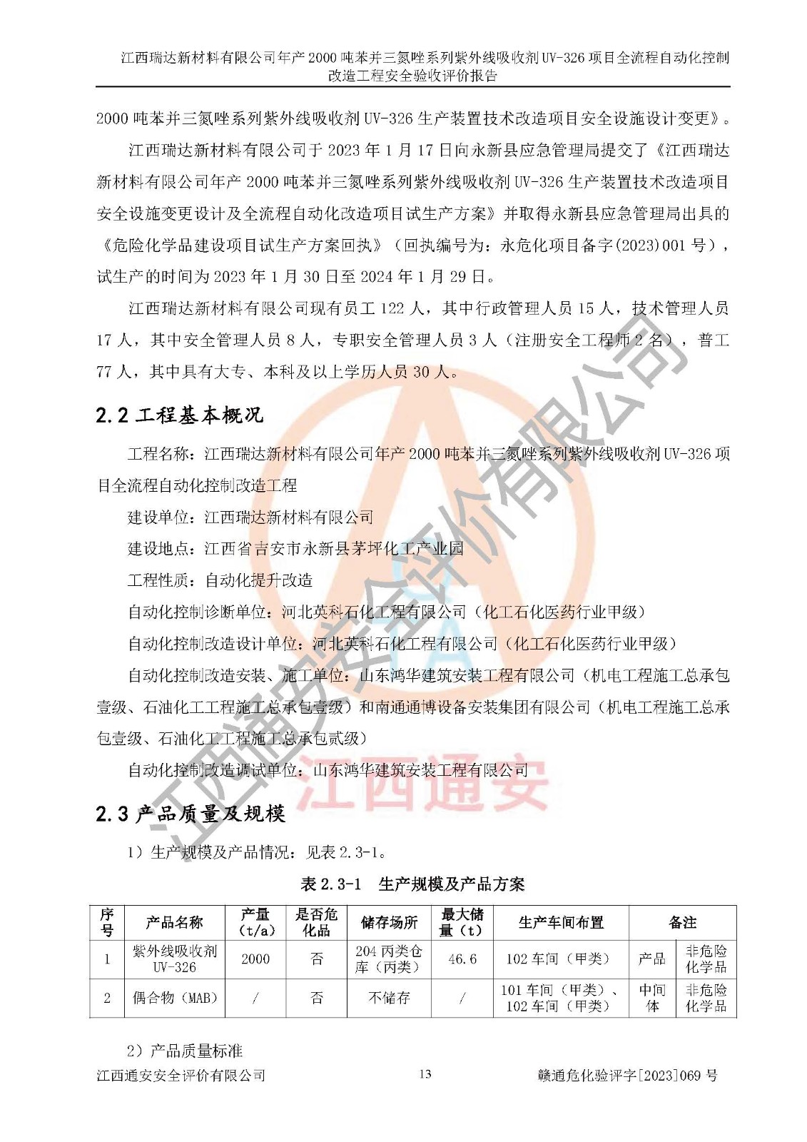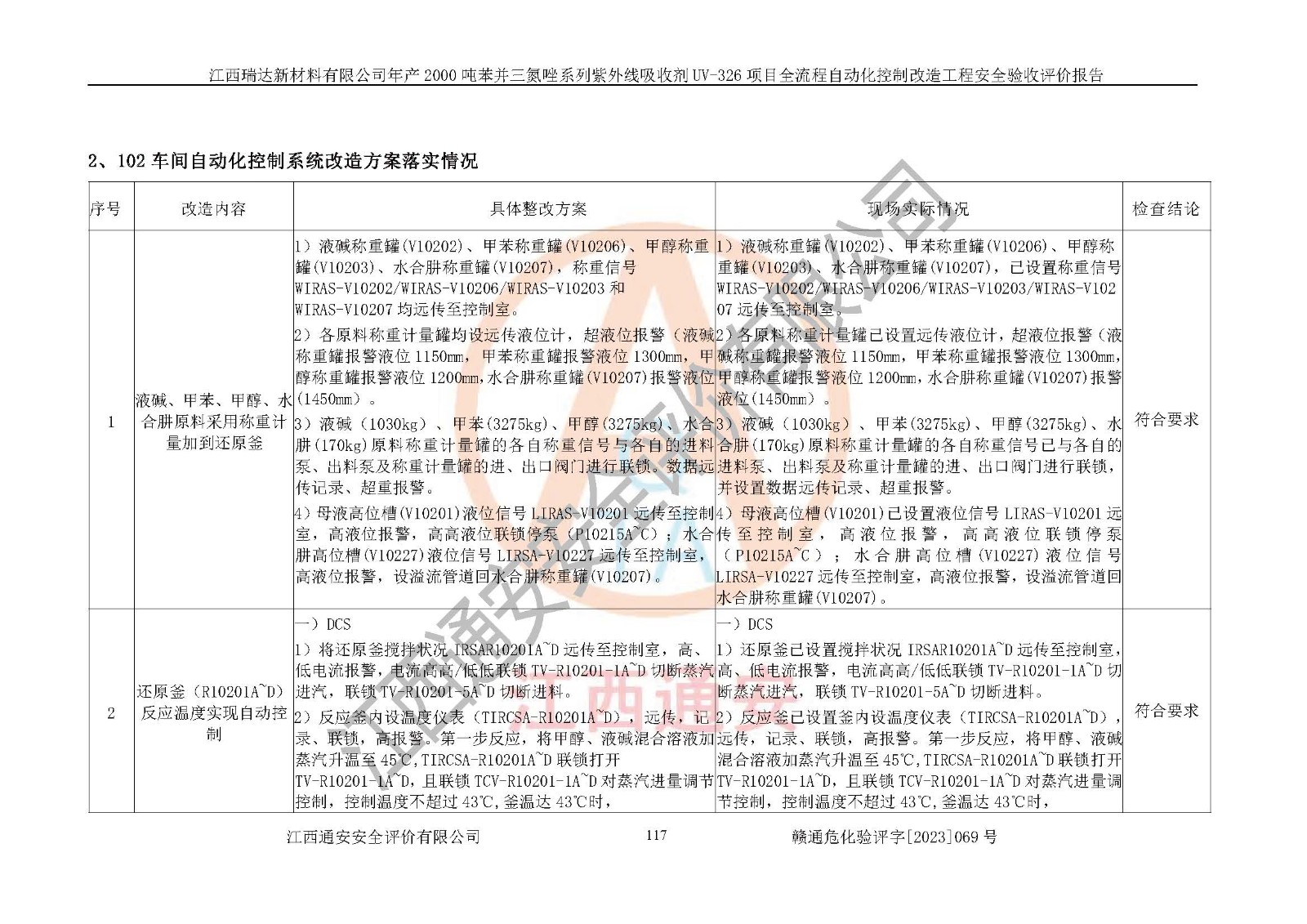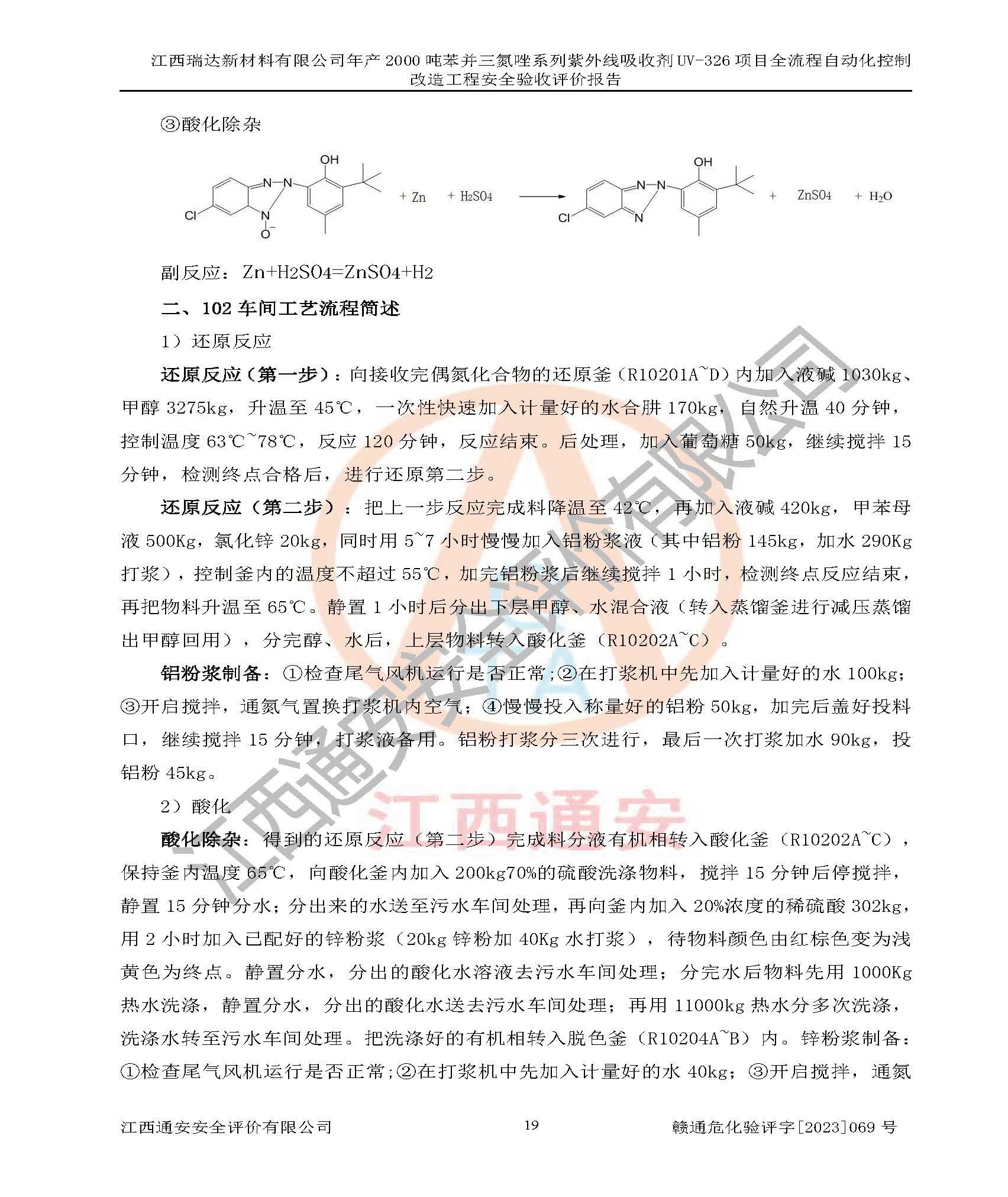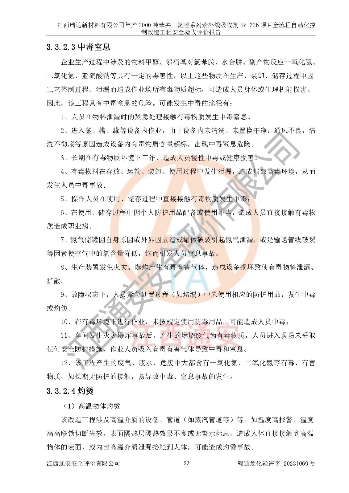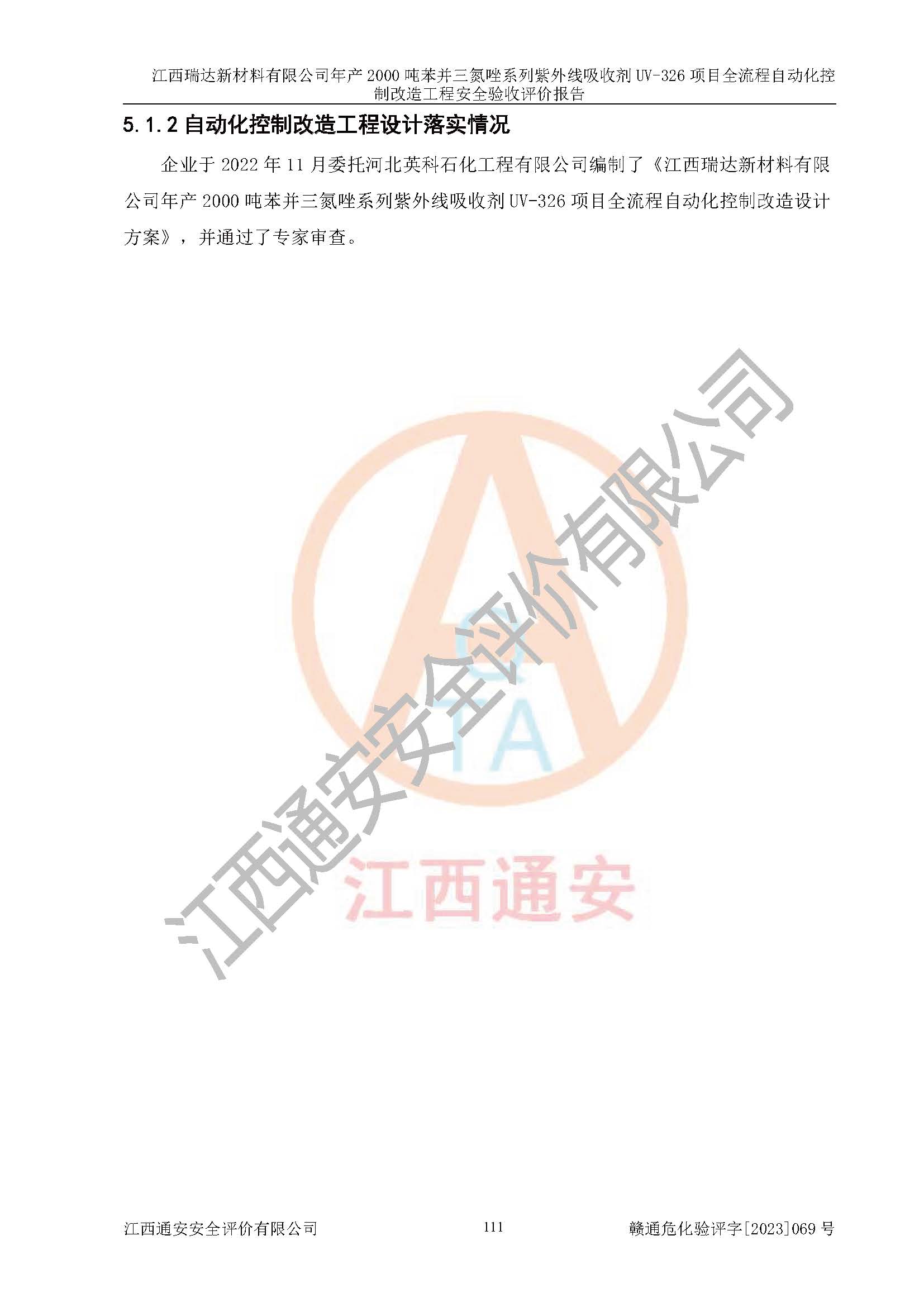 評價報告名稱 | 江西瑞達(dá)新材料有限公司年產(chǎn)2000噸苯并三氮唑系列紫外線吸收劑UV-326項目全流程自動化控制改造工程安全驗收評價報告 | |||