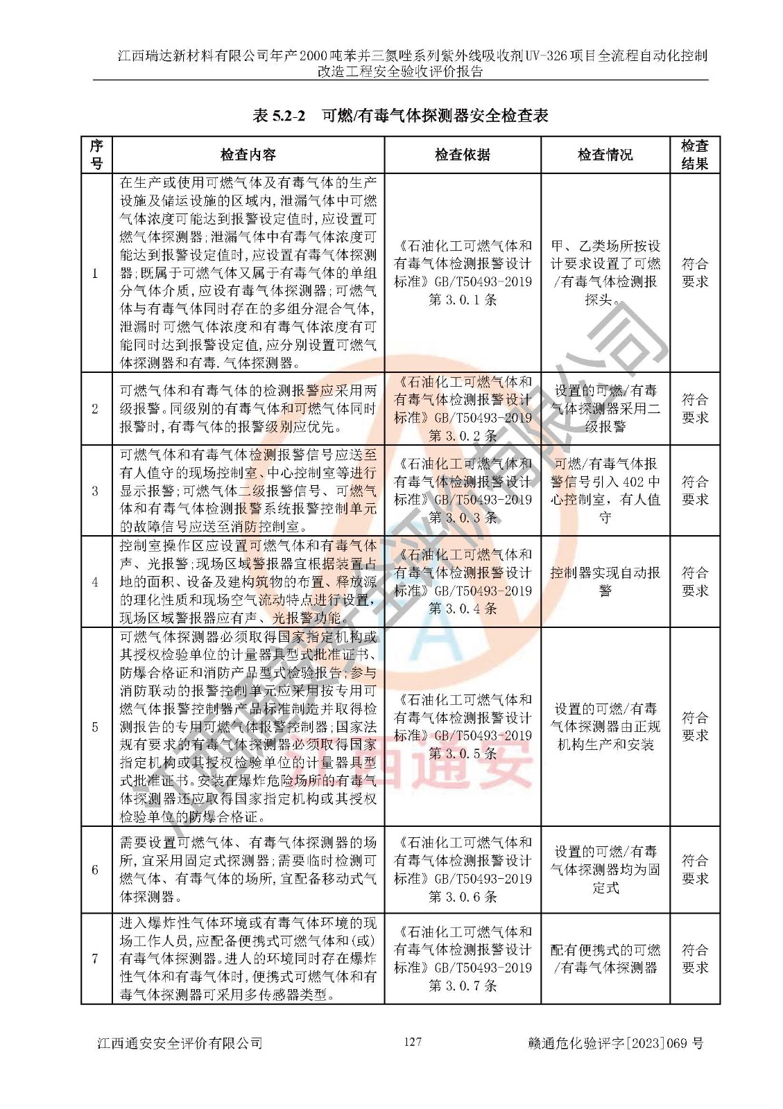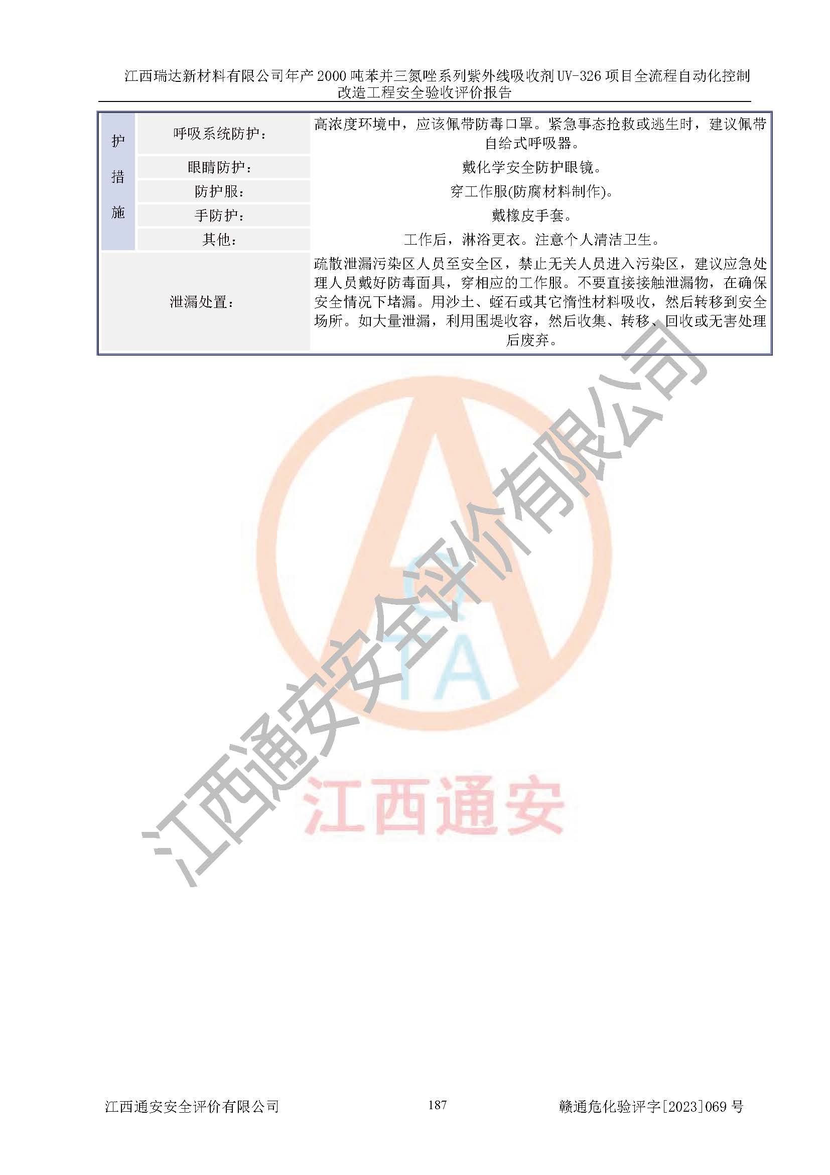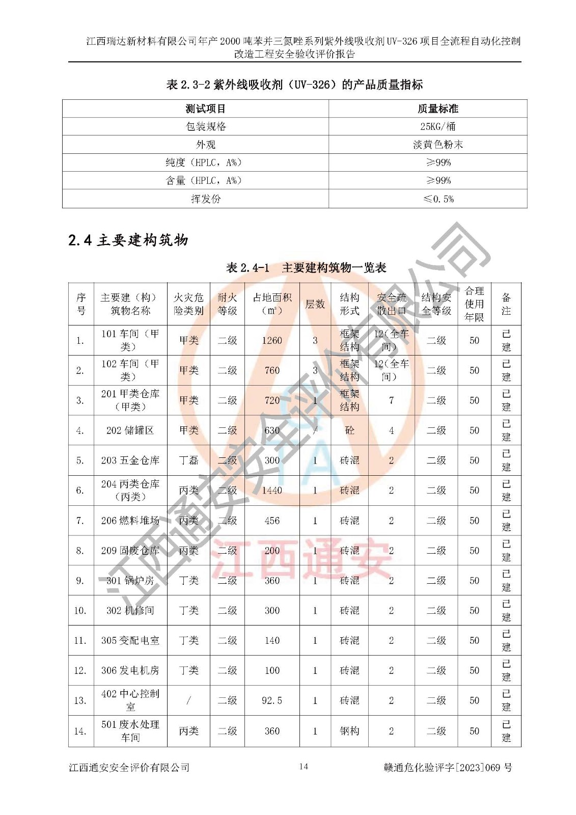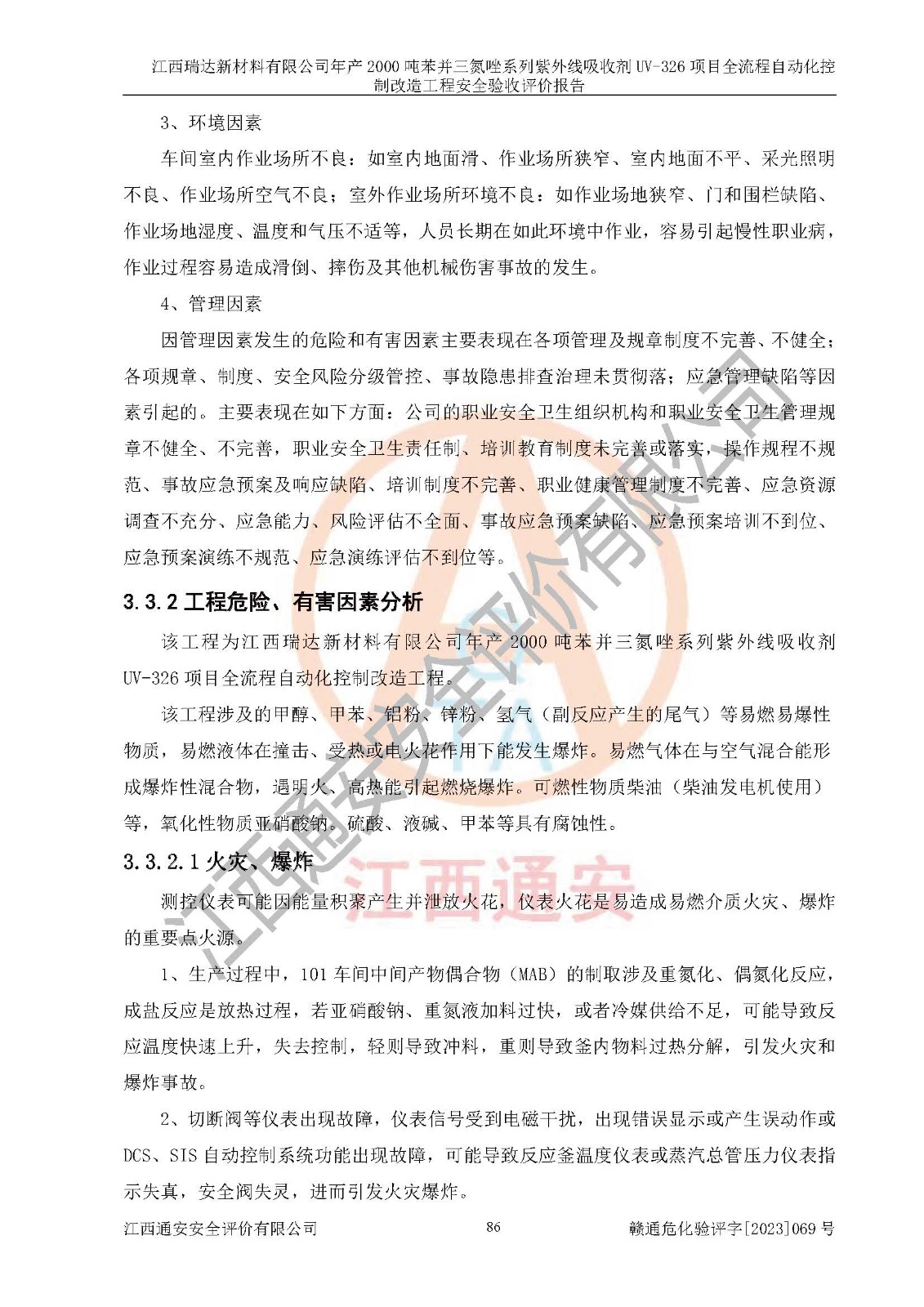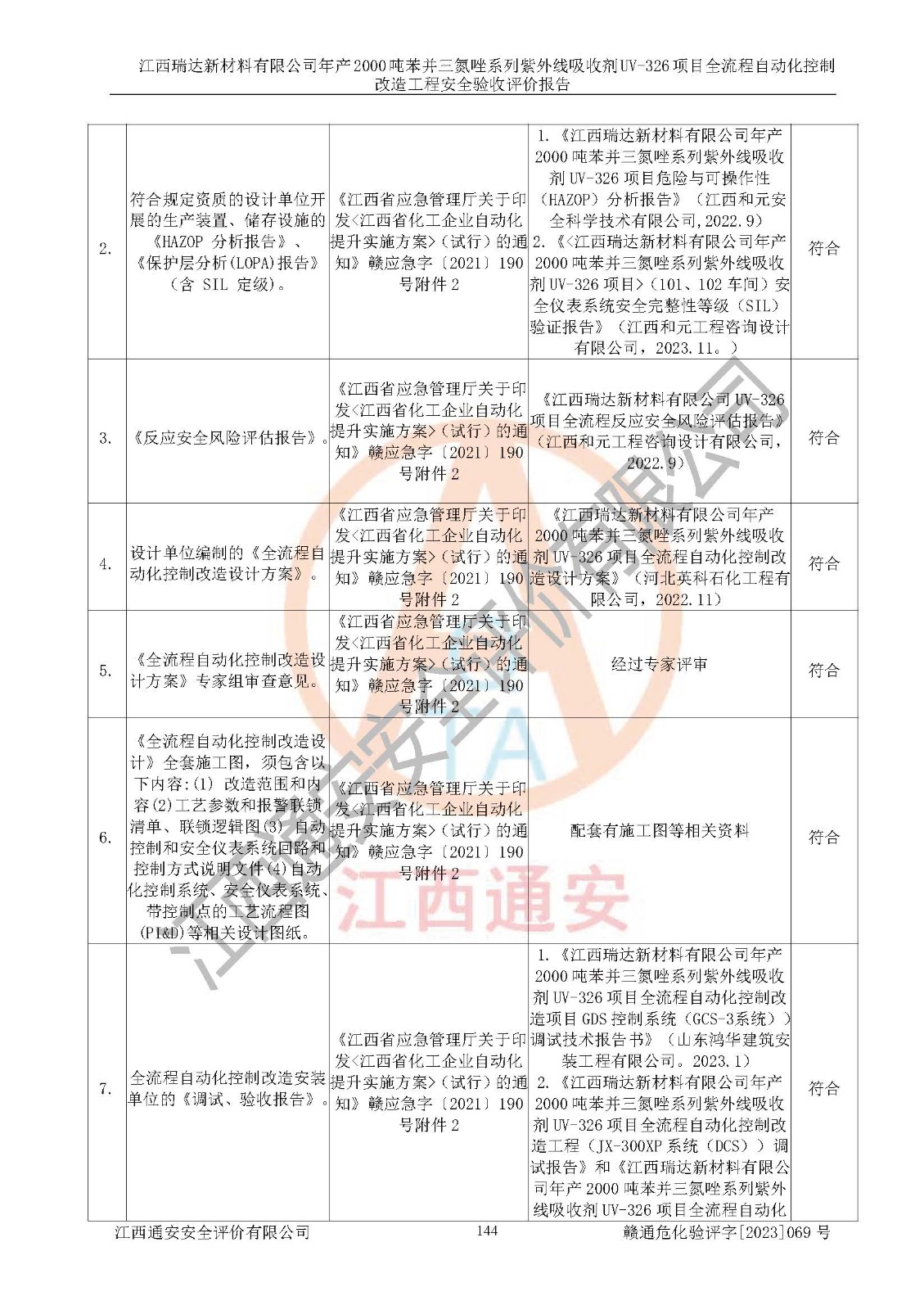 評價報告名稱 | 江西瑞達(dá)新材料有限公司年產(chǎn)2000噸苯并三氮唑系列紫外線吸收劑UV-326項目全流程自動化控制改造工程安全驗收評價報告 | |||