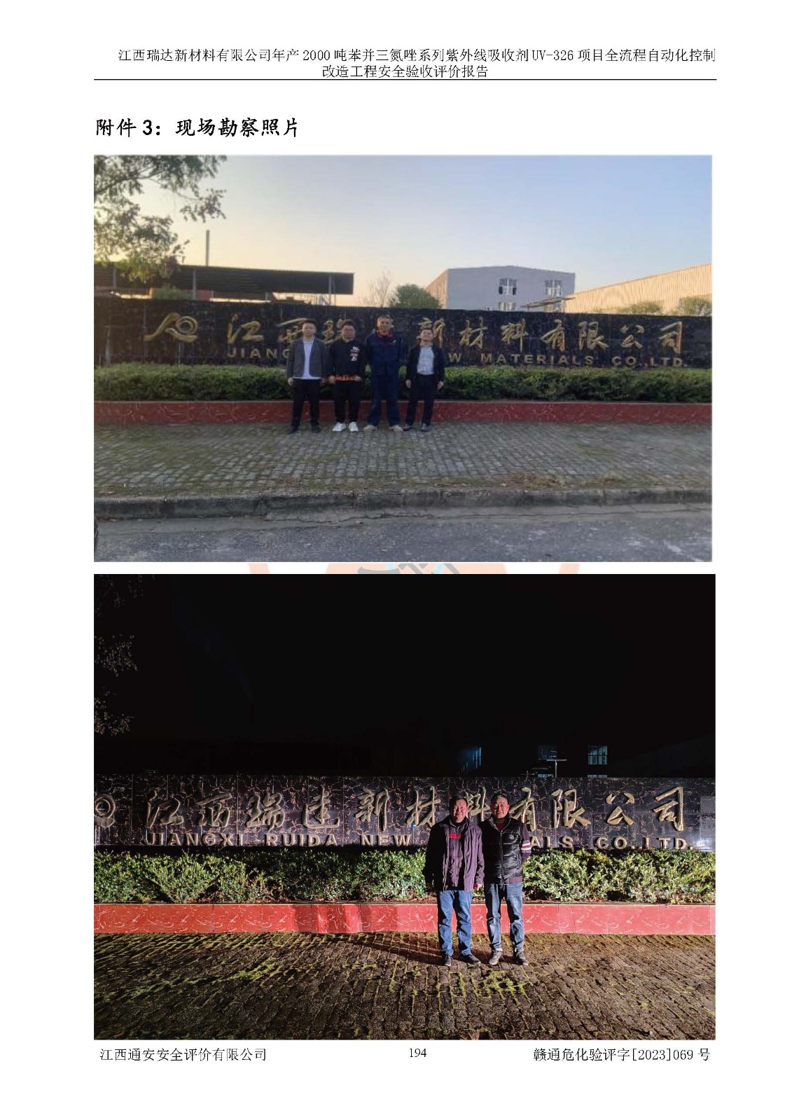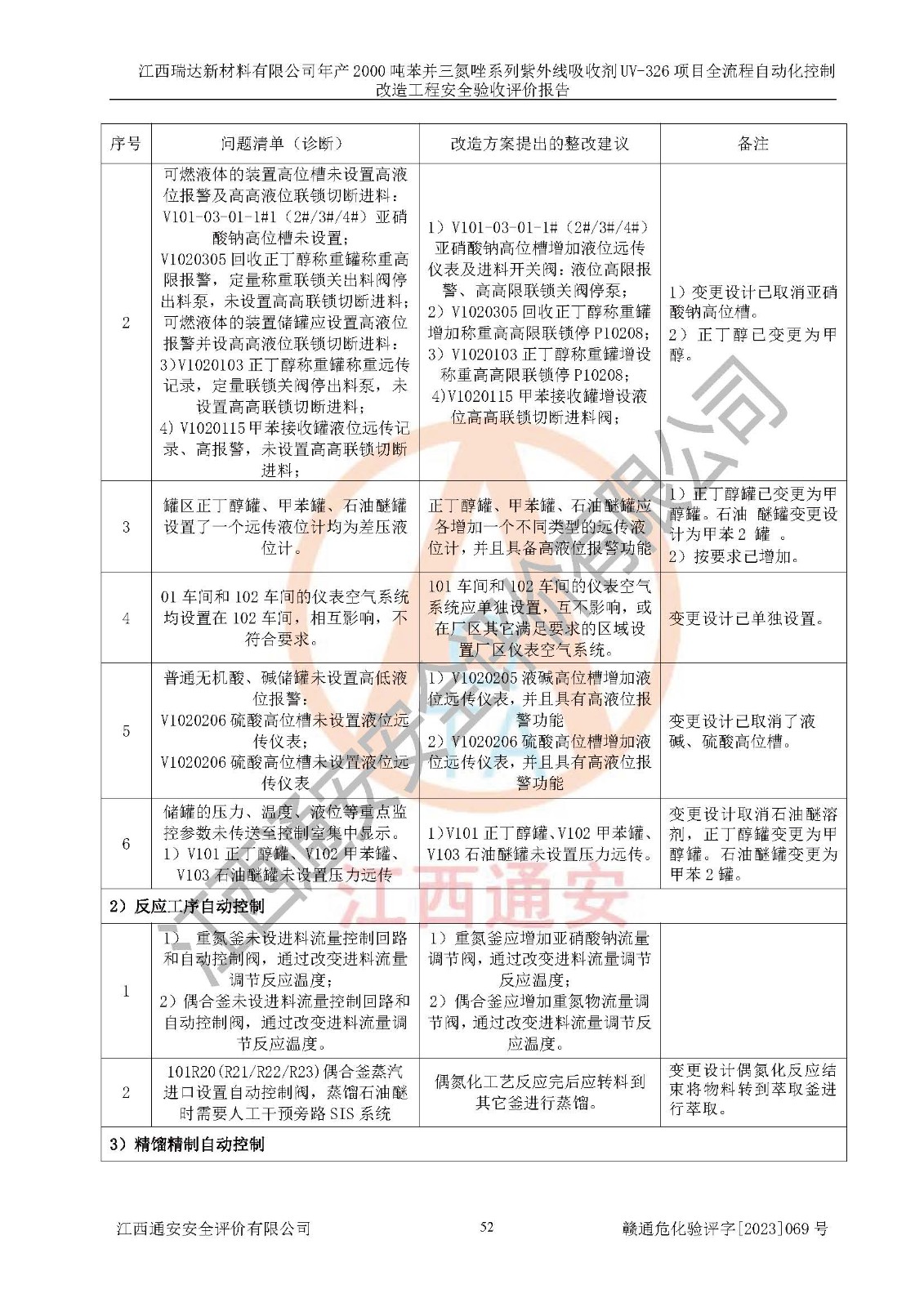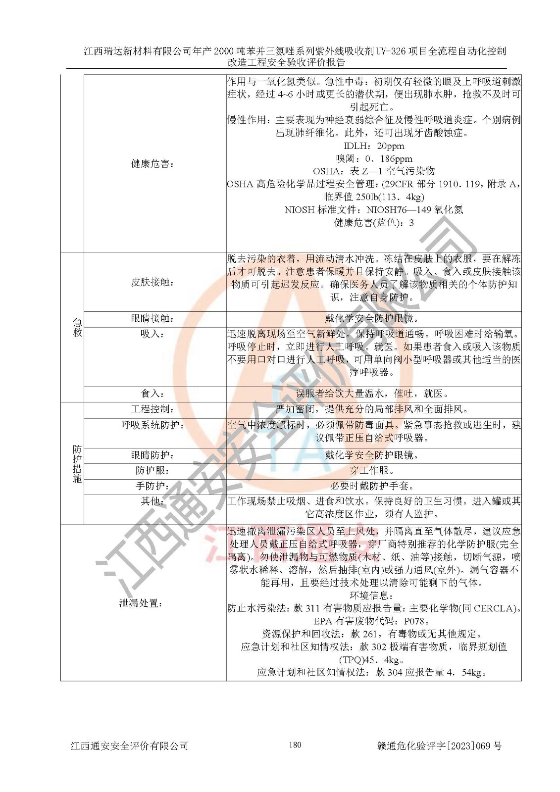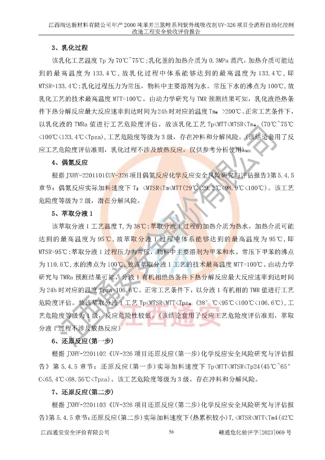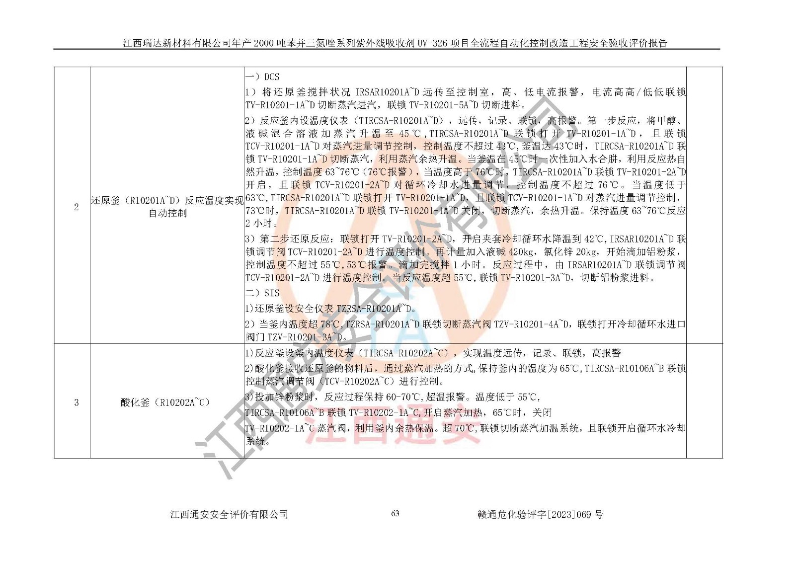 評價報告名稱 | 江西瑞達(dá)新材料有限公司年產(chǎn)2000噸苯并三氮唑系列紫外線吸收劑UV-326項目全流程自動化控制改造工程安全驗收評價報告 | |||