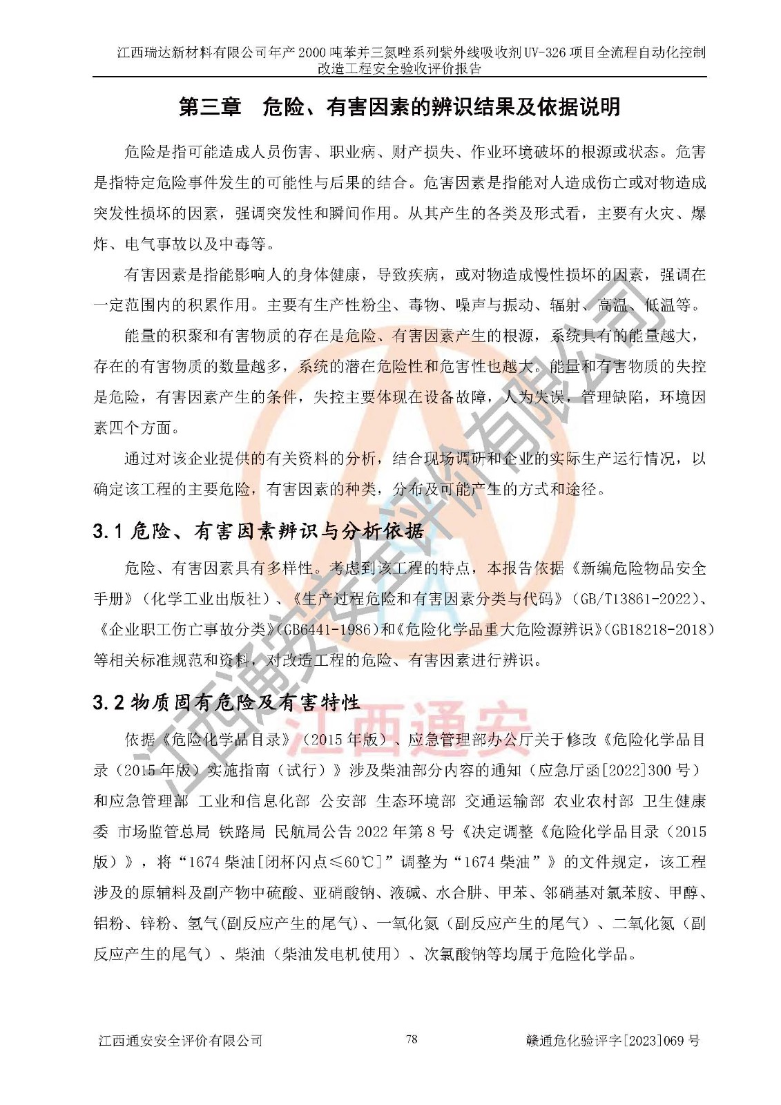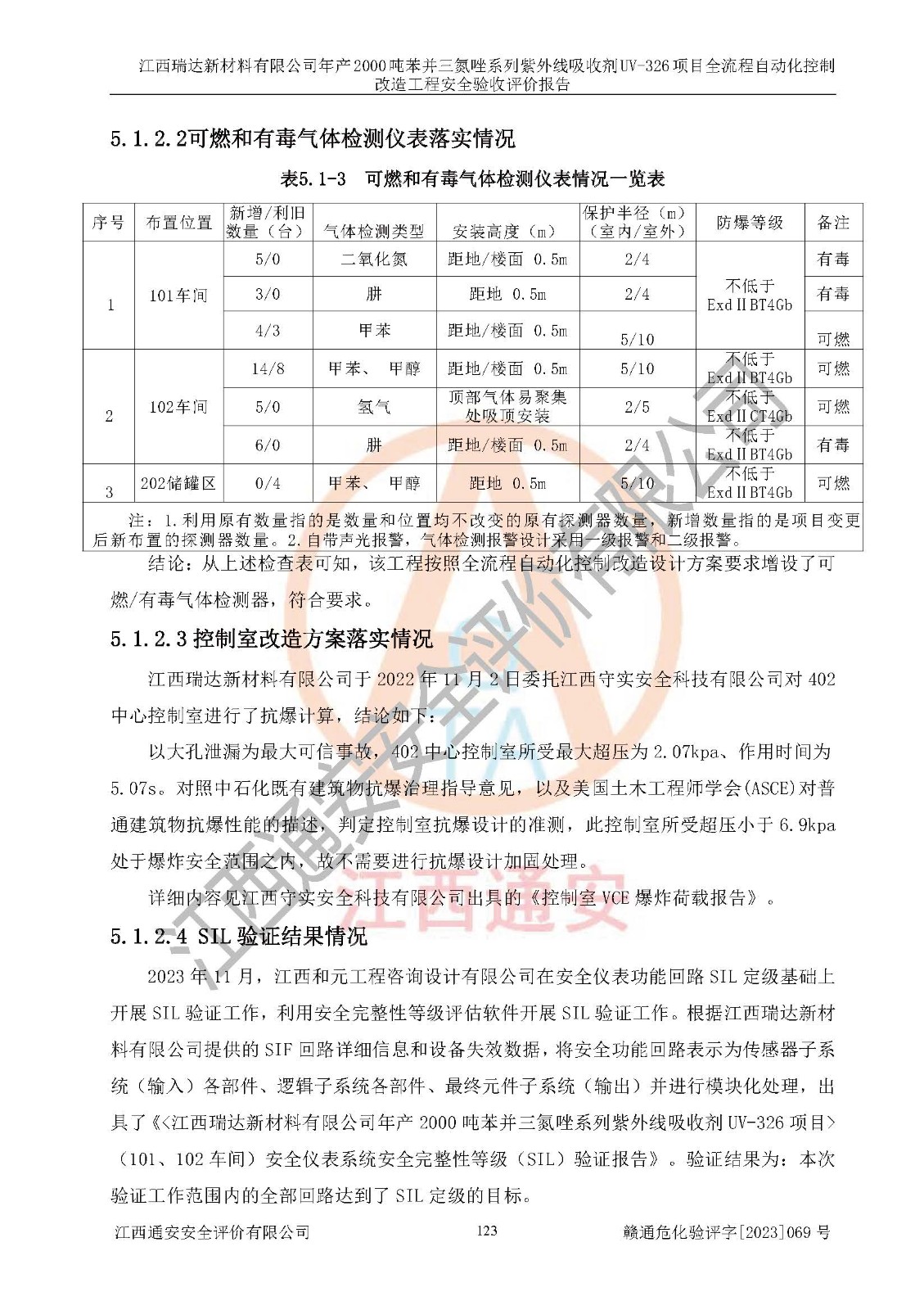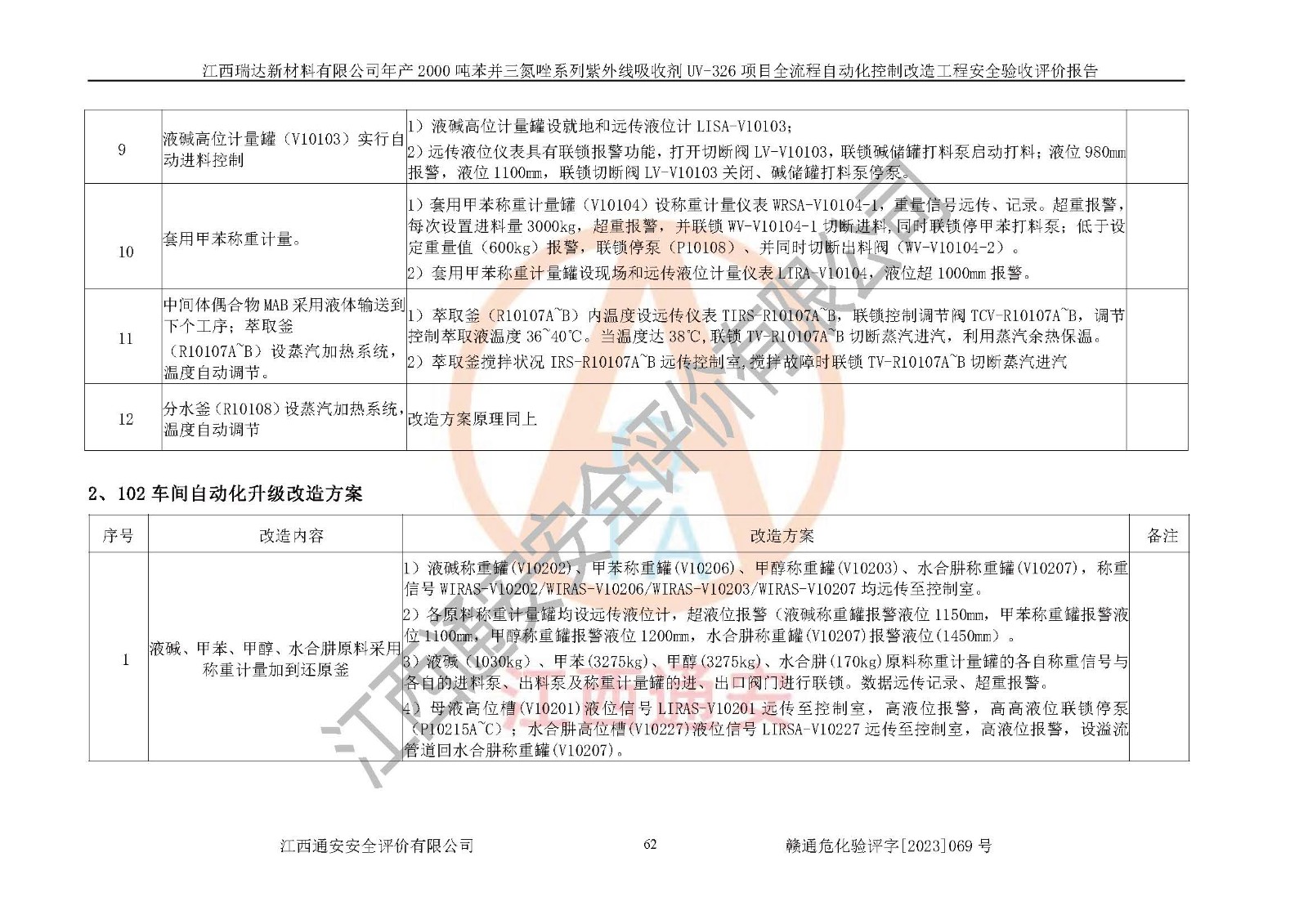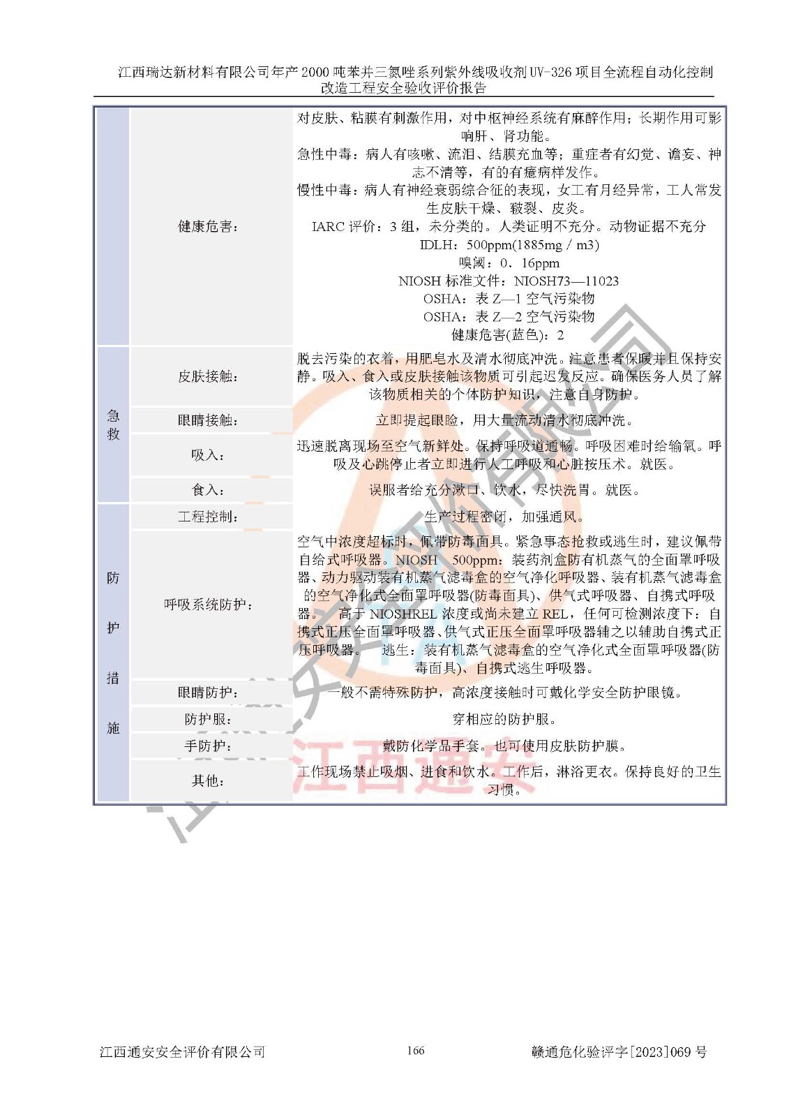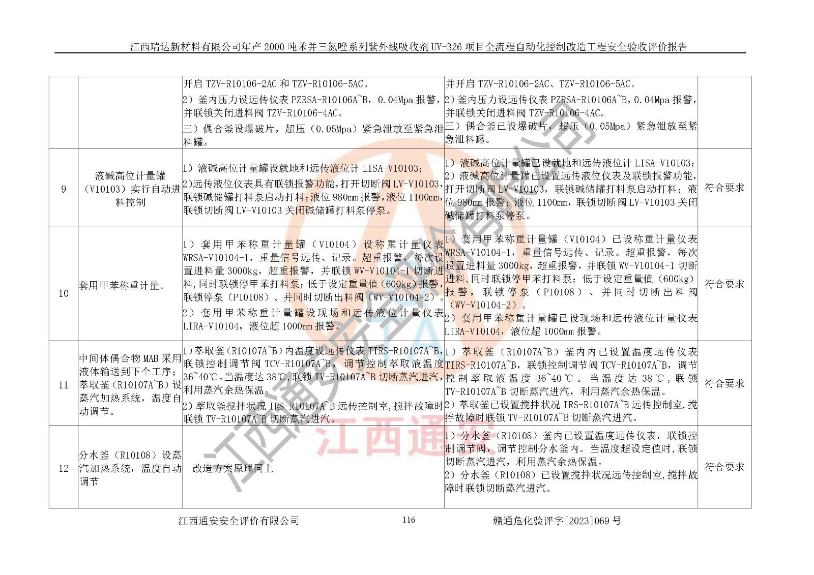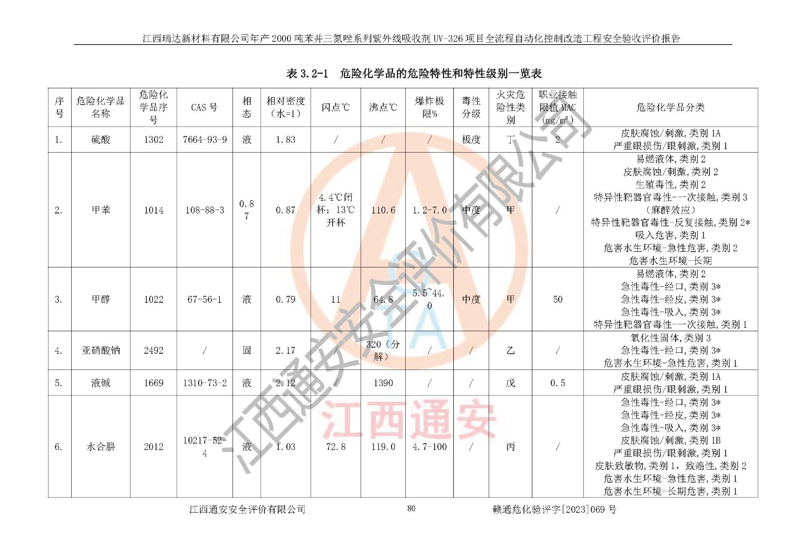 評價報告名稱 | 江西瑞達(dá)新材料有限公司年產(chǎn)2000噸苯并三氮唑系列紫外線吸收劑UV-326項目全流程自動化控制改造工程安全驗收評價報告 | |||