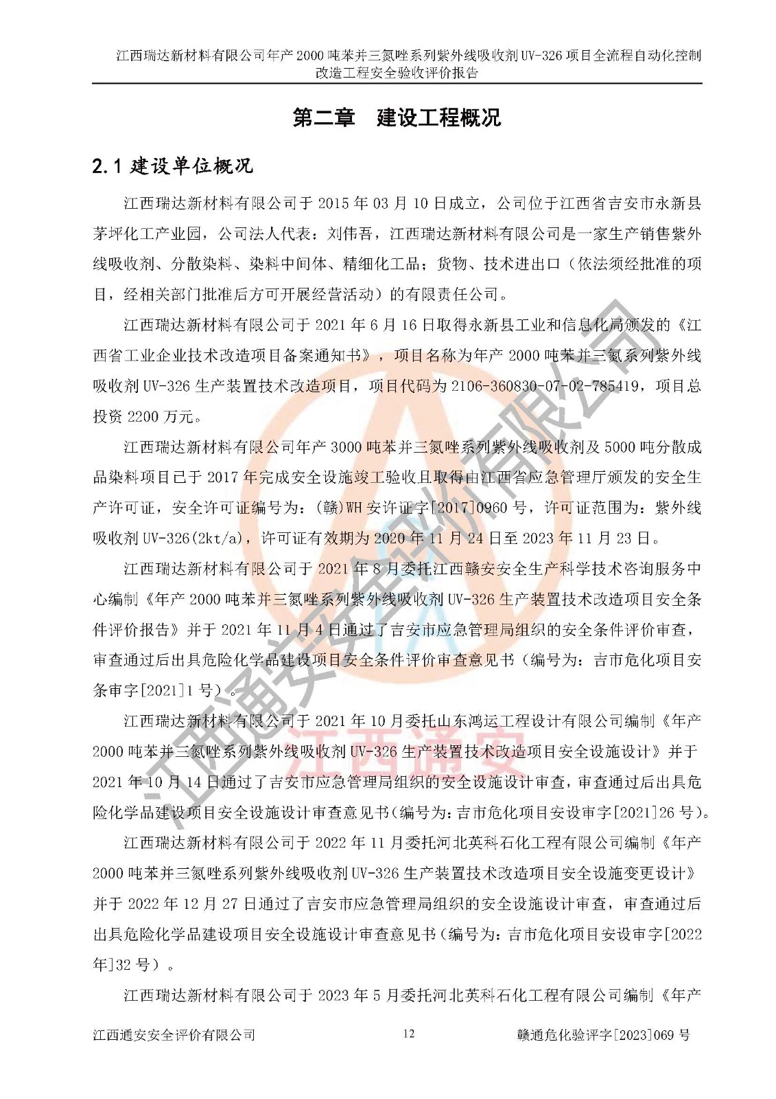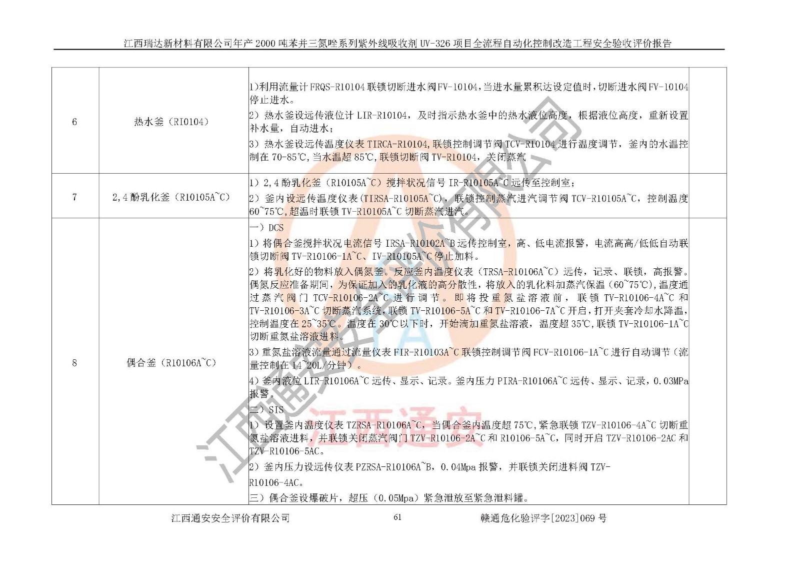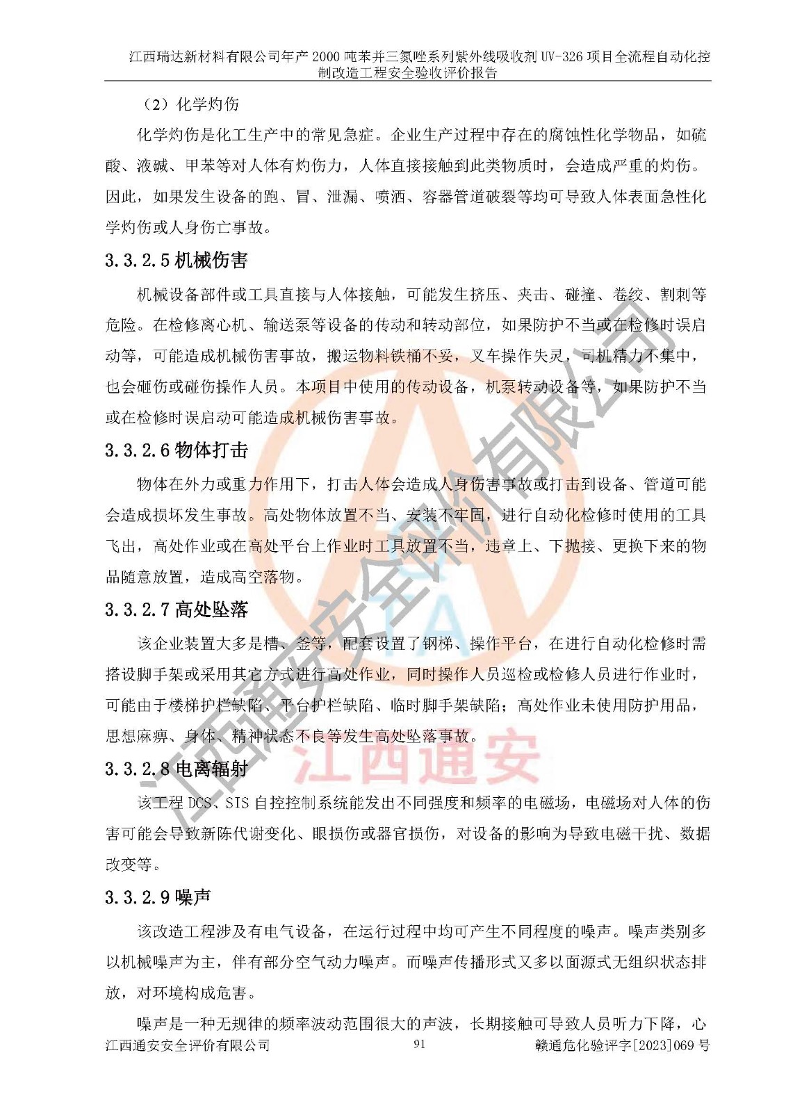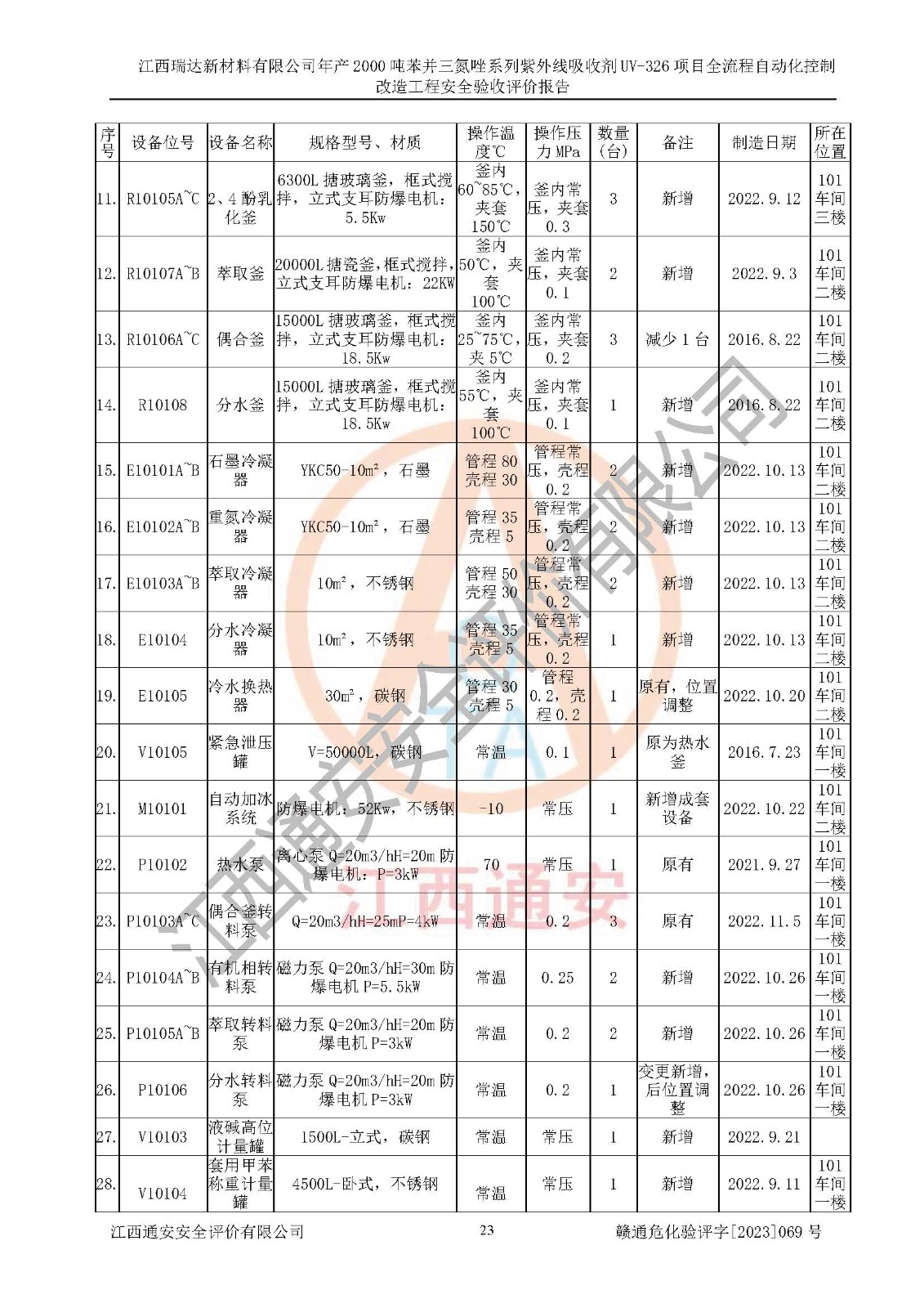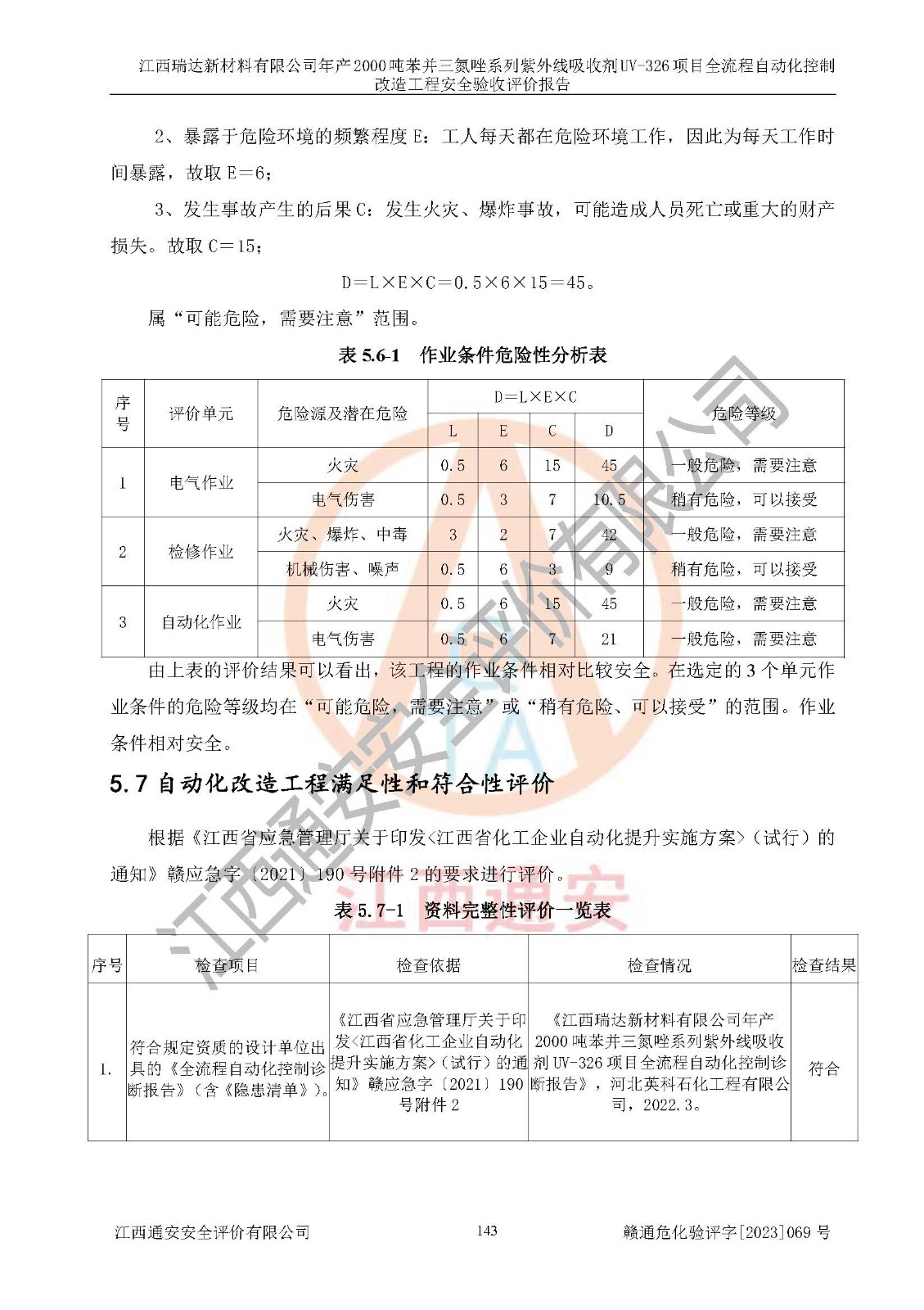 評價報告名稱 | 江西瑞達(dá)新材料有限公司年產(chǎn)2000噸苯并三氮唑系列紫外線吸收劑UV-326項目全流程自動化控制改造工程安全驗收評價報告 | |||