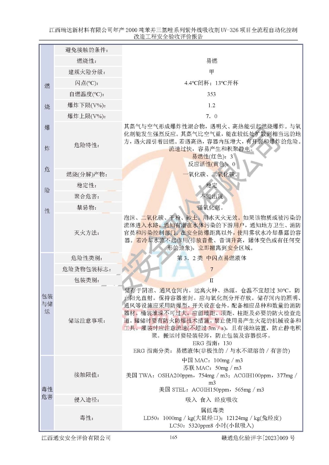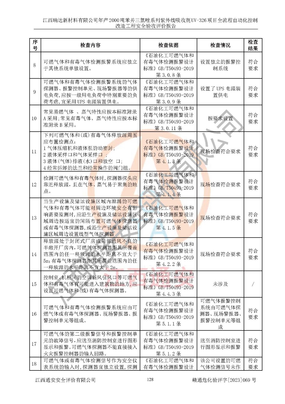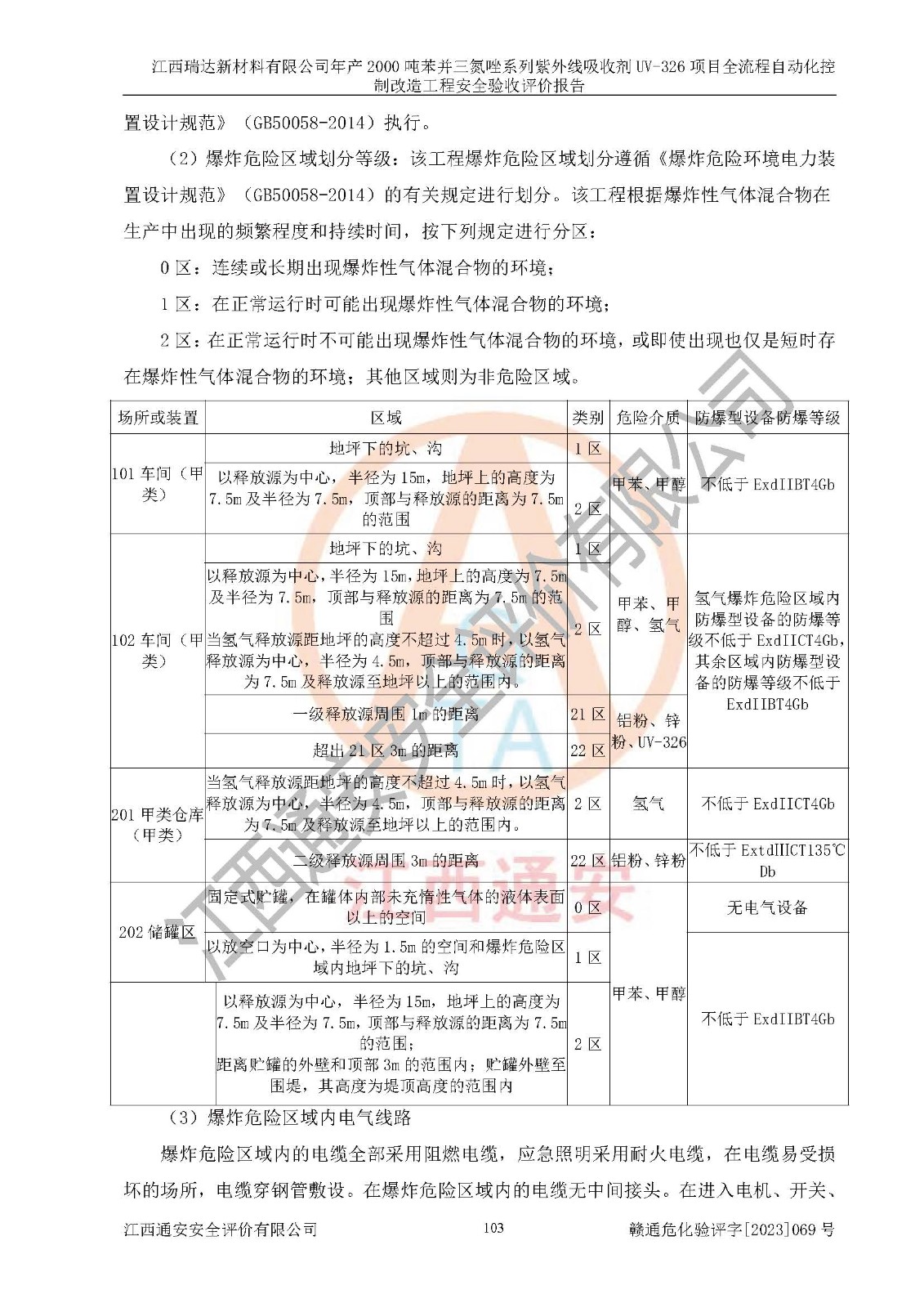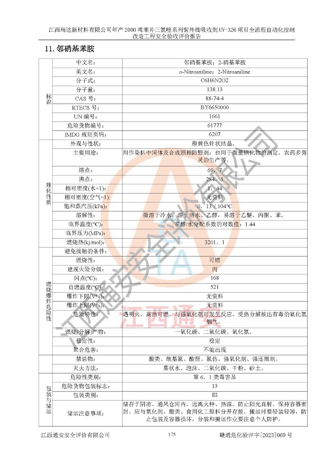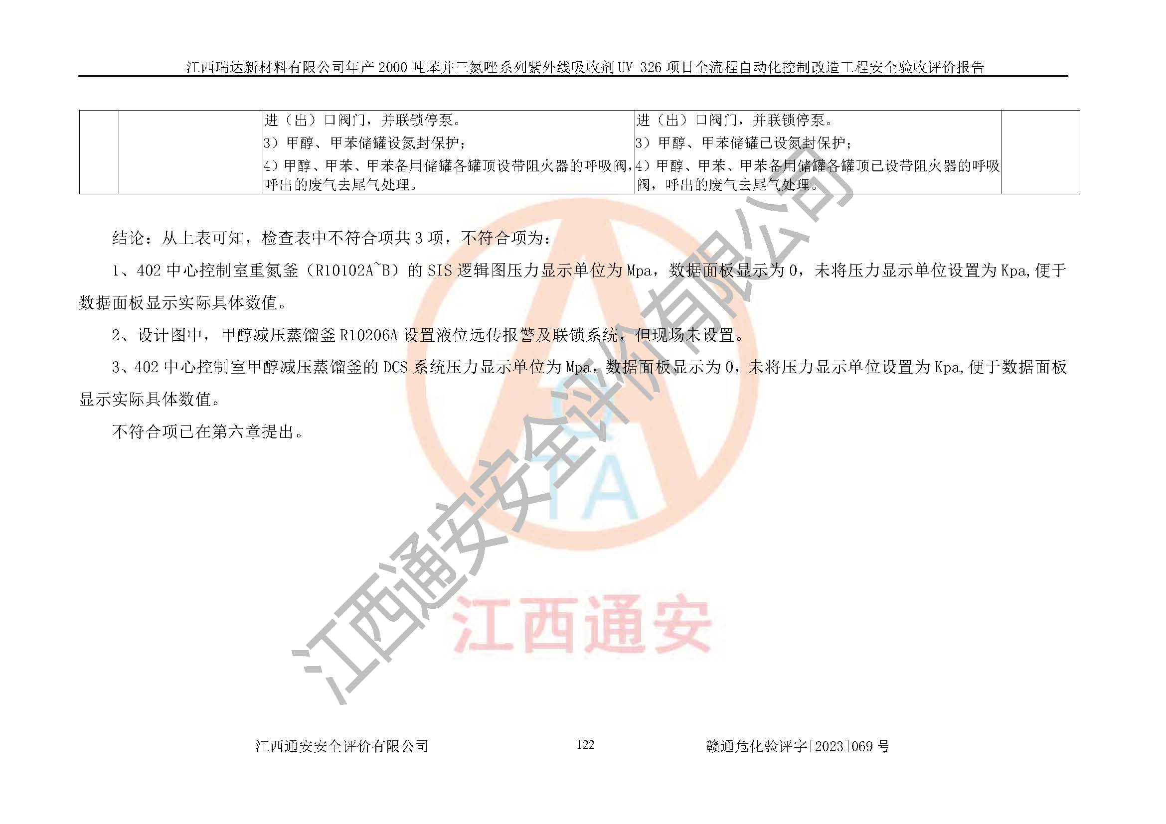評價報告名稱 | 江西瑞達(dá)新材料有限公司年產(chǎn)2000噸苯并三氮唑系列紫外線吸收劑UV-326項目全流程自動化控制改造工程安全驗收評價報告 | |||