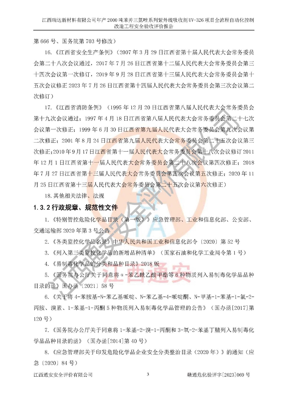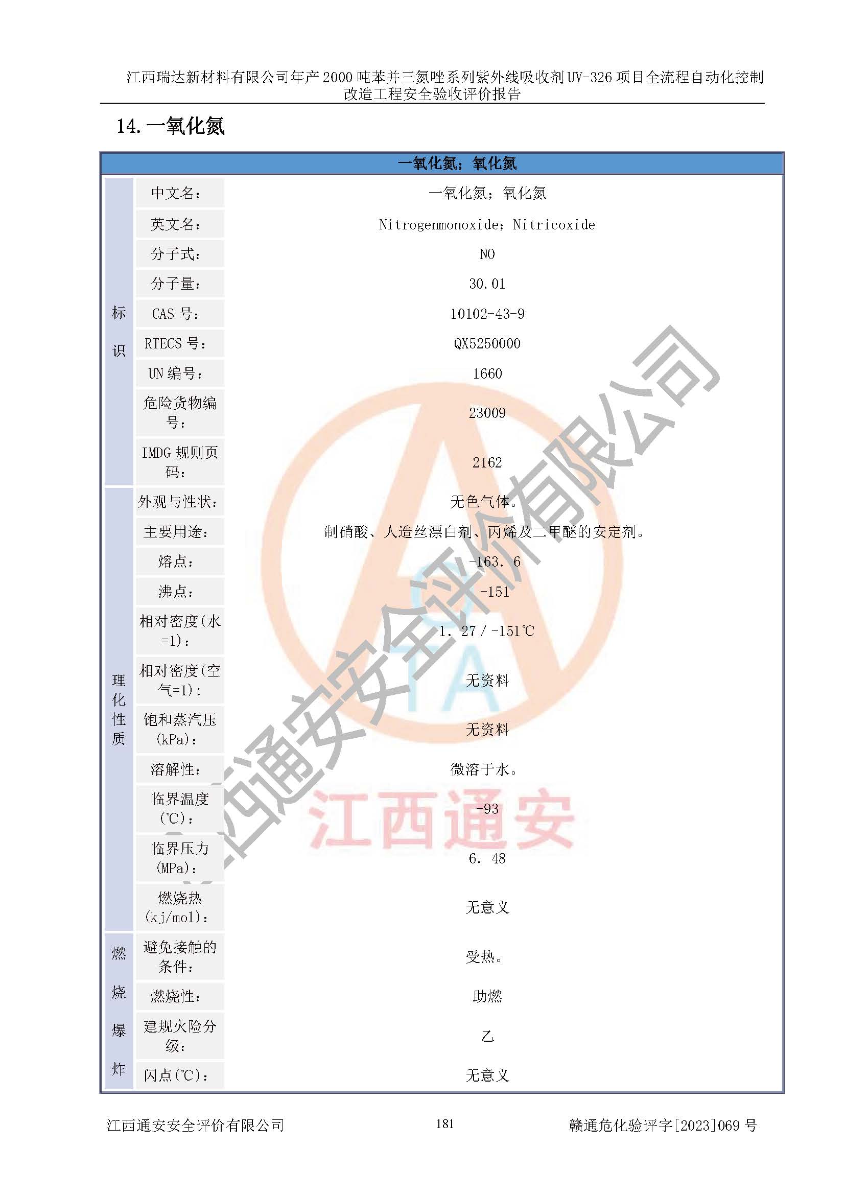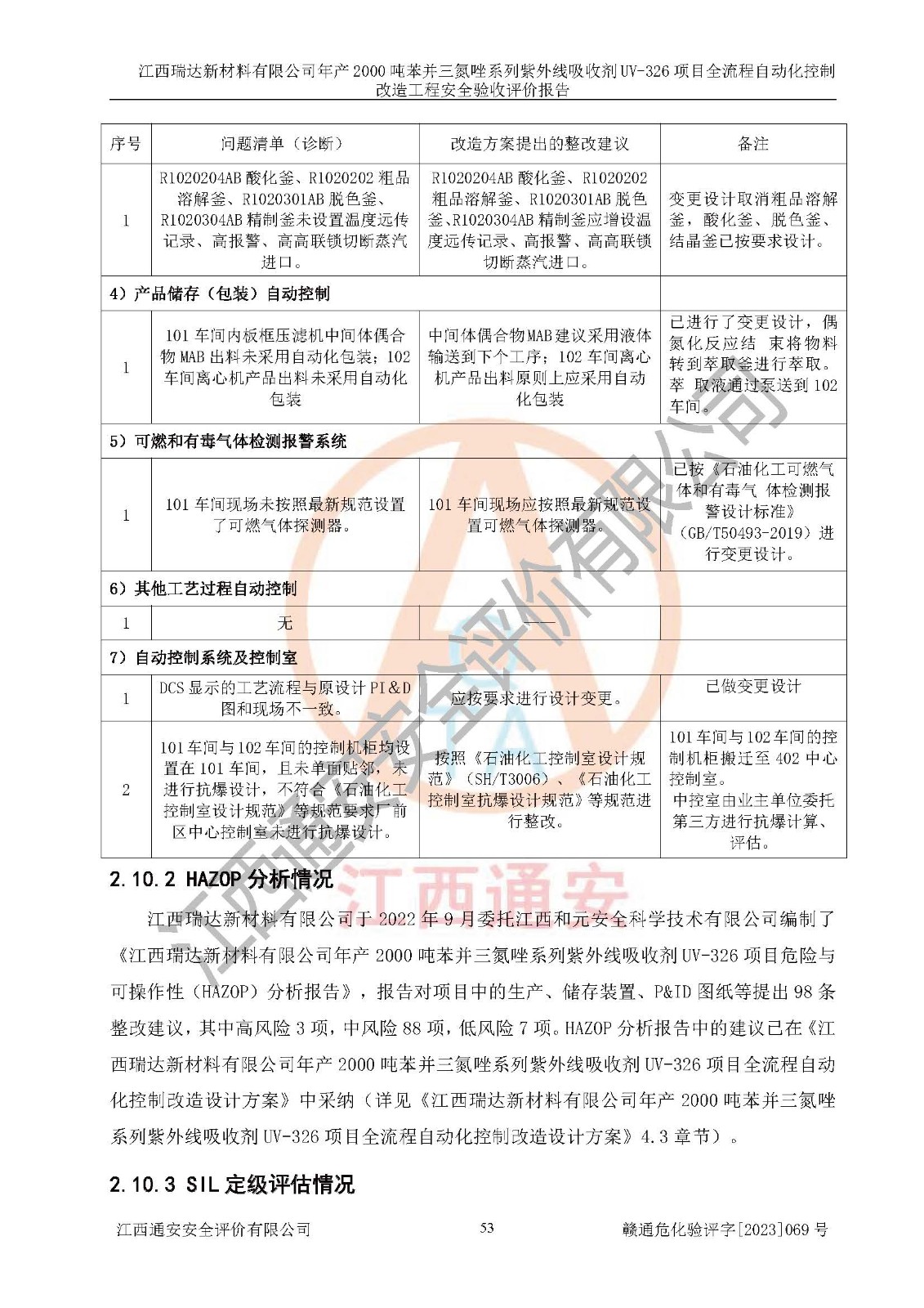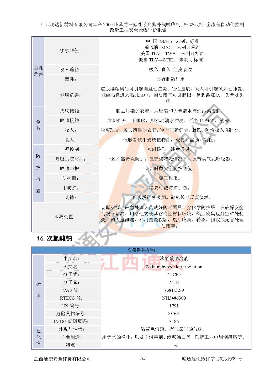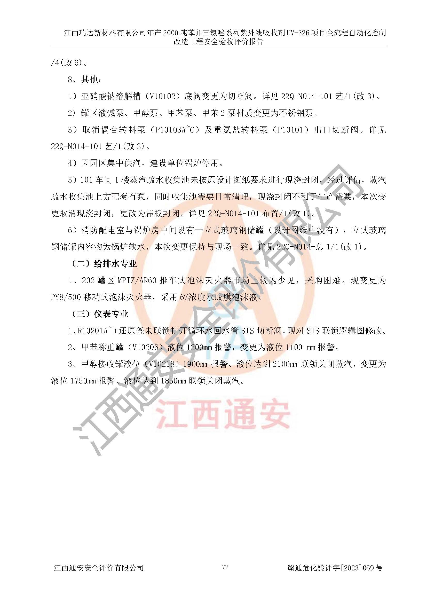 評價報告名稱 | 江西瑞達(dá)新材料有限公司年產(chǎn)2000噸苯并三氮唑系列紫外線吸收劑UV-326項目全流程自動化控制改造工程安全驗收評價報告 | |||