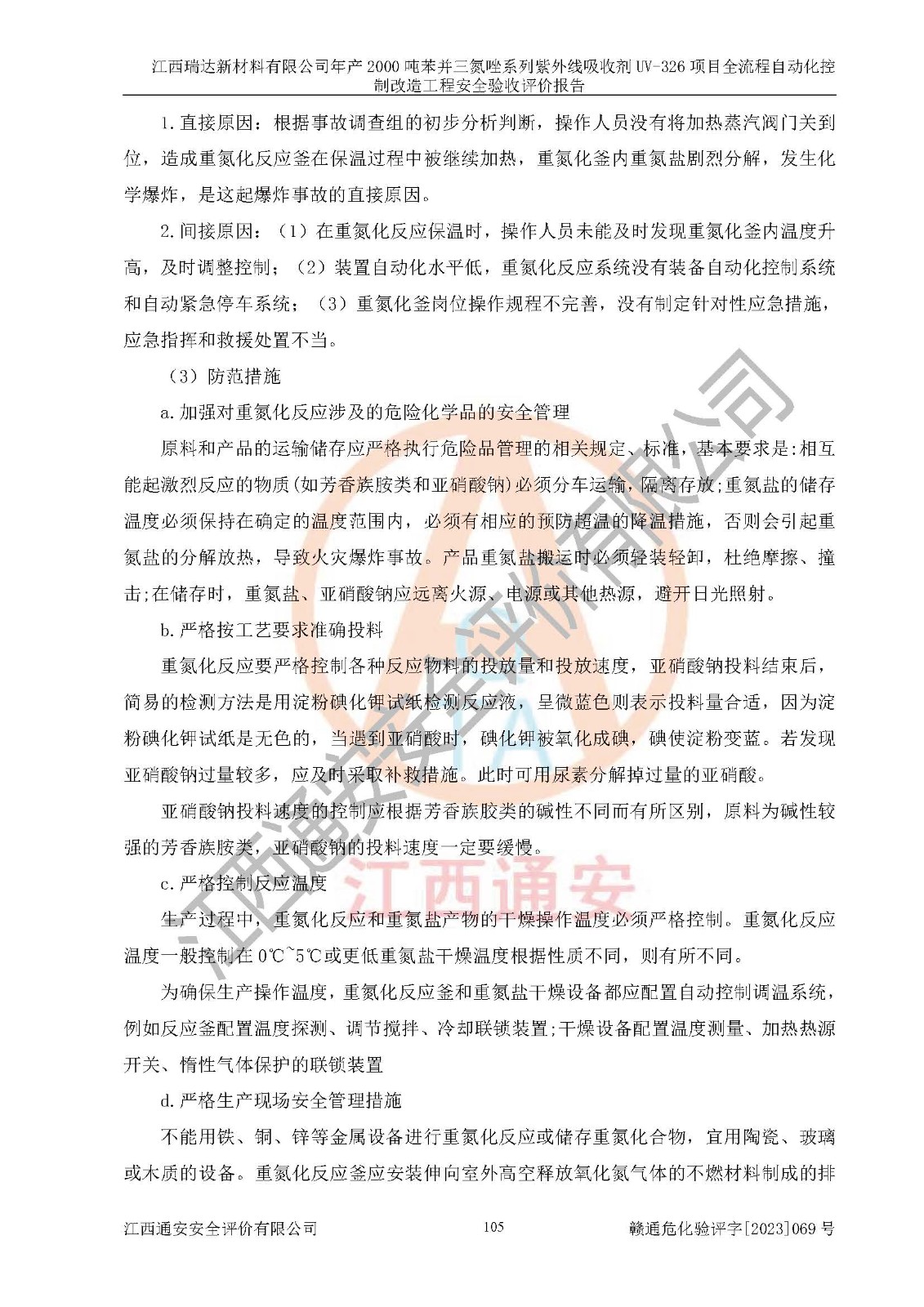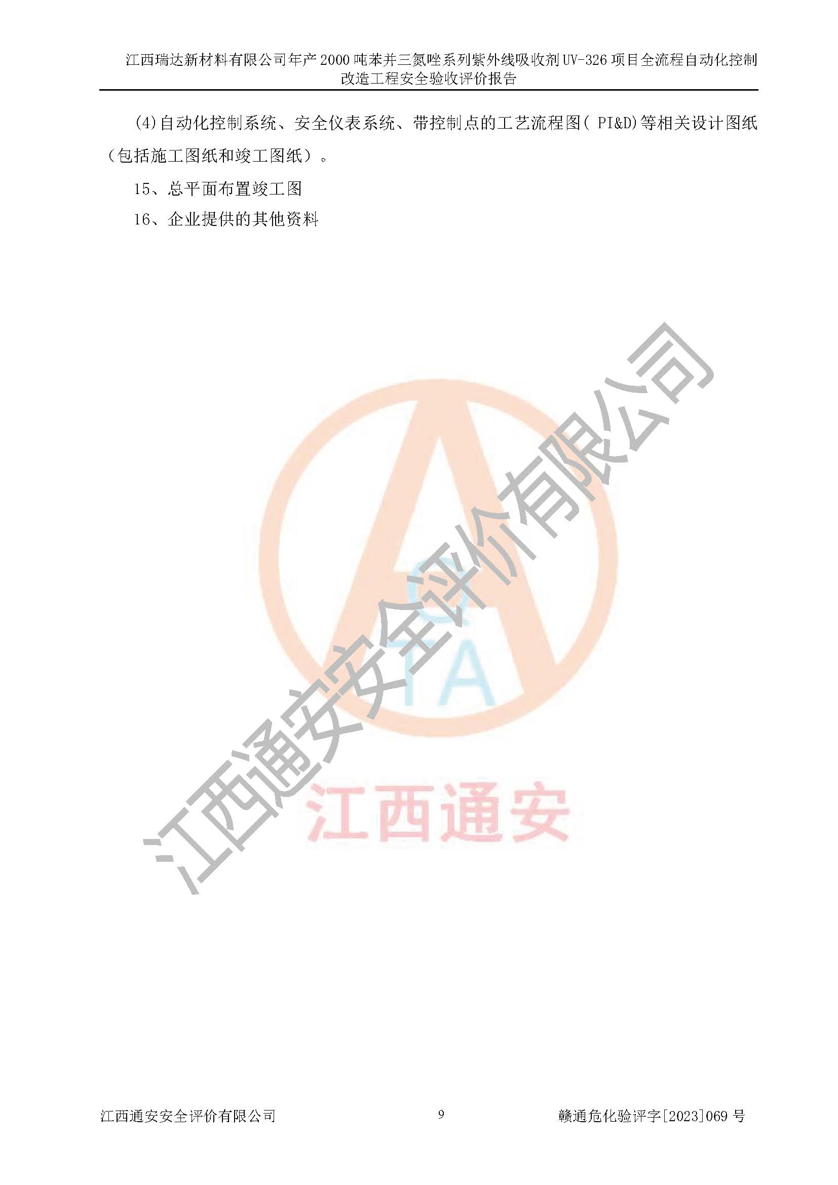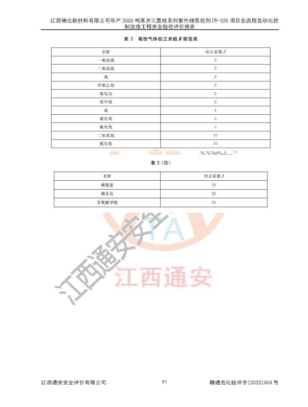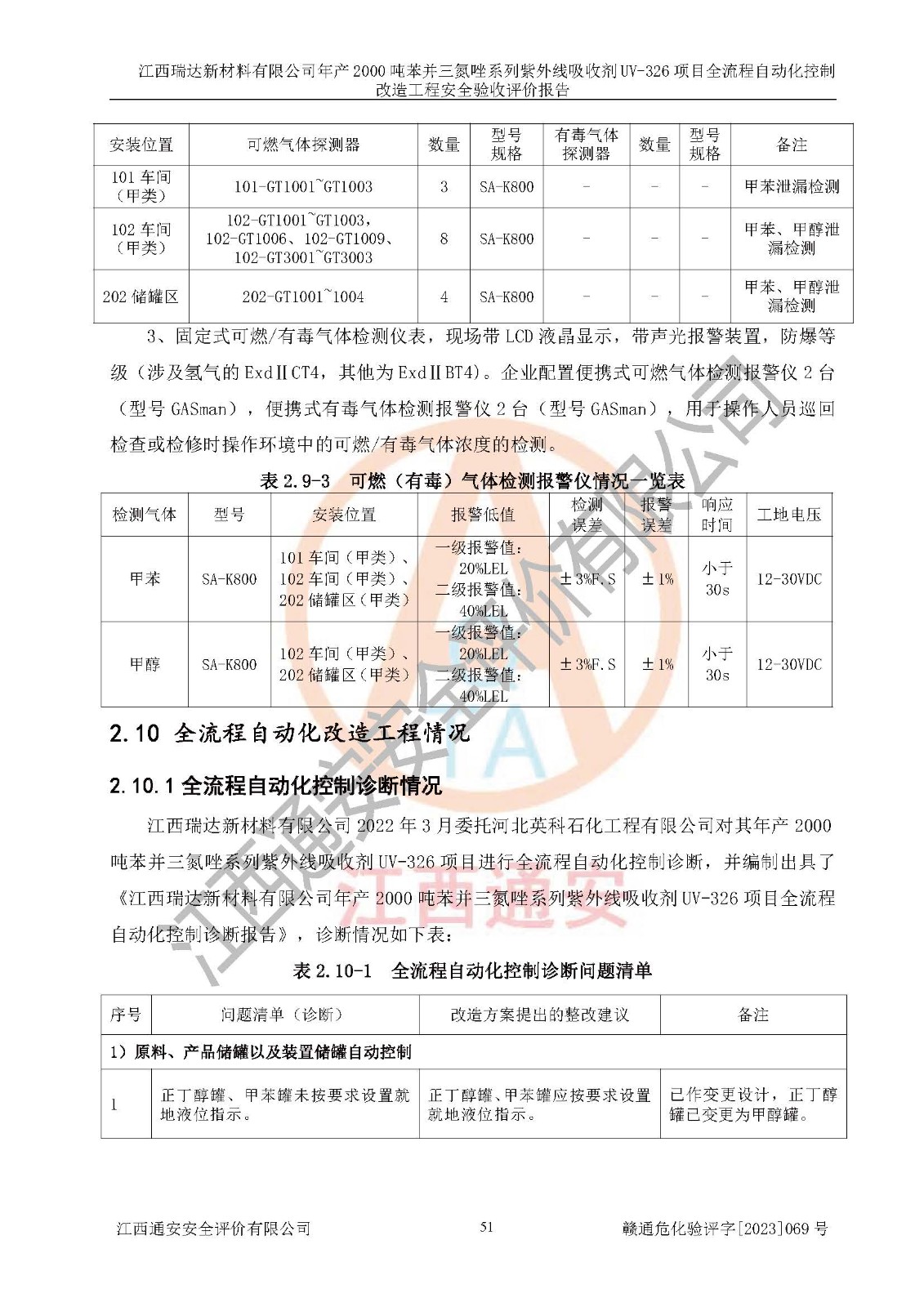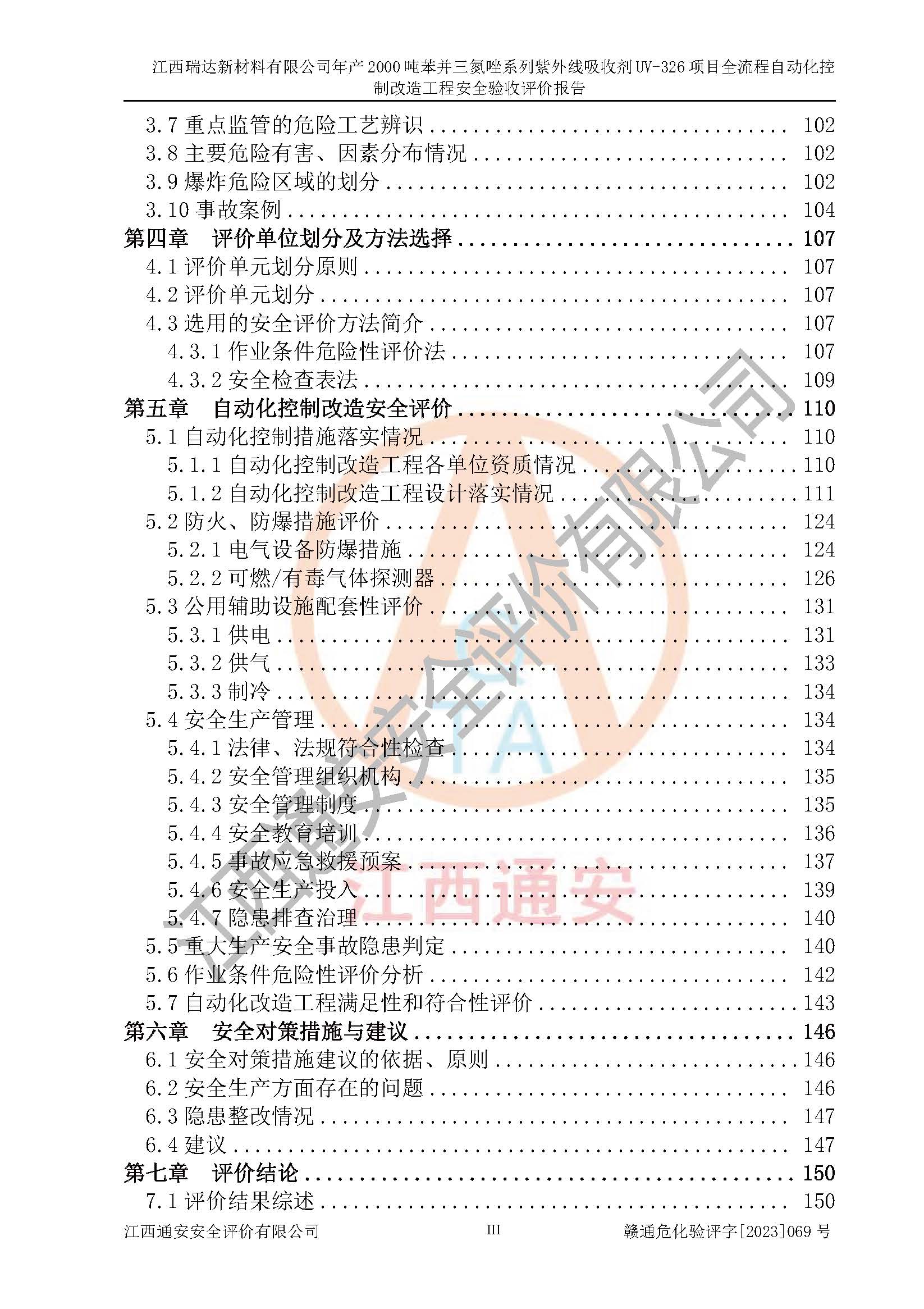 評價報告名稱 | 江西瑞達(dá)新材料有限公司年產(chǎn)2000噸苯并三氮唑系列紫外線吸收劑UV-326項目全流程自動化控制改造工程安全驗收評價報告 | |||