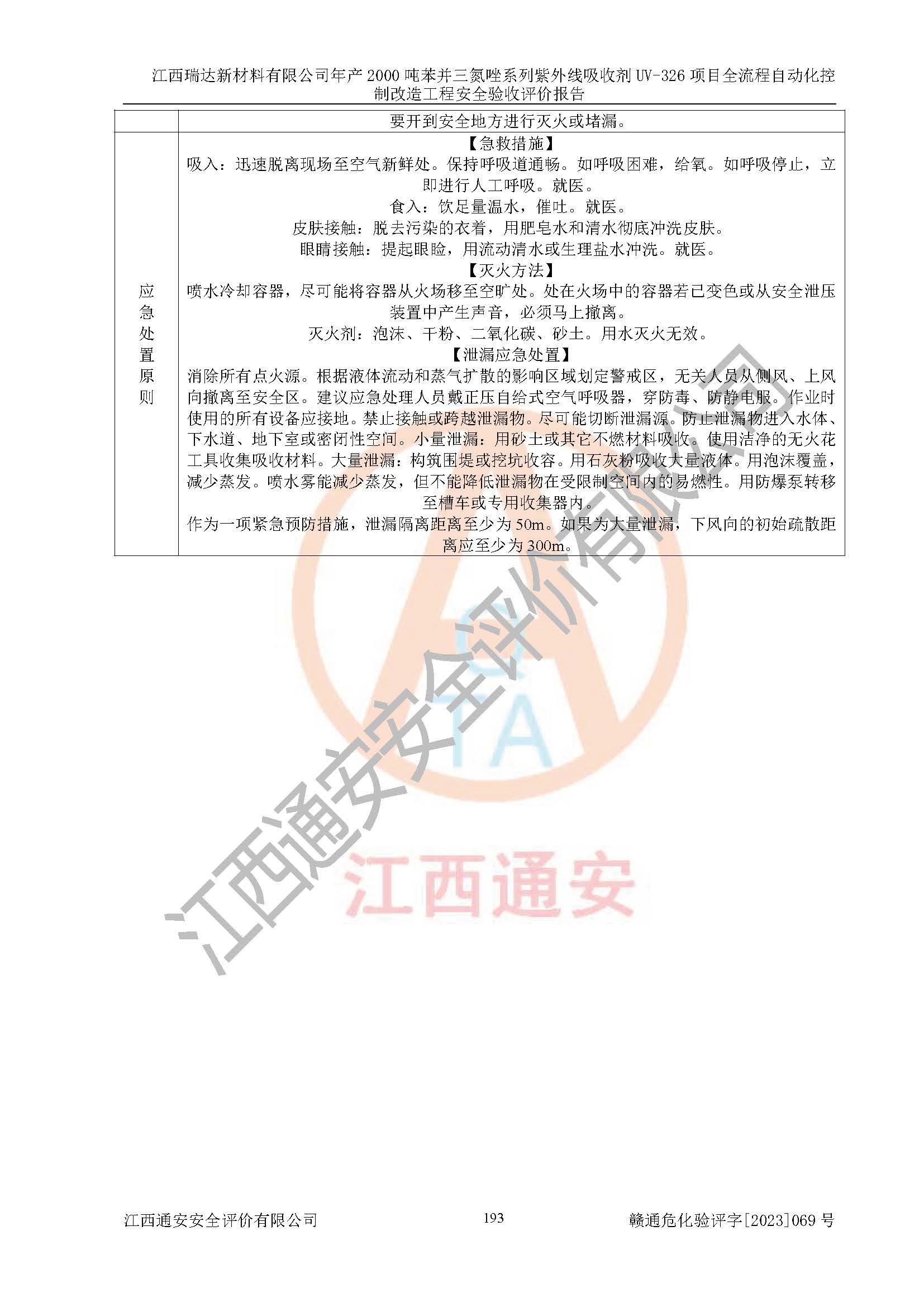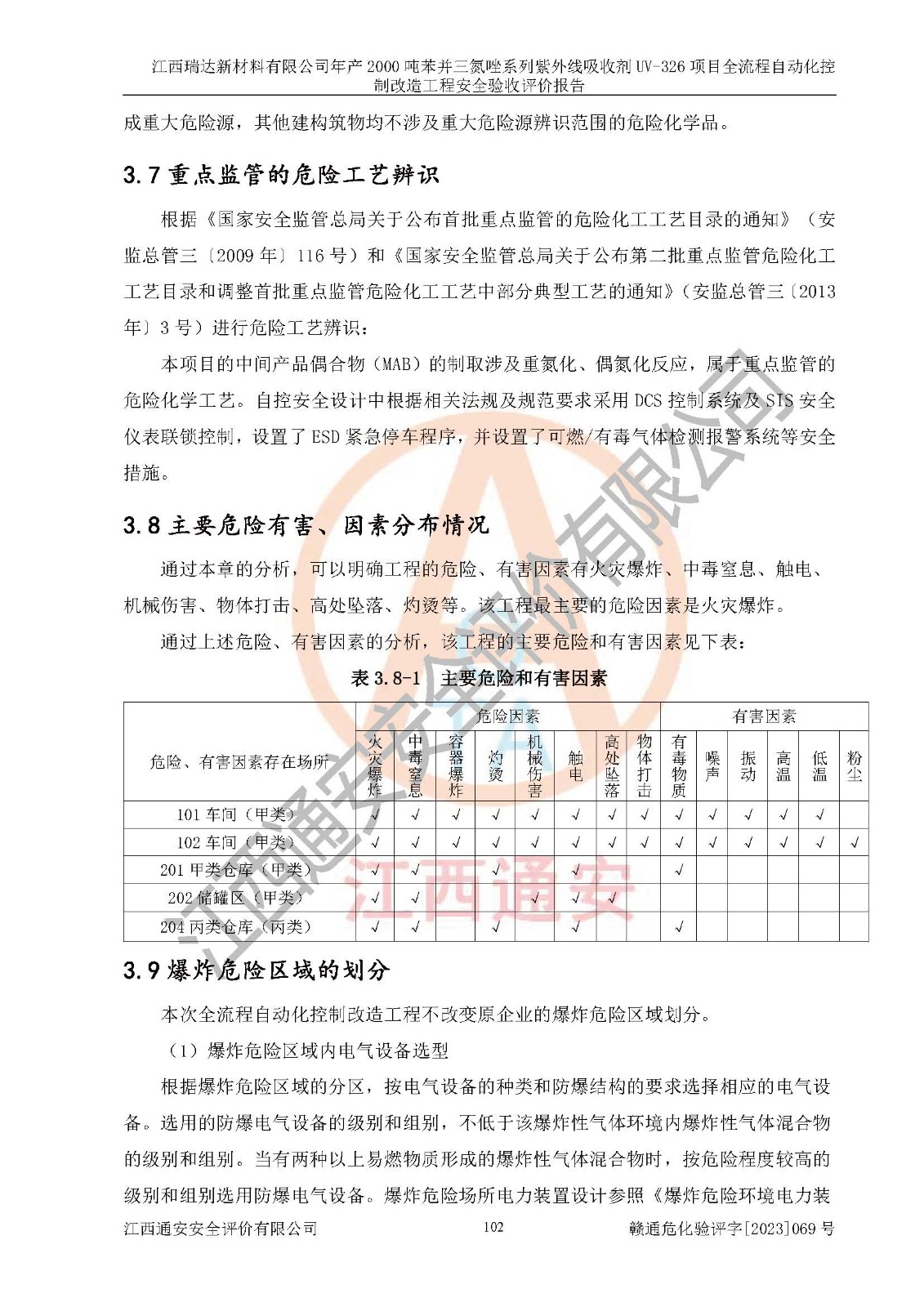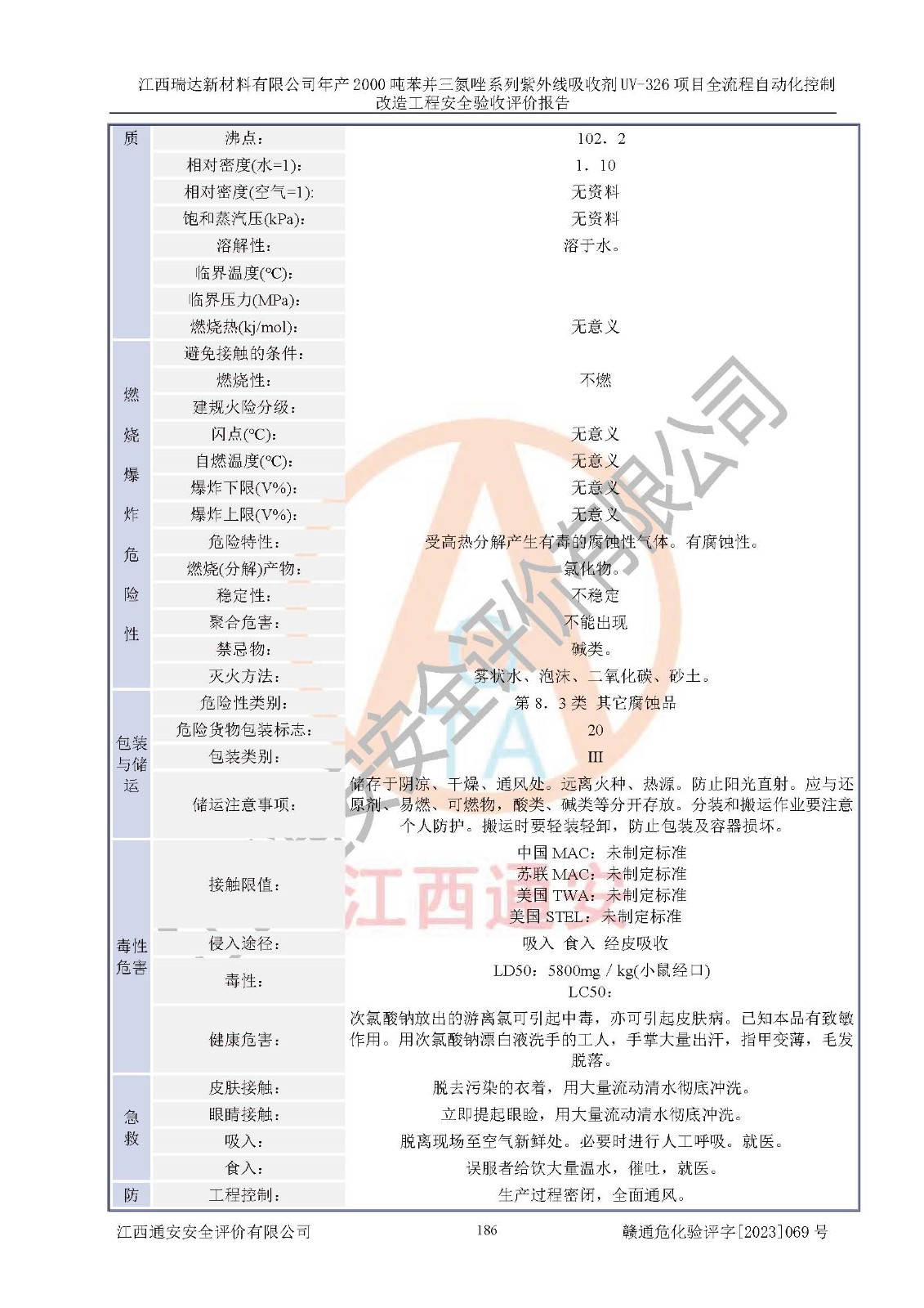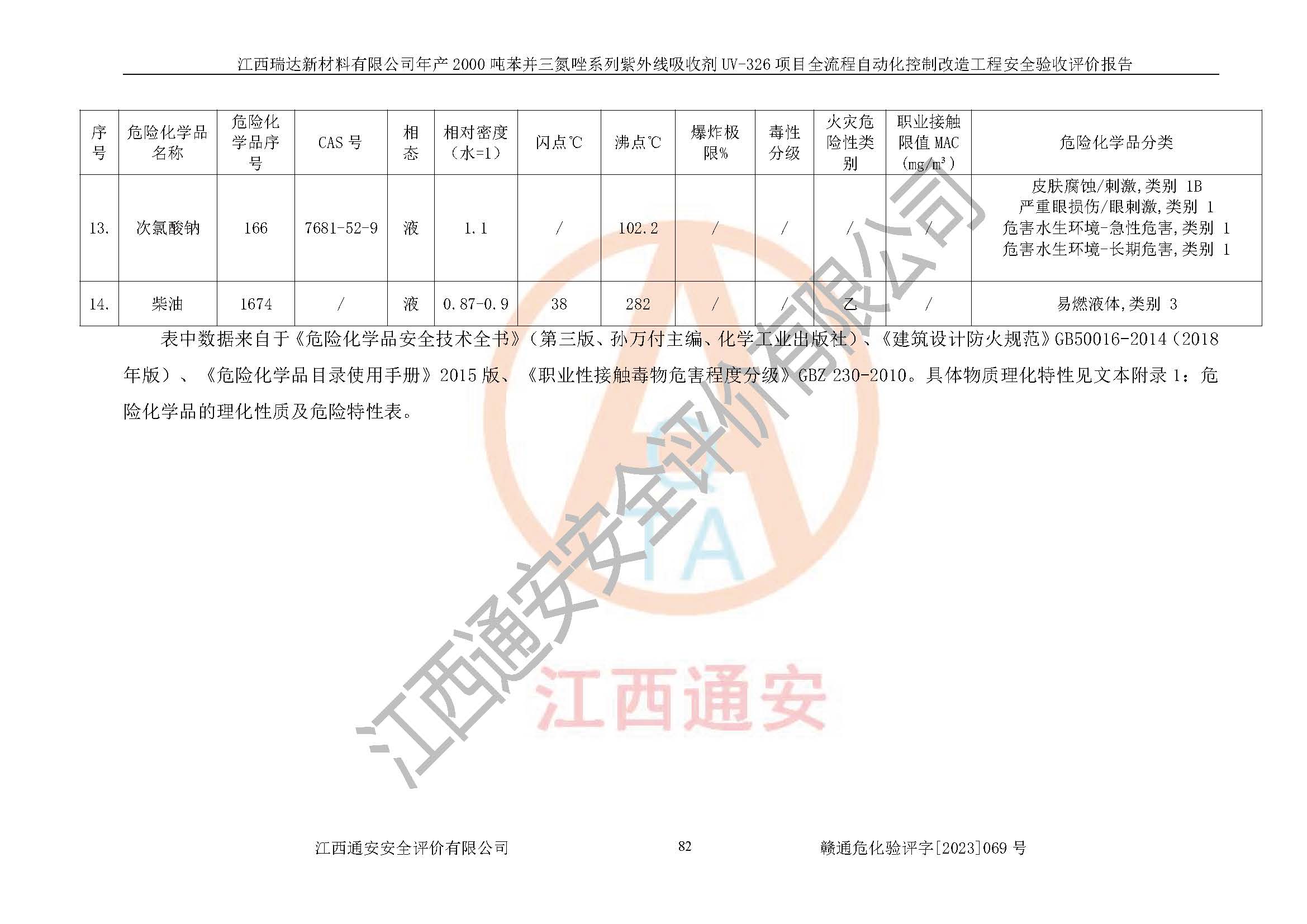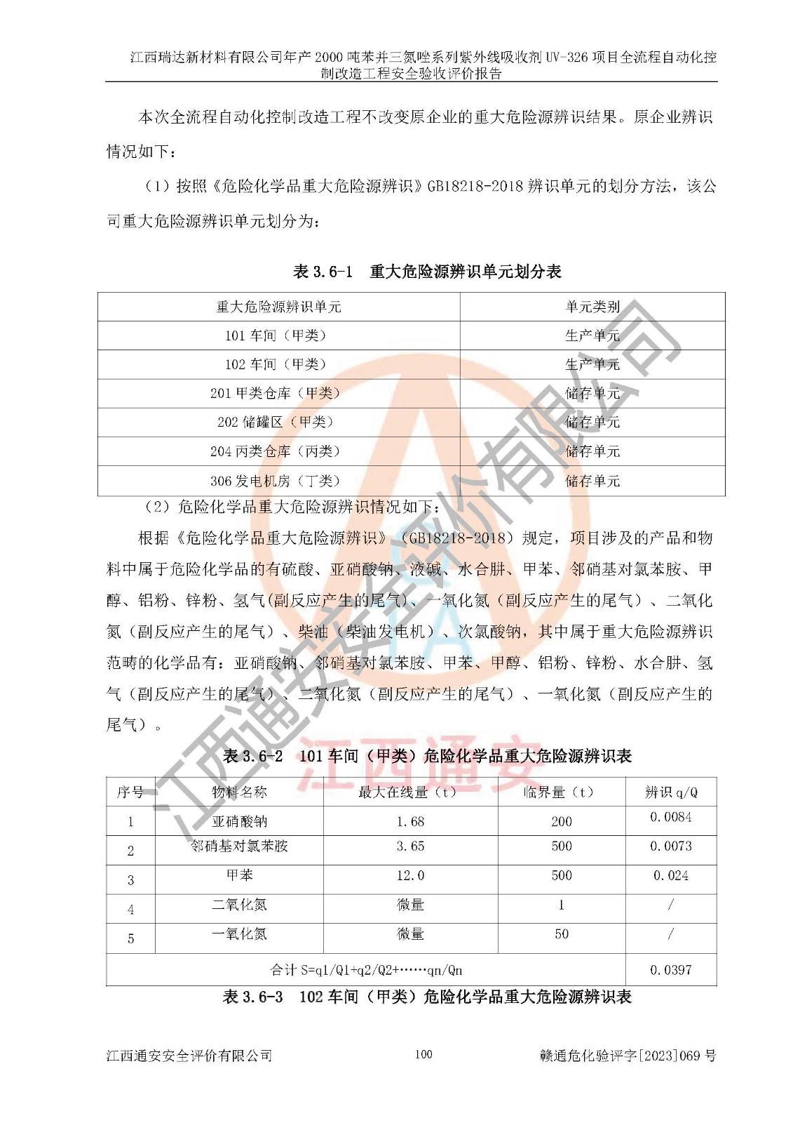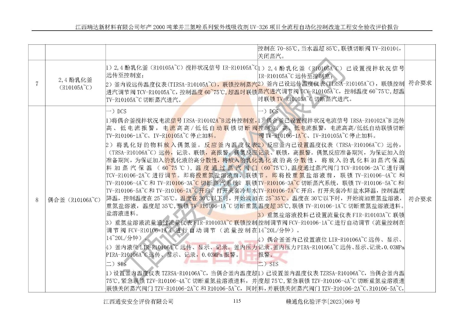 評價報告名稱 | 江西瑞達(dá)新材料有限公司年產(chǎn)2000噸苯并三氮唑系列紫外線吸收劑UV-326項目全流程自動化控制改造工程安全驗收評價報告 | |||