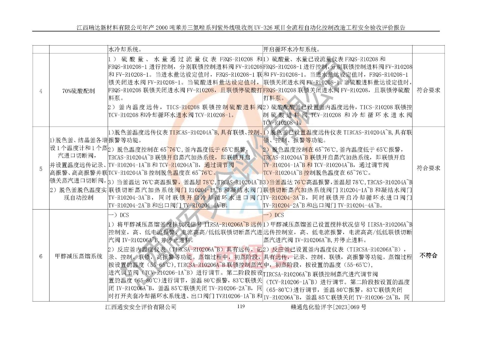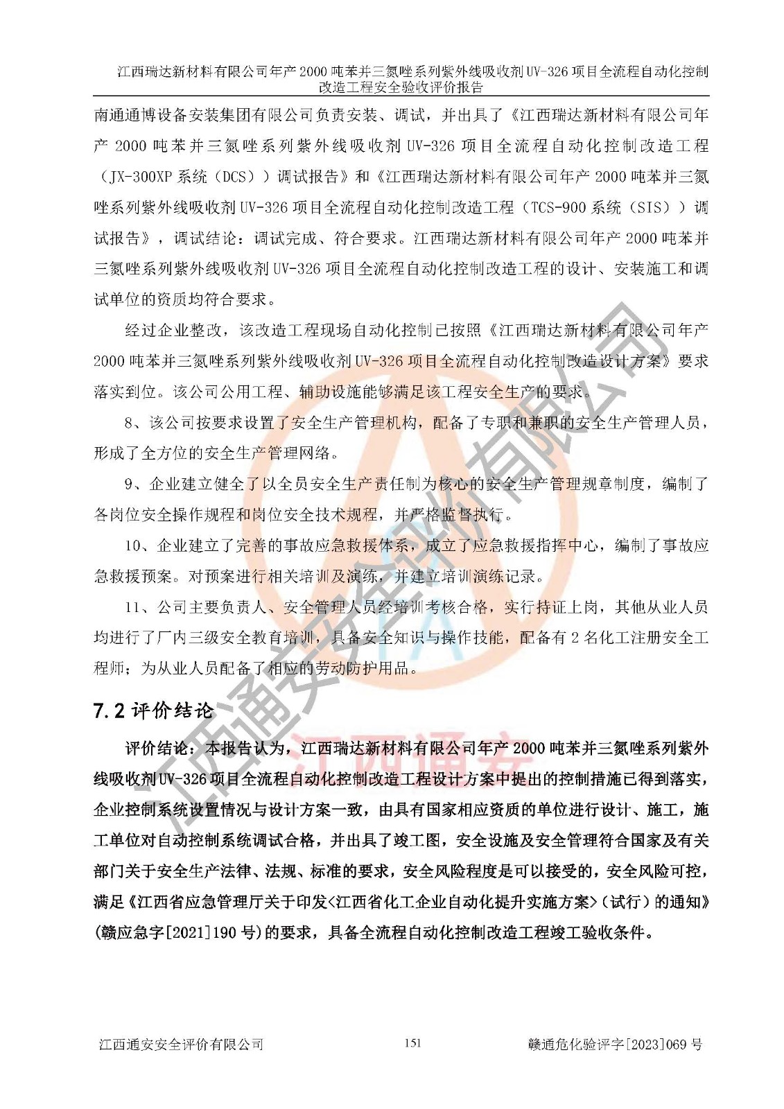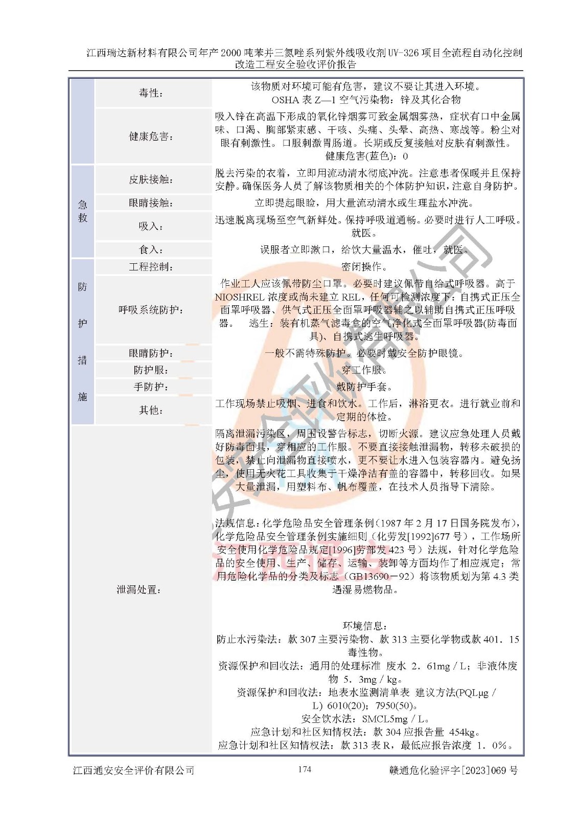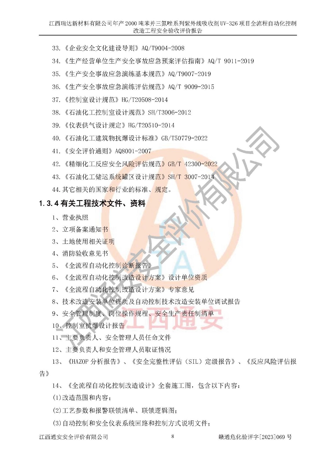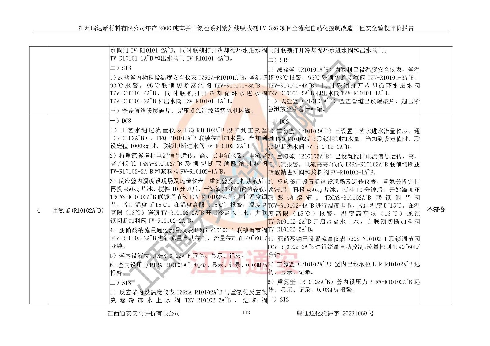 評價報告名稱 | 江西瑞達(dá)新材料有限公司年產(chǎn)2000噸苯并三氮唑系列紫外線吸收劑UV-326項目全流程自動化控制改造工程安全驗收評價報告 | |||