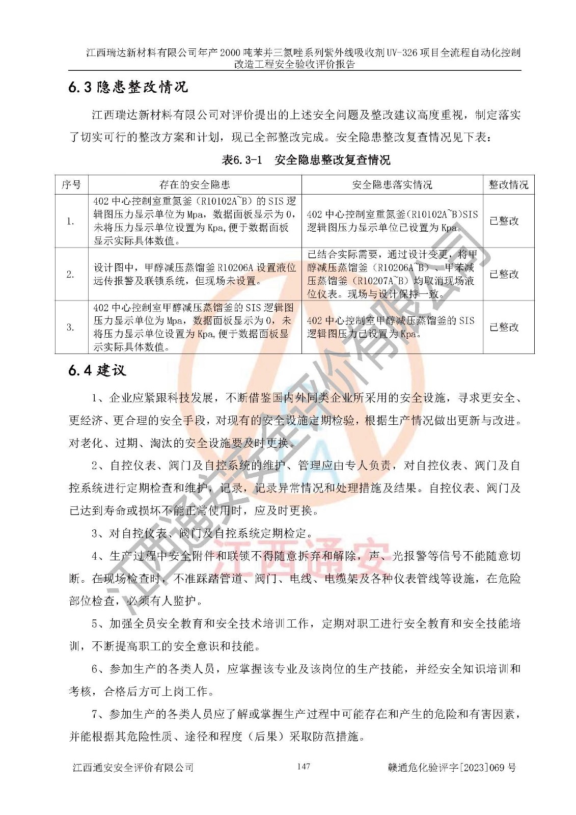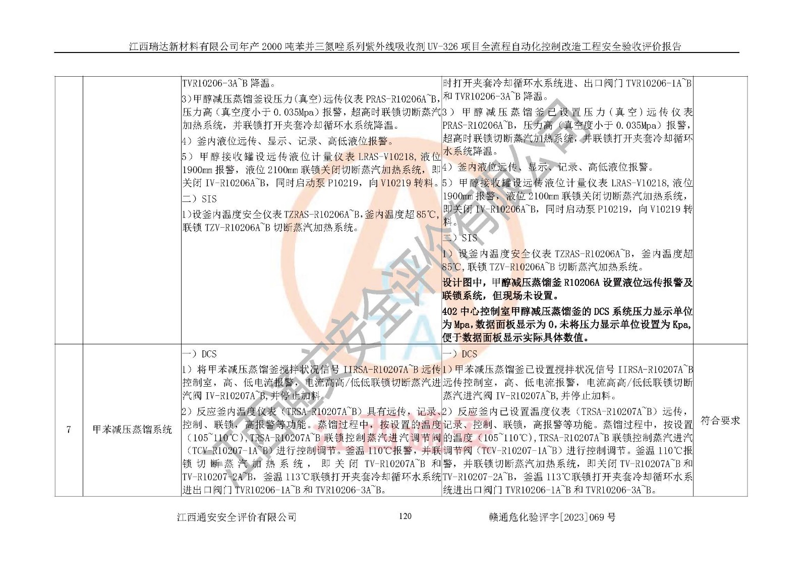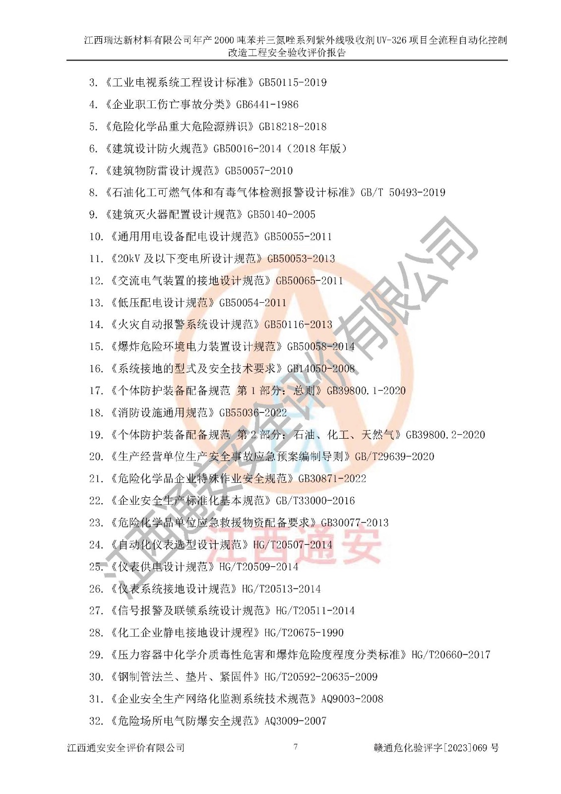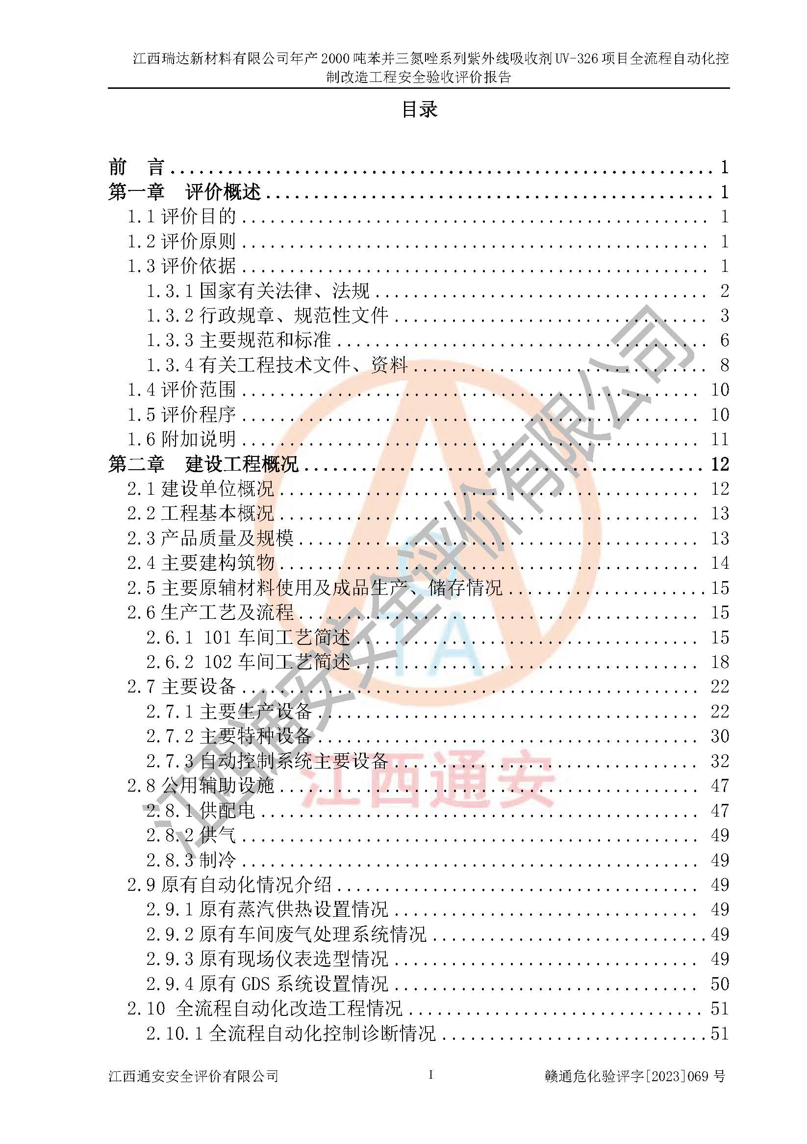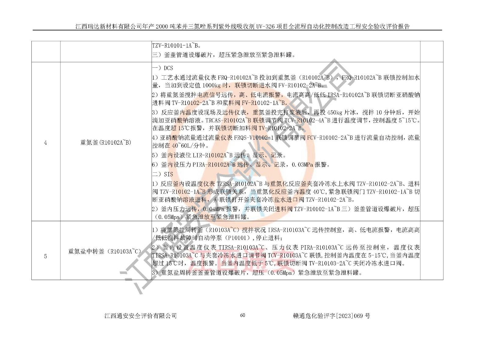 評價報告名稱 | 江西瑞達(dá)新材料有限公司年產(chǎn)2000噸苯并三氮唑系列紫外線吸收劑UV-326項目全流程自動化控制改造工程安全驗收評價報告 | |||