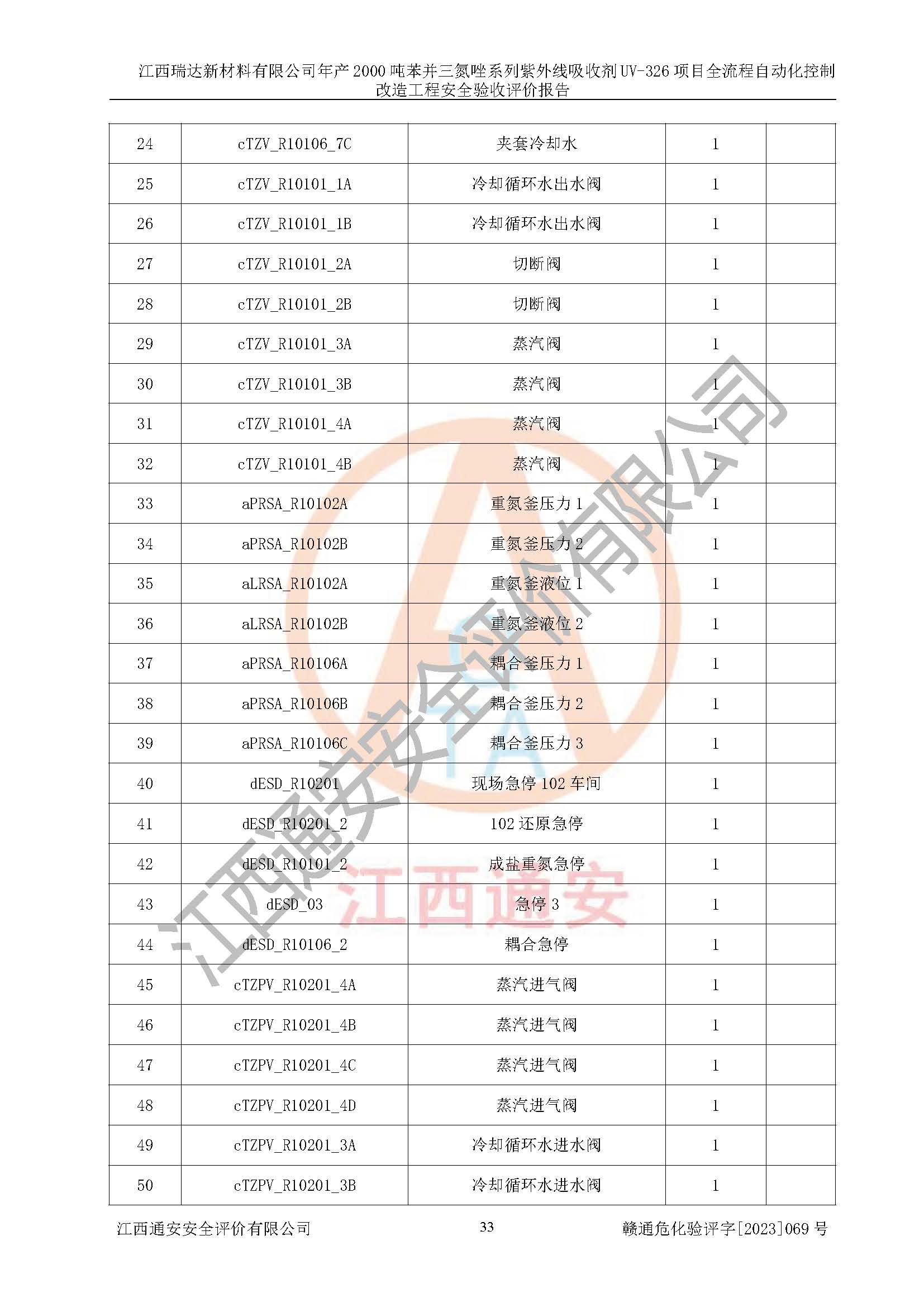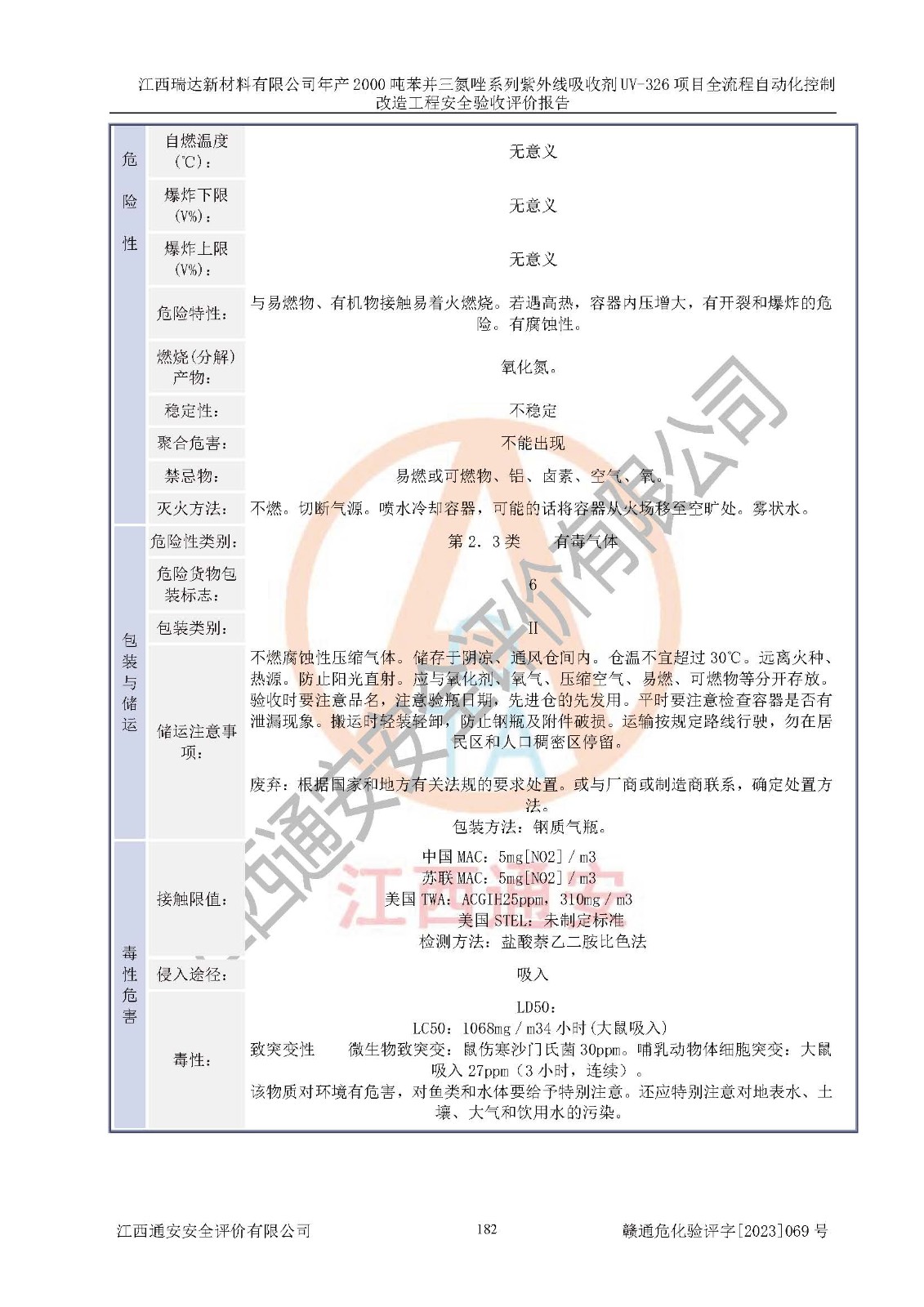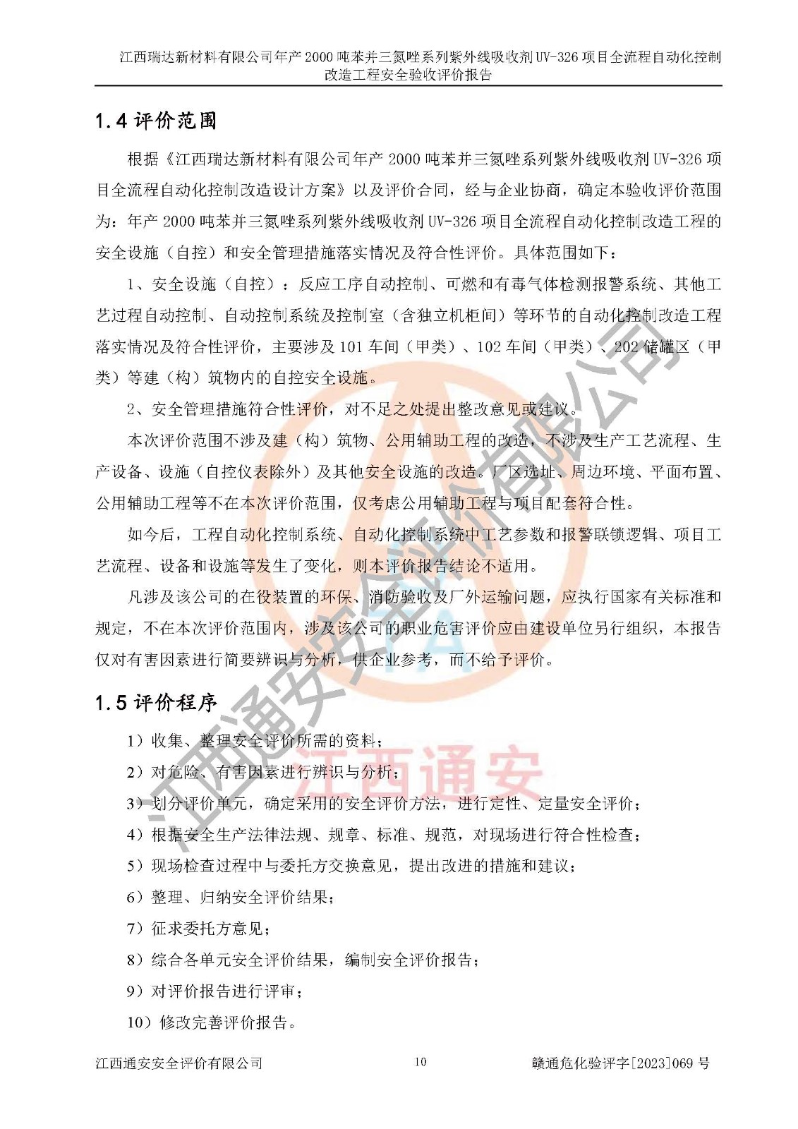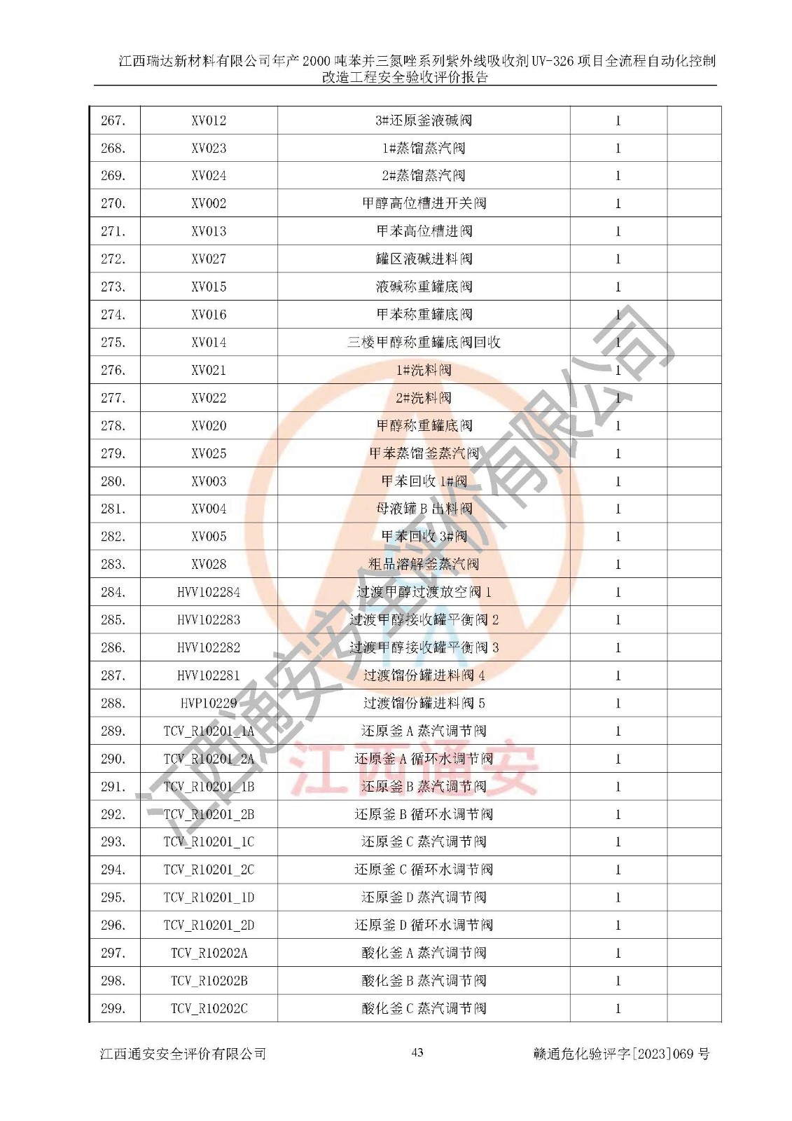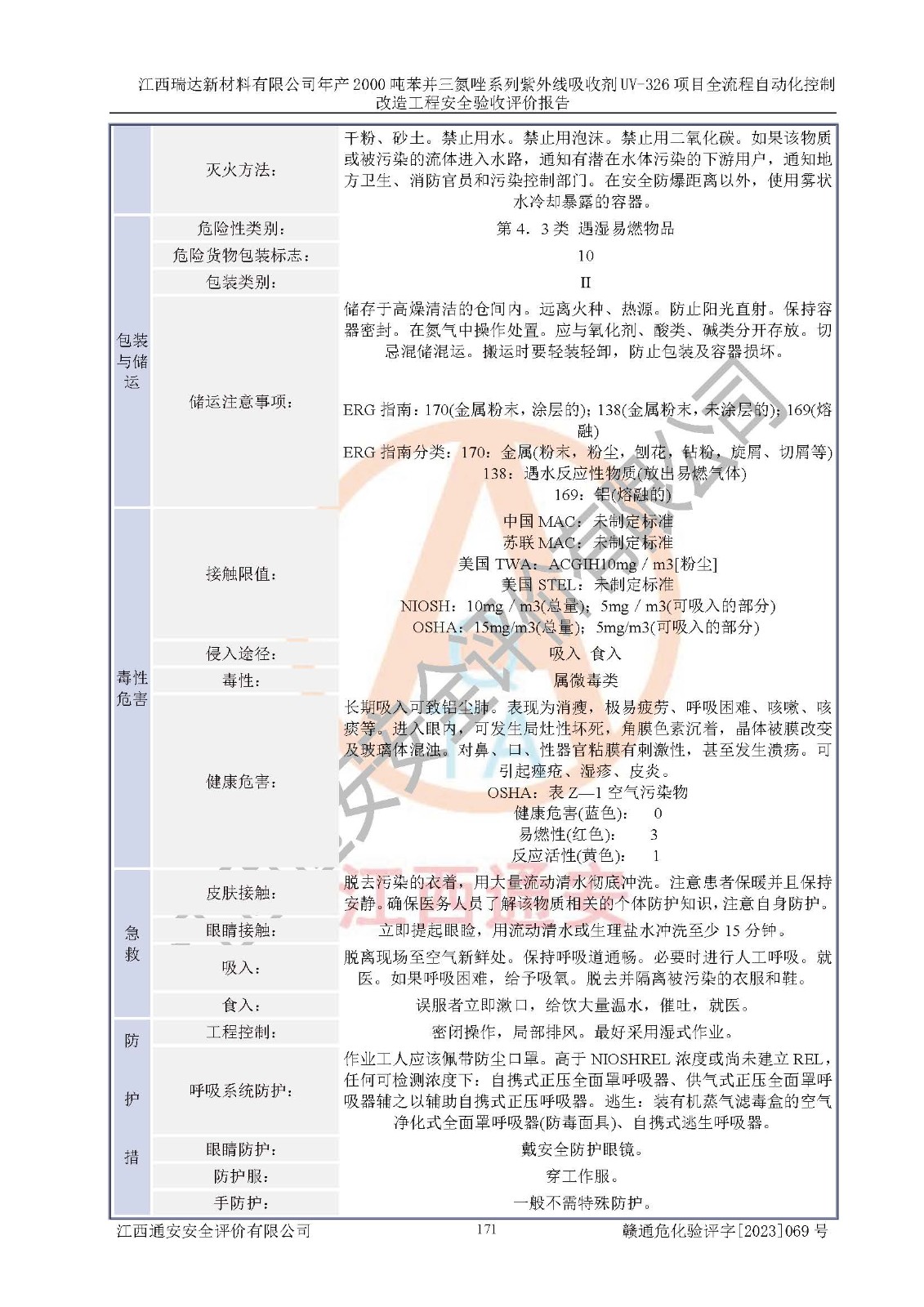 評價報告名稱 | 江西瑞達(dá)新材料有限公司年產(chǎn)2000噸苯并三氮唑系列紫外線吸收劑UV-326項目全流程自動化控制改造工程安全驗收評價報告 | |||