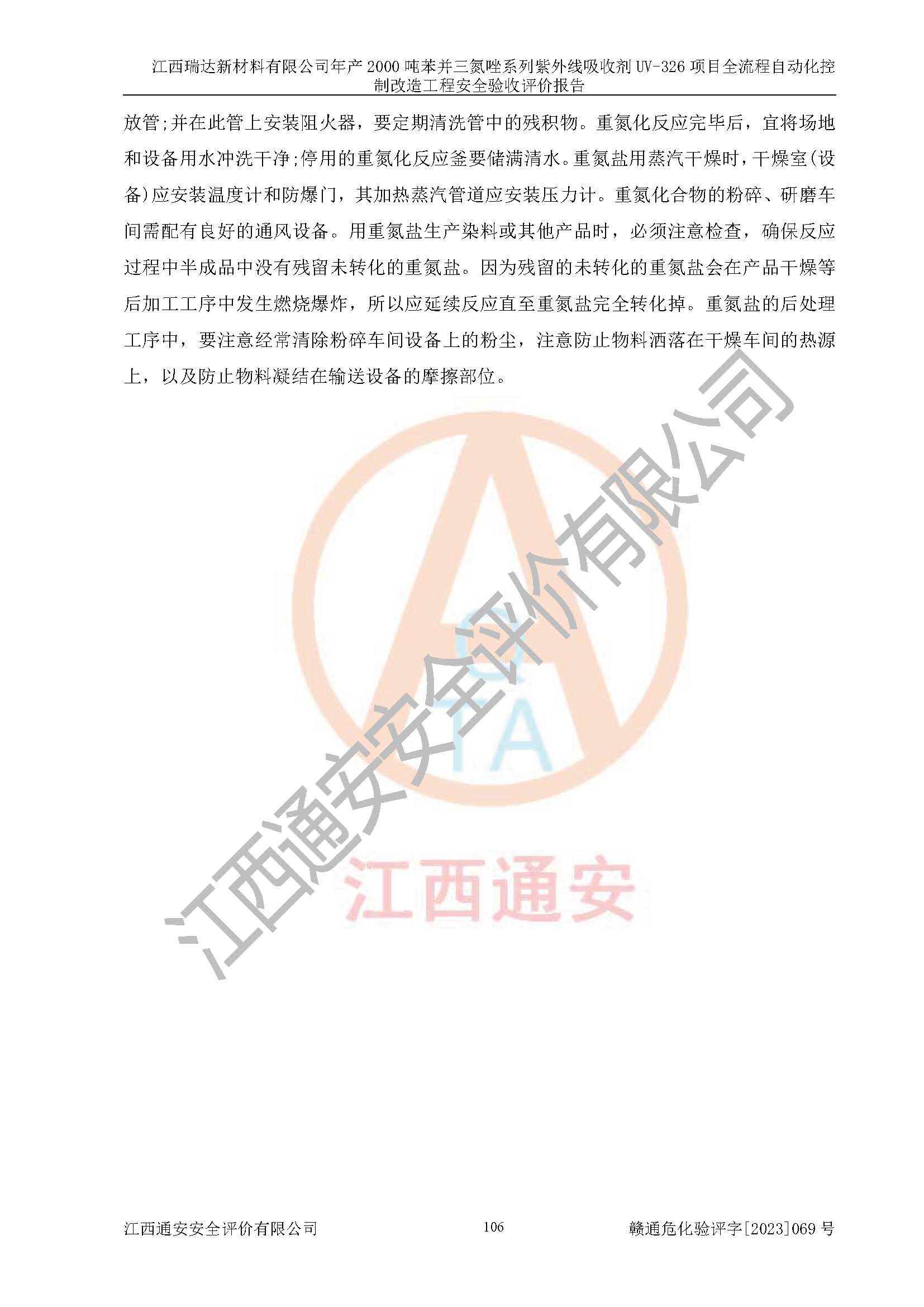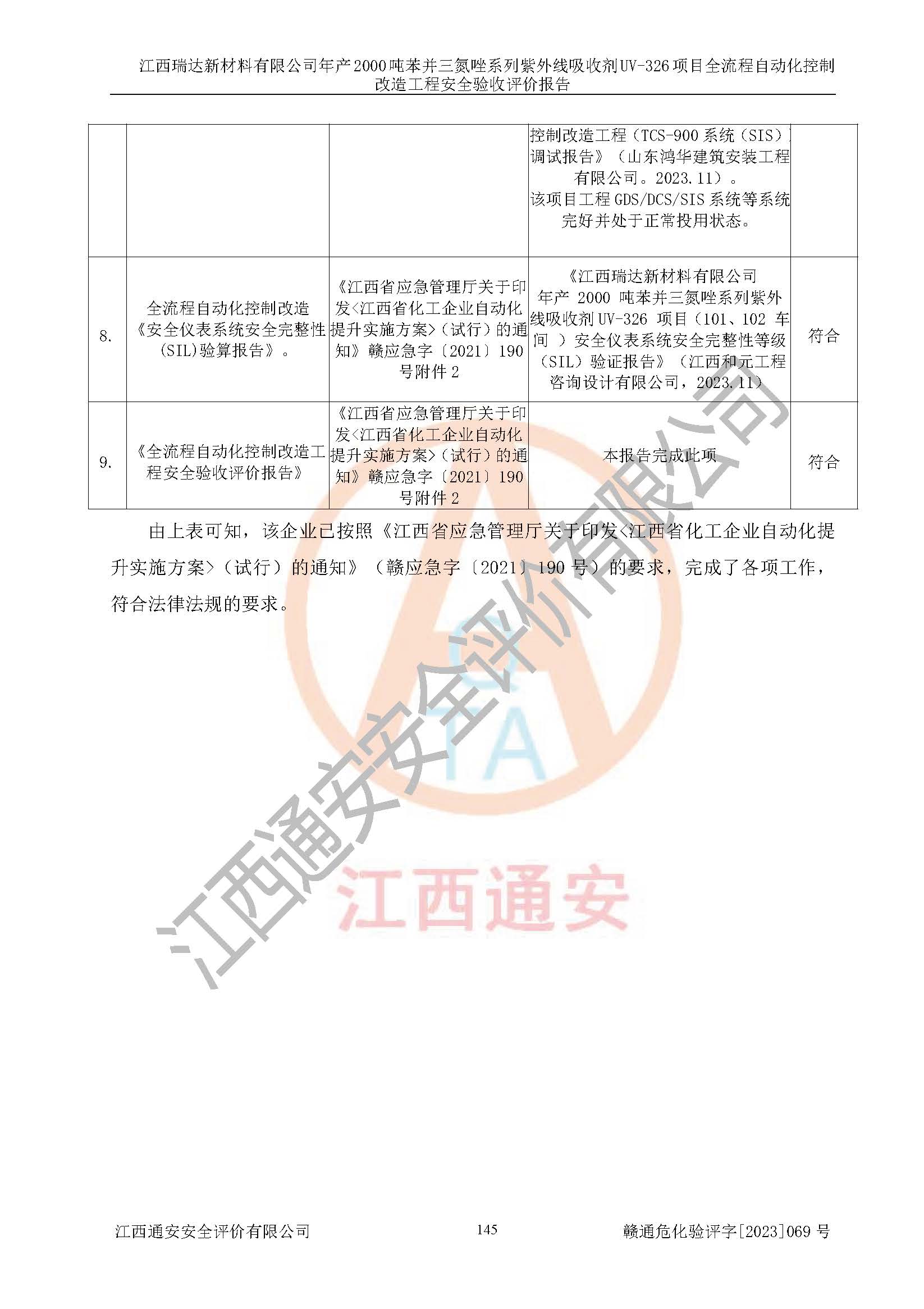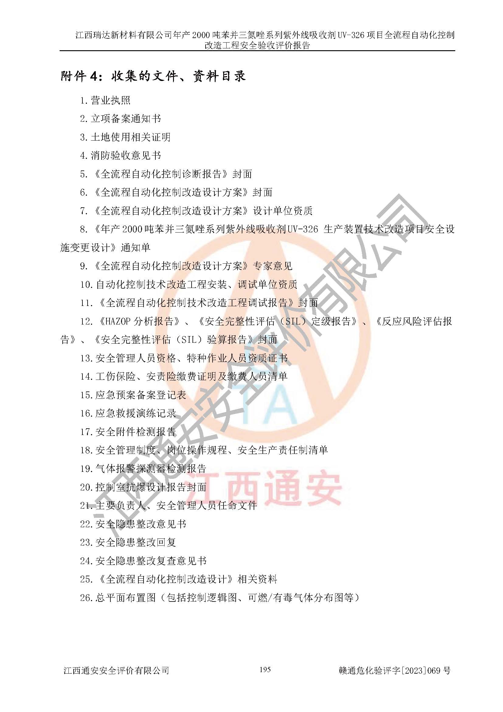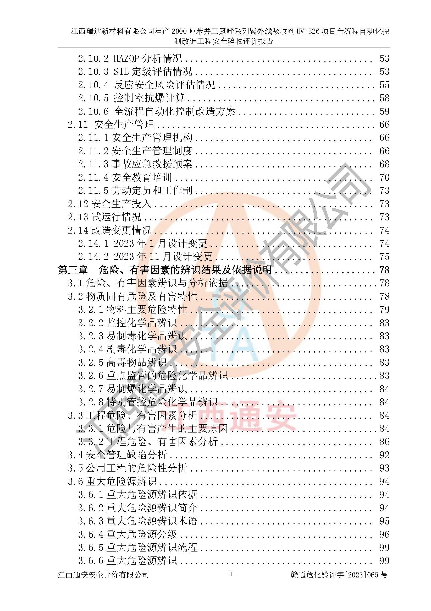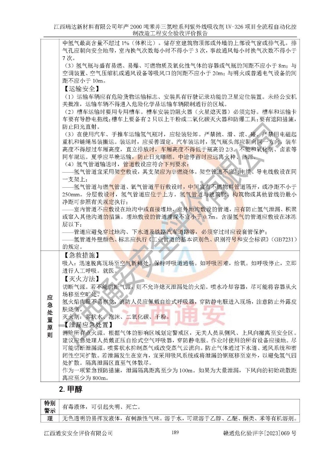 評價報告名稱 | 江西瑞達(dá)新材料有限公司年產(chǎn)2000噸苯并三氮唑系列紫外線吸收劑UV-326項目全流程自動化控制改造工程安全驗收評價報告 | |||