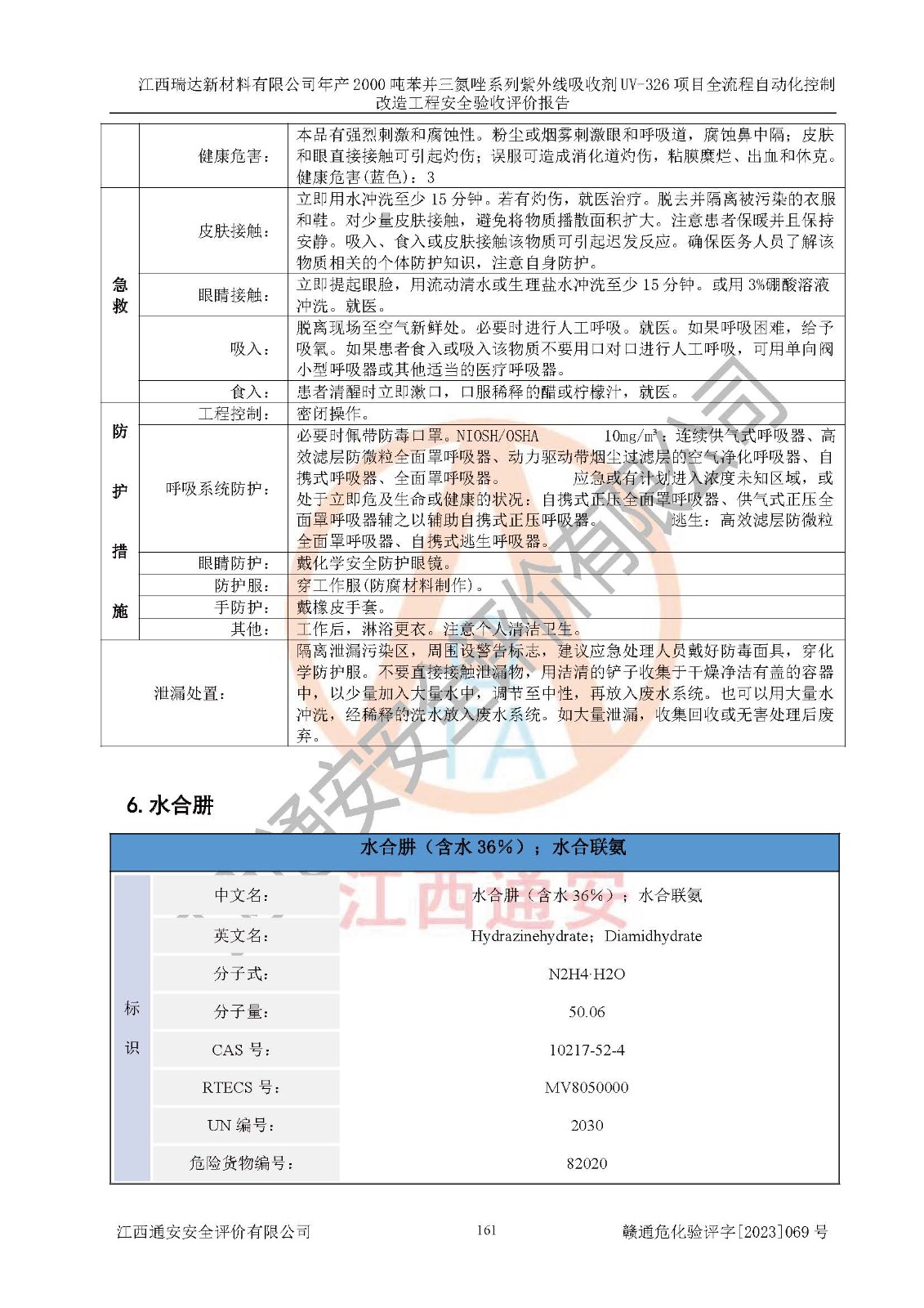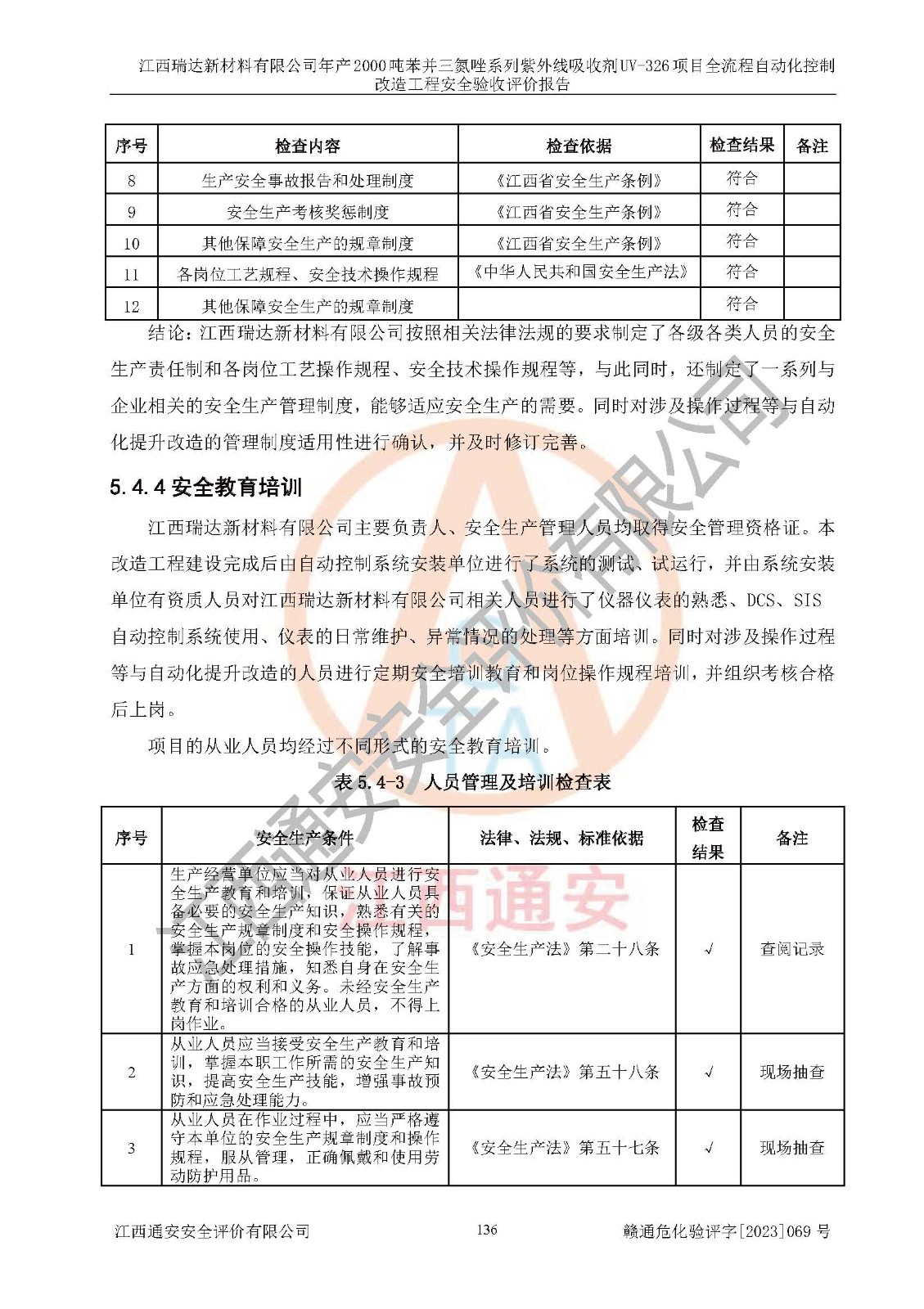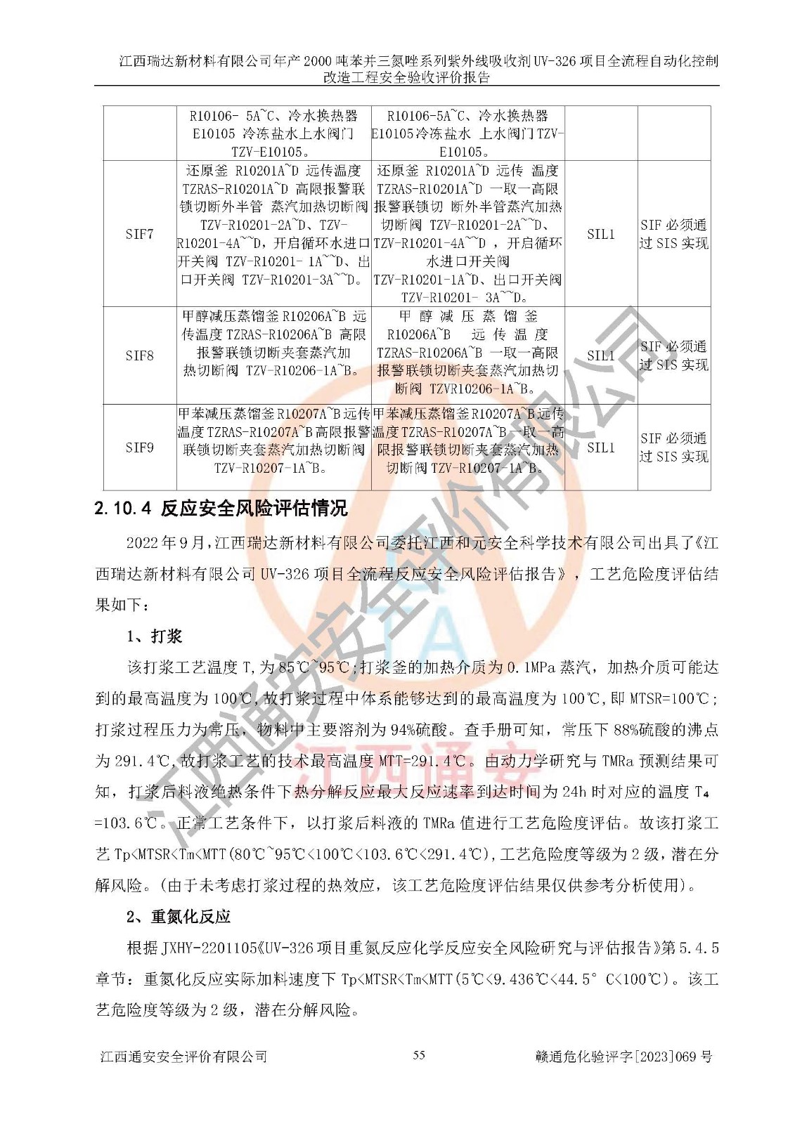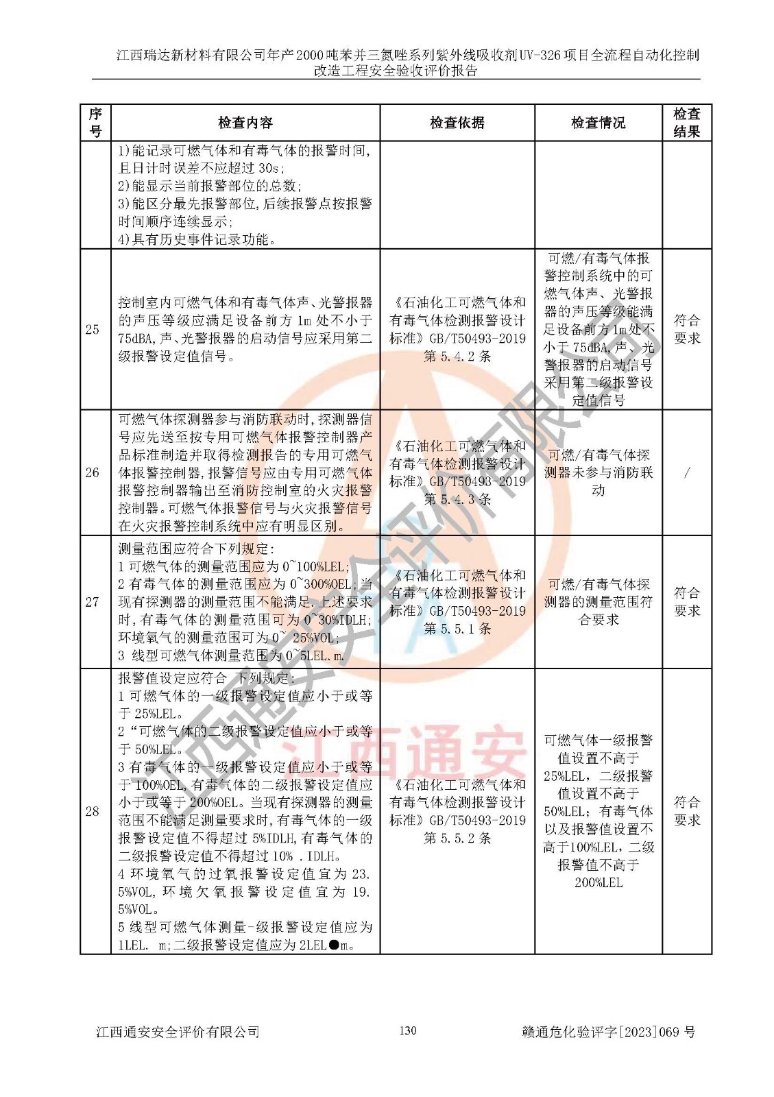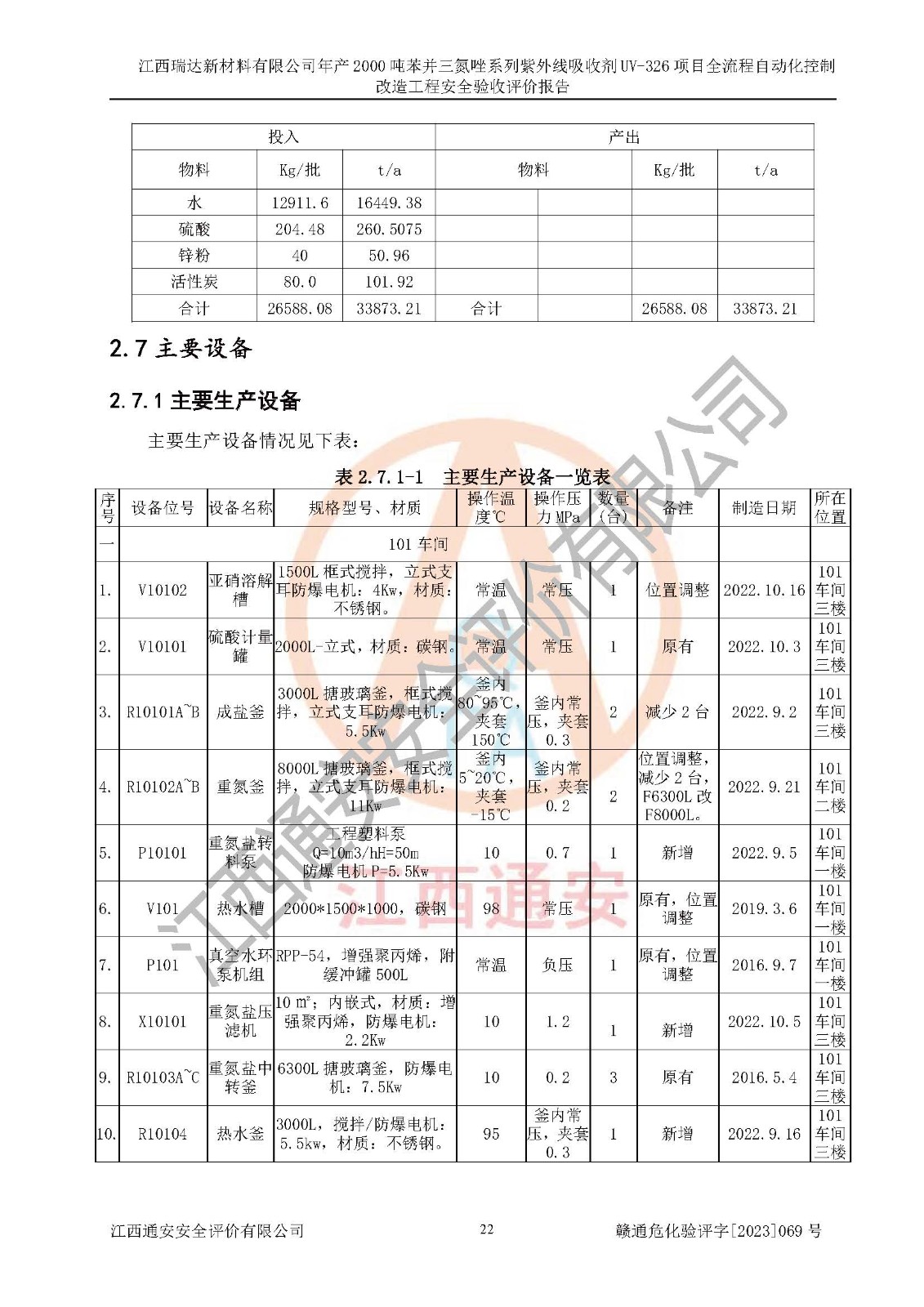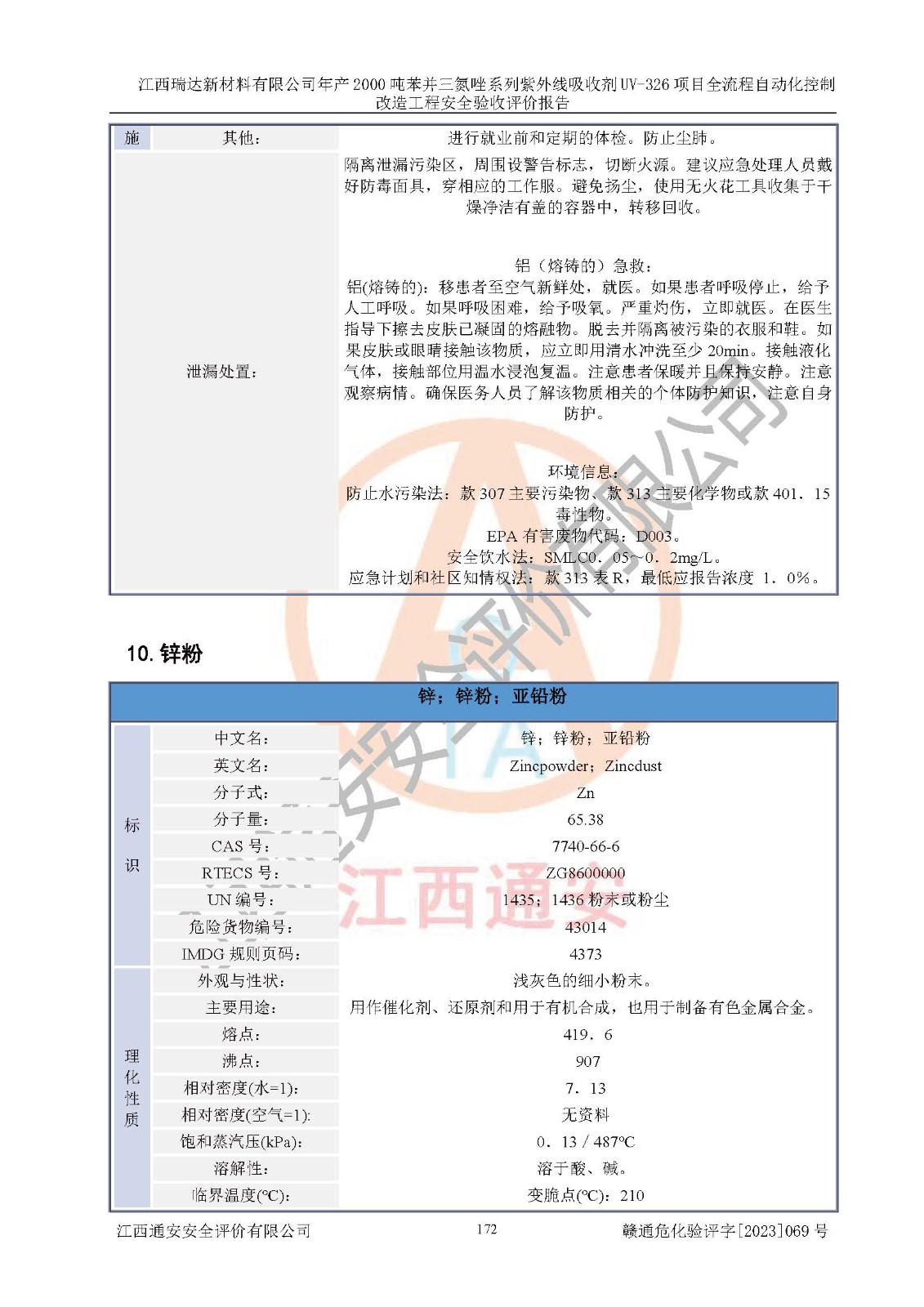 評價報告名稱 | 江西瑞達(dá)新材料有限公司年產(chǎn)2000噸苯并三氮唑系列紫外線吸收劑UV-326項目全流程自動化控制改造工程安全驗收評價報告 | |||
