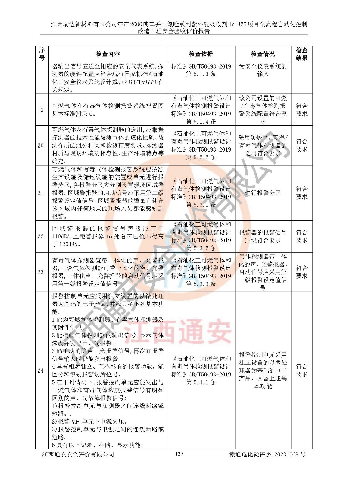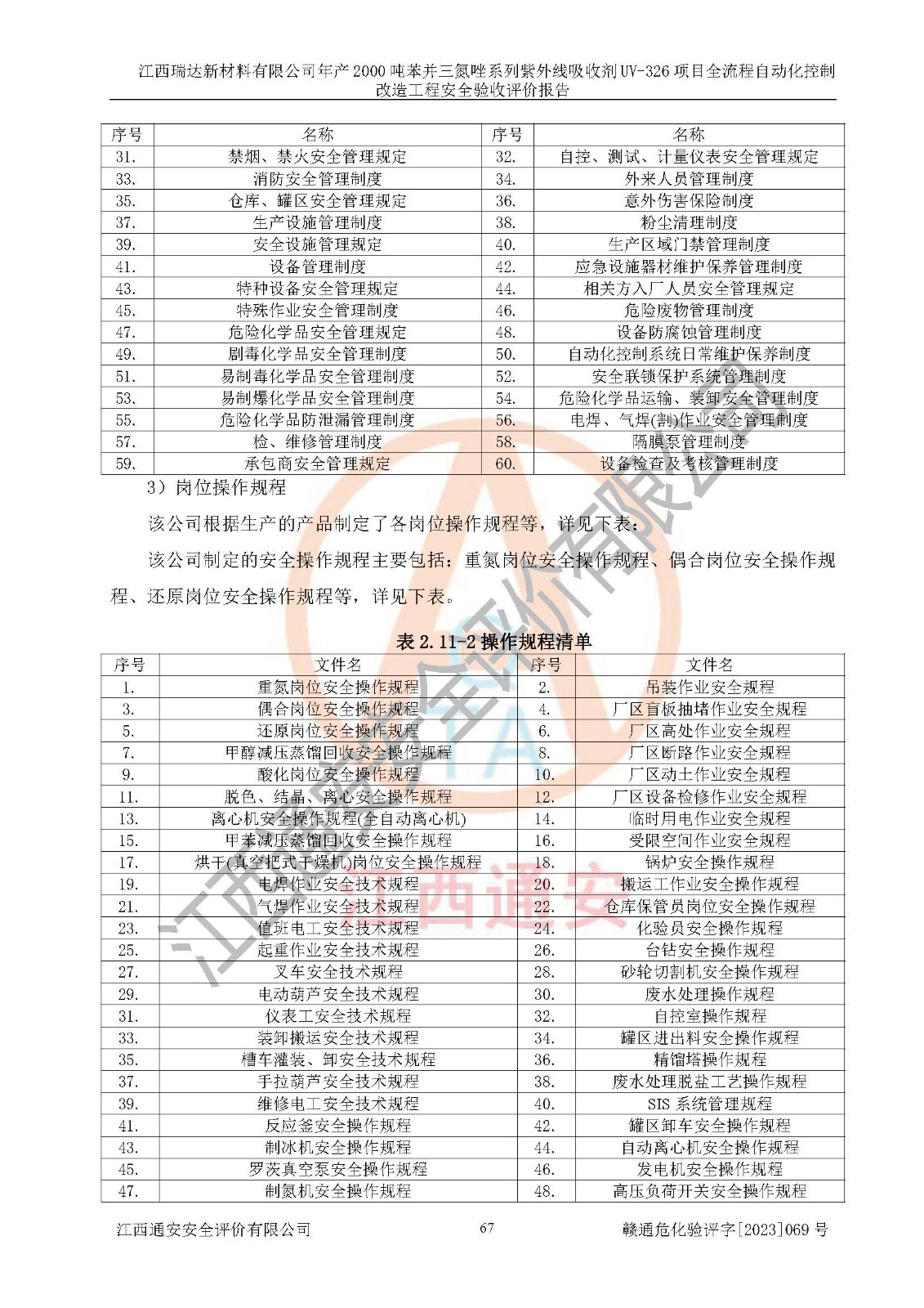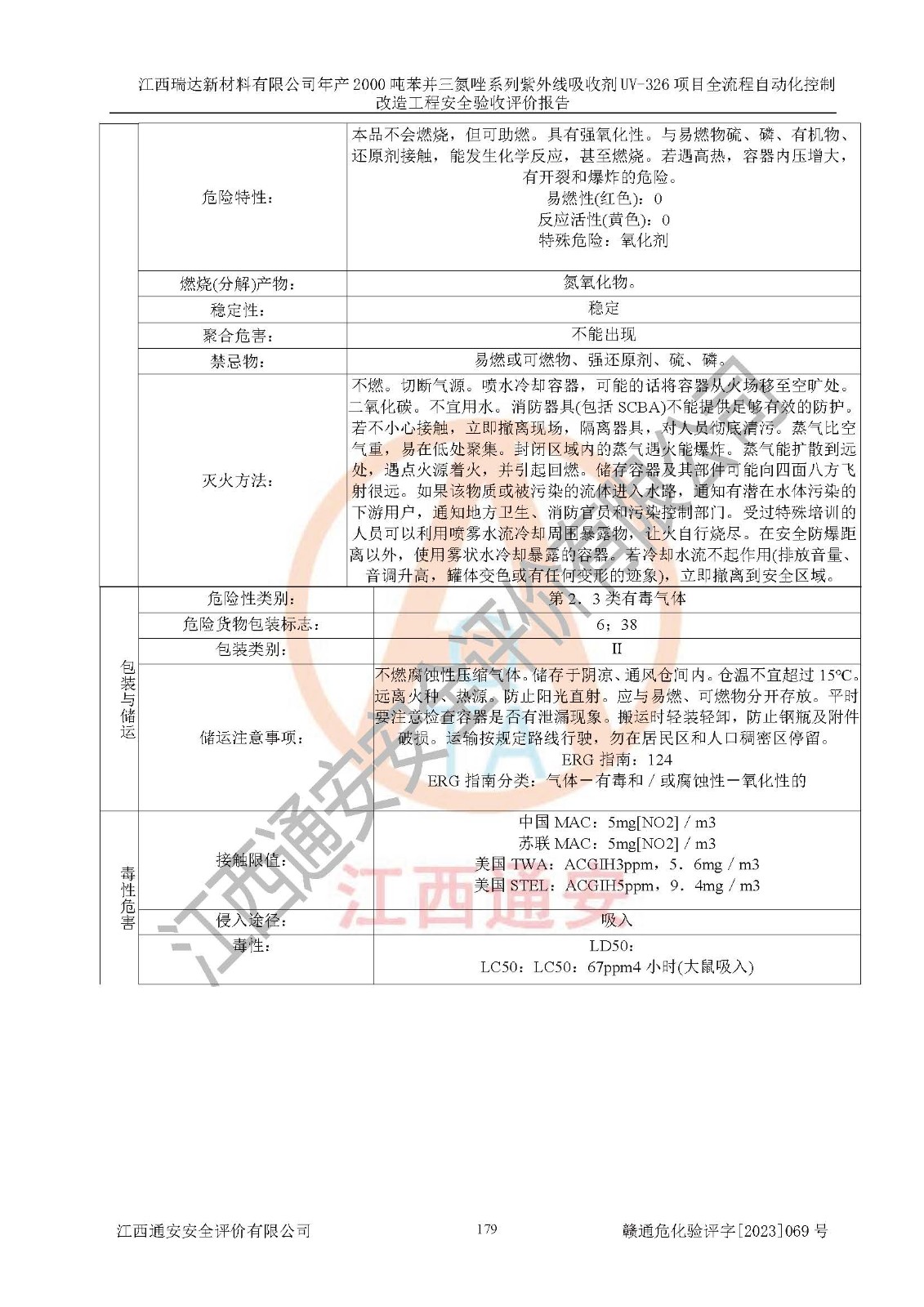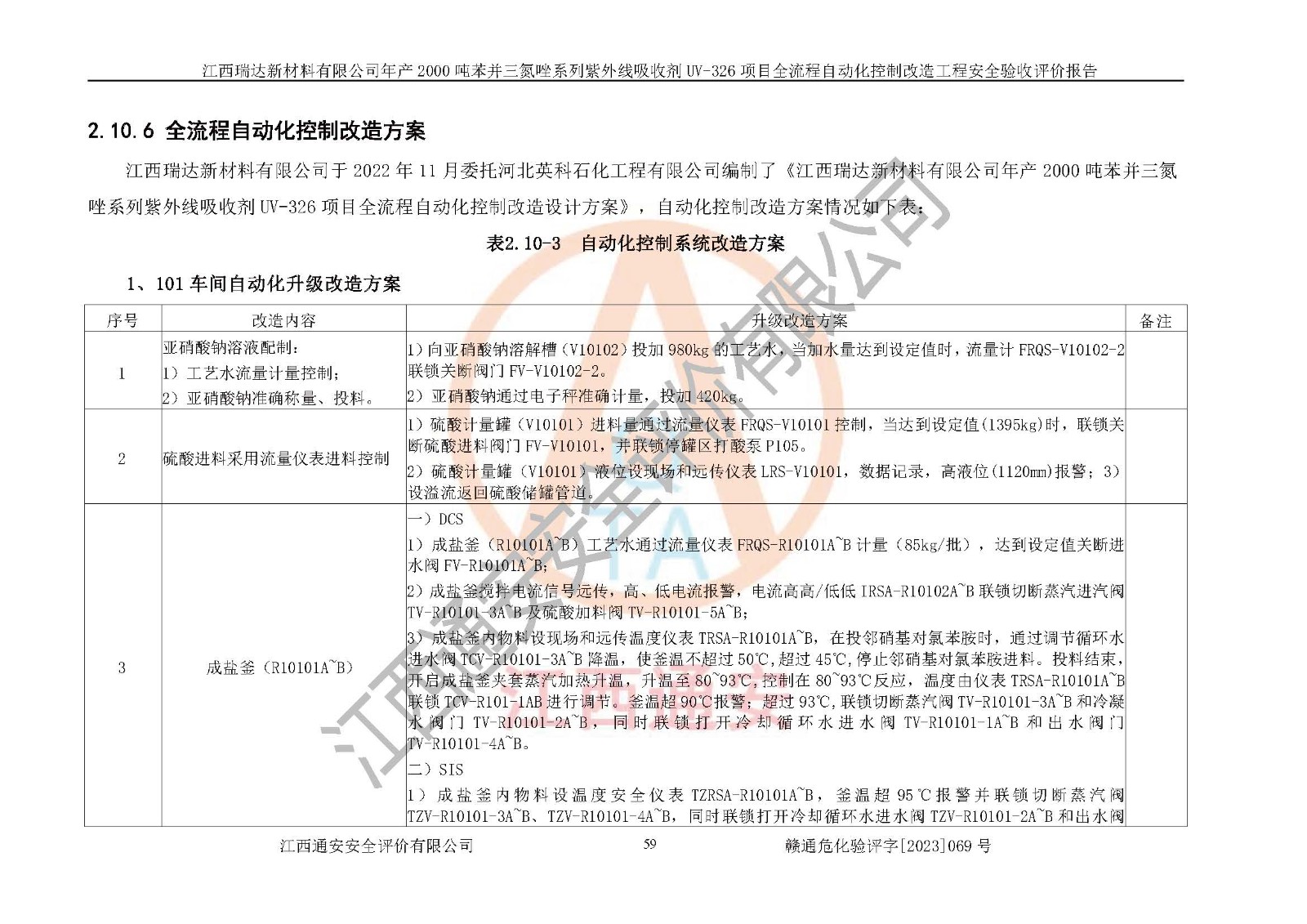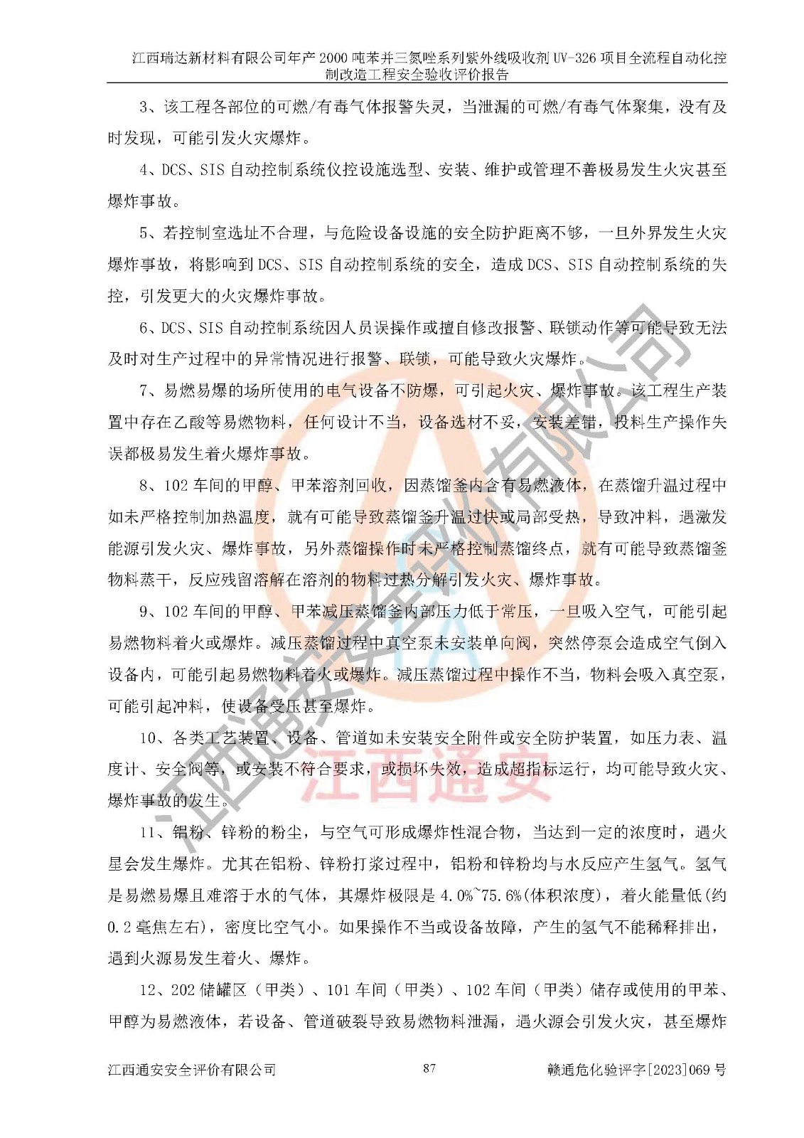 評價報告名稱 | 江西瑞達(dá)新材料有限公司年產(chǎn)2000噸苯并三氮唑系列紫外線吸收劑UV-326項目全流程自動化控制改造工程安全驗收評價報告 | |||