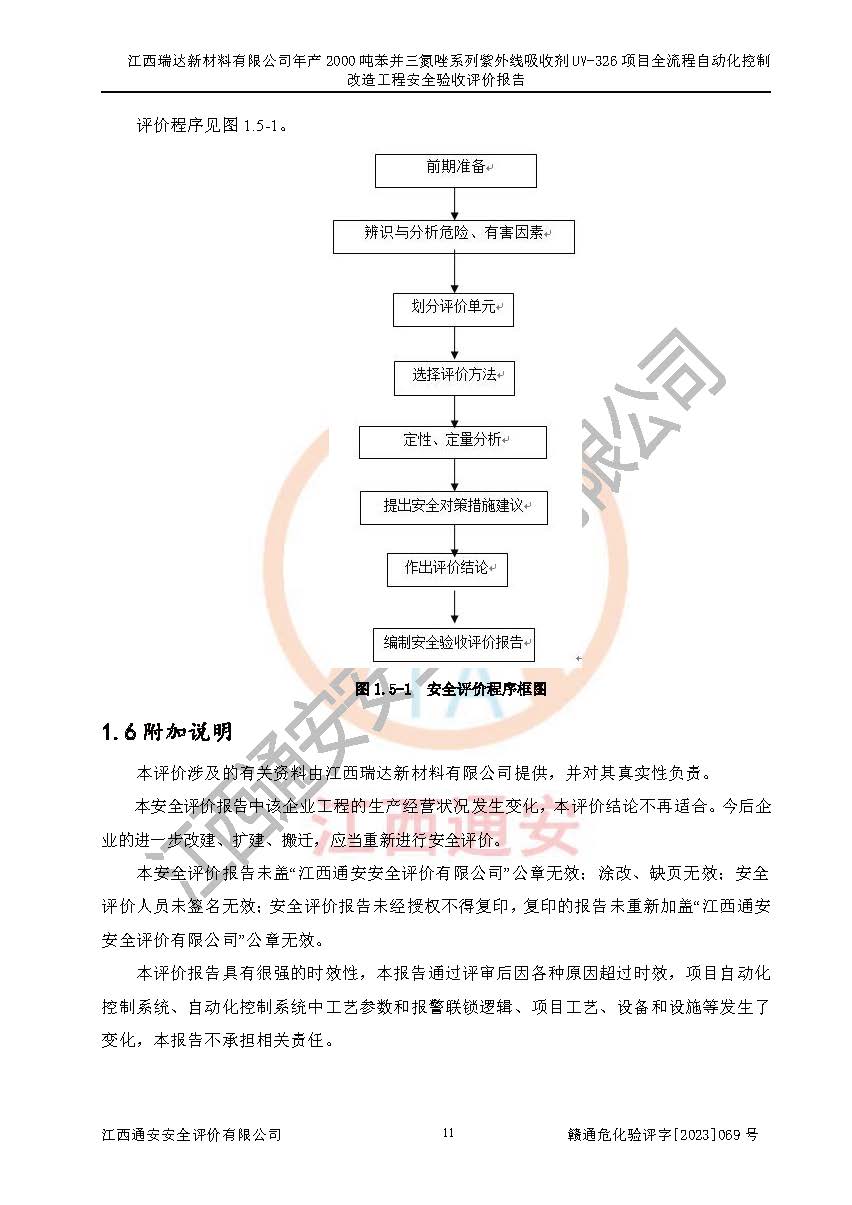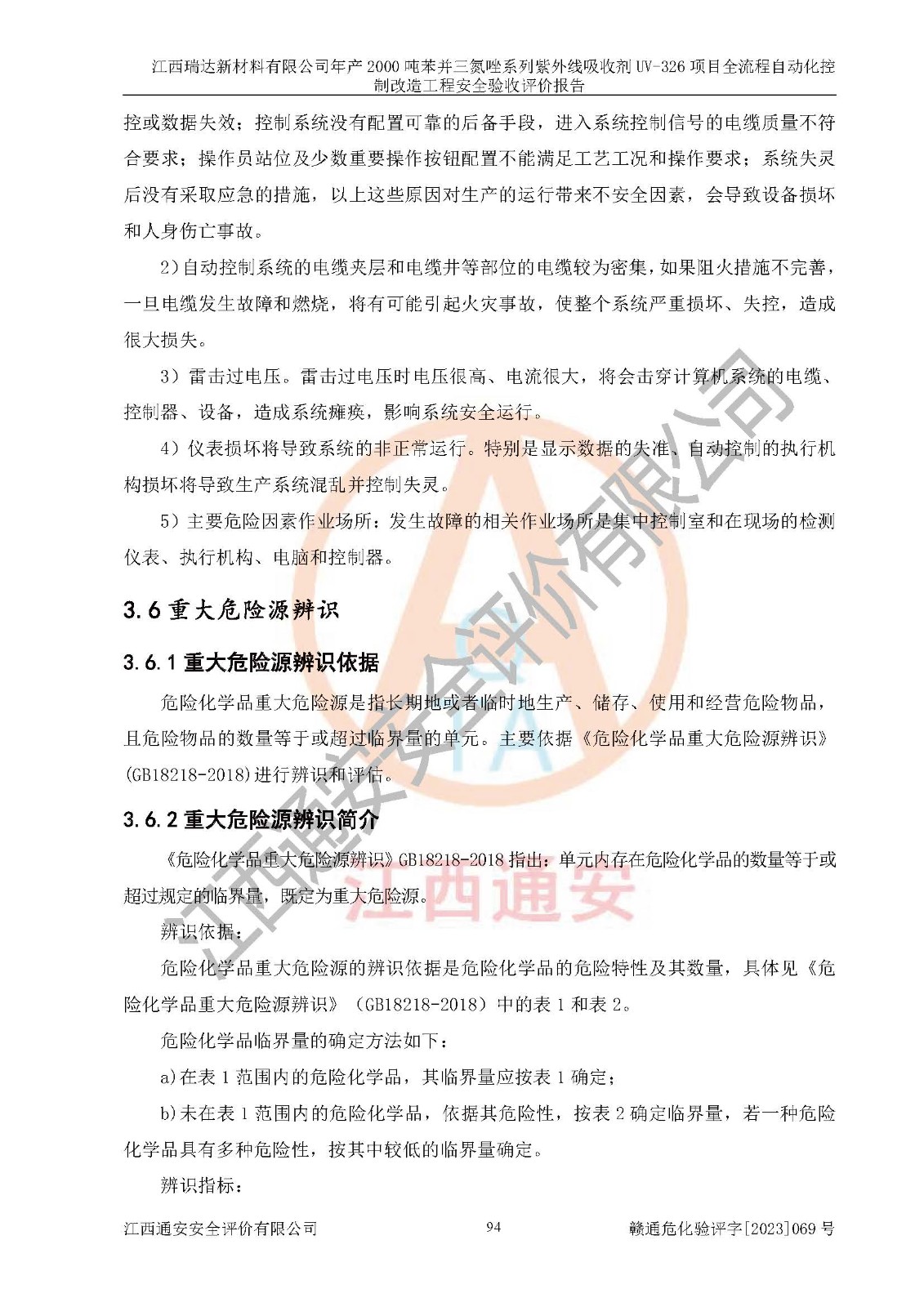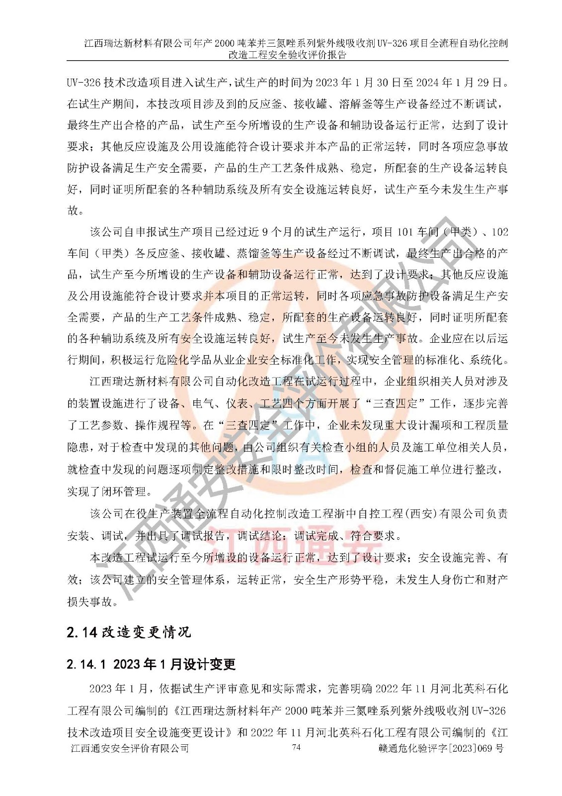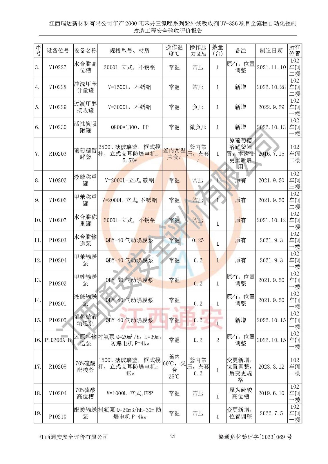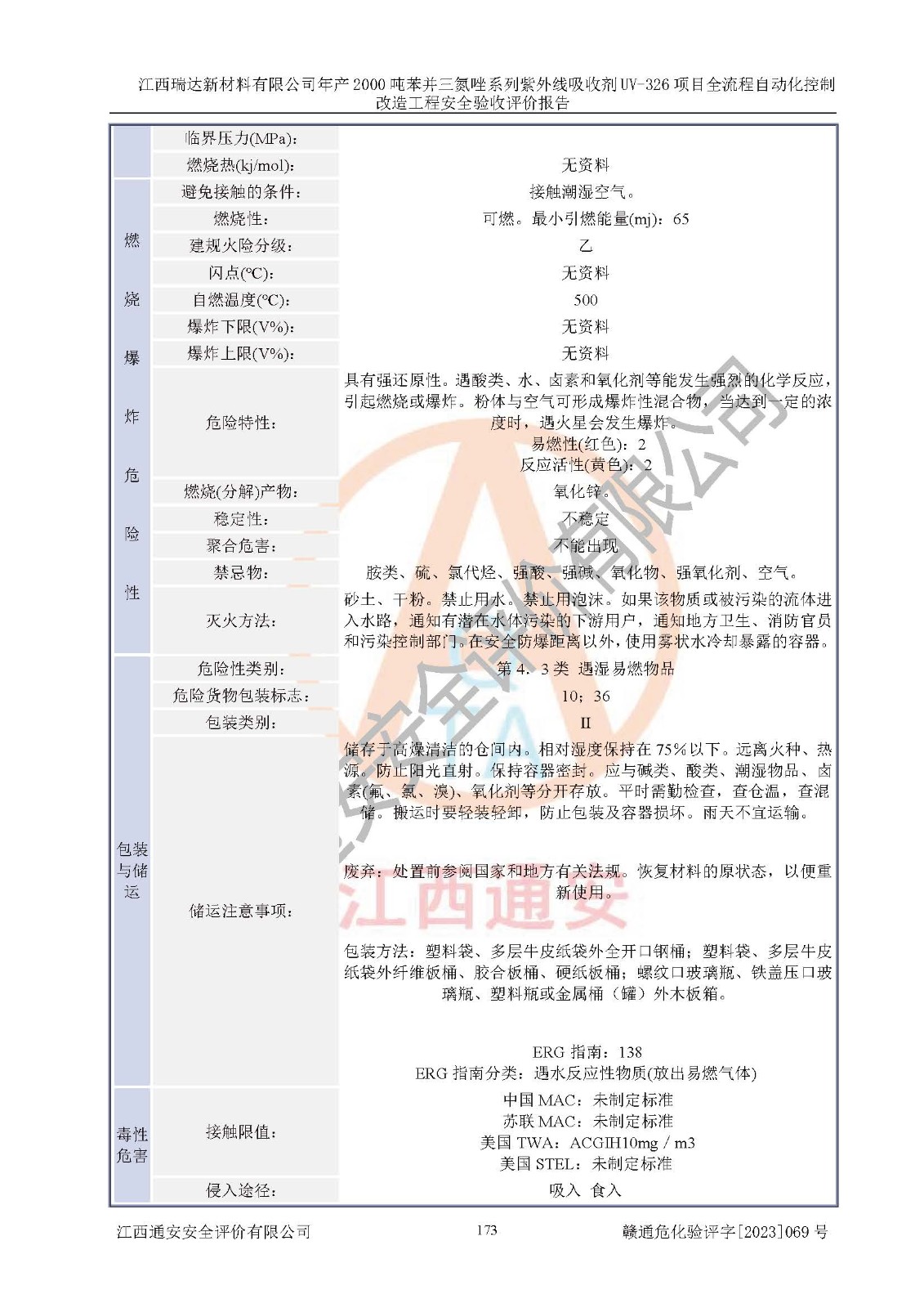 評價報告名稱 | 江西瑞達(dá)新材料有限公司年產(chǎn)2000噸苯并三氮唑系列紫外線吸收劑UV-326項目全流程自動化控制改造工程安全驗收評價報告 | |||