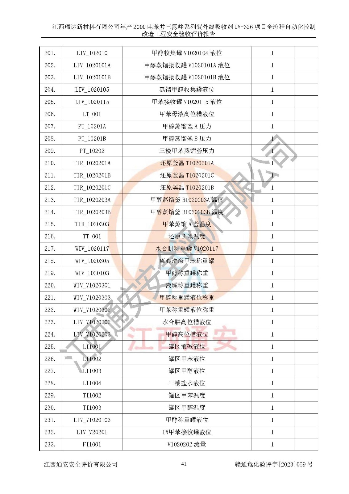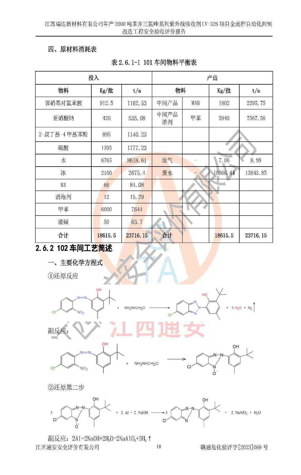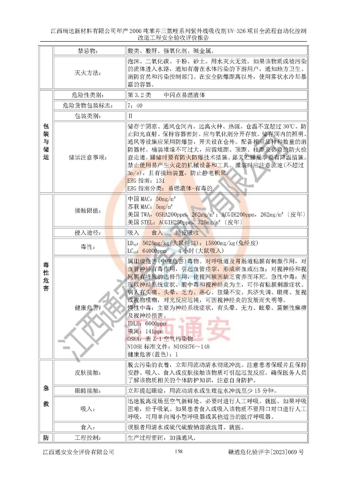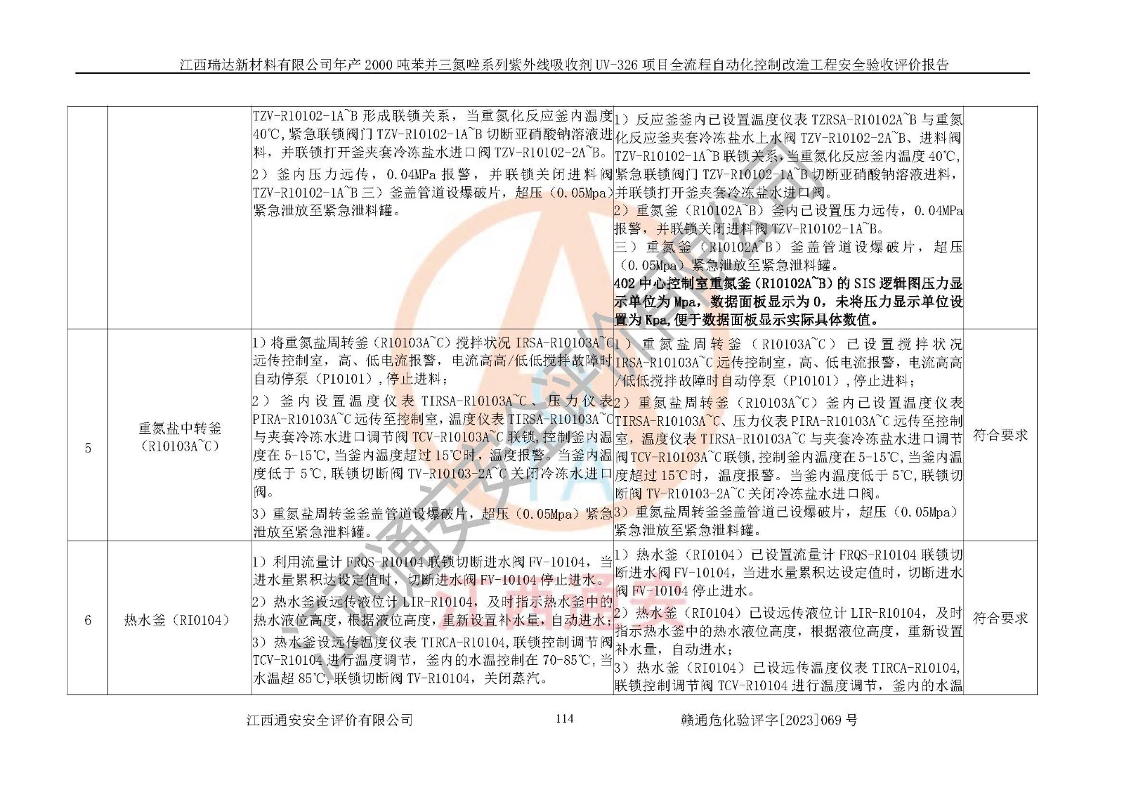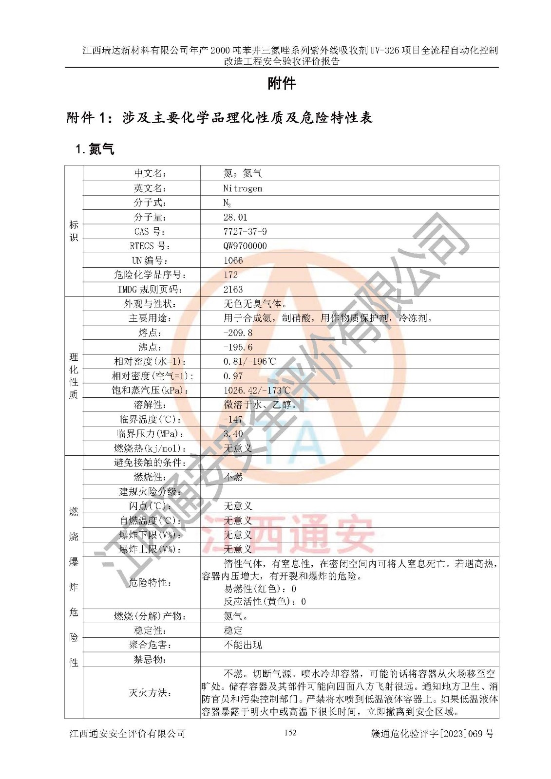 評價報告名稱 | 江西瑞達(dá)新材料有限公司年產(chǎn)2000噸苯并三氮唑系列紫外線吸收劑UV-326項目全流程自動化控制改造工程安全驗收評價報告 | |||