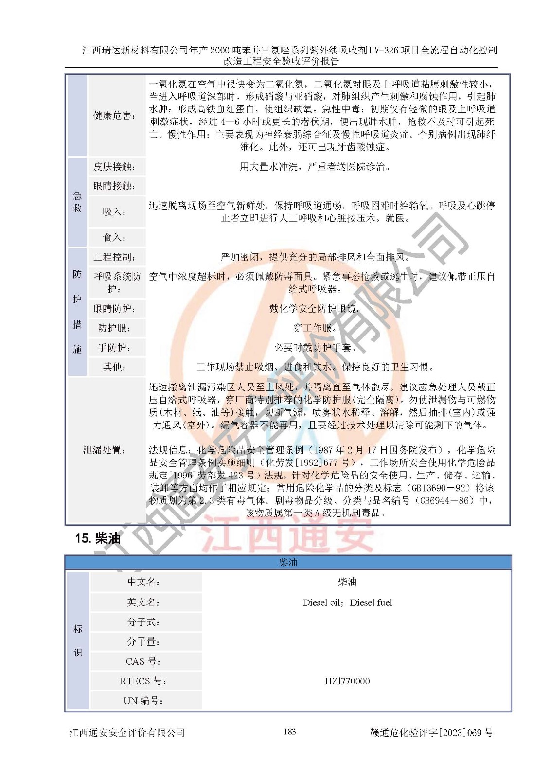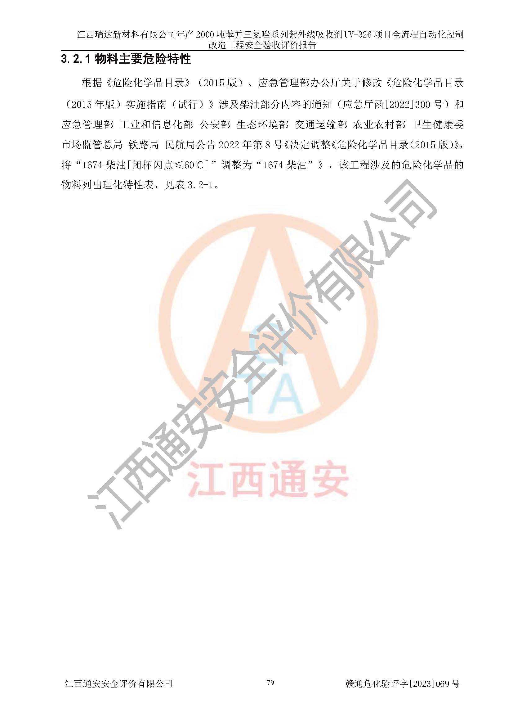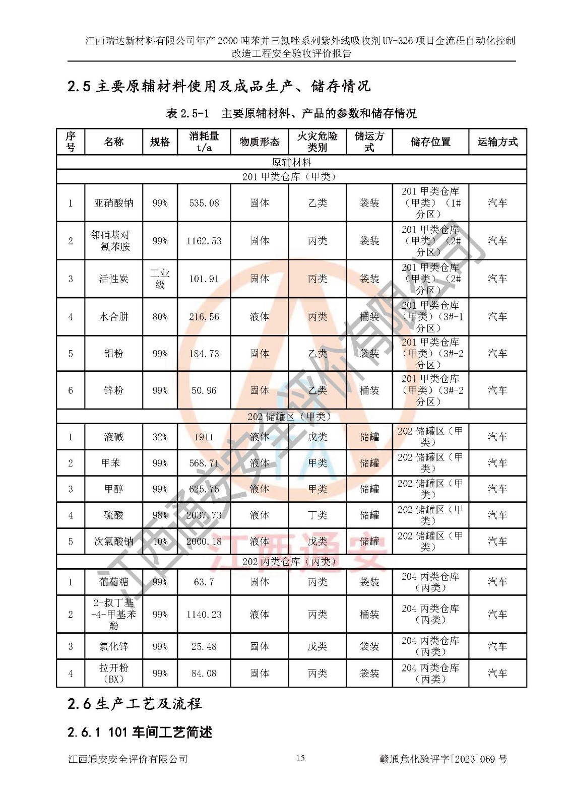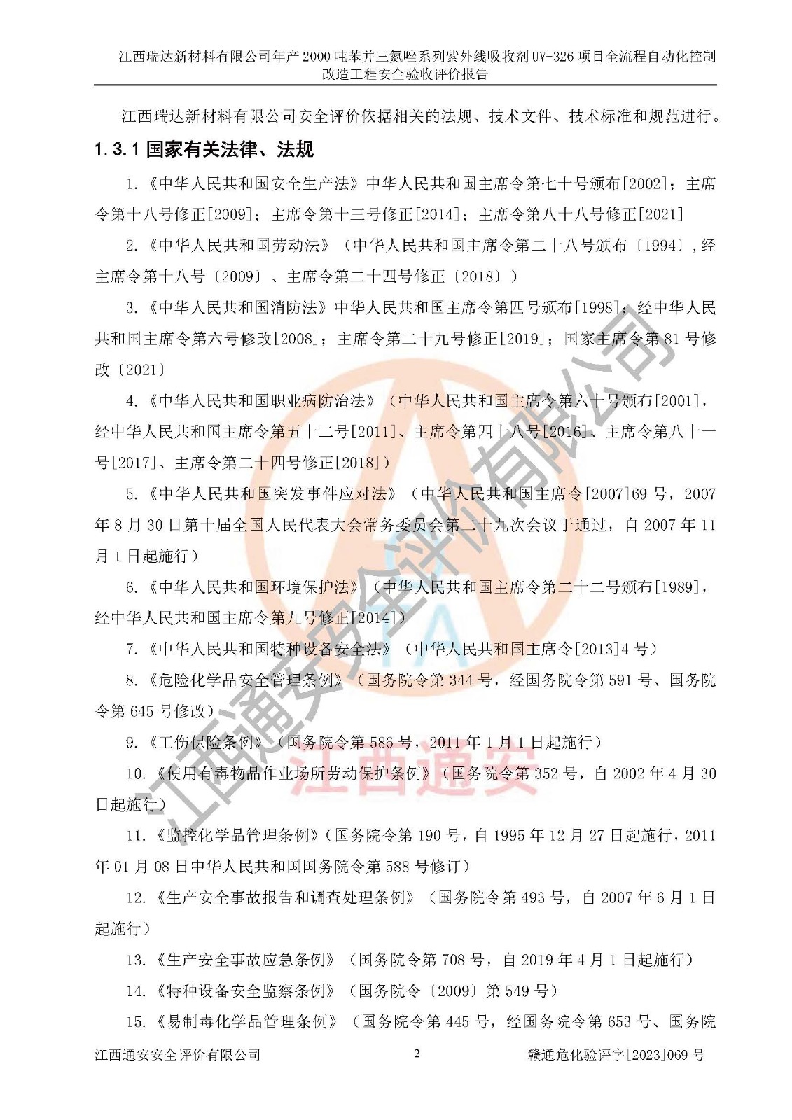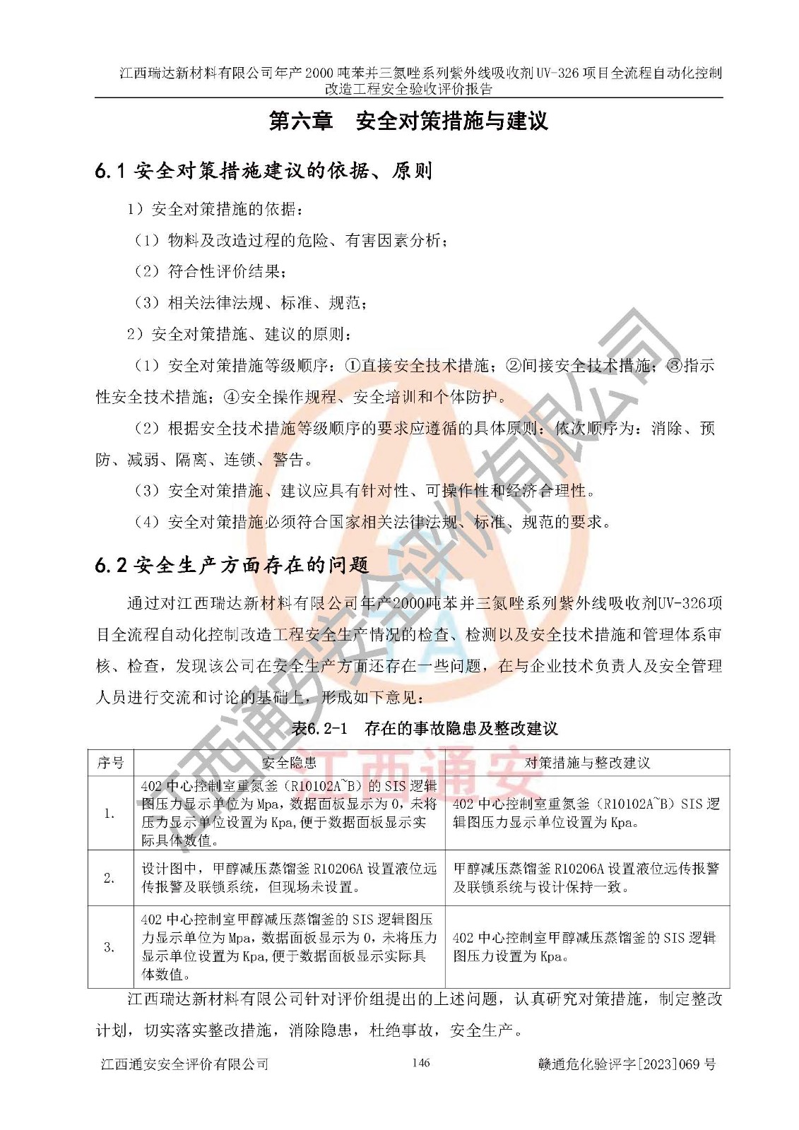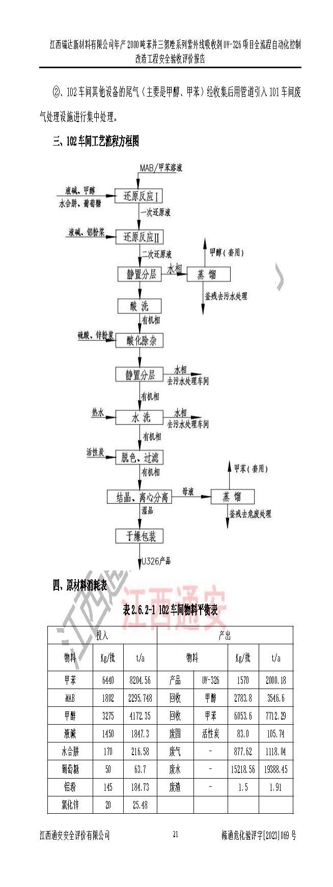 評價報告名稱 | 江西瑞達(dá)新材料有限公司年產(chǎn)2000噸苯并三氮唑系列紫外線吸收劑UV-326項目全流程自動化控制改造工程安全驗收評價報告 | |||
