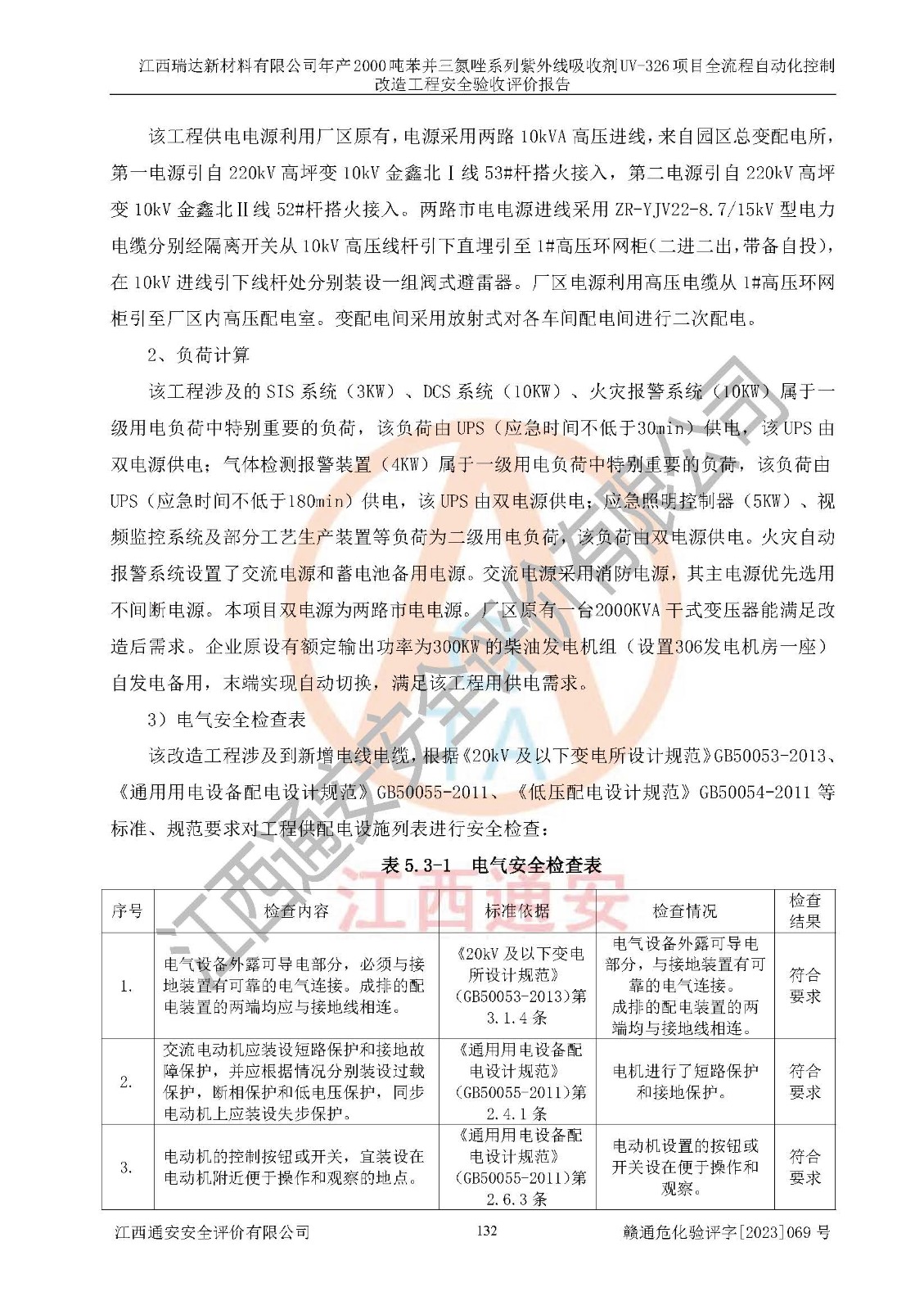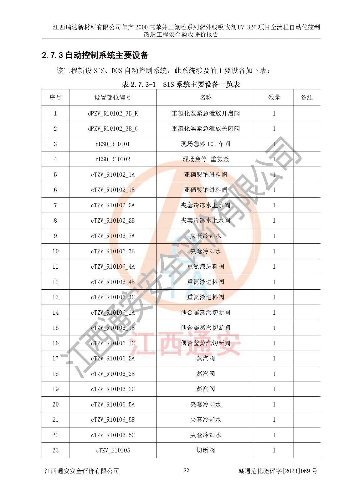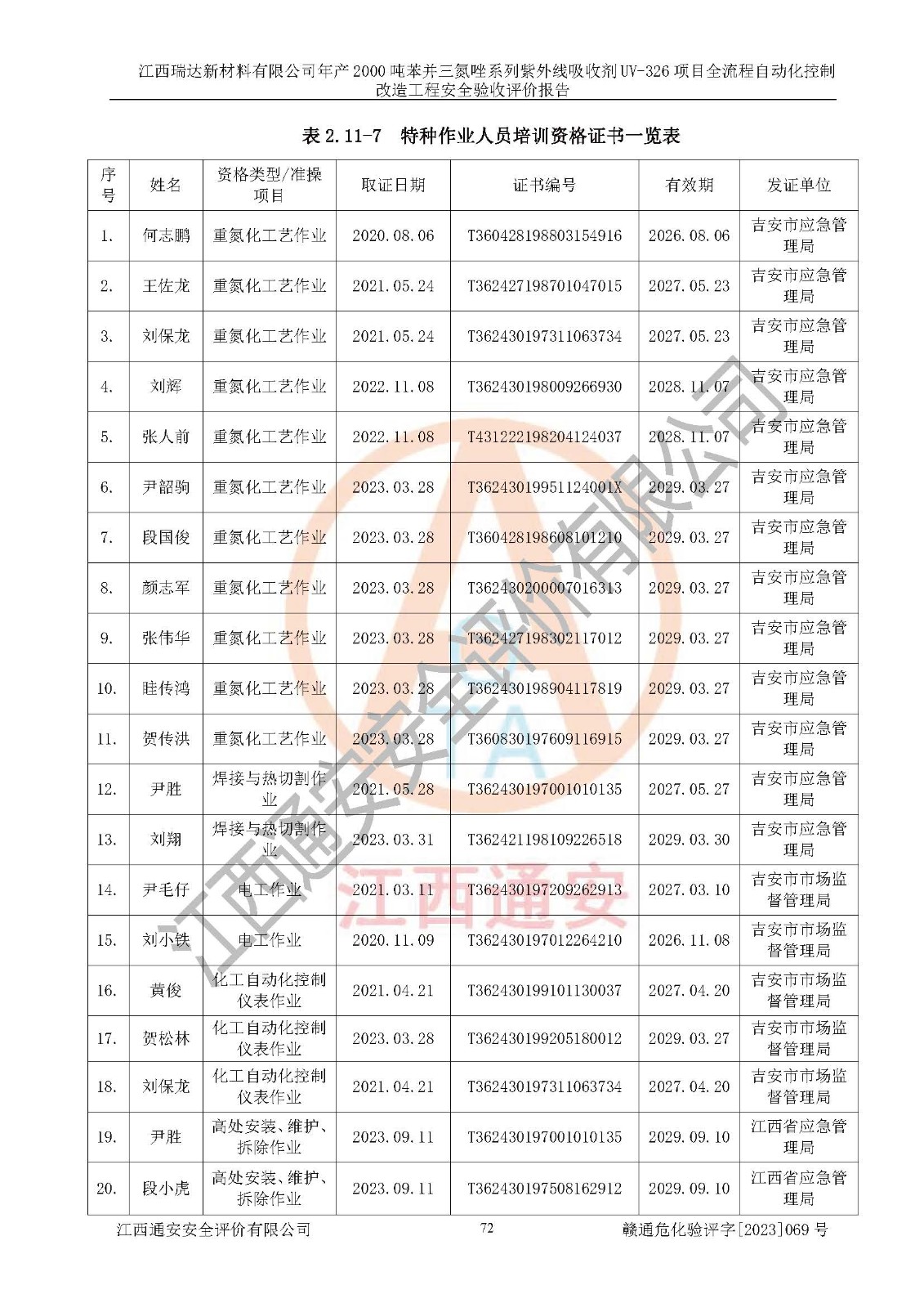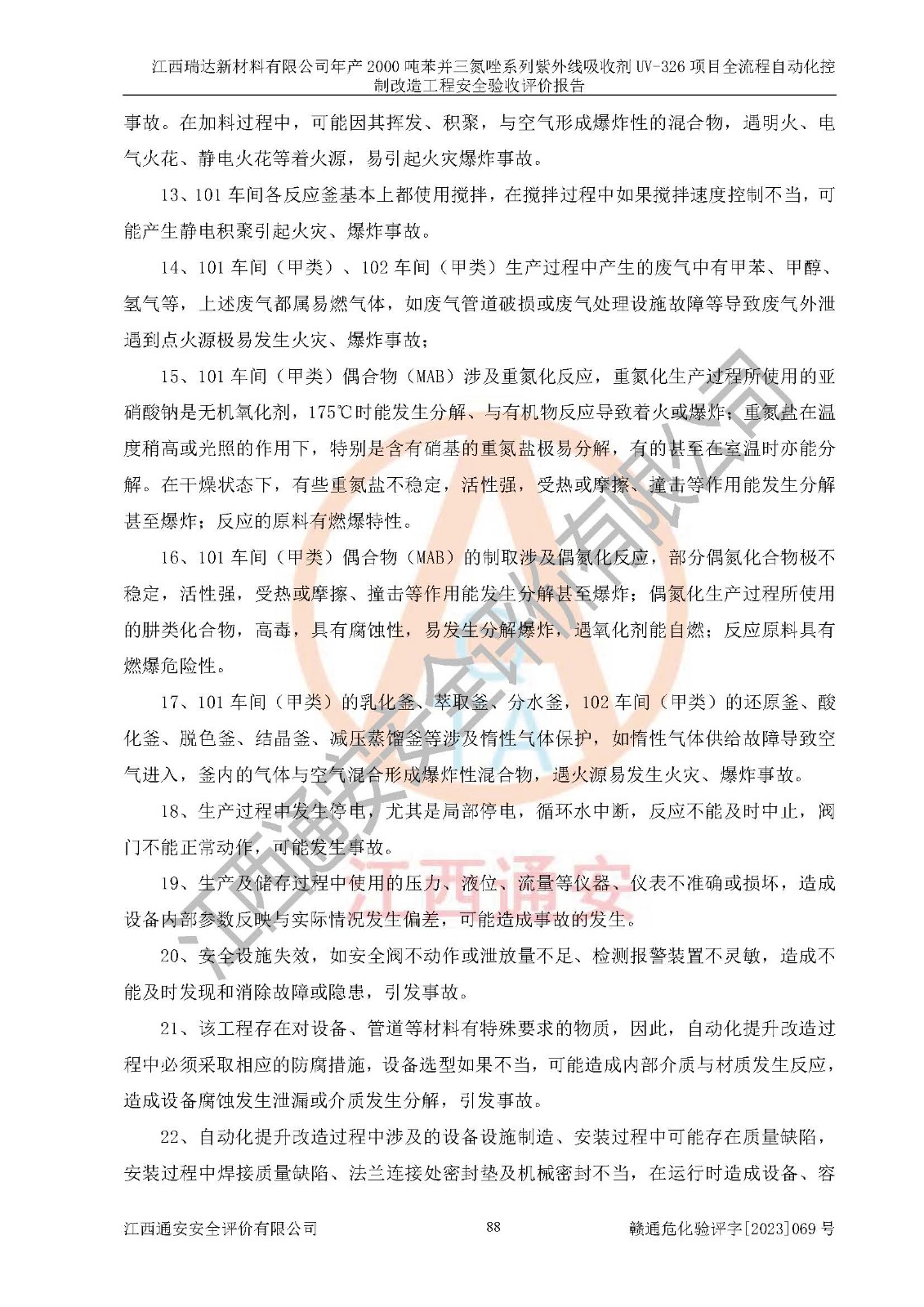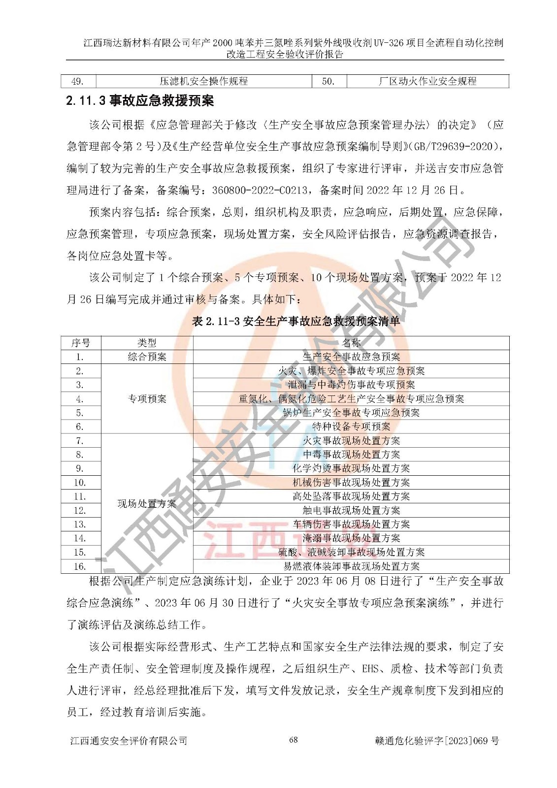 評價報告名稱 | 江西瑞達(dá)新材料有限公司年產(chǎn)2000噸苯并三氮唑系列紫外線吸收劑UV-326項目全流程自動化控制改造工程安全驗收評價報告 | |||