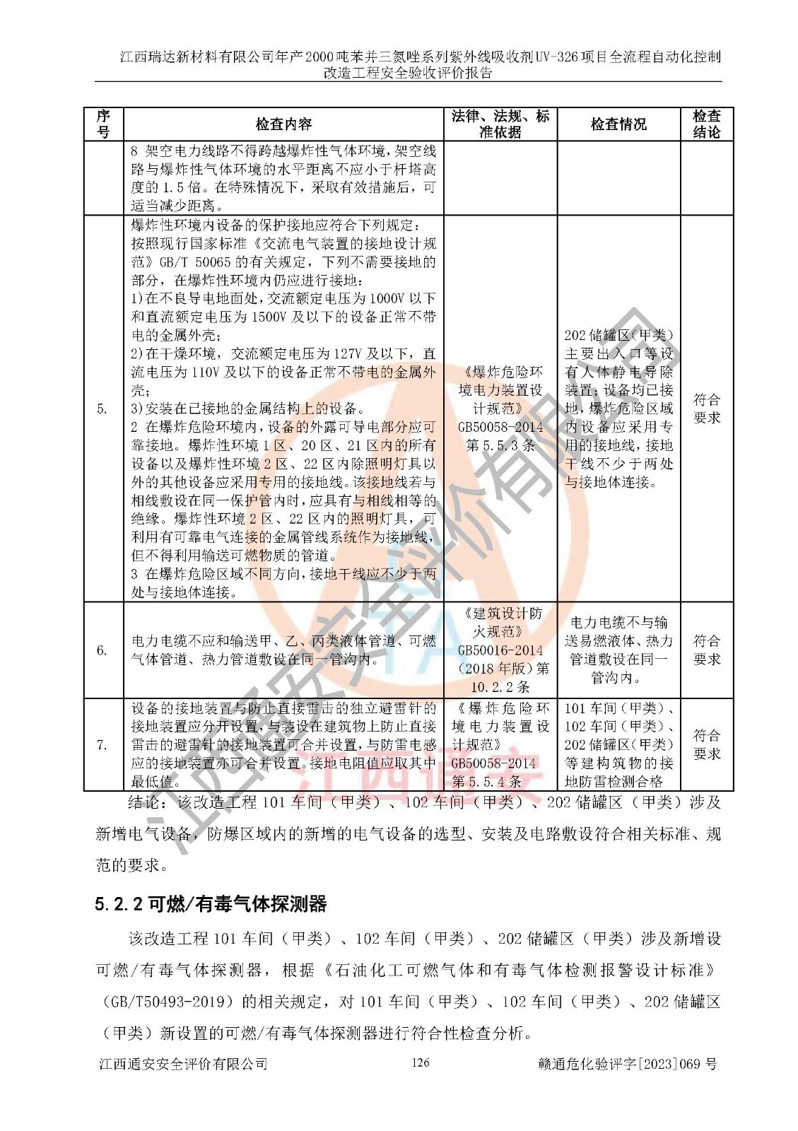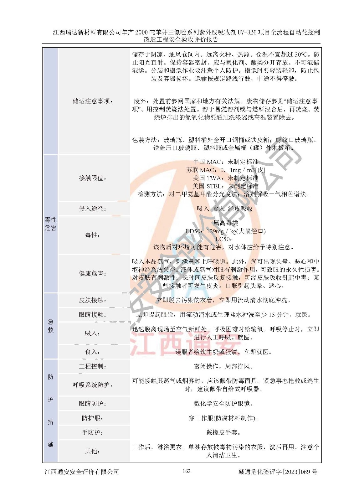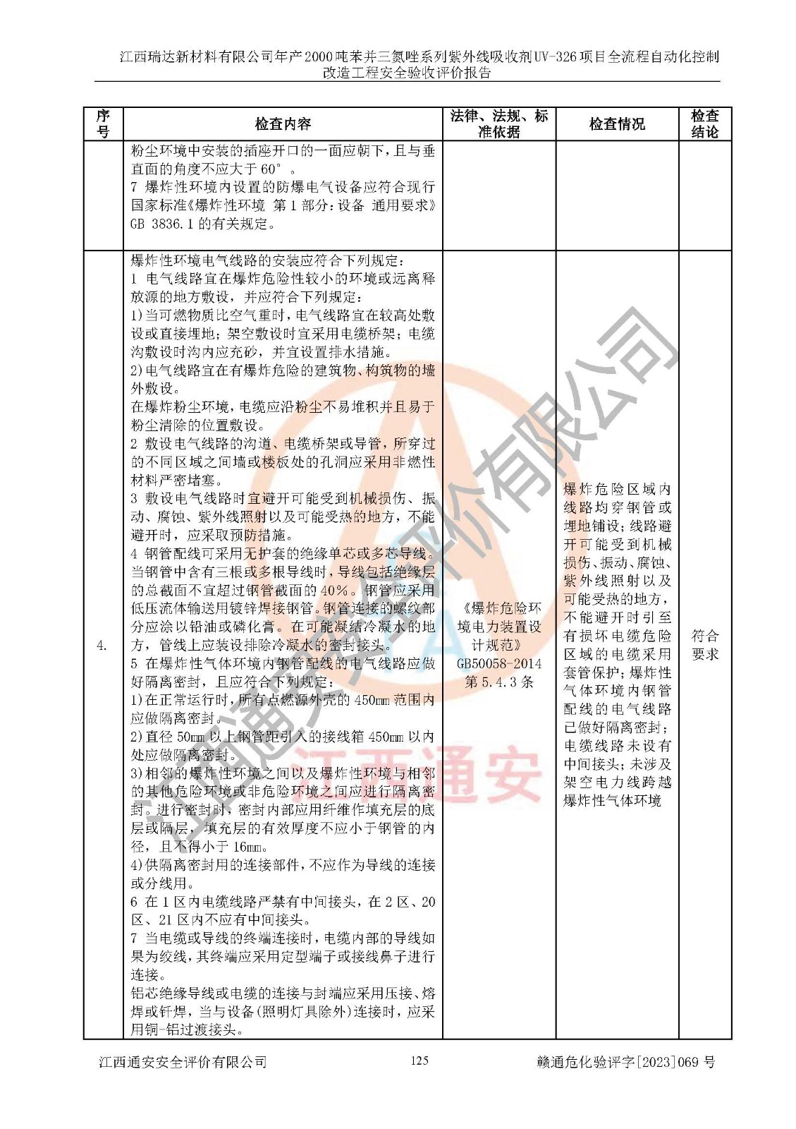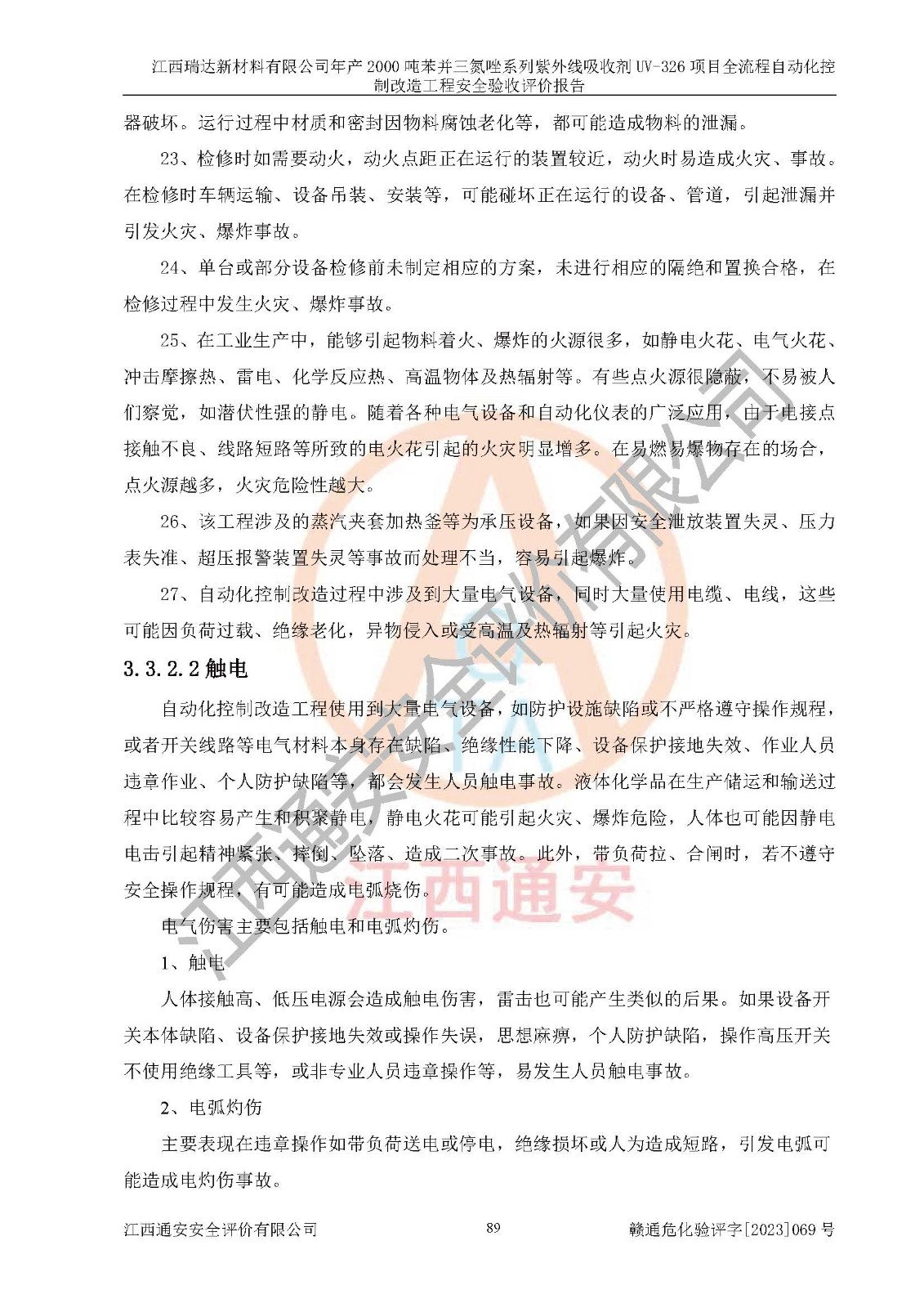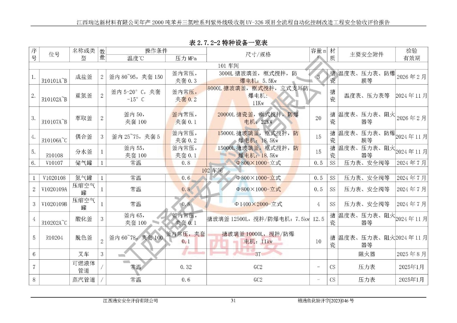 評價報告名稱 | 江西瑞達(dá)新材料有限公司年產(chǎn)2000噸苯并三氮唑系列紫外線吸收劑UV-326項目全流程自動化控制改造工程安全驗收評價報告 | |||