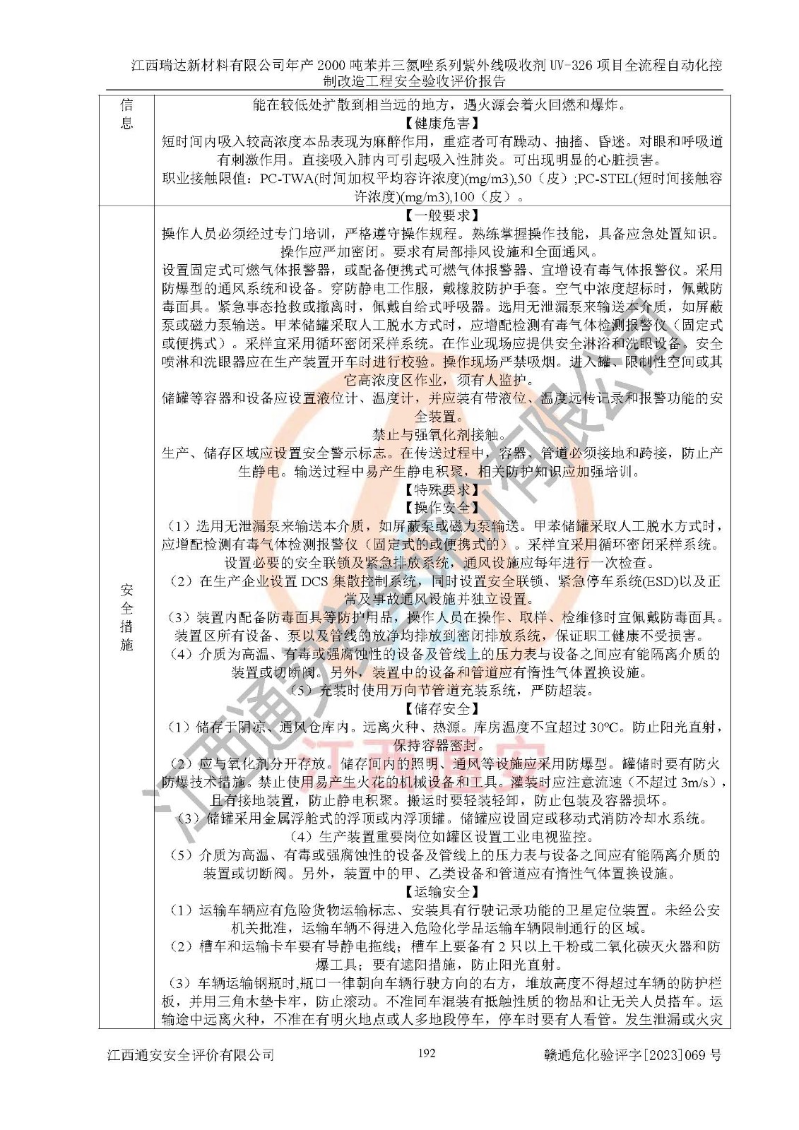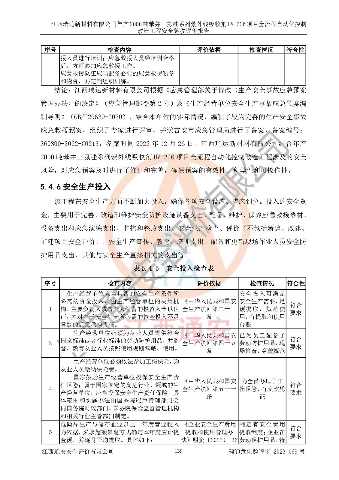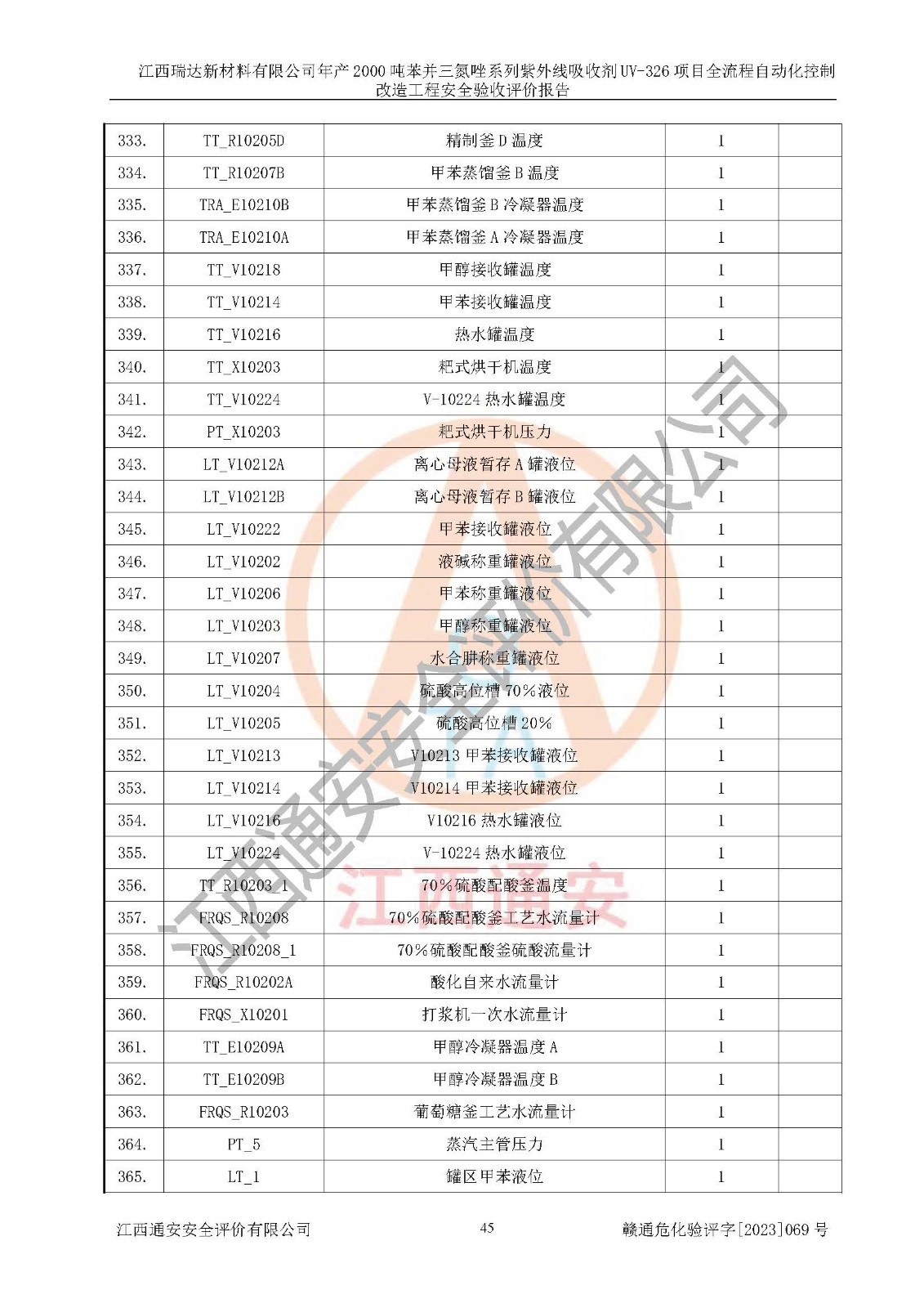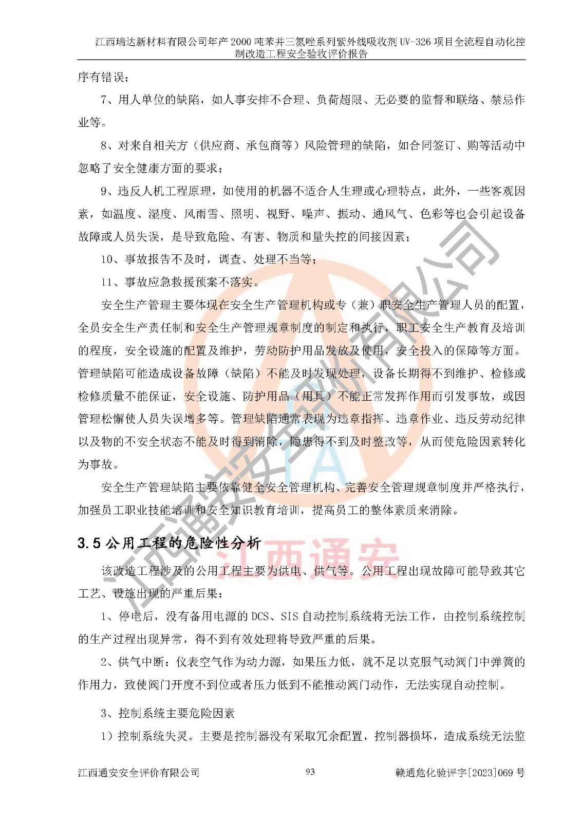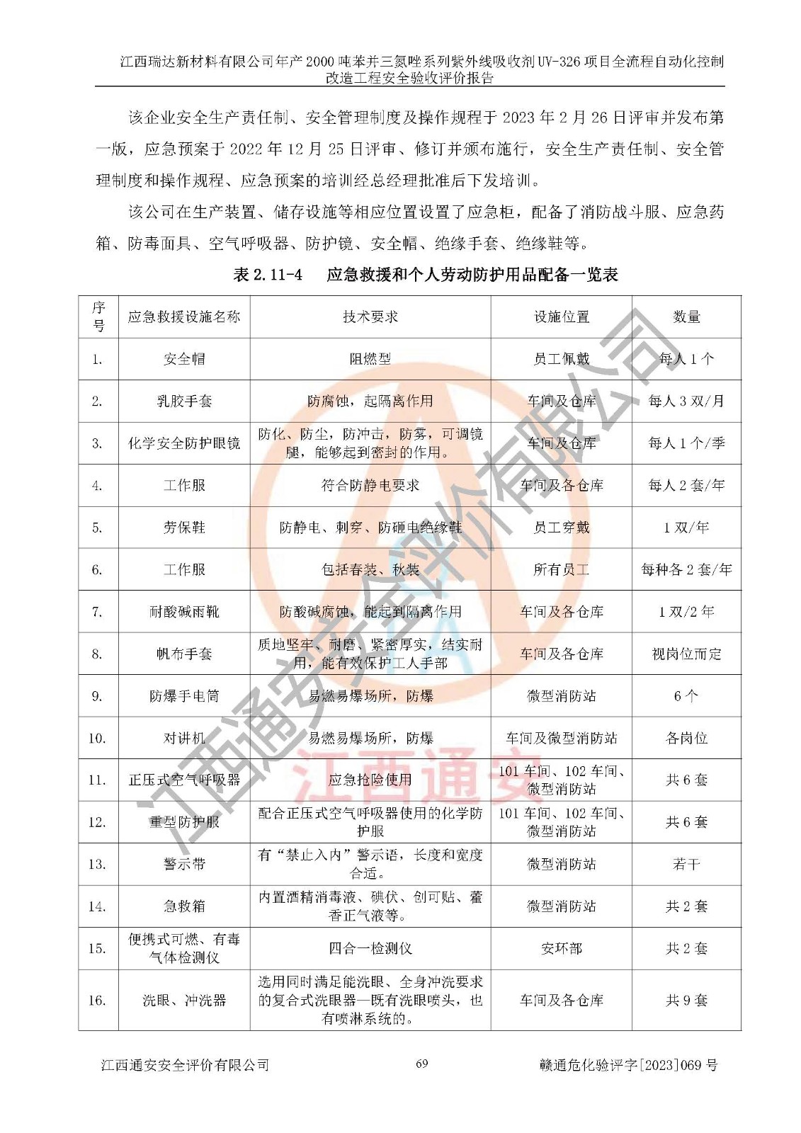 評價報告名稱 | 江西瑞達(dá)新材料有限公司年產(chǎn)2000噸苯并三氮唑系列紫外線吸收劑UV-326項目全流程自動化控制改造工程安全驗收評價報告 | |||