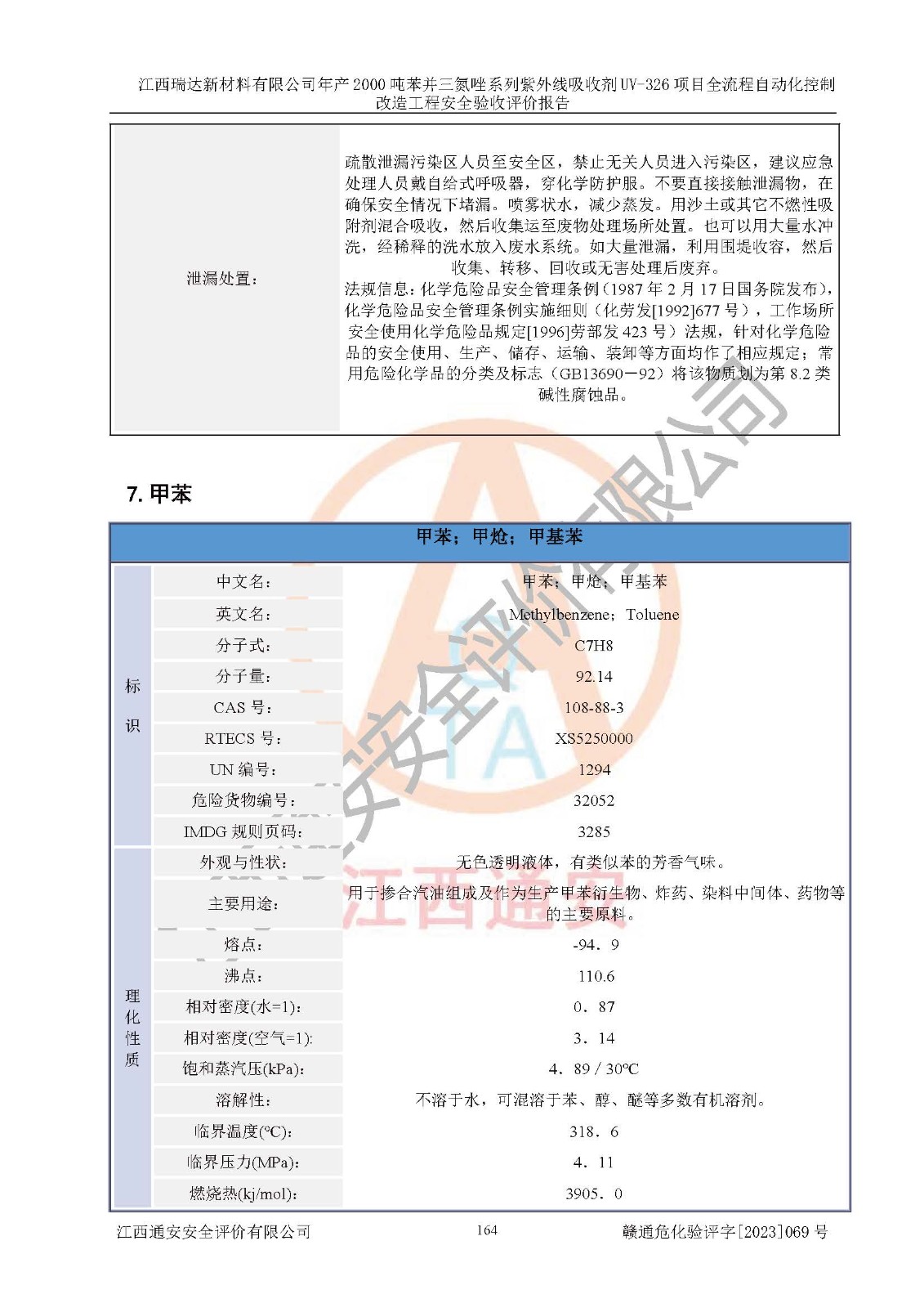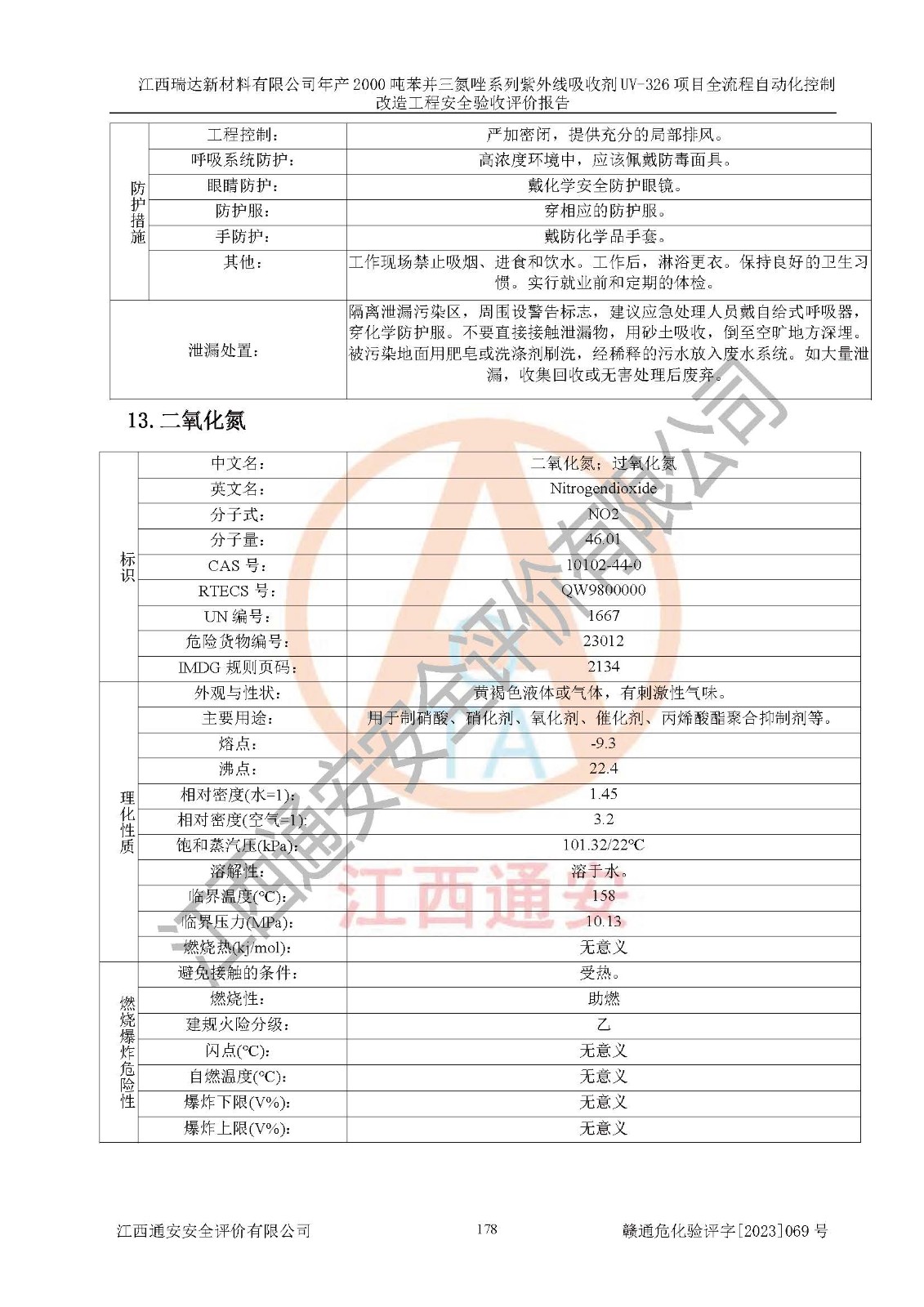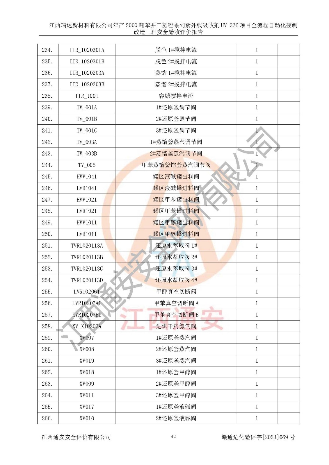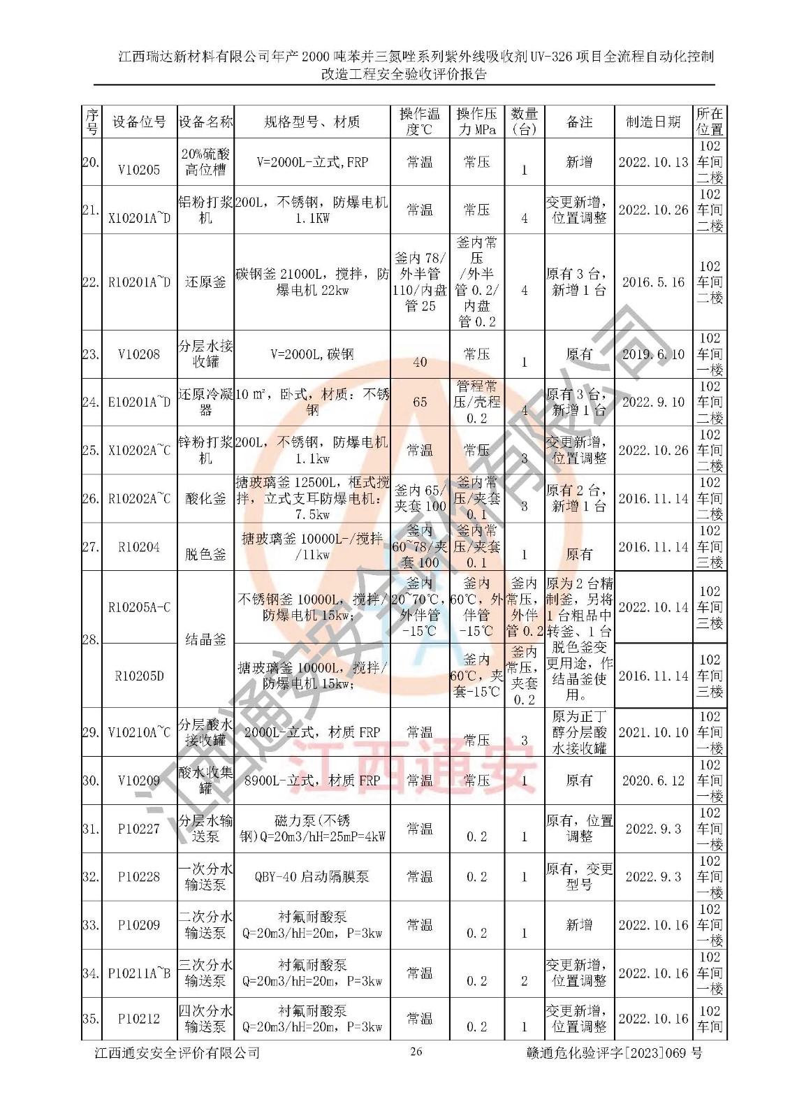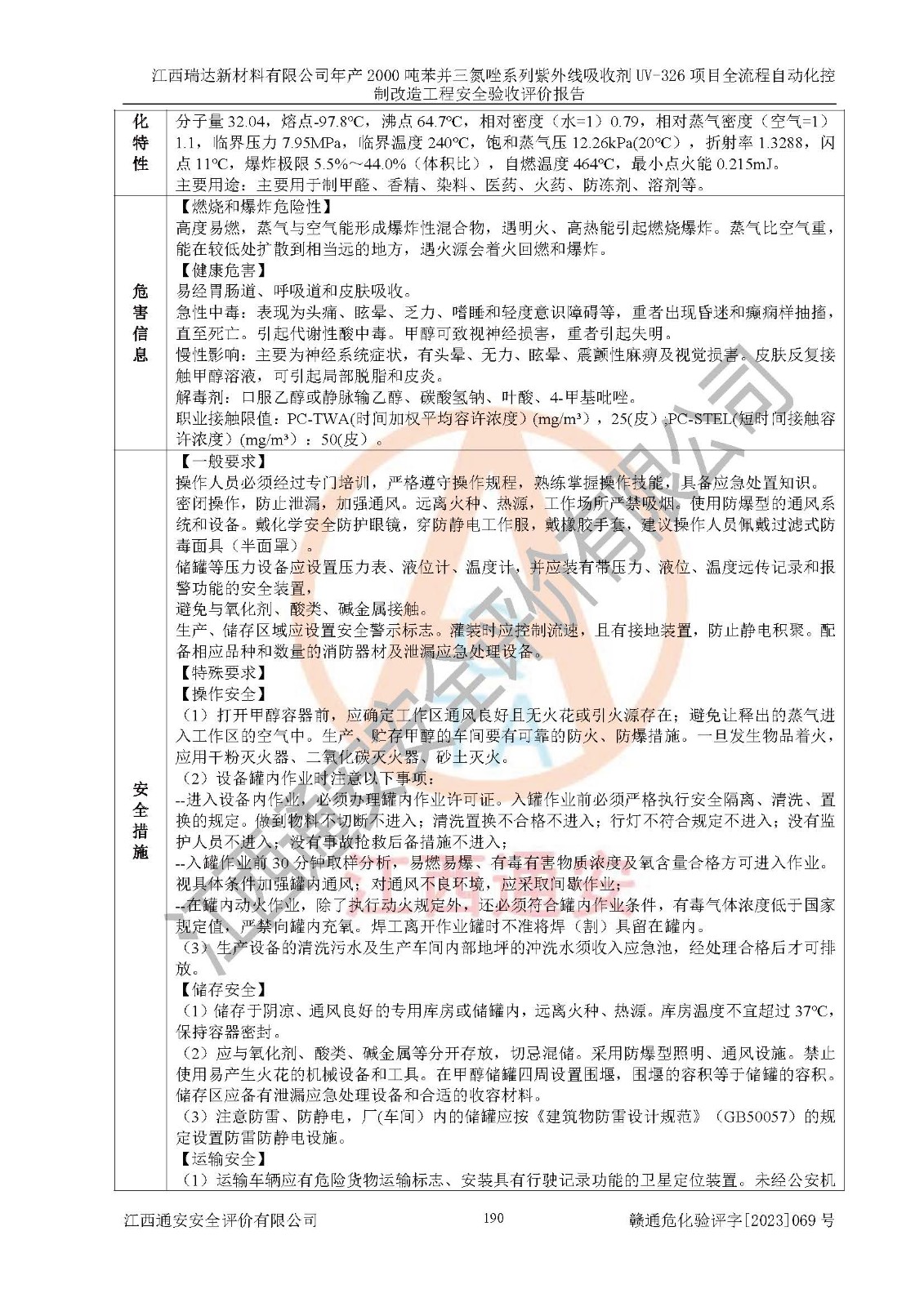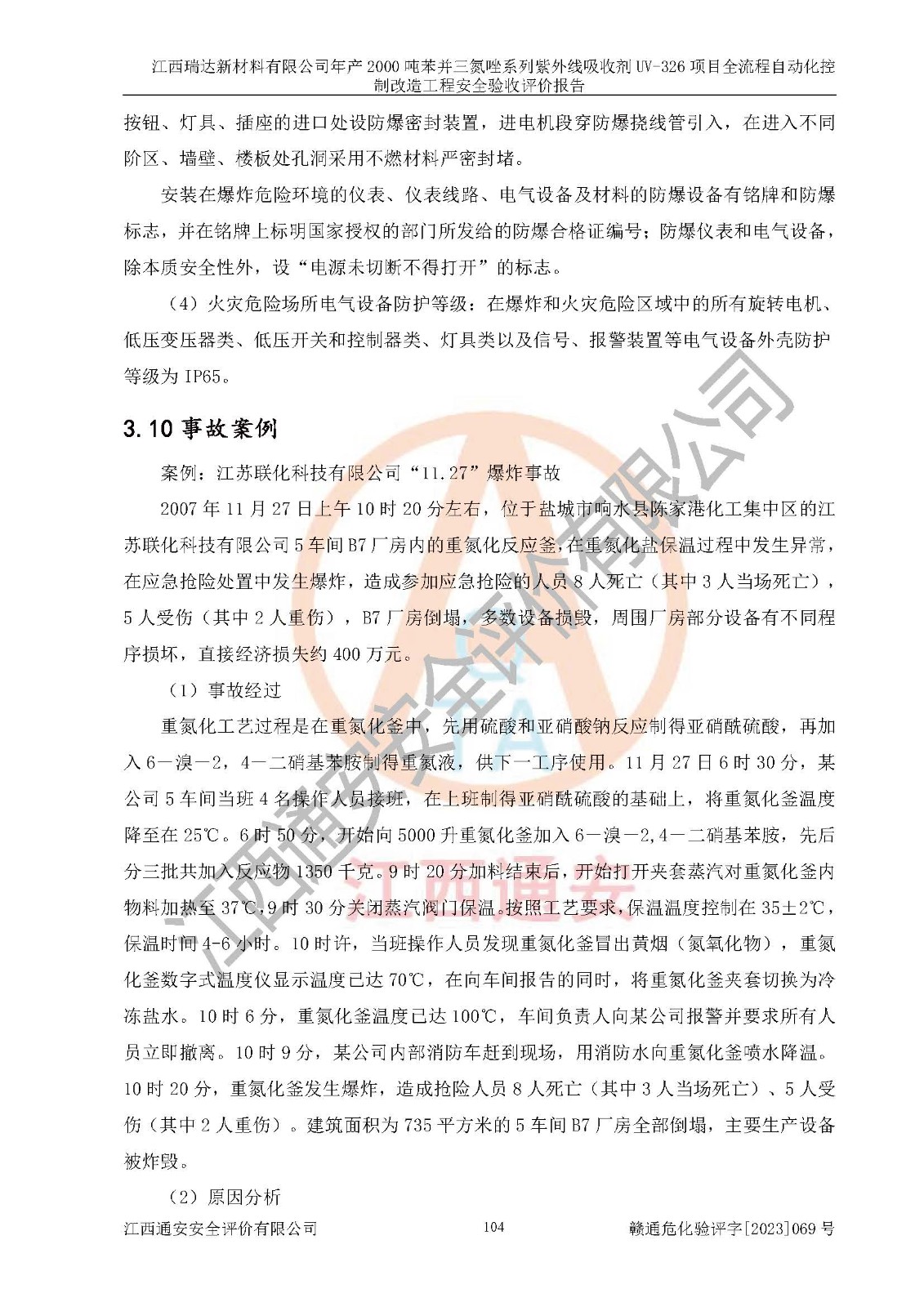 評價報告名稱 | 江西瑞達(dá)新材料有限公司年產(chǎn)2000噸苯并三氮唑系列紫外線吸收劑UV-326項目全流程自動化控制改造工程安全驗收評價報告 | |||