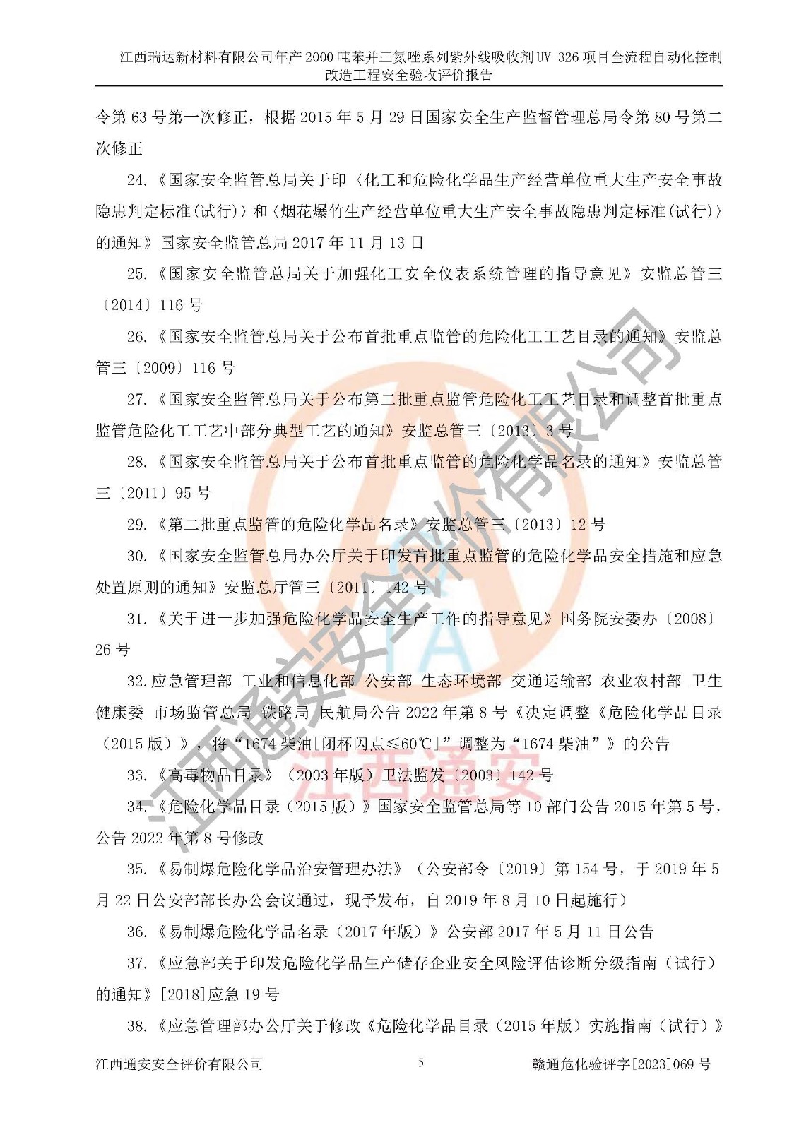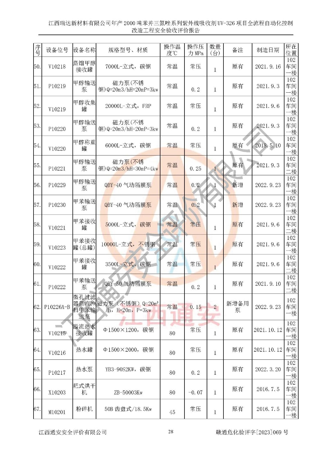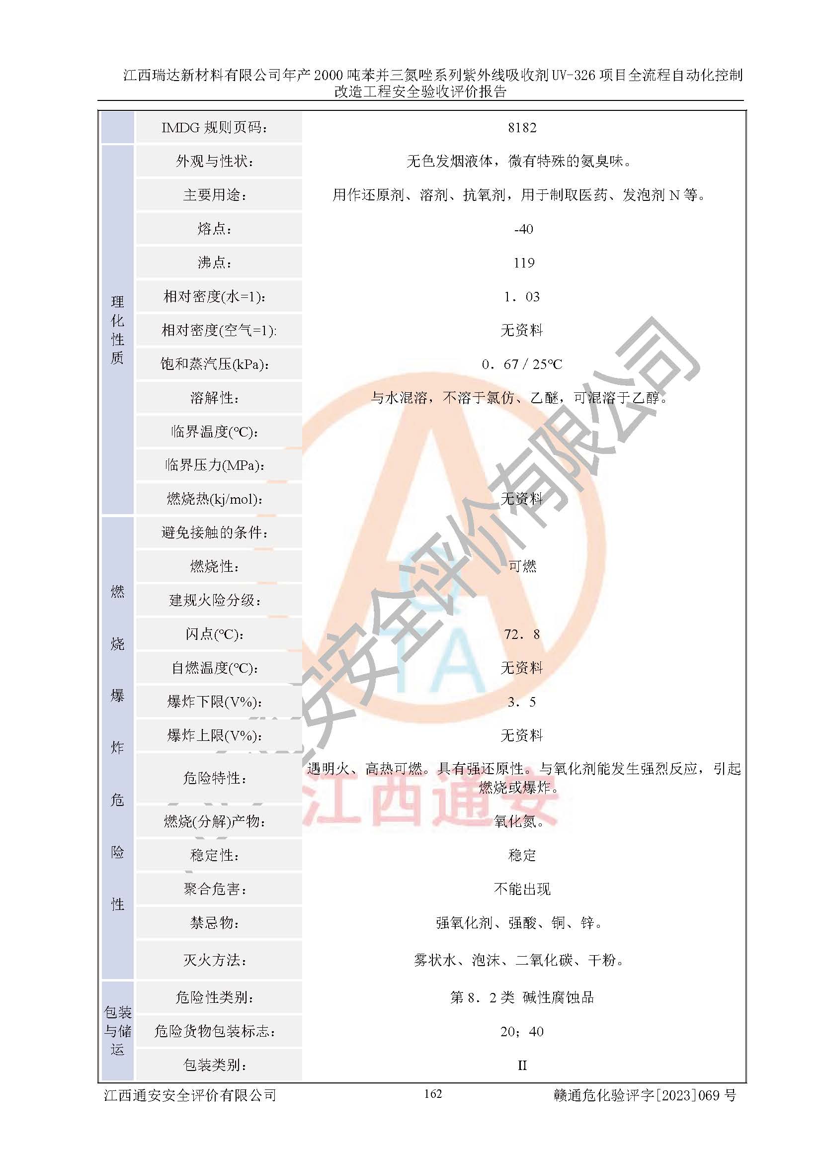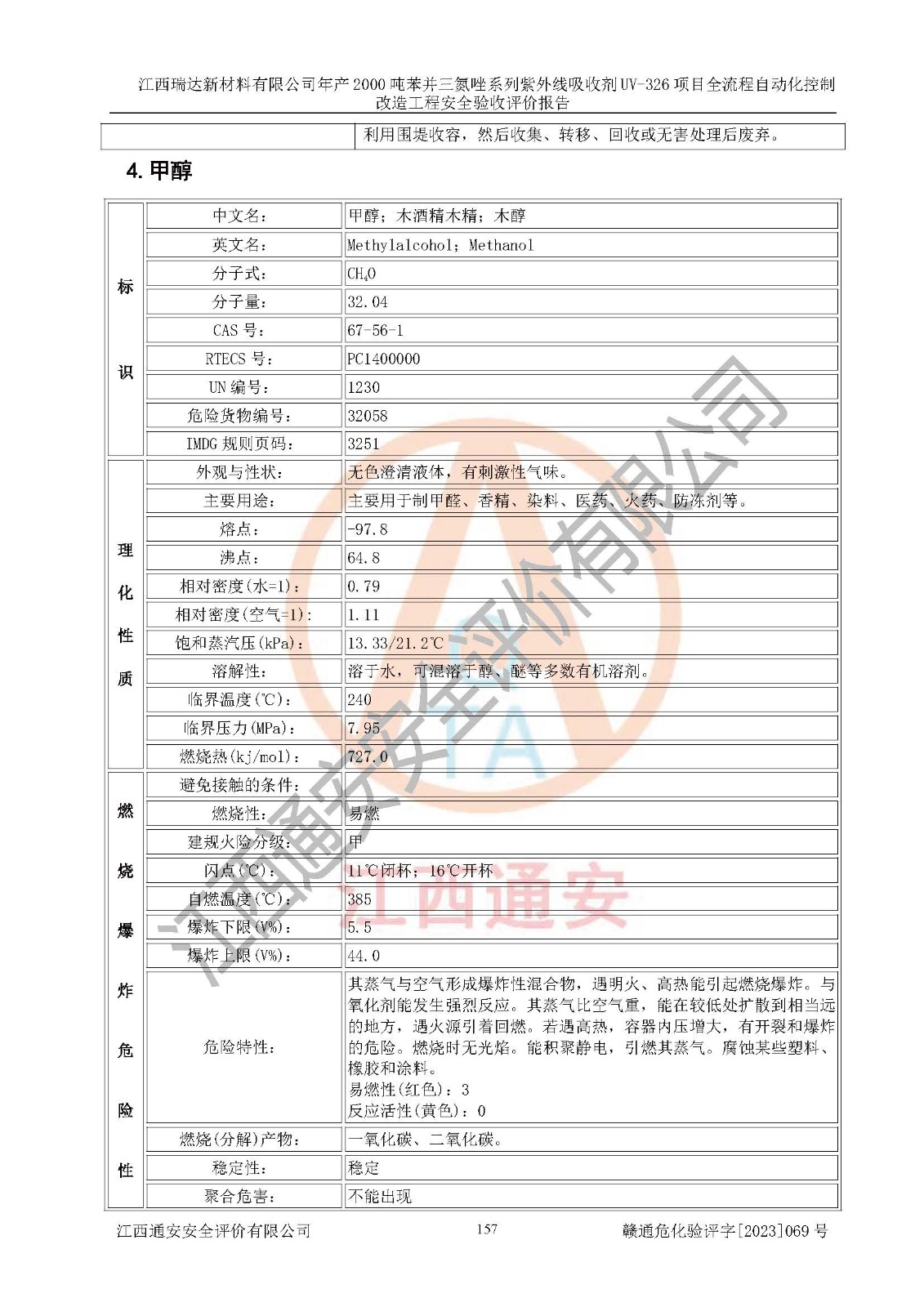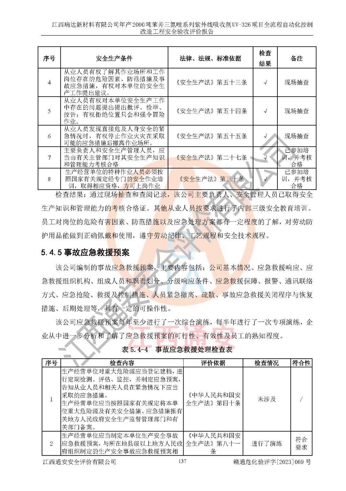 評價報告名稱 | 江西瑞達(dá)新材料有限公司年產(chǎn)2000噸苯并三氮唑系列紫外線吸收劑UV-326項目全流程自動化控制改造工程安全驗收評價報告 | |||