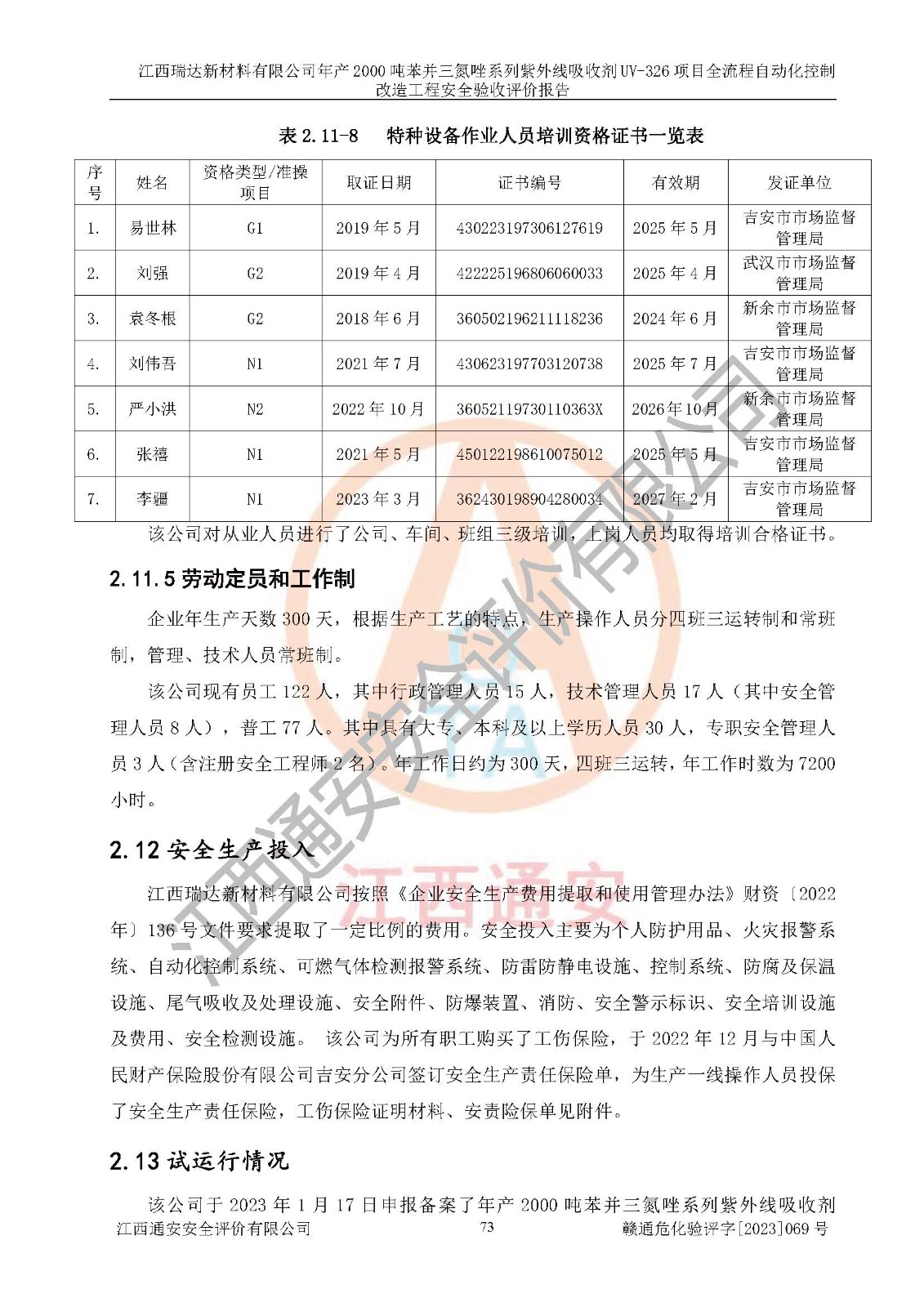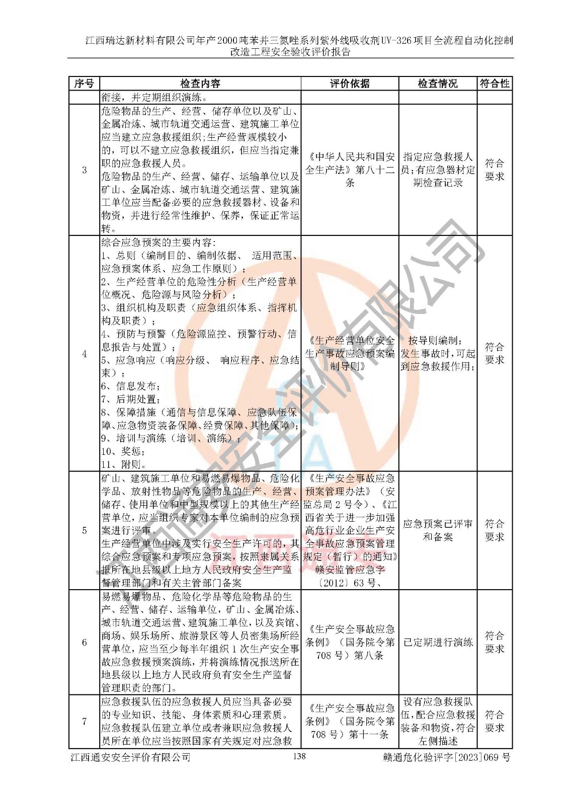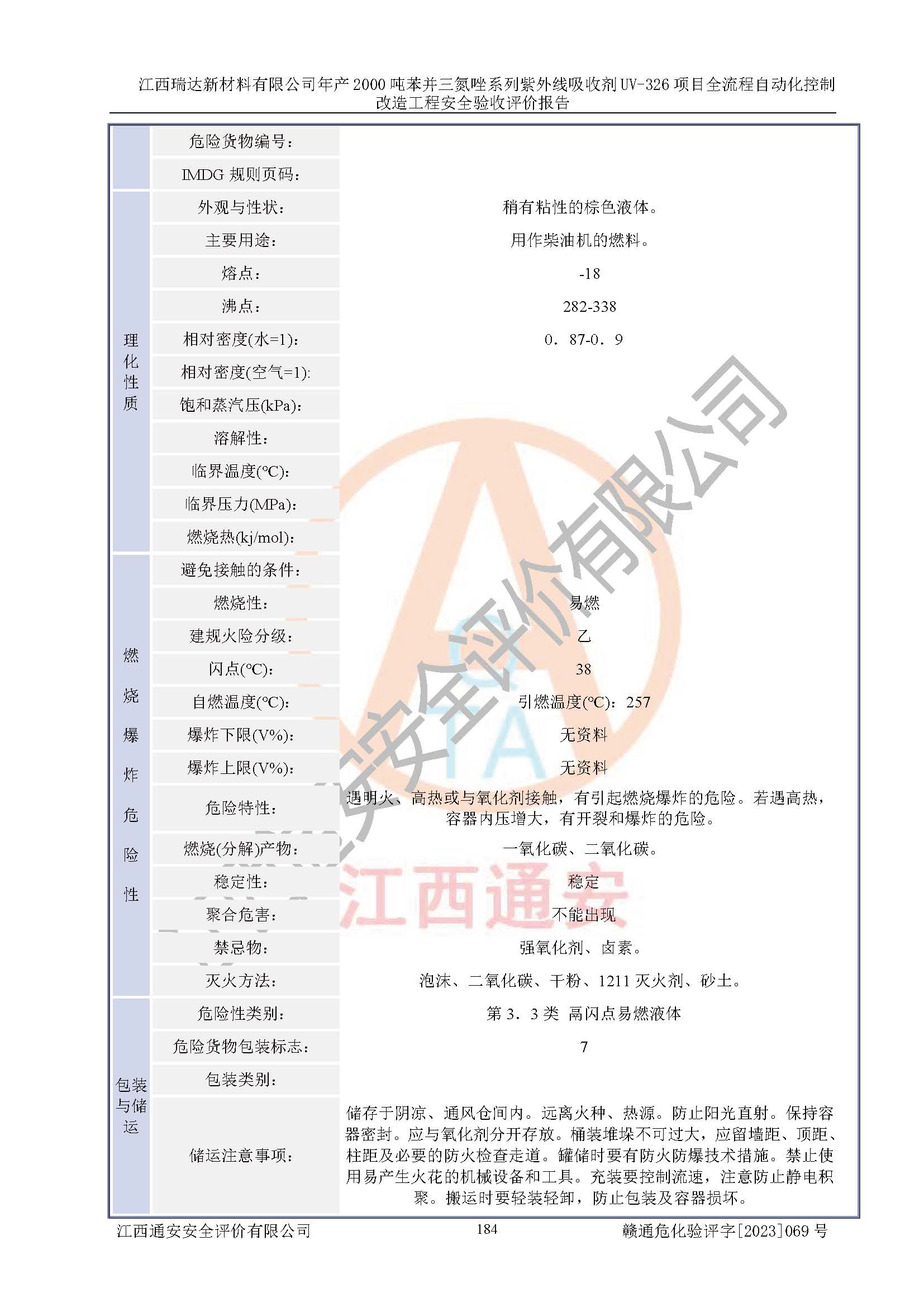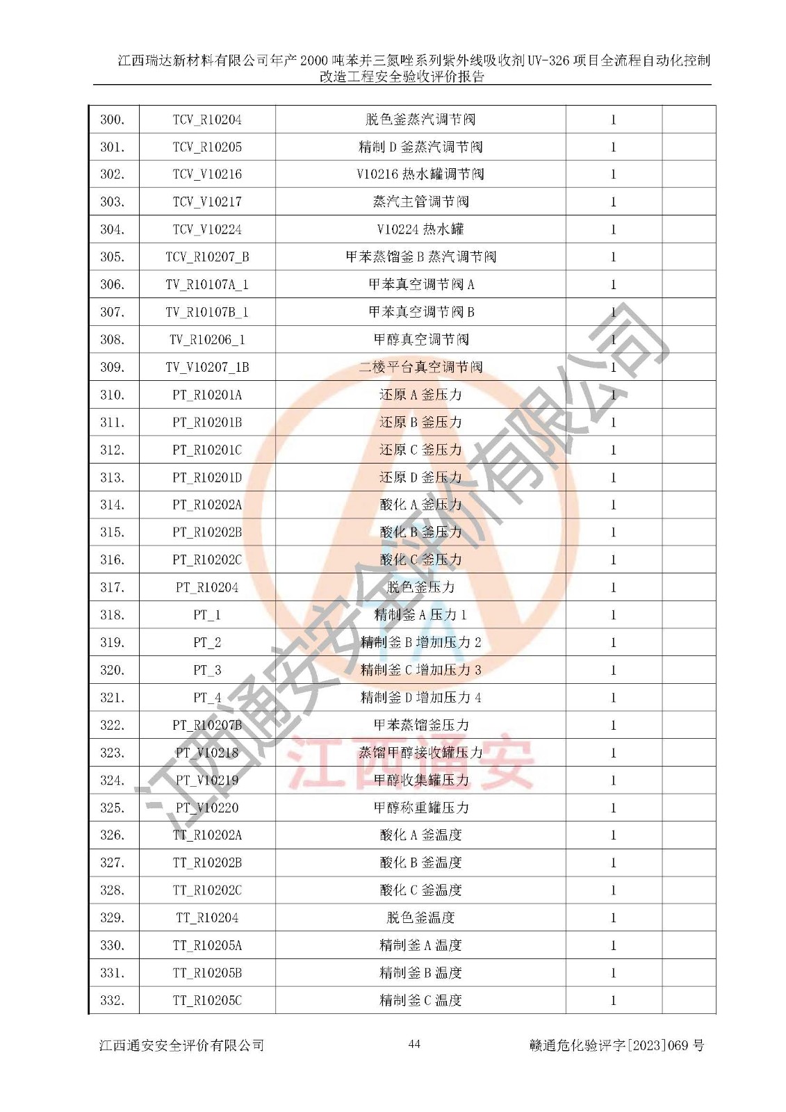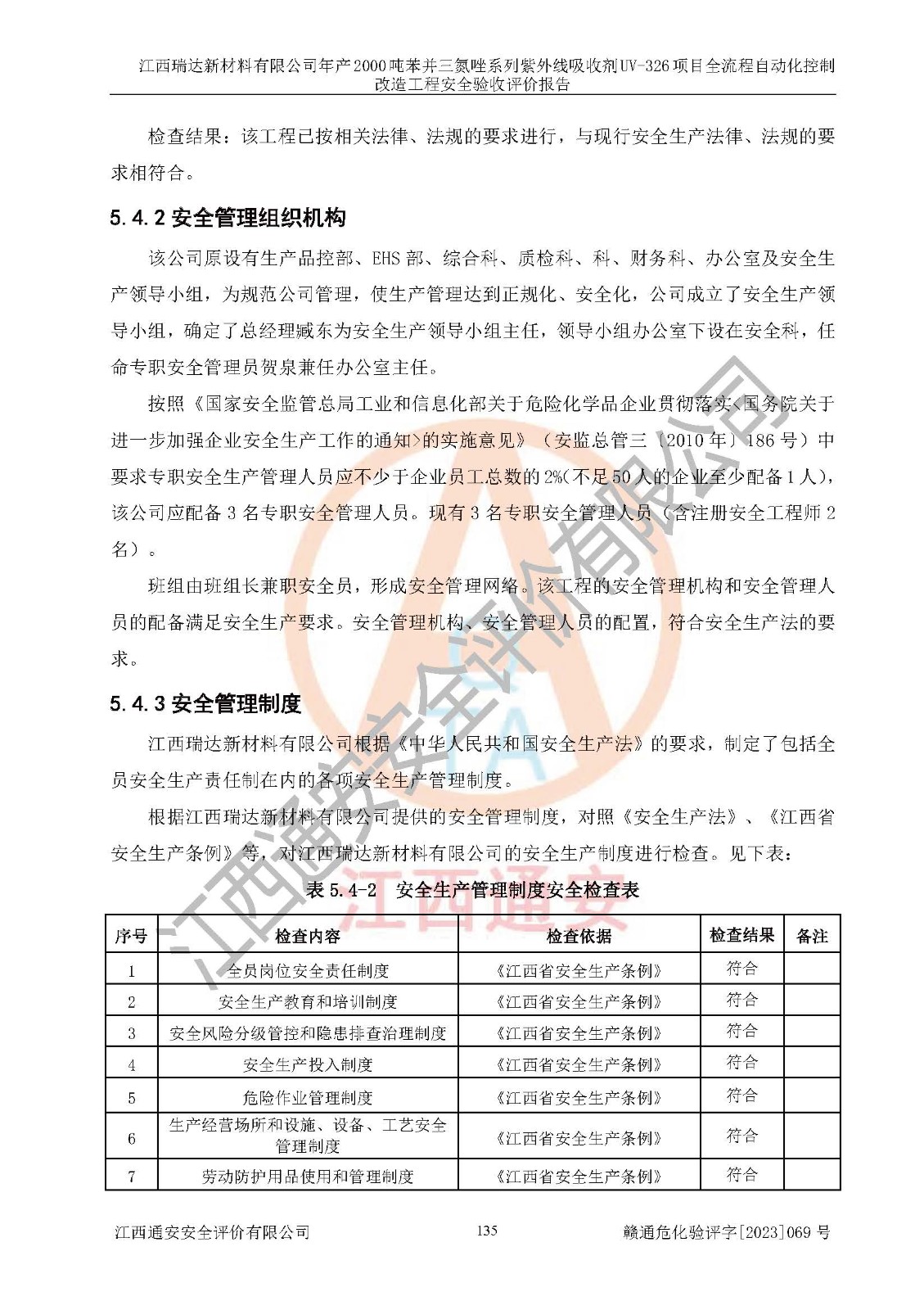 評價報告名稱 | 江西瑞達(dá)新材料有限公司年產(chǎn)2000噸苯并三氮唑系列紫外線吸收劑UV-326項目全流程自動化控制改造工程安全驗收評價報告 | |||