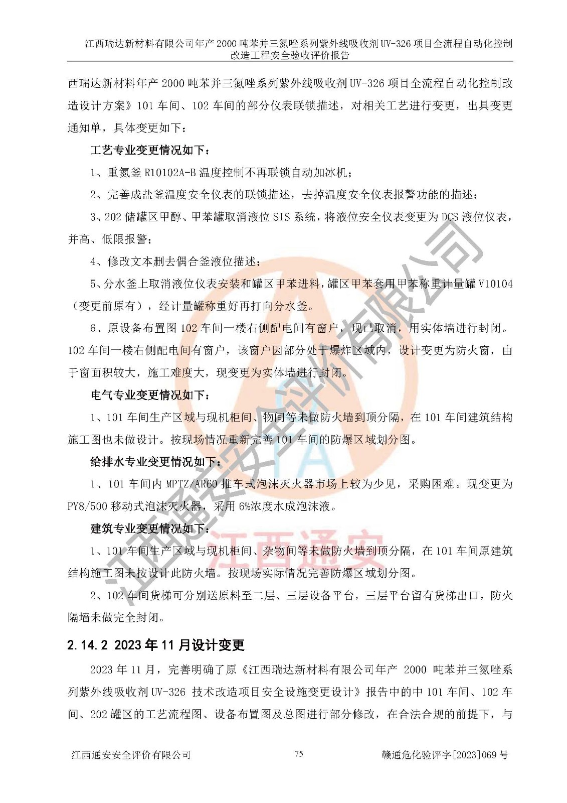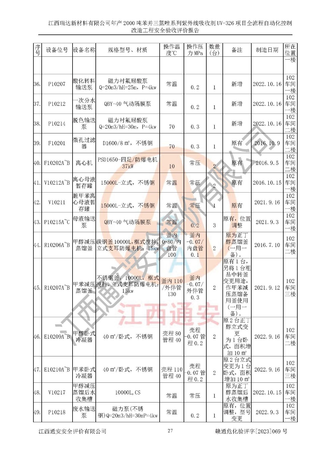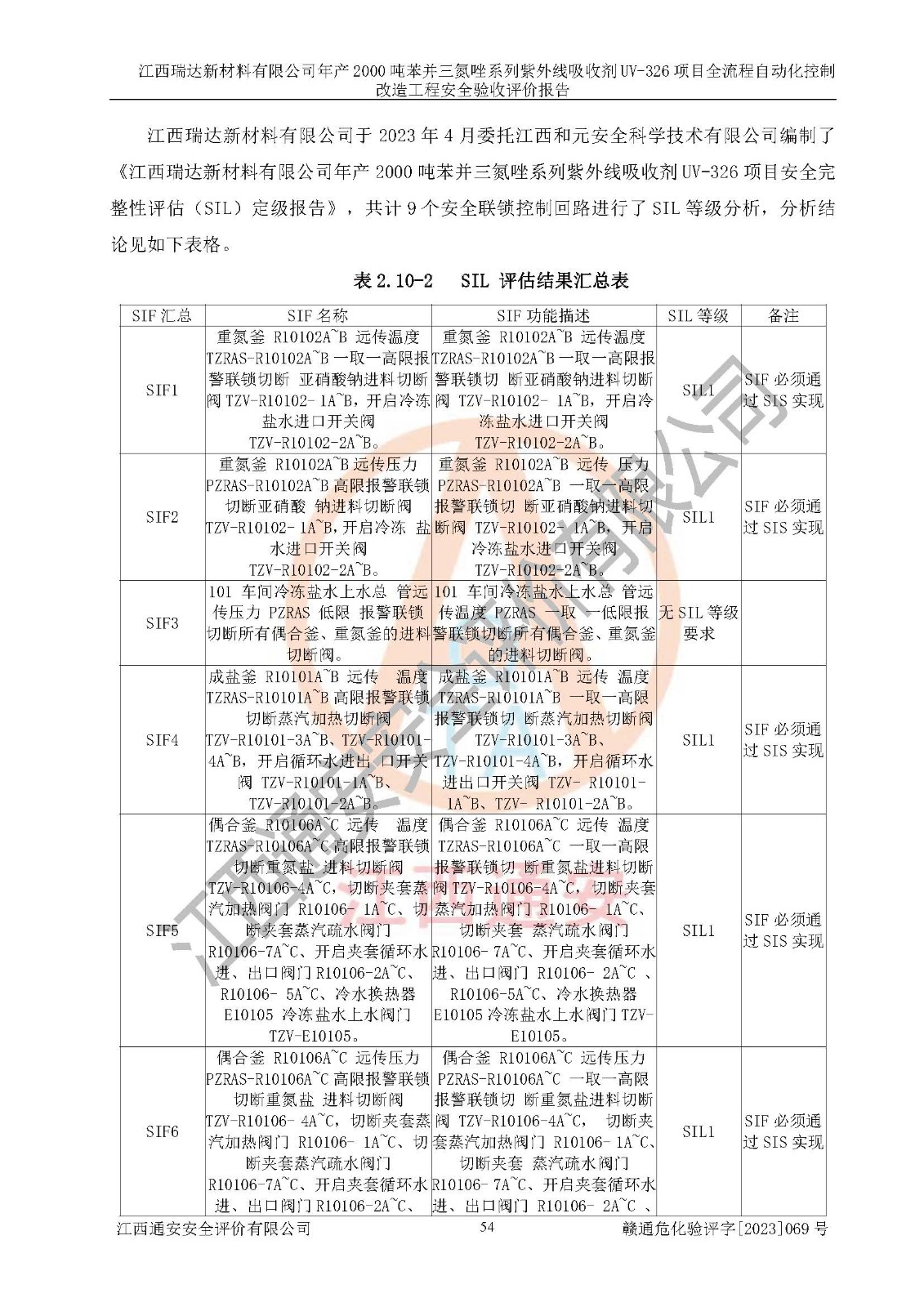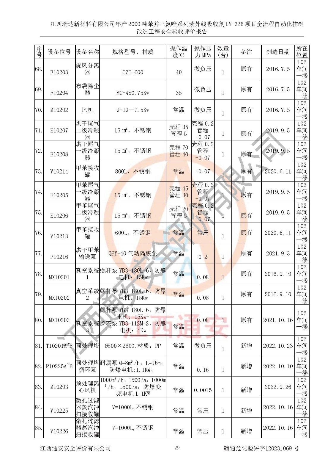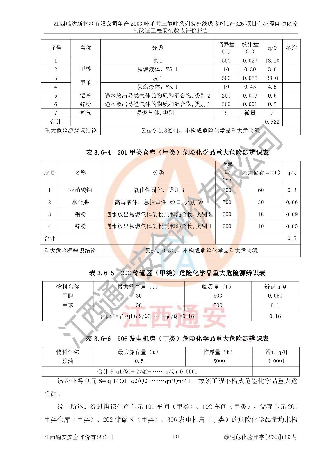 評價報告名稱 | 江西瑞達(dá)新材料有限公司年產(chǎn)2000噸苯并三氮唑系列紫外線吸收劑UV-326項目全流程自動化控制改造工程安全驗收評價報告 | |||
