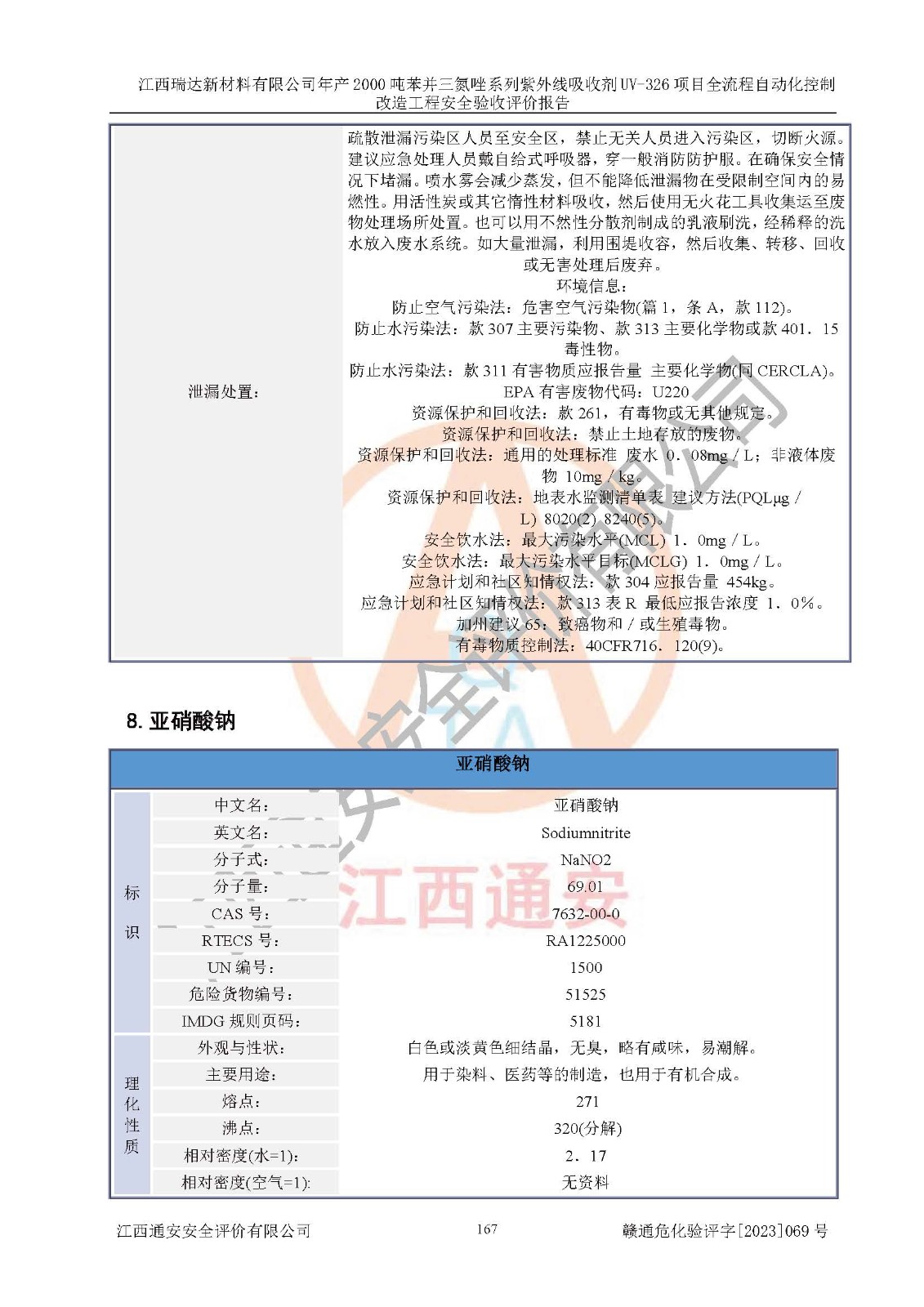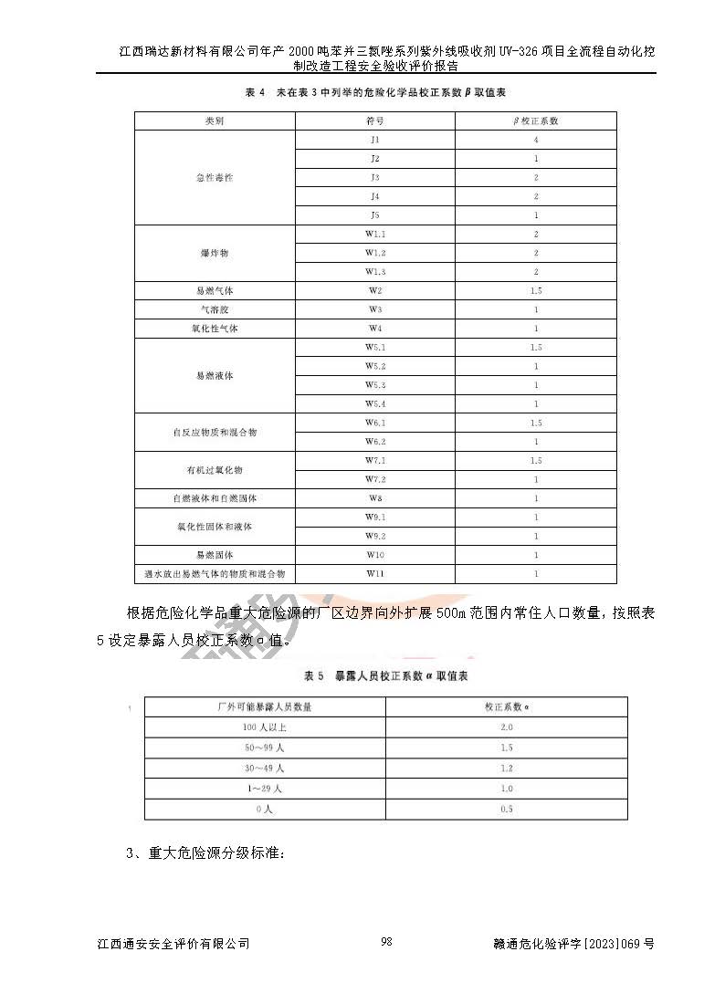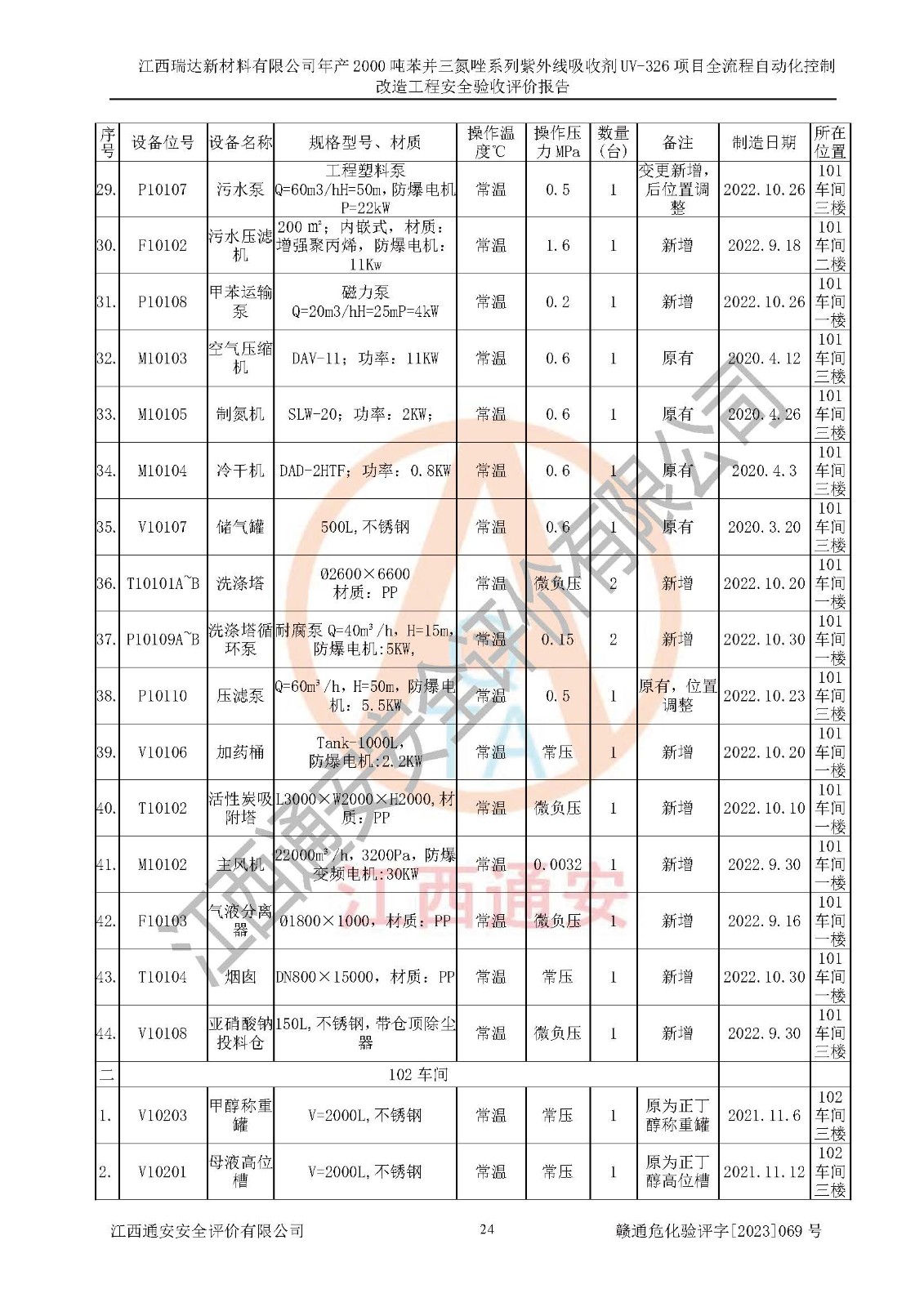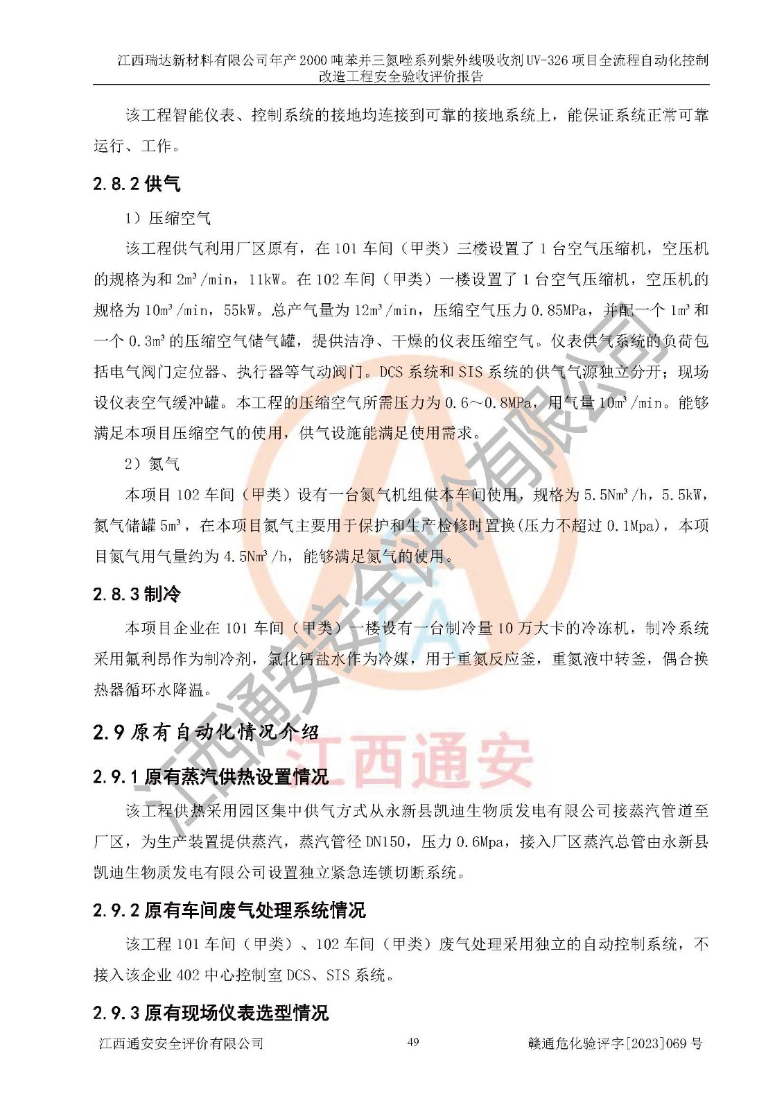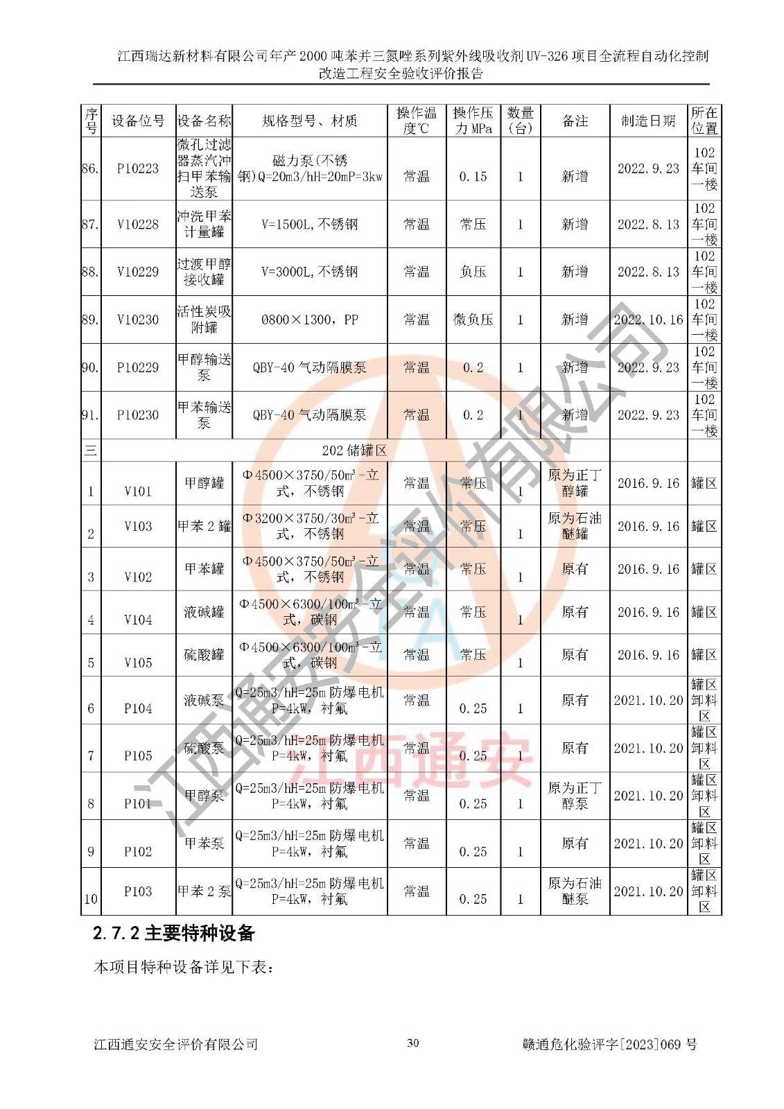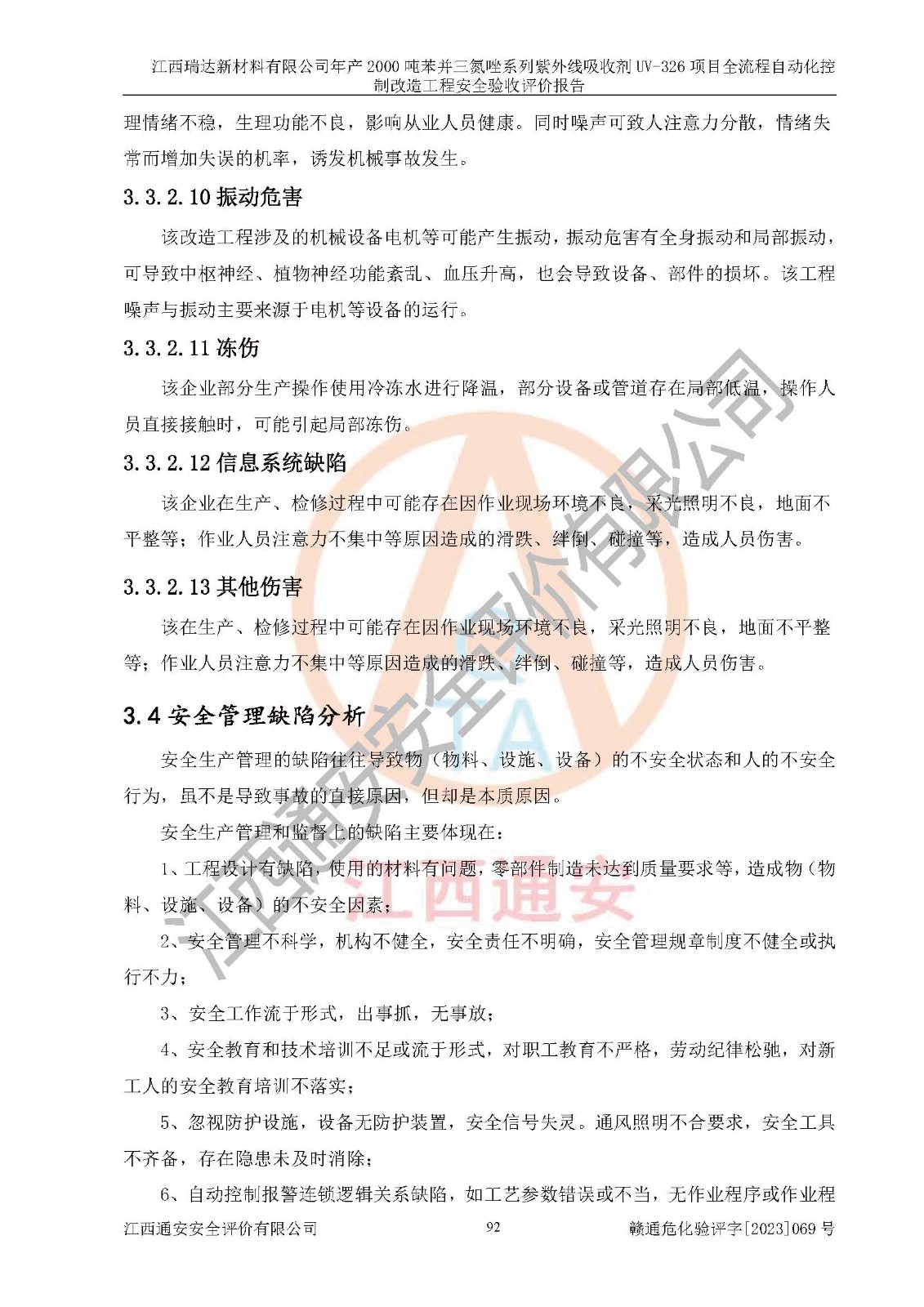 評價報告名稱 | 江西瑞達(dá)新材料有限公司年產(chǎn)2000噸苯并三氮唑系列紫外線吸收劑UV-326項目全流程自動化控制改造工程安全驗收評價報告 | |||
