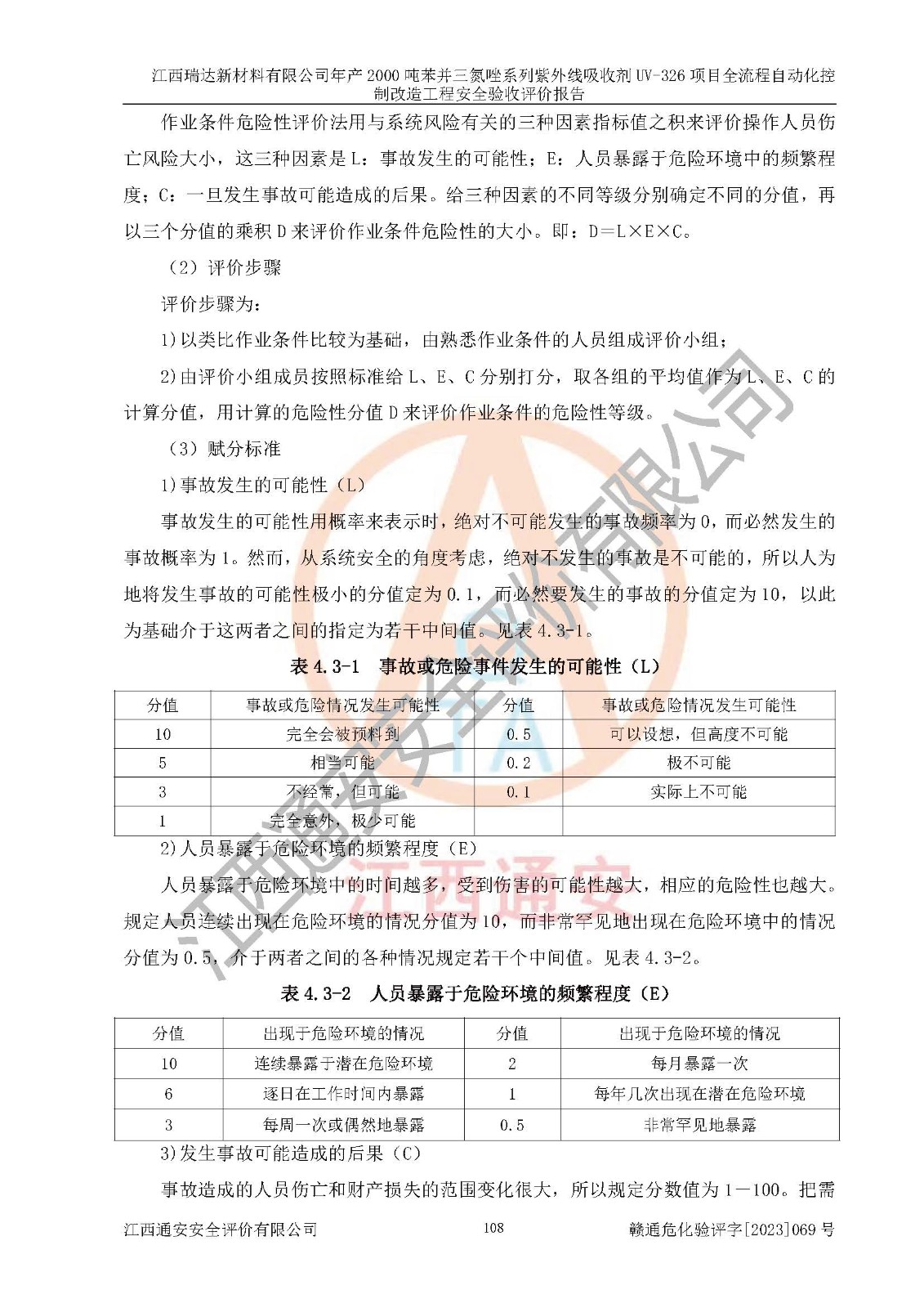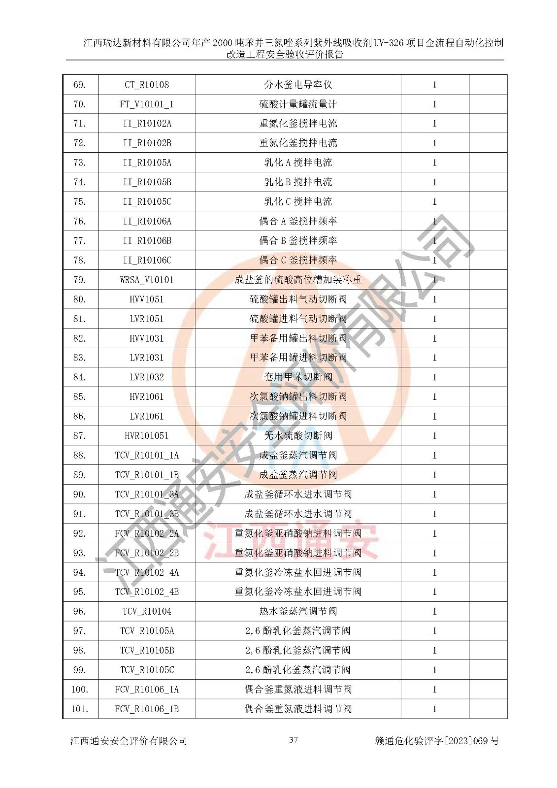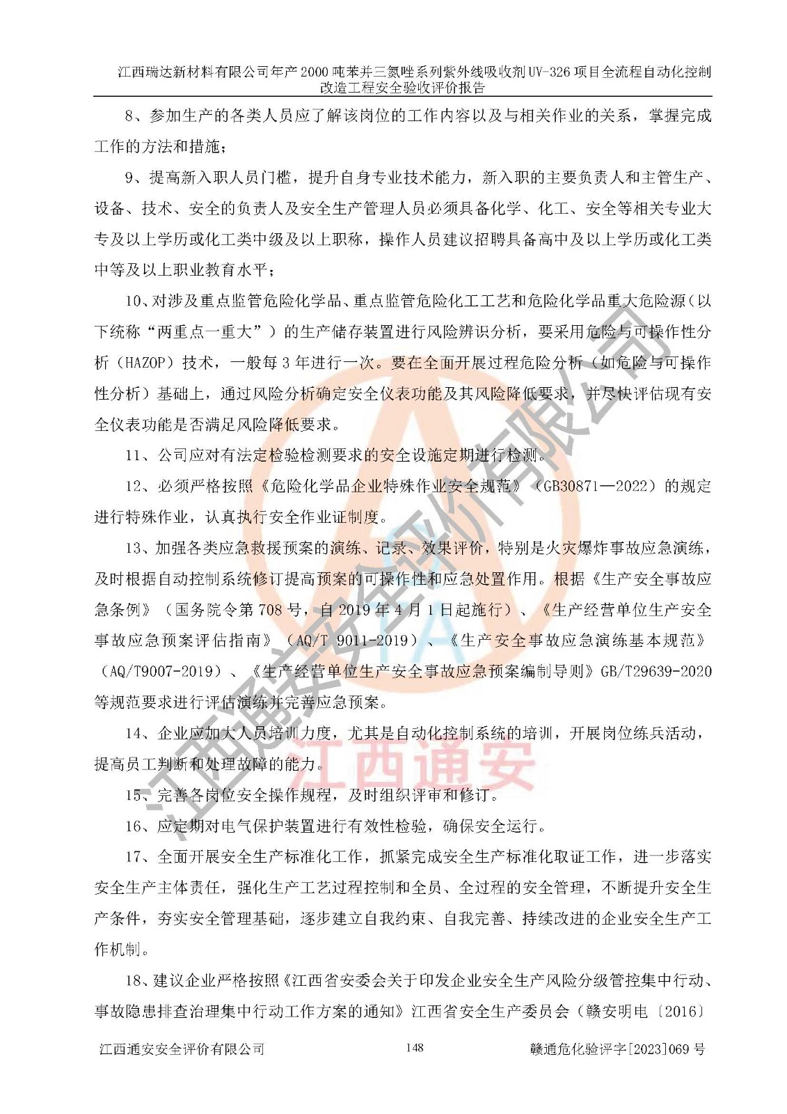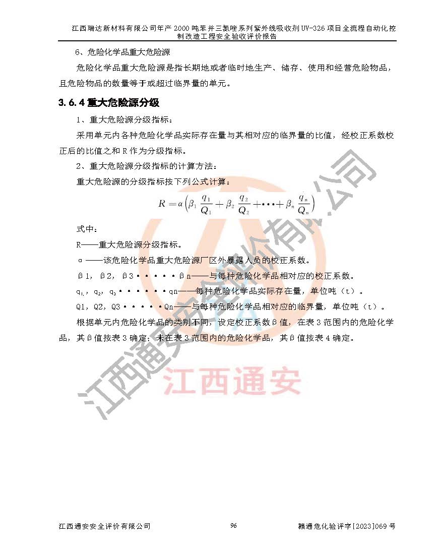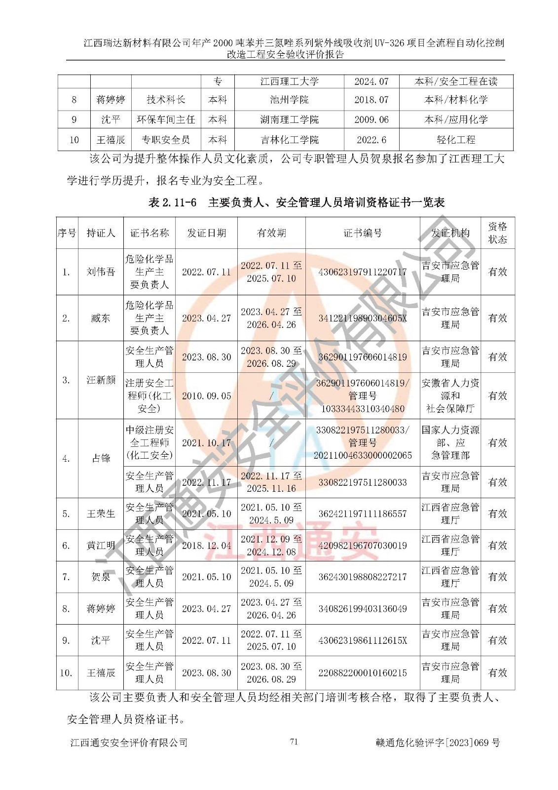 評價報告名稱 | 江西瑞達(dá)新材料有限公司年產(chǎn)2000噸苯并三氮唑系列紫外線吸收劑UV-326項目全流程自動化控制改造工程安全驗收評價報告 | |||
