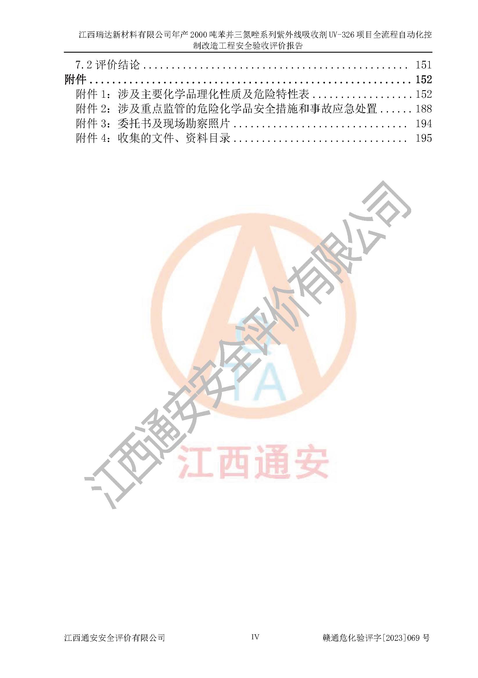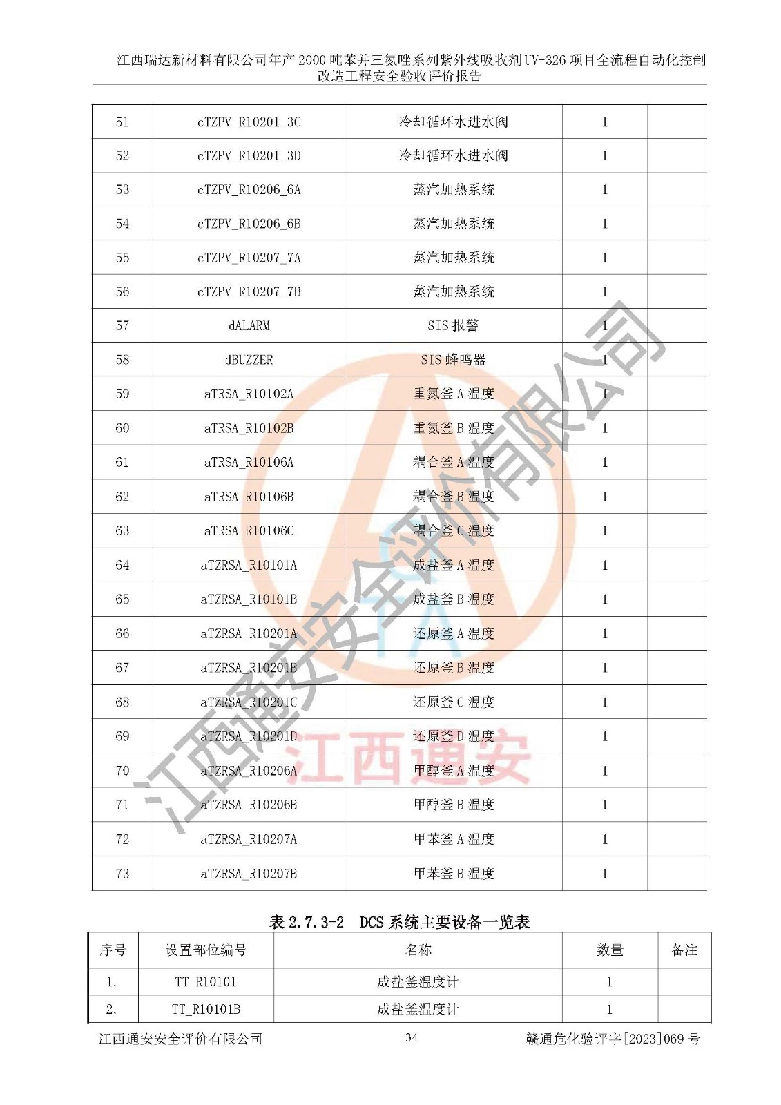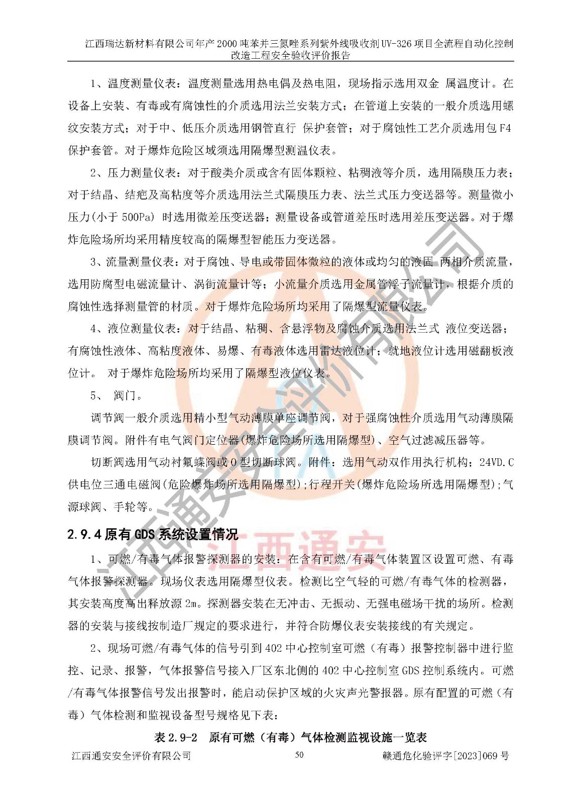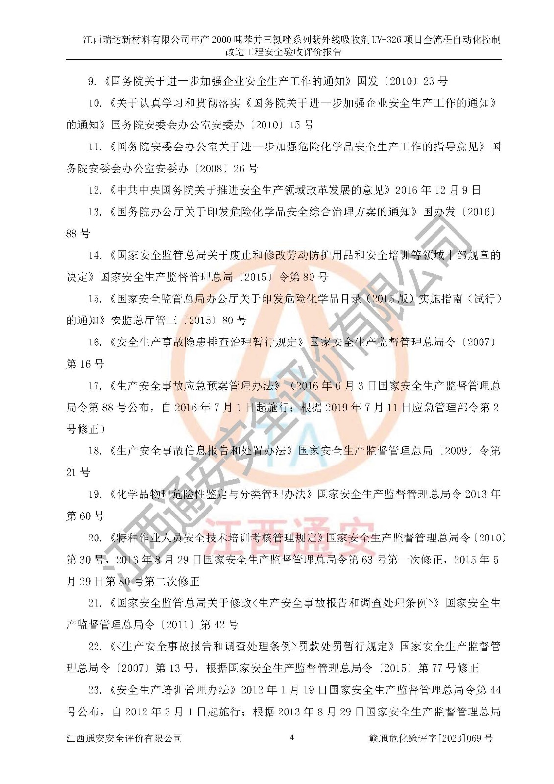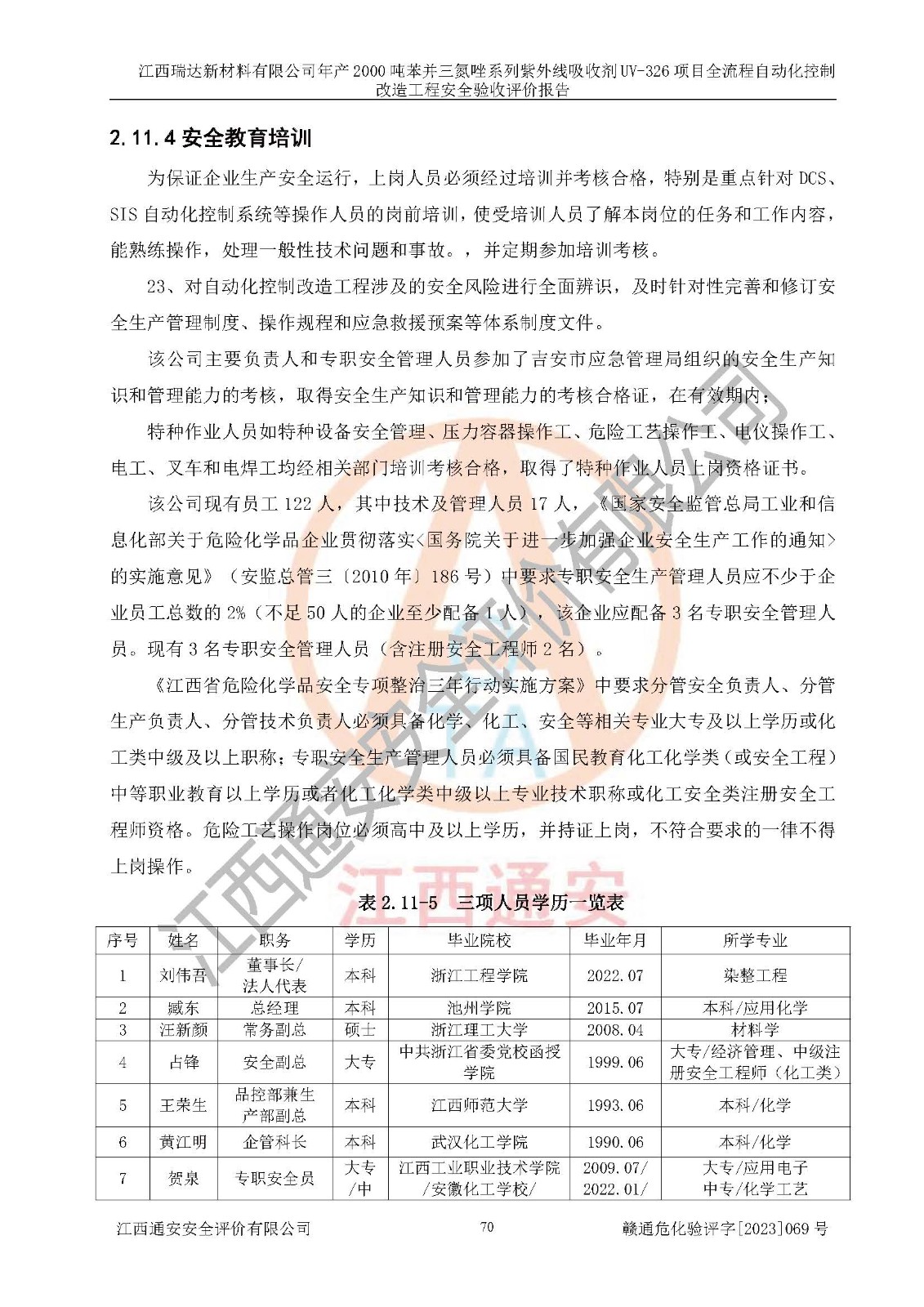 評價報告名稱 | 江西瑞達(dá)新材料有限公司年產(chǎn)2000噸苯并三氮唑系列紫外線吸收劑UV-326項目全流程自動化控制改造工程安全驗收評價報告 | |||