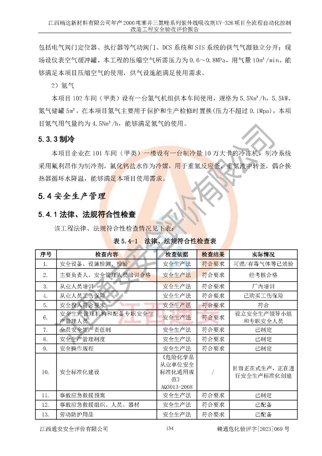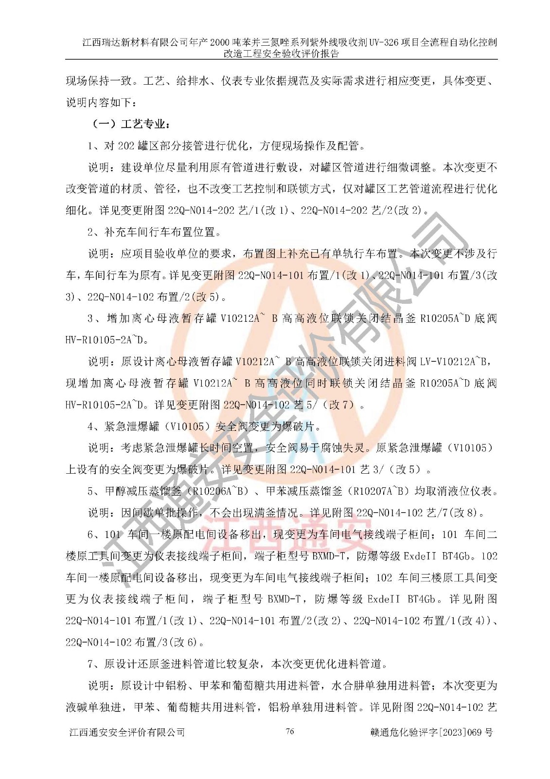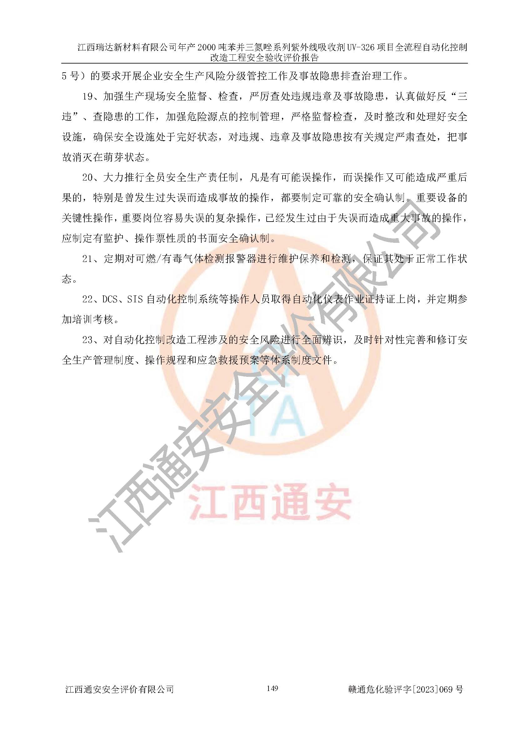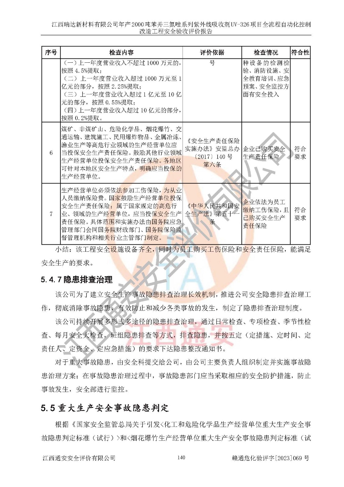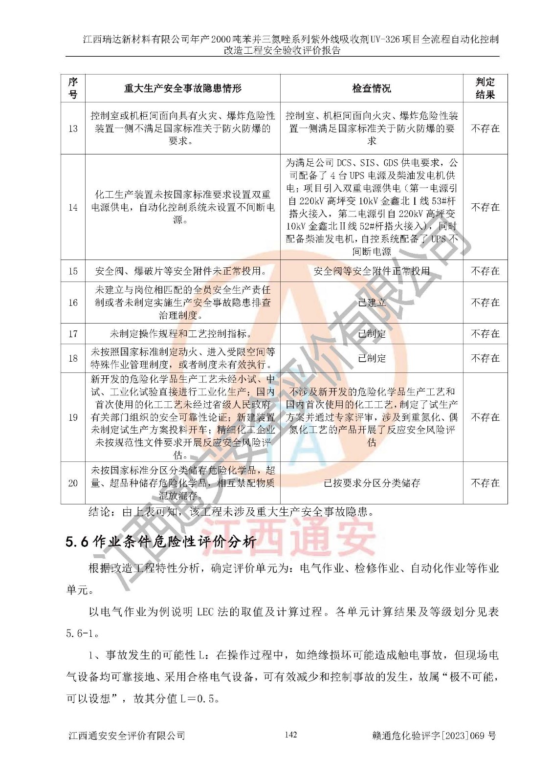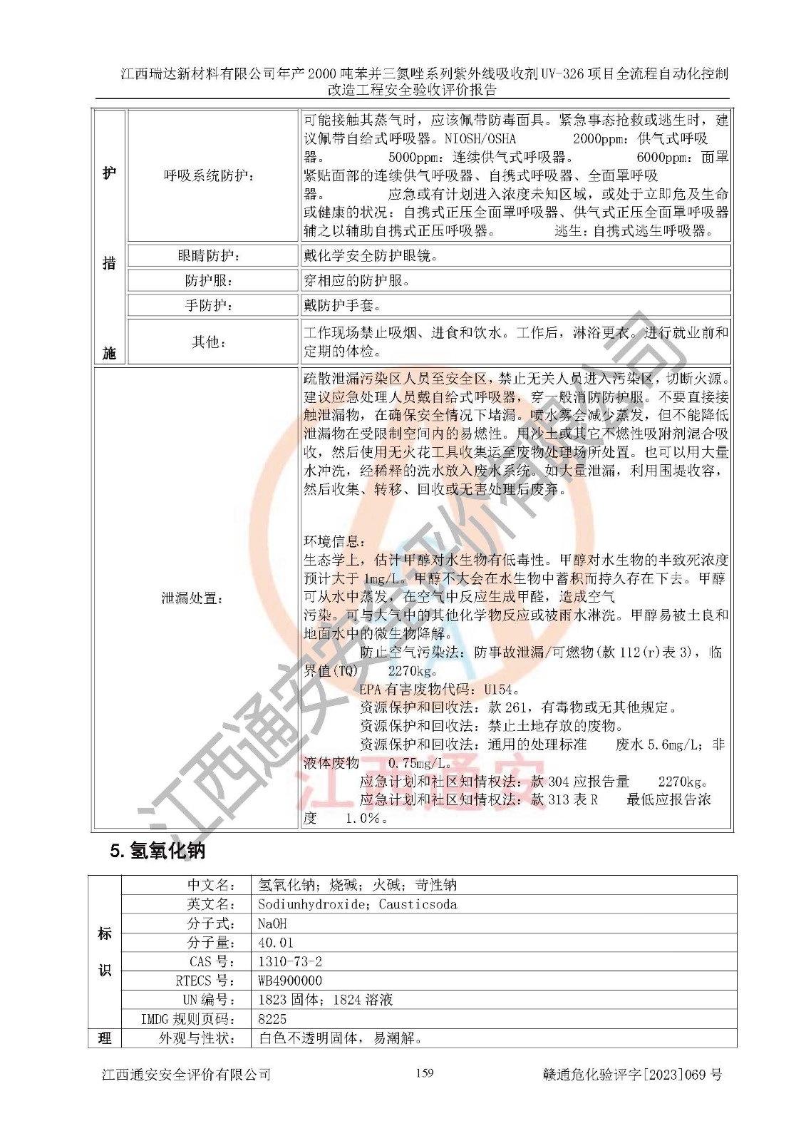 評價報告名稱 | 江西瑞達(dá)新材料有限公司年產(chǎn)2000噸苯并三氮唑系列紫外線吸收劑UV-326項目全流程自動化控制改造工程安全驗收評價報告 | |||