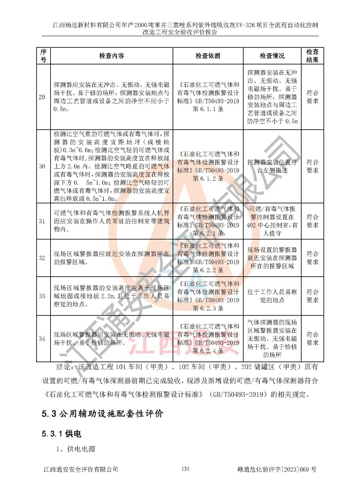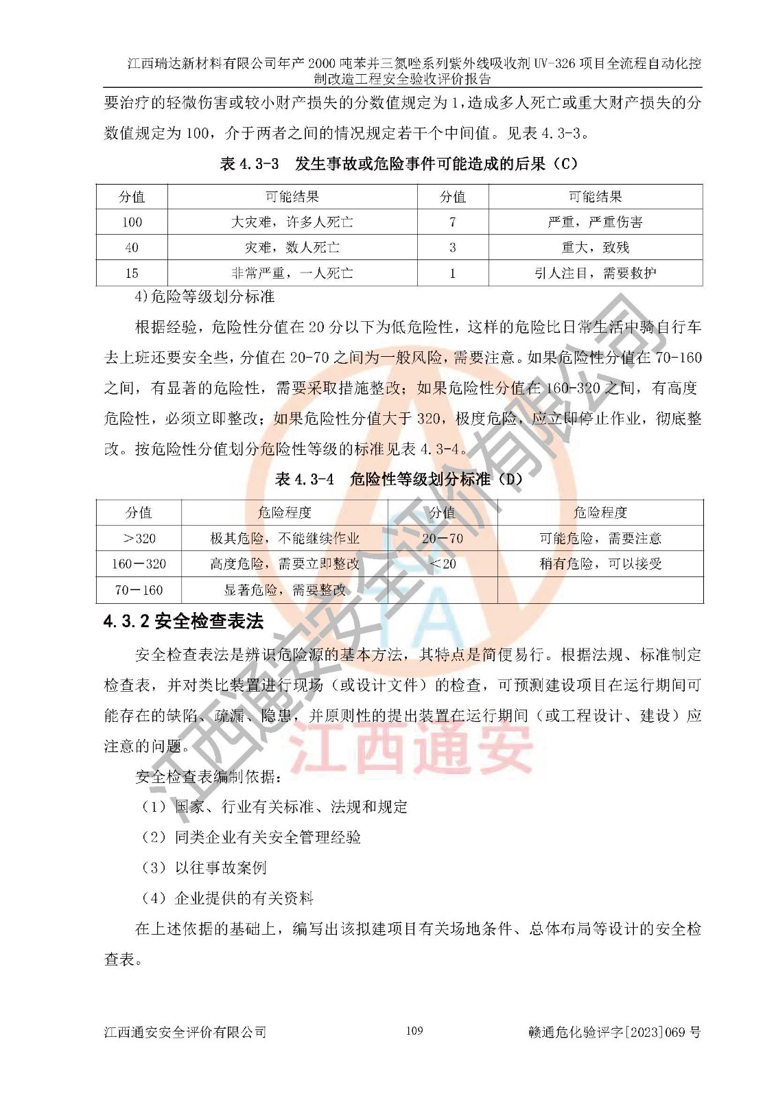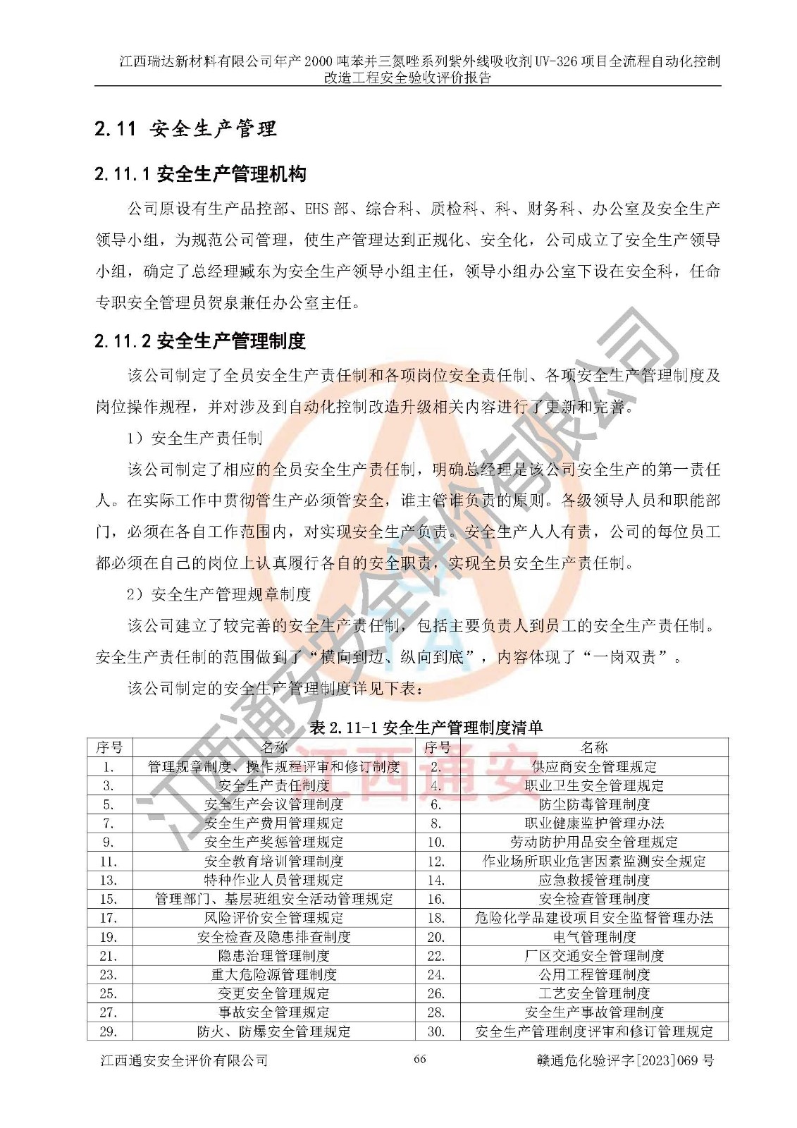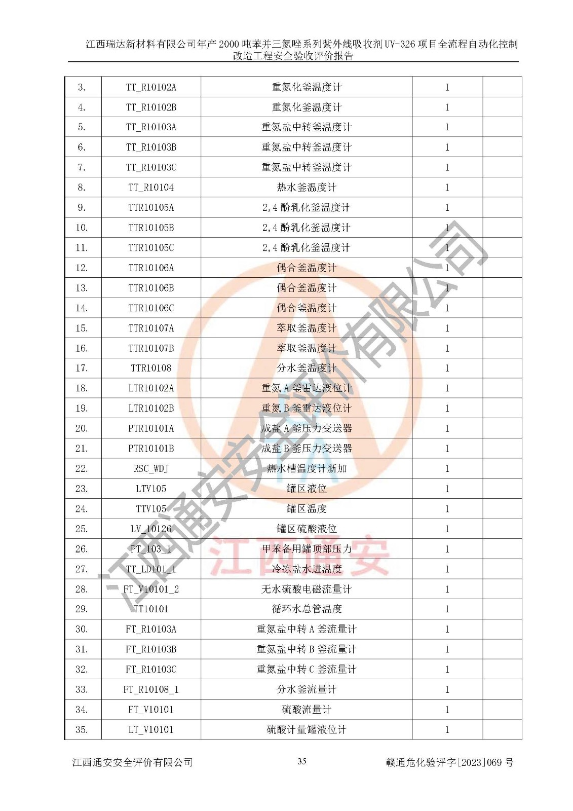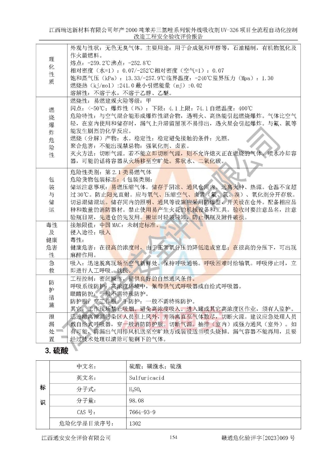 評價報告名稱 | 江西瑞達(dá)新材料有限公司年產(chǎn)2000噸苯并三氮唑系列紫外線吸收劑UV-326項目全流程自動化控制改造工程安全驗收評價報告 | |||
