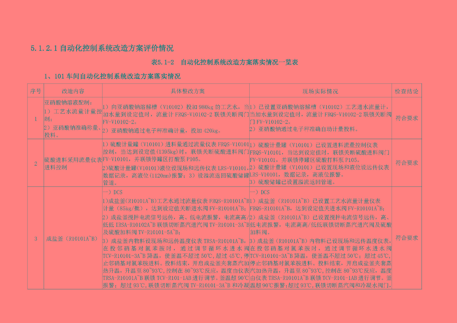 項目簡介 | 江西瑞達(dá)新材料有限公司于2015年03月10日成立,公司位于江西省吉安市永新縣茅坪化工產(chǎn)業(yè)園,公司法人**:劉偉吾,江西瑞達(dá)新材料有限公司是一家生產(chǎn)銷售紫外線吸收劑、分散染料、染料中間體、精細(xì)化工品;貨物、技術(shù)進(jìn)出口(依法須經(jīng)批準(zhǔn)的項目,經(jīng)相關(guān)部門批準(zhǔn)后方可開展經(jīng)營活動)的有限責(zé)任公司。 根據(jù)《江西省應(yīng)急管理廳關(guān)于印發(fā)(江西省化工企業(yè)自動化提升實施方 案)(試行)的通知》(贛應(yīng)急字[2021]190號)、《化工企業(yè)自動化提升要求》 等相關(guān)規(guī)范、規(guī)定、標(biāo)準(zhǔn)及文件的要求,本次評價為該公司年產(chǎn)2000噸苯并三氮唑系列紫外線吸收劑UV-326項目全流程自動化控制改造工程安全驗收評價報告。 2022年3月,江西瑞達(dá)新材料有限公司已委托河北英科石化工程有限公司對其年產(chǎn)2000噸苯并三氮唑系列紫外線吸收劑UV-326項目進(jìn)行全流程自動化控制診斷,并編制出具了《江西瑞達(dá)新材料有限公司年產(chǎn)2000噸苯并三氮唑系列紫外線吸收劑UV-326項目全流程自動化控制診斷報告》(以下簡稱“診斷報告”)。 2022年9月,江西瑞達(dá)新材料有限公司在此診斷報告的基礎(chǔ)上,委托江西和元安全科學(xué)技術(shù)有限公司出具了《江西瑞達(dá)新材料有限公司年產(chǎn)2000噸苯并三氮唑系列紫外線吸收劑UV-326項目危險與可操作性分析(HAZOP)報告》、《江西瑞達(dá)新材料有限公司UV-326項目全流程反應(yīng)安全風(fēng)險評估報告》和《江西瑞達(dá)新材料有限公司UV-326項目安全完整性等級(SIL)評估報告》,進(jìn)行自動化控制改造設(shè)計。 2022年11月,河北英科石化工程有限公司以江西瑞達(dá)新材料有限公司所提供的工藝、設(shè)備、物料、操作工況及自控聯(lián)鎖關(guān)系等資料為基礎(chǔ)進(jìn)行分析編制了《江西瑞達(dá)新材料有限公司年產(chǎn)2000噸苯并三氮唑系列紫外線吸收劑UV-326項目全流程自動化控制改造設(shè)計方案》,并于2022年11月28日通過了專家審查。 江西瑞達(dá)新材料有限公司年產(chǎn)2000噸苯并三氮唑系列紫外線吸收劑UV-326項目全流程自動化控制改造工程由山東鴻華建筑安裝工程有限公司和南通通博設(shè)備安裝集團(tuán)有限公司負(fù)責(zé)安裝、調(diào)試,并于2023年11月由山東鴻華建筑安裝工程有限公司出具了《江西瑞達(dá)新材料有限公司年產(chǎn)2000 噸苯并三氮嘩系列紫外線吸收劑UV-326全流程自動化控制改造項目TCS-900系統(tǒng)(SIS)調(diào)試報告》和《江西瑞達(dá)新材料有限公司年產(chǎn)2000 噸苯并三氮嘩系列紫外線吸收劑UV-326全流程自動化控制改造項目JX-300XP系統(tǒng)(DCS)調(diào)試報告》。該公司編制了較完善的試運行前后的停、開車方案,并進(jìn)行了試運行。 根據(jù)《危險化學(xué)品目錄(2015版)》(**安監(jiān)總局等十部門公告[2015]第5號)及應(yīng)急管理部、工業(yè)和信息化部、公安部、生態(tài)環(huán)境部、交通運輸部、農(nóng)業(yè)農(nóng)村部、衛(wèi)生健康委、市場監(jiān)管總局、鐵路局、民航局決定調(diào)整《危險化學(xué)品目錄(2015版)》(應(yīng)急管理部、工業(yè)和信息化部、公安部、生態(tài)環(huán)境部、交通運輸部、農(nóng)業(yè)農(nóng)村部、衛(wèi)生健康委、市場監(jiān)管總局、鐵路局、民航局公告2022年第8號)等文件對該項目生產(chǎn)過程中所涉及的化學(xué)品進(jìn)行辨識:該項目在生產(chǎn)過程中涉及的硫酸、亞硝酸鈉、液堿、水合肼、甲苯、鄰硝基對氯苯胺、甲醇、鋁粉、鋅粉、氫氣(副反應(yīng)產(chǎn)生的尾氣)、一氧化氮(副反應(yīng)產(chǎn)生的尾氣)、二氧化氮(副反應(yīng)產(chǎn)生的尾氣)、柴油(柴油發(fā)電機(jī)使用)均屬于危險化學(xué)品,并涉及多種溶劑回收,如甲醇、甲苯等。 根據(jù)《特別管控危險化學(xué)品目錄(**版)》(應(yīng)急管理部、工業(yè)和信息化部、公安部、交通運輸部公告(2020年第3號))進(jìn)行辨識:該項目涉及的甲醇屬于特別管控危險化學(xué)品。 根據(jù)《**安全監(jiān)管總局關(guān)于公布首批重點監(jiān)管的危險化學(xué)品名錄的通知》原安監(jiān)總管三[2011]95號、《**安全監(jiān)管總局關(guān)于公布第二批重點監(jiān)管危險化學(xué)品名錄的通知》原安監(jiān)總管三[2013]12號進(jìn)行辨識:項目涉及的甲苯、氫氣(副反應(yīng)產(chǎn)生的尾氣)、甲醇屬于重點監(jiān)管的危險化學(xué)品。 根據(jù)《危險化學(xué)品重大危險源辨識》(GB18218-2018)對該項目的生產(chǎn)單元和儲存單元進(jìn)行辨識得出:該項目的各生產(chǎn)單元和儲存單元均不構(gòu)成危險化學(xué)品重大危險源。 根據(jù)《**安全監(jiān)管總局關(guān)于公布首批重點監(jiān)管的危險化工工藝目錄的通知》(安監(jiān)總管三〔2009年〕116號)和《**安全監(jiān)管總局關(guān)于公布第二批重點監(jiān)管危險化工工藝目錄和調(diào)整首批重點監(jiān)管危險化工工藝中部分典型工藝的通知》(安監(jiān)總管三〔2013年〕3號)對本項目進(jìn)行危險工藝辨識:該項目101車間的UV-326的中間體偶合物(MAB)制取涉及重氮化反應(yīng)、偶氮化反應(yīng)屬于重點監(jiān)管的危險化工工藝
