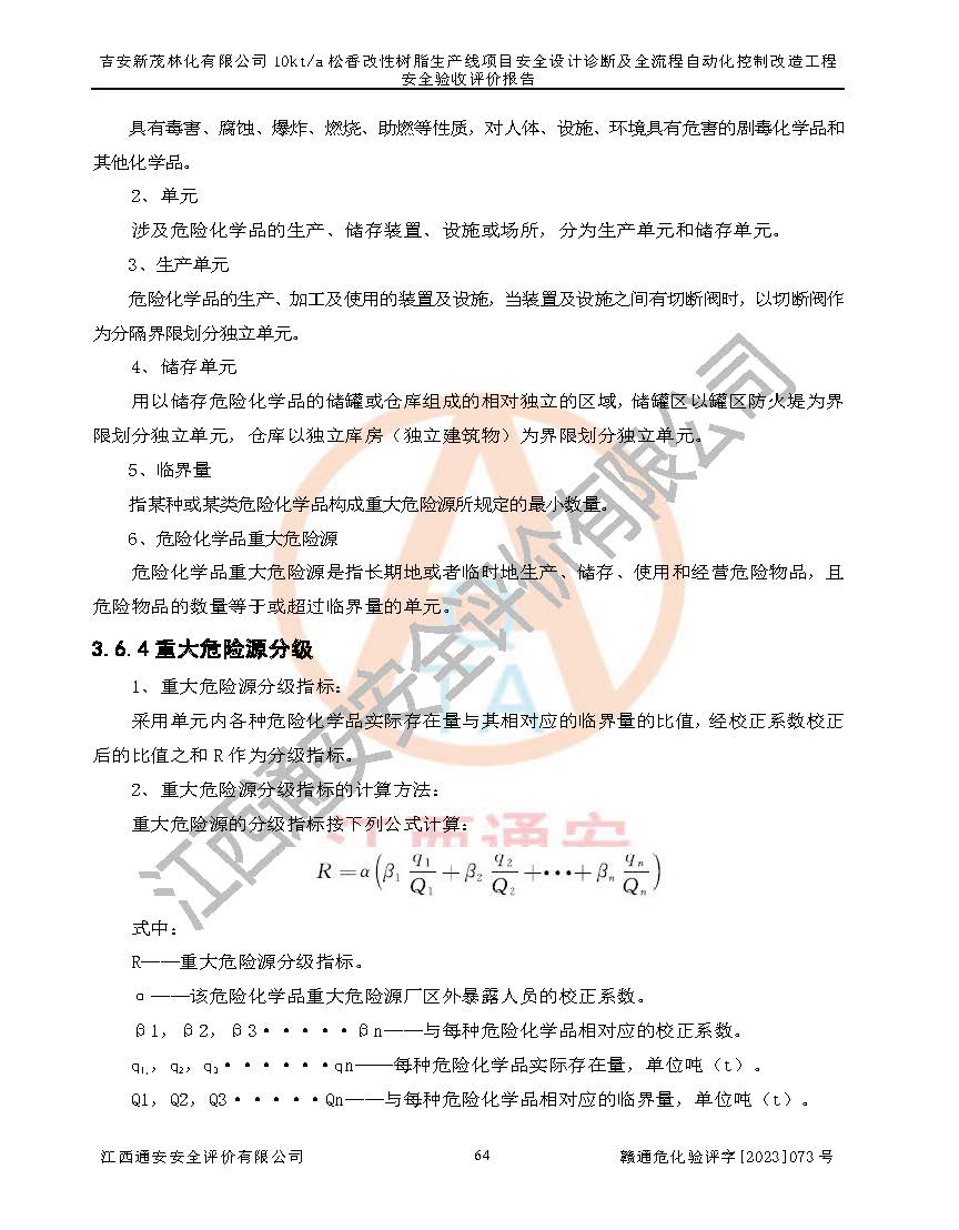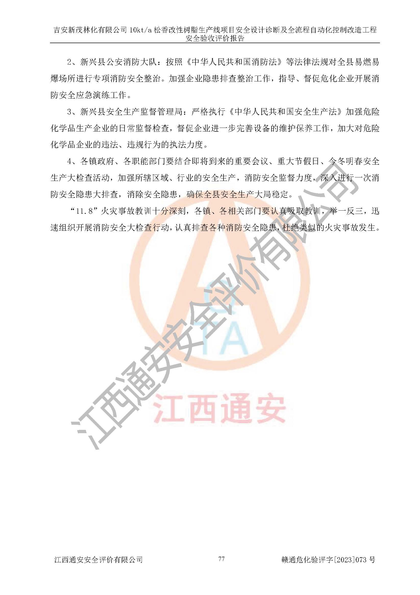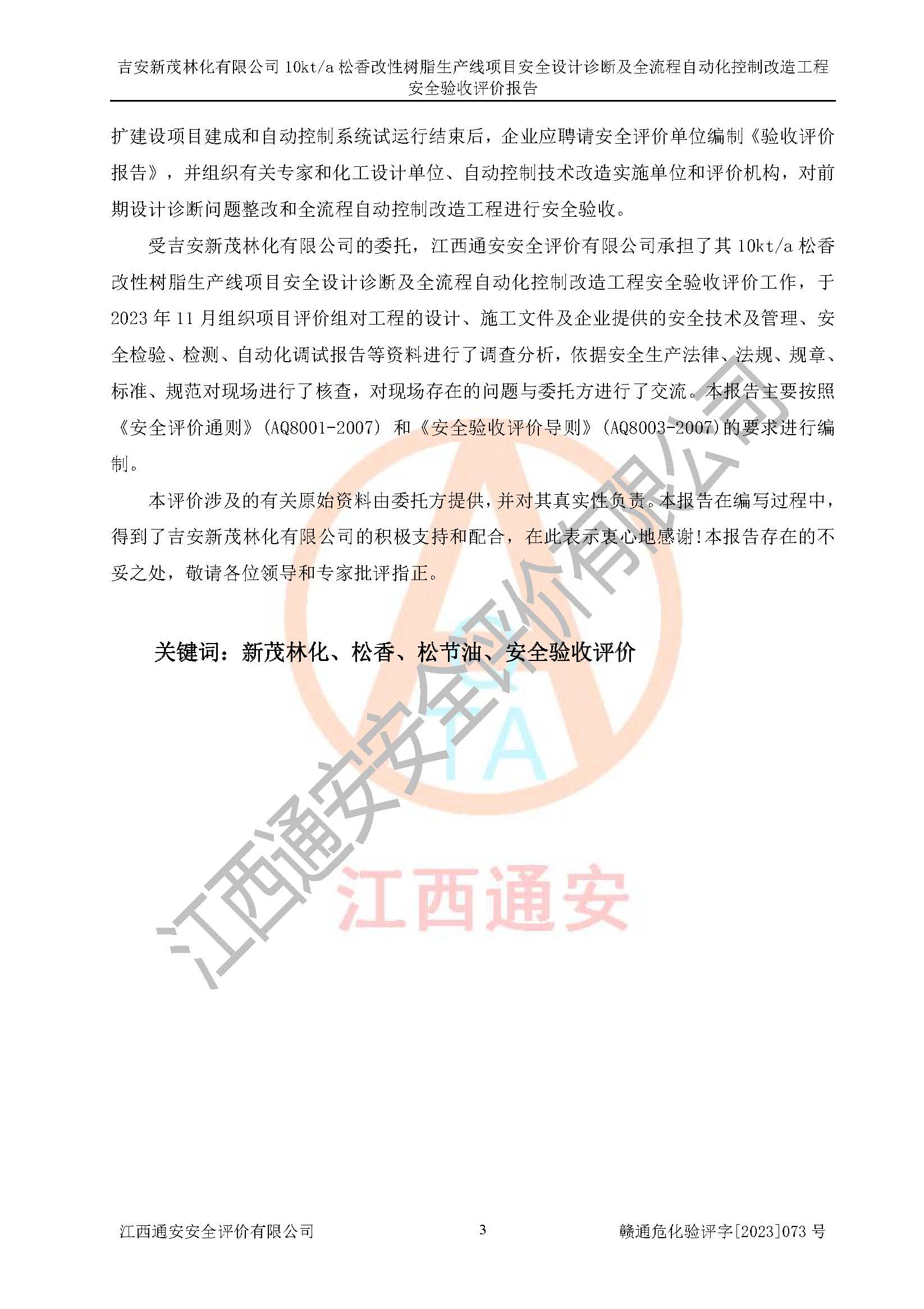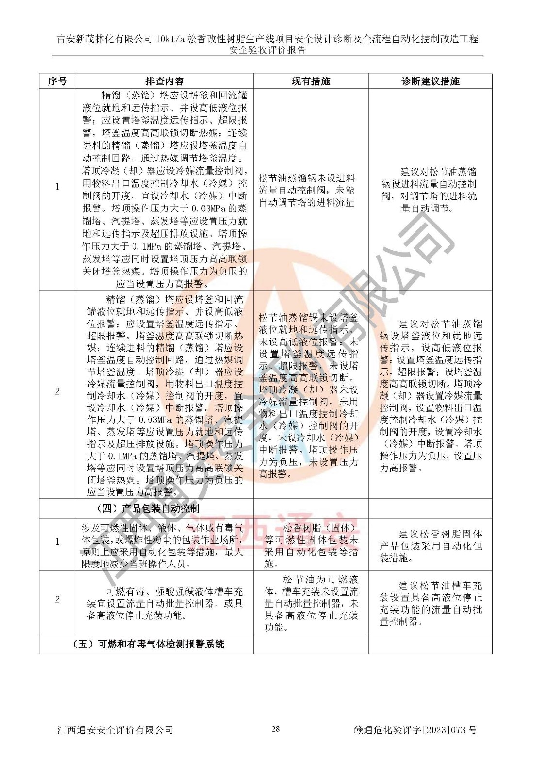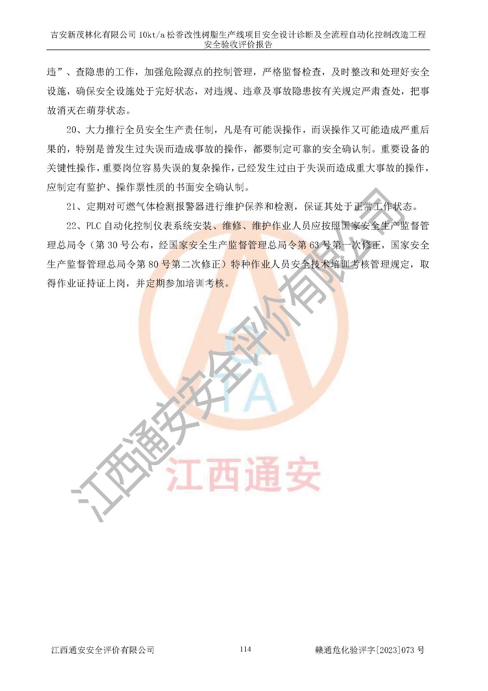 評價(jià)報(bào)告名稱 | 吉安新茂林化有限公司10kta松香改性樹脂生產(chǎn)線項(xiàng)目安全設(shè)計(jì)診斷及全流程自動(dòng)化控制改造工程安全驗(yàn)收評價(jià)報(bào)告 | |||