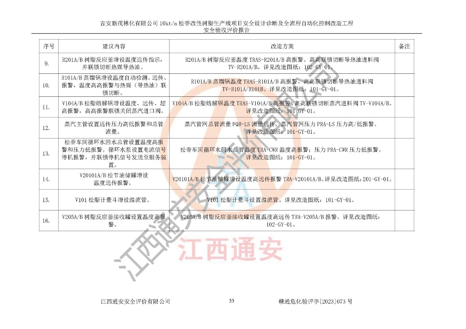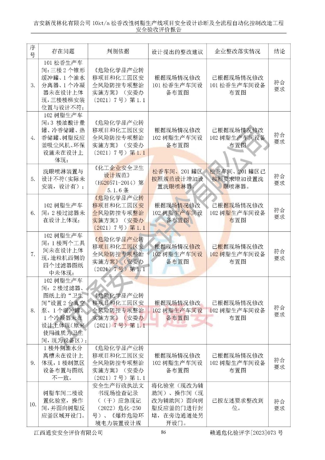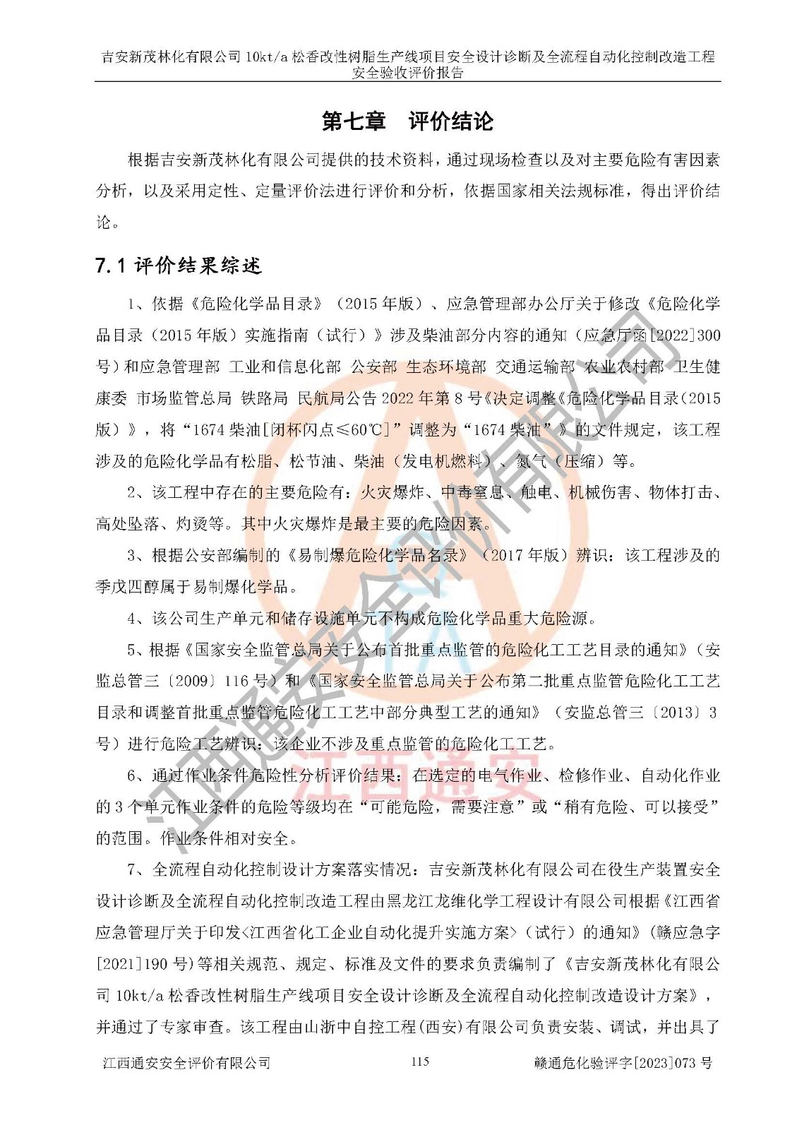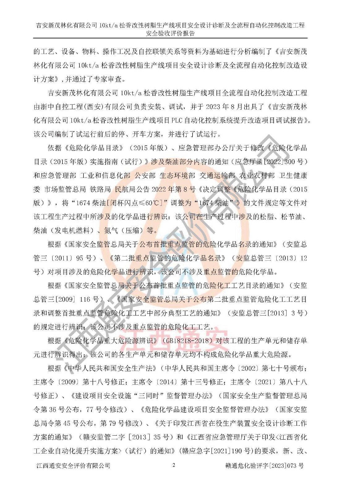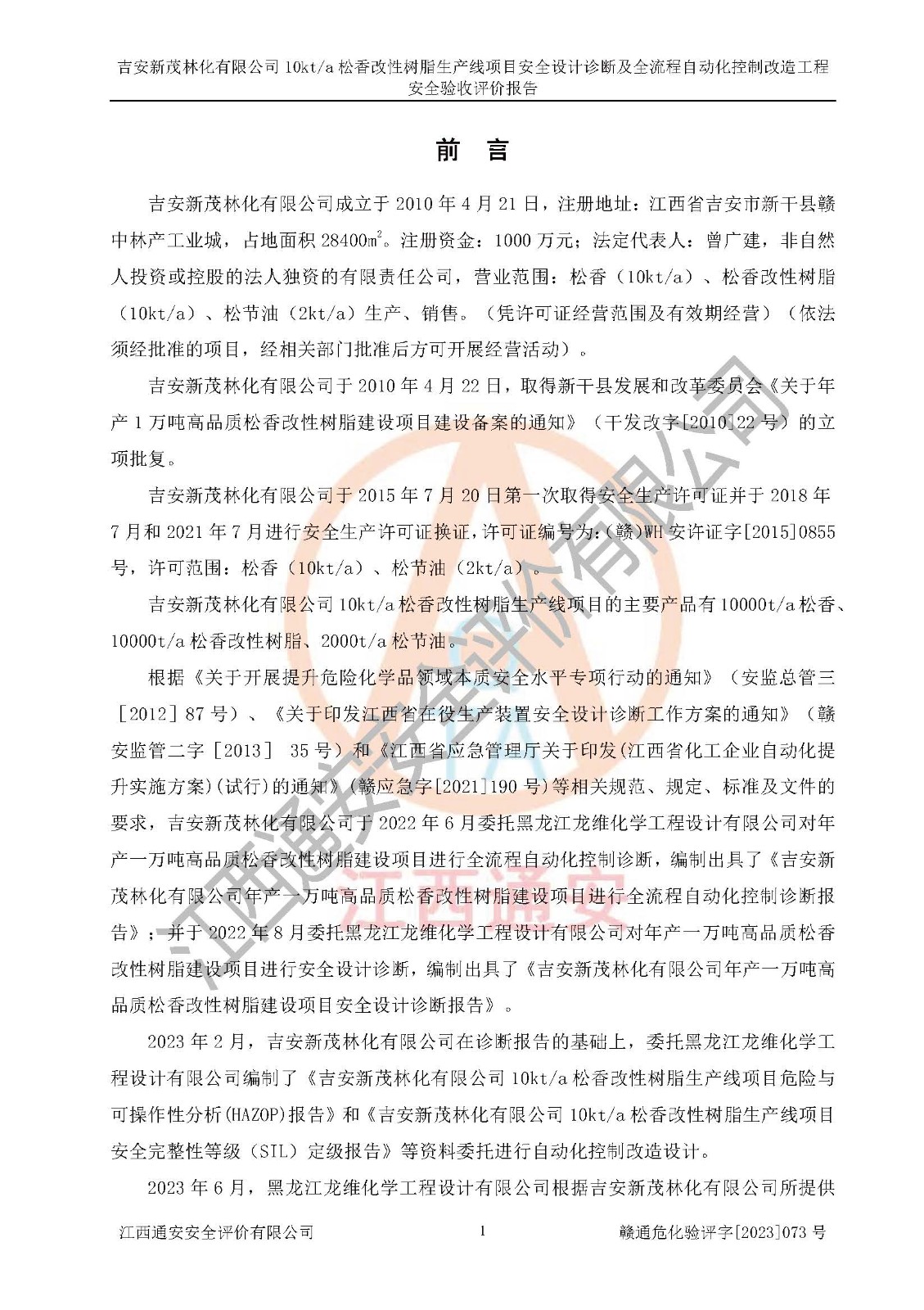 評價(jià)報(bào)告名稱 | 吉安新茂林化有限公司10kta松香改性樹脂生產(chǎn)線項(xiàng)目安全設(shè)計(jì)診斷及全流程自動(dòng)化控制改造工程安全驗(yàn)收評價(jià)報(bào)告 | |||