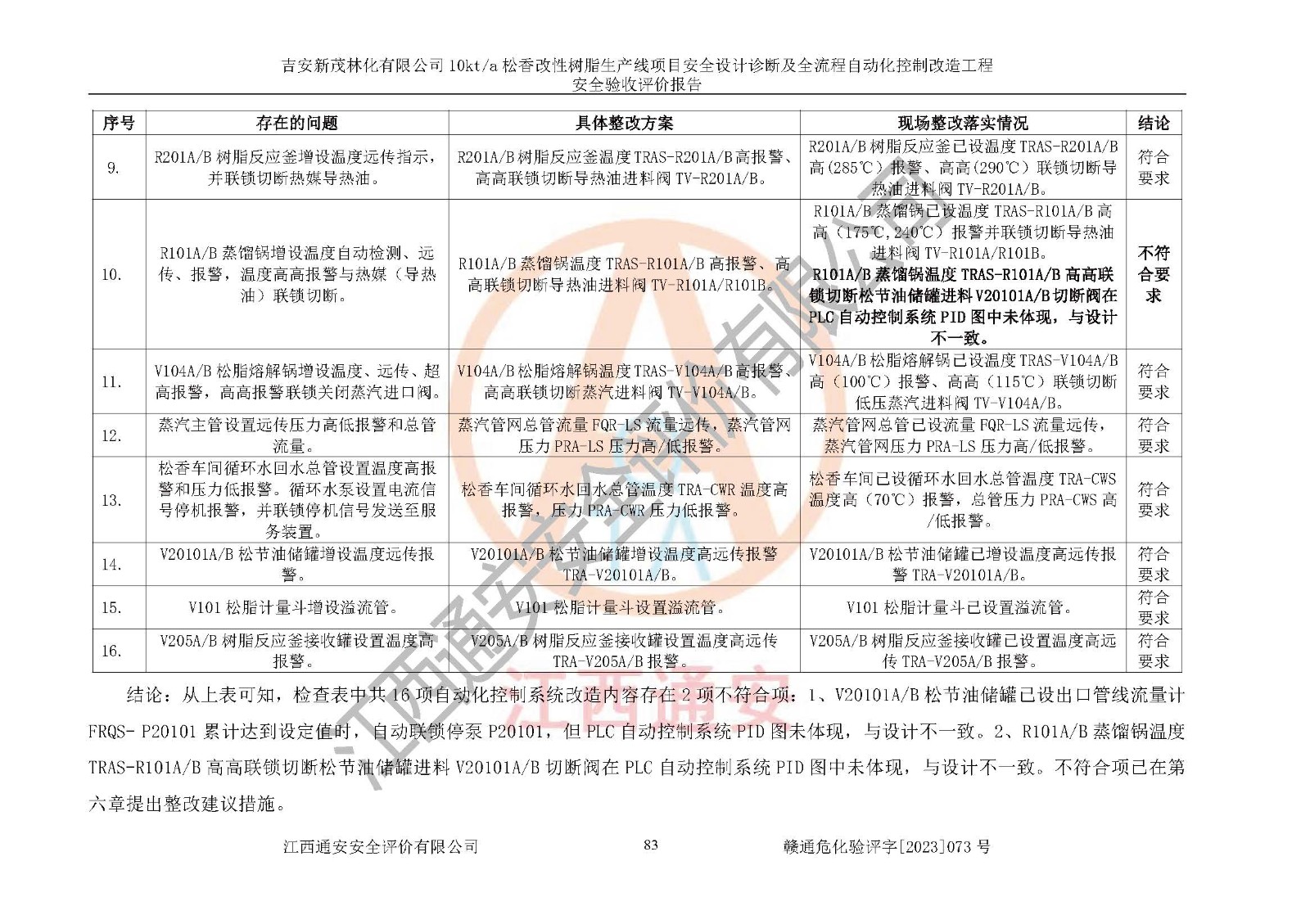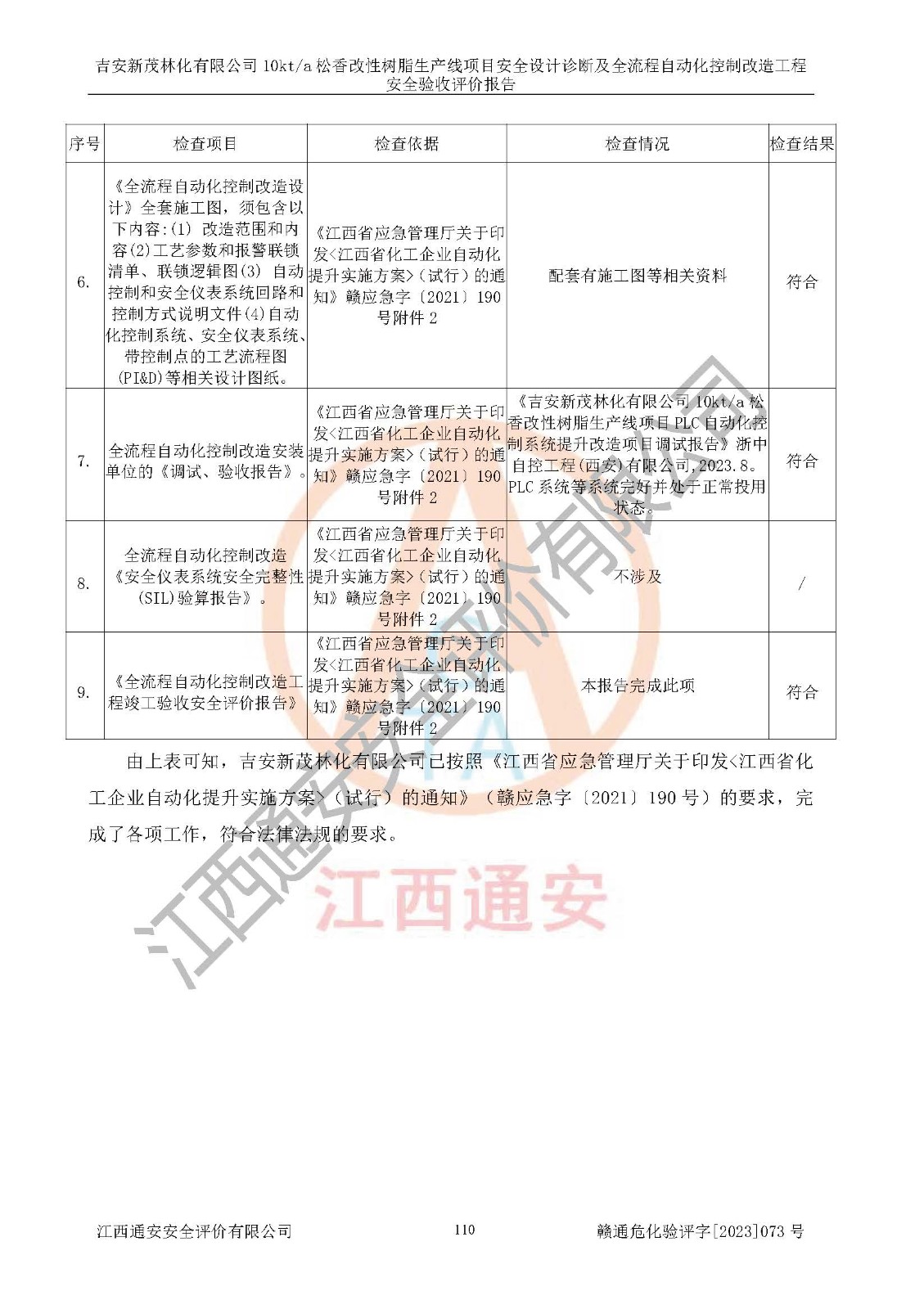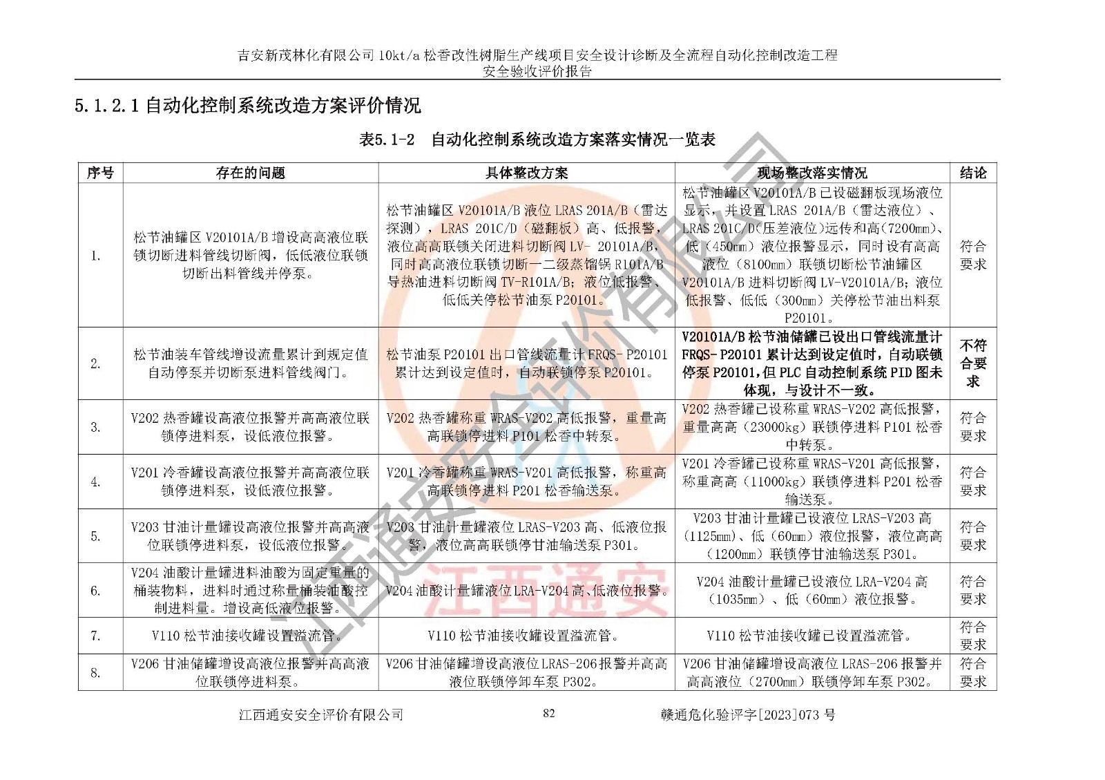 評價(jià)結(jié)論 | 評價(jià)結(jié)論:吉安新茂林化有限公司在役生產(chǎn)裝置安全設(shè)計(jì)診斷及全流程自動(dòng)化控制改造工程設(shè)計(jì)方案中提出的整改和控制措施已得到落實(shí),企業(yè)控制系統(tǒng)設(shè)置情況與設(shè)計(jì)方案一致,由具有**相應(yīng)資質(zhì)的單位進(jìn)行設(shè)計(jì)、施工,施工單位對自動(dòng)控制系統(tǒng)調(diào)試合格,并出具了竣工圖,安全設(shè)施及安全管理符合**及有關(guān)部門關(guān)于安全生產(chǎn)法律、法規(guī)、標(biāo)準(zhǔn)的要求,安全風(fēng)險(xiǎn)程度是可以接受的,安全風(fēng)險(xiǎn)可控,滿足《江西省應(yīng)急管理廳關(guān)于印發(fā)<江西省化工企業(yè)自動(dòng)化提升實(shí)施方案>(試行)的通知》(贛應(yīng)急字[2021]190號)的要求,具備安全設(shè)計(jì)診斷問題整改及全流程自動(dòng)化控制改造工程竣工驗(yàn)收條件。 | |||