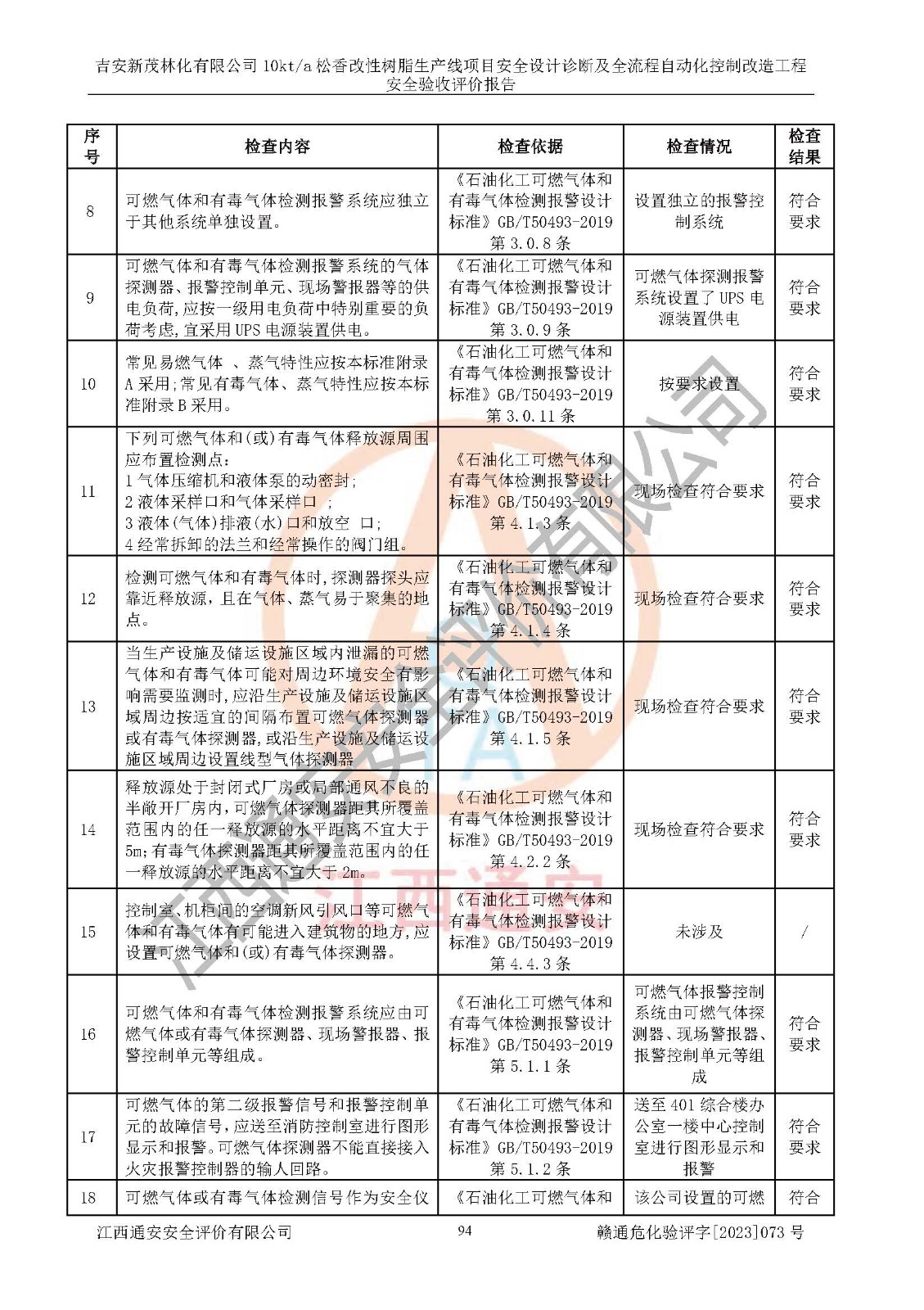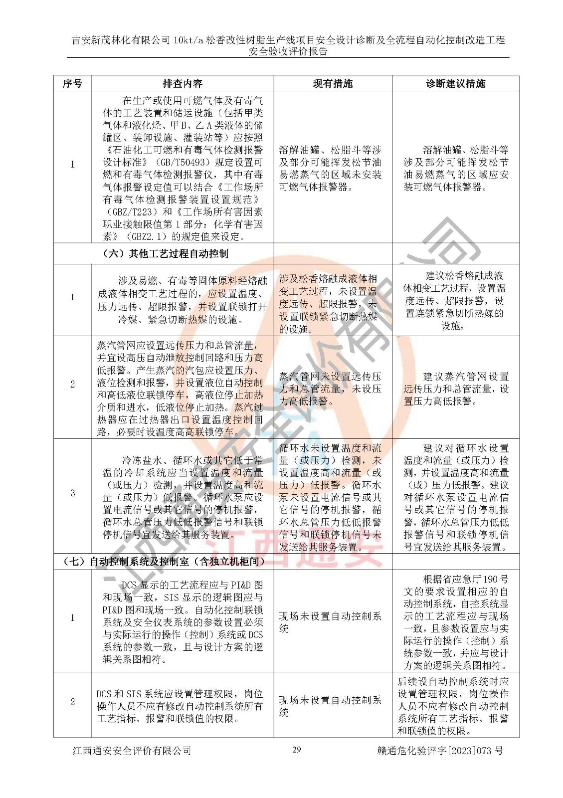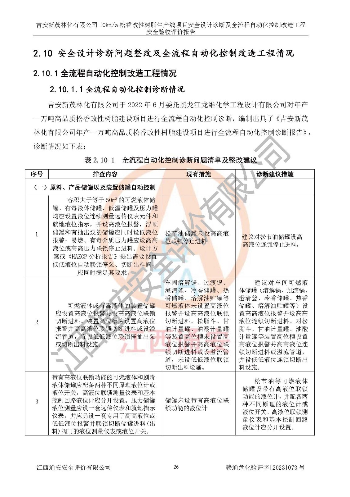 評價(jià)結(jié)論 | 評價(jià)結(jié)論:吉安新茂林化有限公司在役生產(chǎn)裝置安全設(shè)計(jì)診斷及全流程自動(dòng)化控制改造工程設(shè)計(jì)方案中提出的整改和控制措施已得到落實(shí),企業(yè)控制系統(tǒng)設(shè)置情況與設(shè)計(jì)方案一致,由具有**相應(yīng)資質(zhì)的單位進(jìn)行設(shè)計(jì)、施工,施工單位對自動(dòng)控制系統(tǒng)調(diào)試合格,并出具了竣工圖,安全設(shè)施及安全管理符合**及有關(guān)部門關(guān)于安全生產(chǎn)法律、法規(guī)、標(biāo)準(zhǔn)的要求,安全風(fēng)險(xiǎn)程度是可以接受的,安全風(fēng)險(xiǎn)可控,滿足《江西省應(yīng)急管理廳關(guān)于印發(fā)<江西省化工企業(yè)自動(dòng)化提升實(shí)施方案>(試行)的通知》(贛應(yīng)急字[2021]190號)的要求,具備安全設(shè)計(jì)診斷問題整改及全流程自動(dòng)化控制改造工程竣工驗(yàn)收條件。 | |||