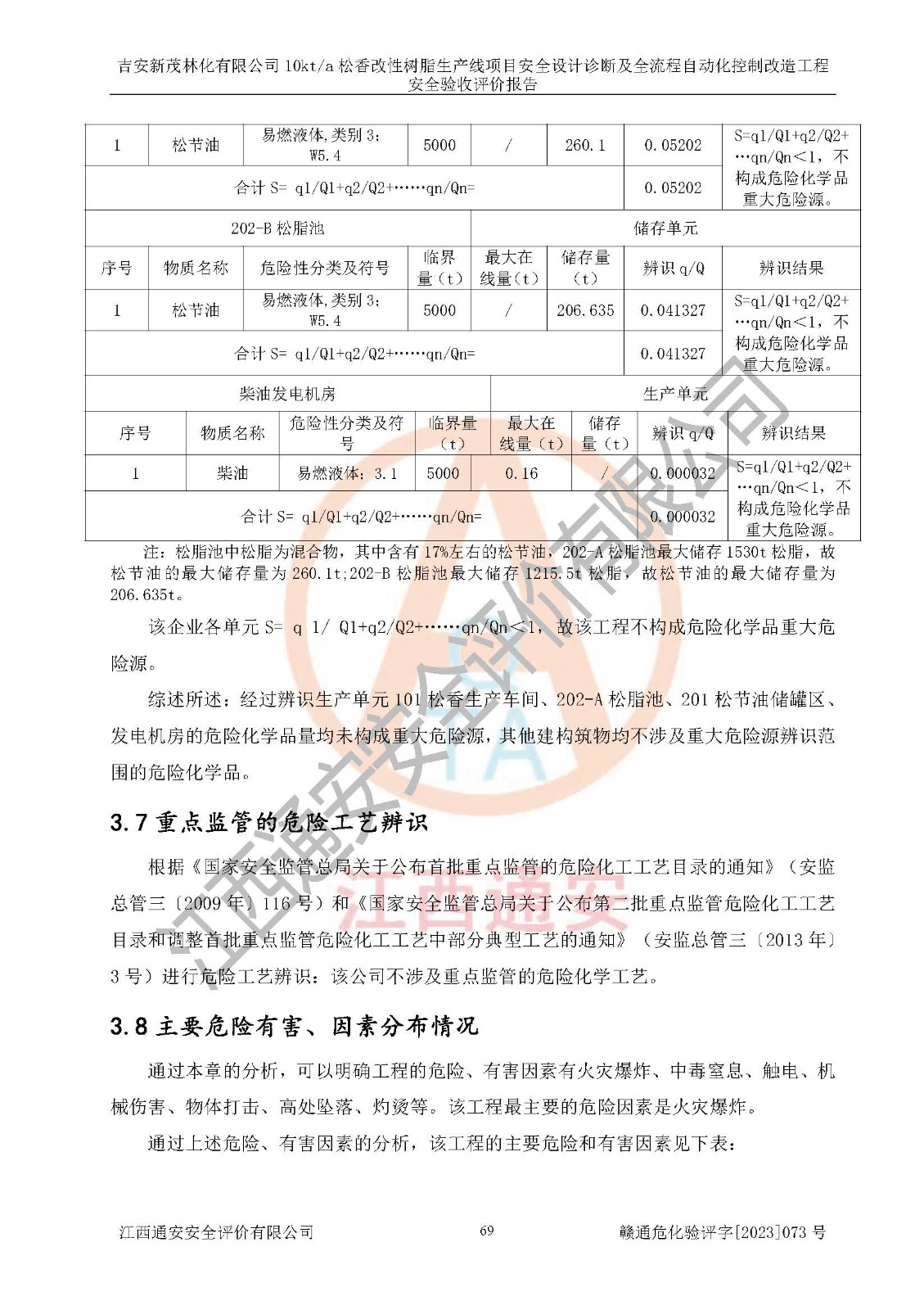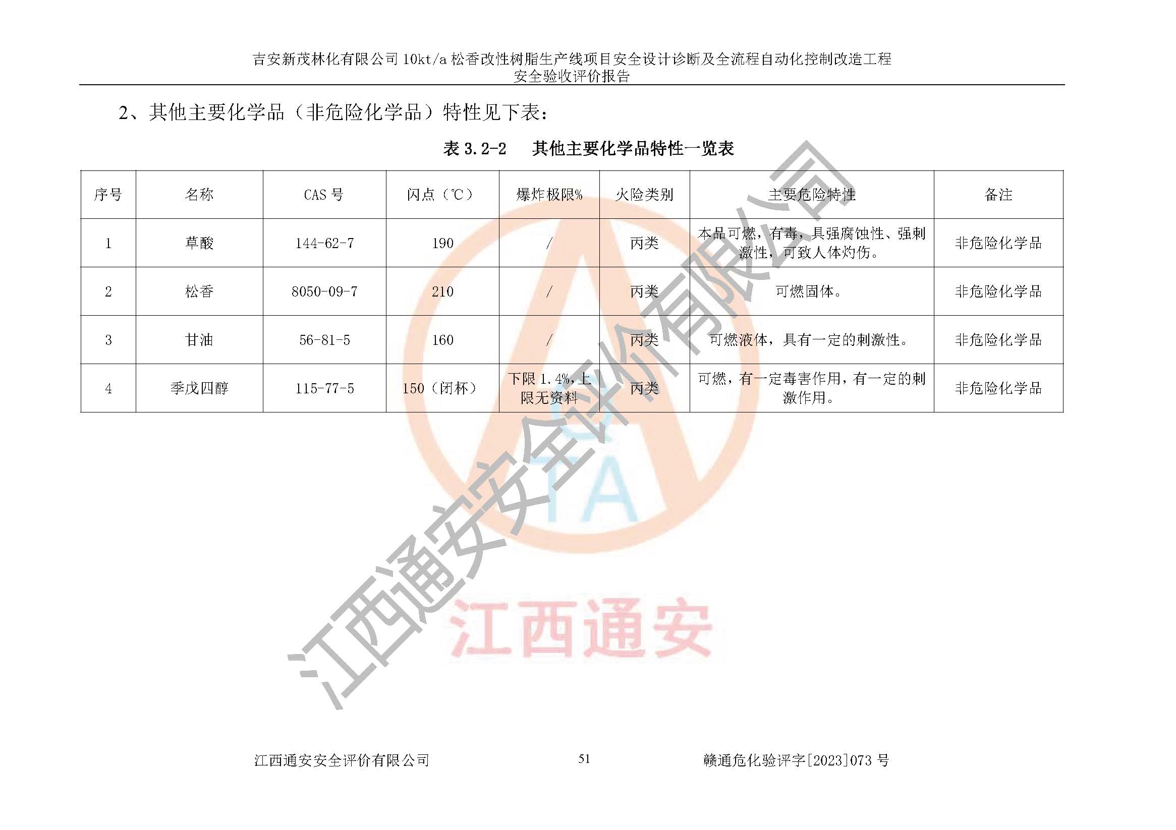 項(xiàng)目簡介 | 吉安新茂林化有限公司成立于2010年4月21日,注冊地址:江西省吉安市新干縣贛中林產(chǎn)工業(yè)城,占地面積28400m2。注冊資金:1000萬元;法定**人:曾廣建,非自然人投資或控股的法人獨(dú)資的有限責(zé)任公司,營業(yè)范圍:松香(10kt/a)、松香改性樹脂(10kt/a)、松節(jié)油(2kt/a)生產(chǎn)、銷售。(憑許可證經(jīng)營范圍及**期經(jīng)營)(依法須經(jīng)批準(zhǔn)的項(xiàng)目,經(jīng)相關(guān)部門批準(zhǔn)后方可開展經(jīng)營活動(dòng))。 吉安新茂林化有限公司于2010年4月22日,取得新干縣發(fā)展和改革委員會(huì)《關(guān)于年產(chǎn)1萬噸高品質(zhì)松香改性樹脂建設(shè)項(xiàng)目建設(shè)備案的通知》(干發(fā)改字[2010]22號)的立項(xiàng)批復(fù)。 吉安新茂林化有限公司于2015年7月20日**次取得安全生產(chǎn)許可證并于2018年7月和2021年7月進(jìn)行安全生產(chǎn)許可證換證,許可證編號為:(贛)WH安許證字[2015]0855號,許可范圍:松香(10kt/a)、松節(jié)油(2kt/a)。 吉安新茂林化有限公司10kt/a松香改性樹脂生產(chǎn)線項(xiàng)目的主要產(chǎn)品有10000t/a松香、10000t/a松香改性樹脂、2000t/a松節(jié)油。 根據(jù)《關(guān)于開展提升危險(xiǎn)化學(xué)品領(lǐng)域本質(zhì)安全水平專項(xiàng)行動(dòng)的通知》(安監(jiān)總管三[2012]87號)、《關(guān)于印發(fā)江西省在役生產(chǎn)裝置安全設(shè)計(jì)診斷工作方案的通知》(贛安監(jiān)管二字[2013] 35號)和《江西省應(yīng)急管理廳關(guān)于印發(fā)(江西省化工企業(yè)自動(dòng)化提升實(shí)施方案)(試行)的通知》(贛應(yīng)急字[2021]190號)等相關(guān)規(guī)范、規(guī)定、標(biāo)準(zhǔn)及文件的要求,吉安新茂林化有限公司于2022年6月委托黑龍江龍維化學(xué)工程設(shè)計(jì)有限公司對年產(chǎn)一萬噸高品質(zhì)松香改性樹脂建設(shè)項(xiàng)目進(jìn)行全流程自動(dòng)化控制診斷,編制出具了《吉安新茂林化有限公司年產(chǎn)一萬噸高品質(zhì)松香改性樹脂建設(shè)項(xiàng)目進(jìn)行全流程自動(dòng)化控制診斷報(bào)告》;并于2022年8月委托黑龍江龍維化學(xué)工程設(shè)計(jì)有限公司對 年產(chǎn)一萬噸高品質(zhì)松香改性樹脂建設(shè)項(xiàng)目進(jìn)行安全設(shè)計(jì)診斷,編制出具了《吉安新茂林化有限公司年產(chǎn)一萬噸高品質(zhì)松香改性樹脂建設(shè)項(xiàng)目安全設(shè)計(jì)診斷報(bào)告》。 2023年2月,吉安新茂林化有限公司在診斷報(bào)告的基礎(chǔ)上,委托黑龍江龍維化學(xué)工程設(shè)計(jì)有限公司編制了《吉安新茂林化有限公司10kt/a松香改性樹脂生產(chǎn)線項(xiàng)目危險(xiǎn)與可操作性分析(HAZOP)報(bào)告》和《吉安新茂林化有限公司10kt/a松香改性樹脂生產(chǎn)線項(xiàng)目安全完整性等級(SIL)定級報(bào)告》等資料委托進(jìn)行自動(dòng)化控制改造設(shè)計(jì)。 2023年6月,黑龍江龍維化學(xué)工程設(shè)計(jì)有限公司根據(jù)吉安新茂林化有限公司所提供的工藝、設(shè)備、物料、操作工況及自控聯(lián)鎖關(guān)系等資料為基礎(chǔ)進(jìn)行分析編制了《吉安新茂林化有限公司10kt/a松香改性樹脂生產(chǎn)線項(xiàng)目安全設(shè)計(jì)診斷及全流程自動(dòng)化控制改造設(shè)計(jì)方案》,并通過了專家審查。 吉安新茂林化有限公司10kt/a松香改性樹脂生產(chǎn)線項(xiàng)目全流程自動(dòng)化控制改造工程由浙中自控工程(西安)有限公司負(fù)責(zé)安裝、調(diào)試,并于2023年8月出具了《吉安新茂林化有限公司10kt/a松香改性樹脂生產(chǎn)線項(xiàng)目PLC自動(dòng)化控制系統(tǒng)提升改造項(xiàng)目調(diào)試報(bào)告》。該公司編制了試運(yùn)行前后的停、開車方案,并進(jìn)行了試運(yùn)行。 依據(jù)《危險(xiǎn)化學(xué)品目錄》(2015年版)、應(yīng)急管理部辦公廳關(guān)于修改《危險(xiǎn)化學(xué)品目錄(2015年版)實(shí)施指南(試行)》涉及柴油部分內(nèi)容的通知(應(yīng)急廳函[2022]300號)和應(yīng)急管理部 工業(yè)和信息化部 公安部 生態(tài)環(huán)境部 交通運(yùn)輸部 農(nóng)業(yè)農(nóng)村部 衛(wèi)生健康委 市場監(jiān)管總局 鐵路局 民航局公告2022年第8號《決定調(diào)整《危險(xiǎn)化學(xué)品目錄(2015版)》,將“1674柴油[閉杯閃點(diǎn)≤60℃]”調(diào)整為“1674柴油”》的文件規(guī)定等文件對該工程生產(chǎn)過程中所涉及的化學(xué)品進(jìn)行辨識:該公司在生產(chǎn)過程中涉及的松脂、松節(jié)油、柴油(發(fā)電機(jī)燃料)、氮?dú)猓▔嚎s)等。 根據(jù)《**安全監(jiān)管總局關(guān)于公布首批重點(diǎn)監(jiān)管的危險(xiǎn)化學(xué)品名錄的通知》(安監(jiān)總管三〔2011〕95號)、《第二批重點(diǎn)監(jiān)管的危險(xiǎn)化學(xué)品名錄》(安監(jiān)總管三〔2013〕12號)對項(xiàng)目涉及的危險(xiǎn)化學(xué)品進(jìn)行辨識,該公司不涉及重點(diǎn)監(jiān)管的危險(xiǎn)化學(xué)品。 根據(jù)《**安全監(jiān)管總局關(guān)于公布首批重點(diǎn)監(jiān)管的危險(xiǎn)化工工藝目錄的通知》(安監(jiān)總管三[2009] 116號)、《**安全監(jiān)管總局關(guān)于公布第二批重點(diǎn)監(jiān)管危險(xiǎn)化工工藝目錄和調(diào)整首批重點(diǎn)監(jiān)管危險(xiǎn)化工工藝中部分典型