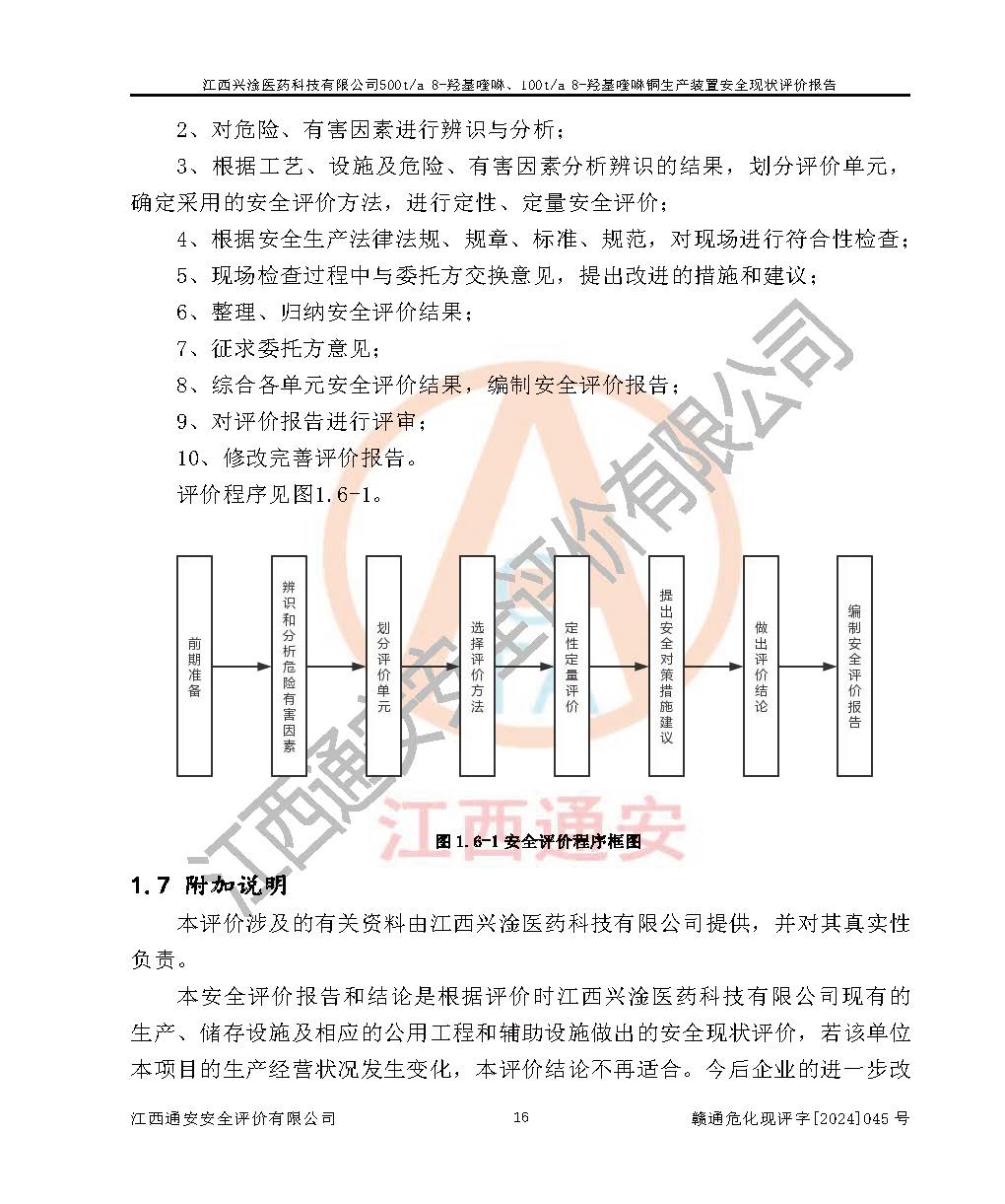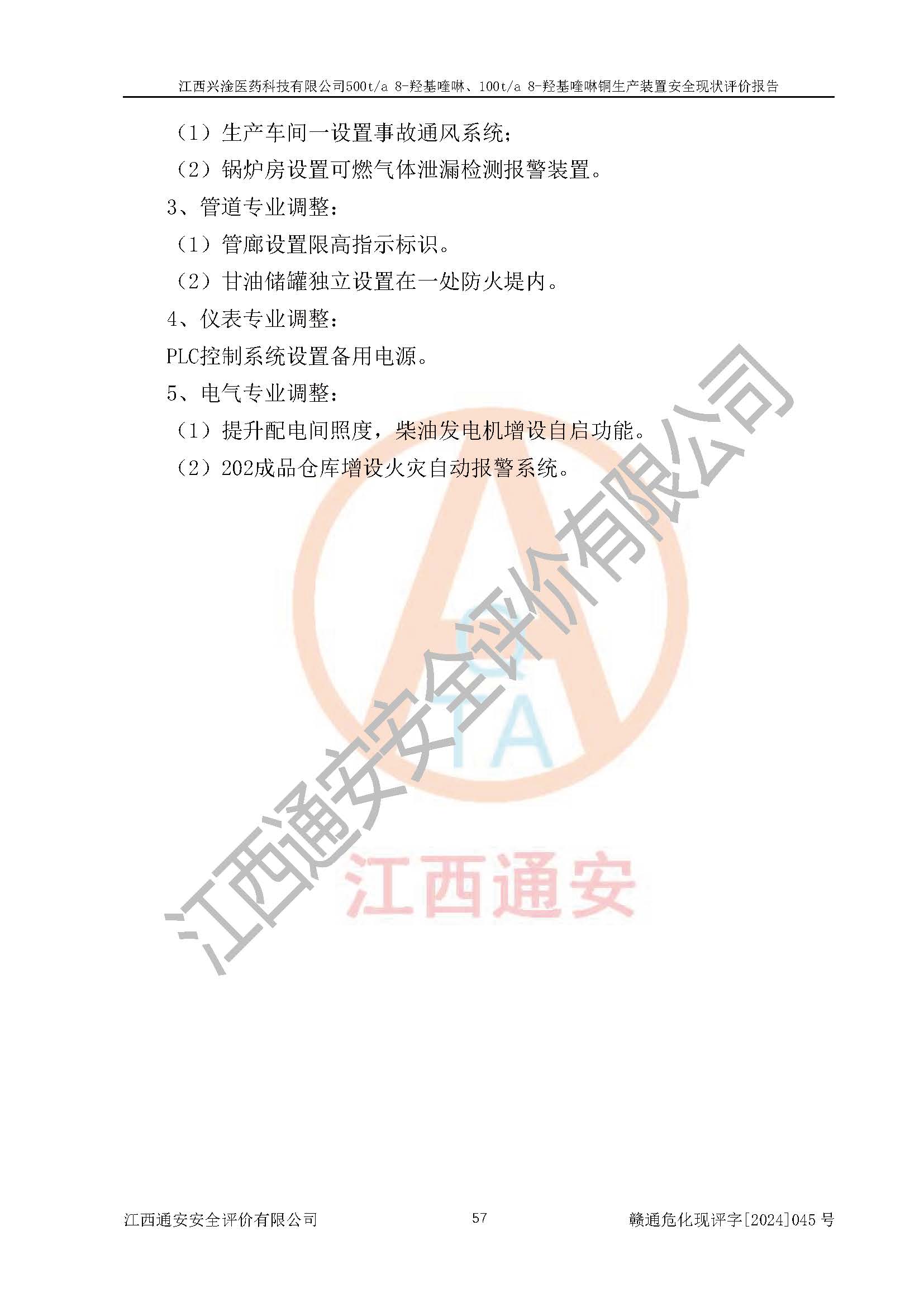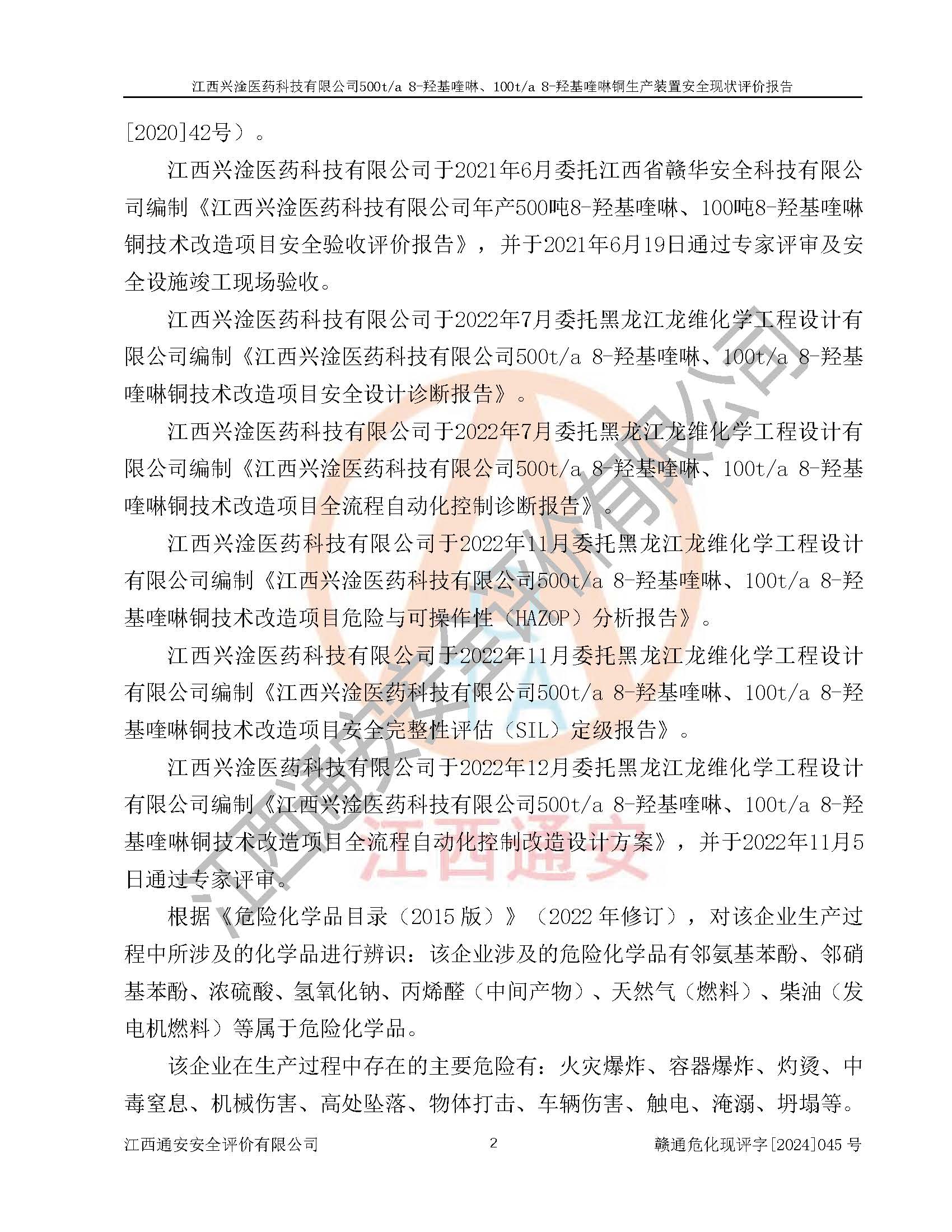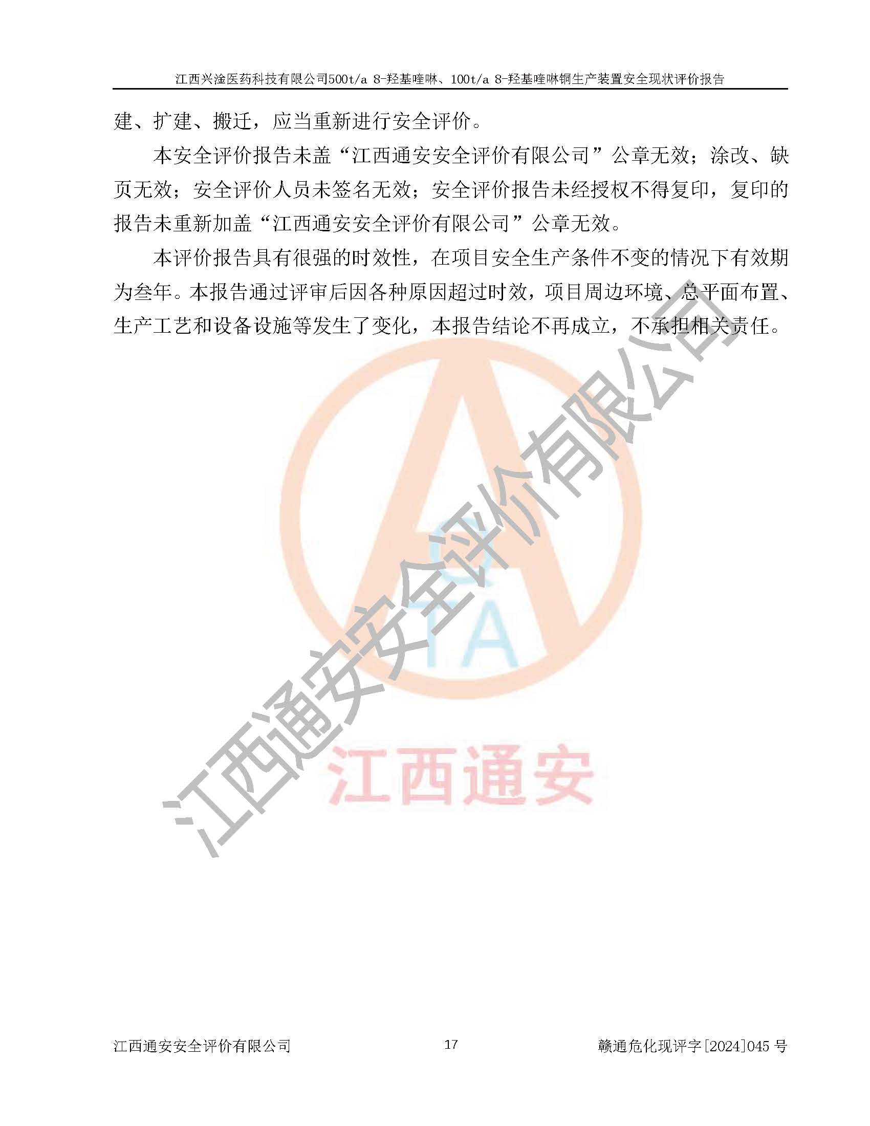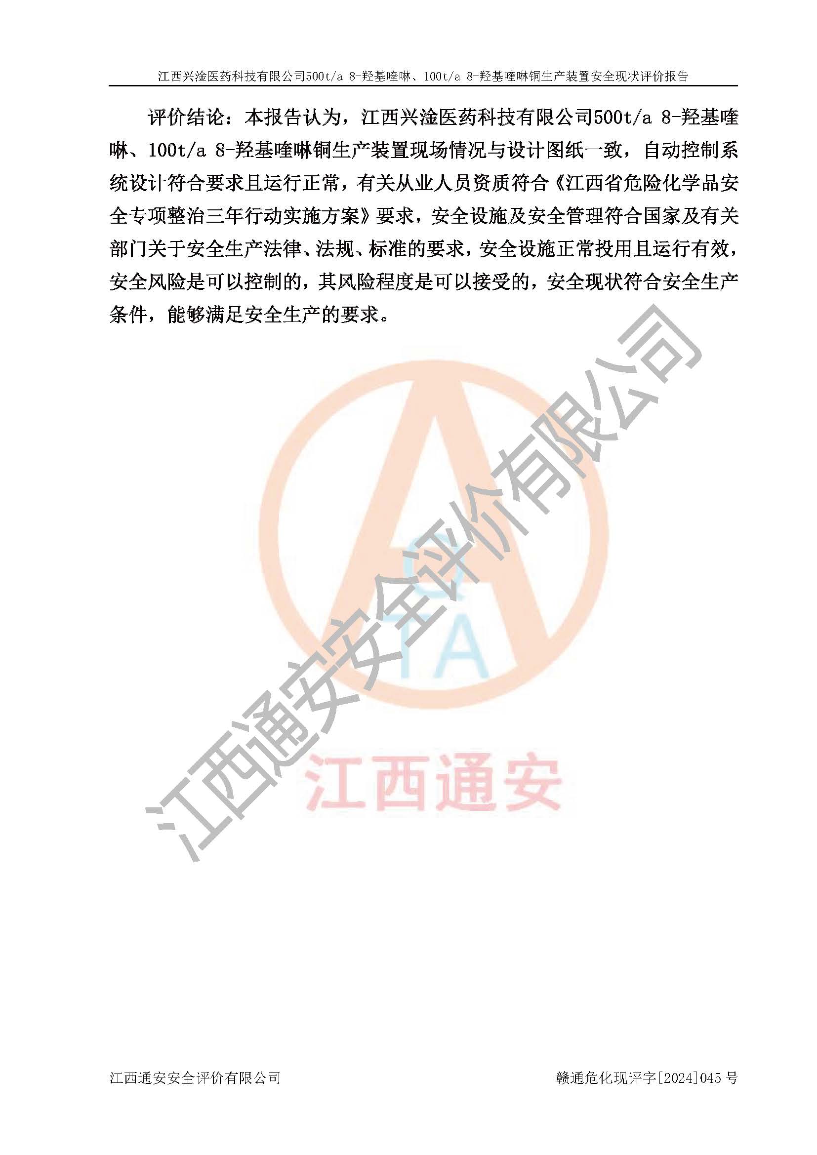評價報告名稱 | 江西興淦醫(yī)藥科技有限公司500ta 8-羥基喹啉、100ta 8-羥基喹啉銅生產(chǎn)裝置安全現(xiàn)狀評價報告 | |||