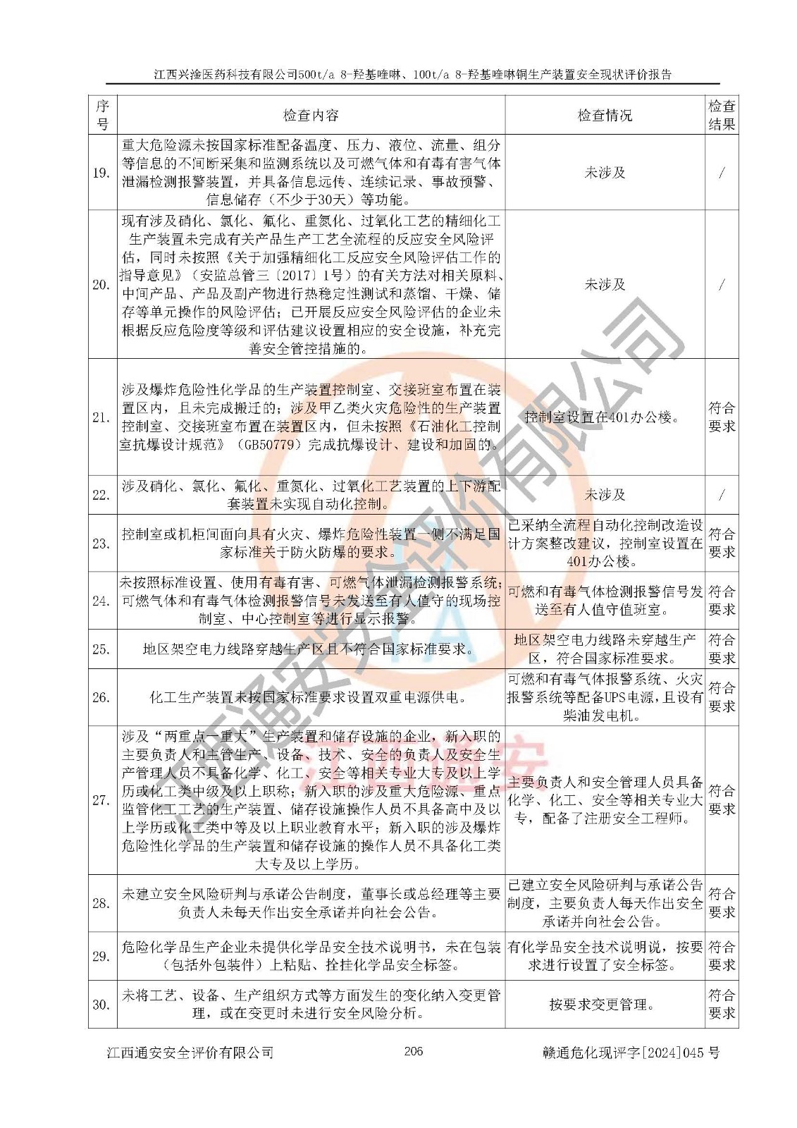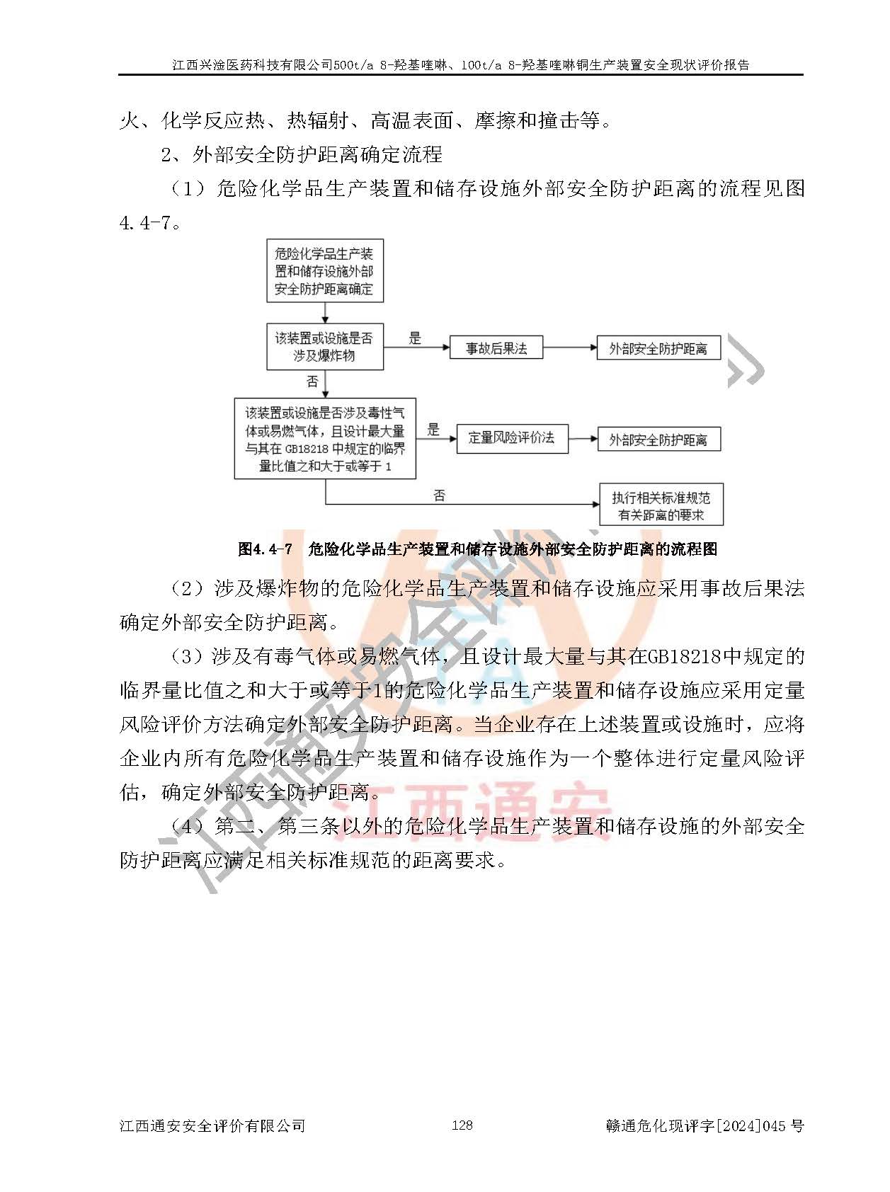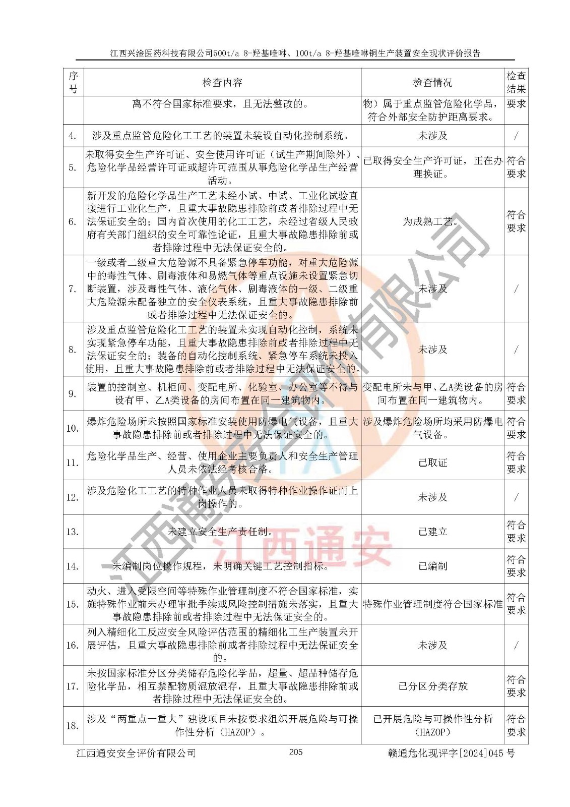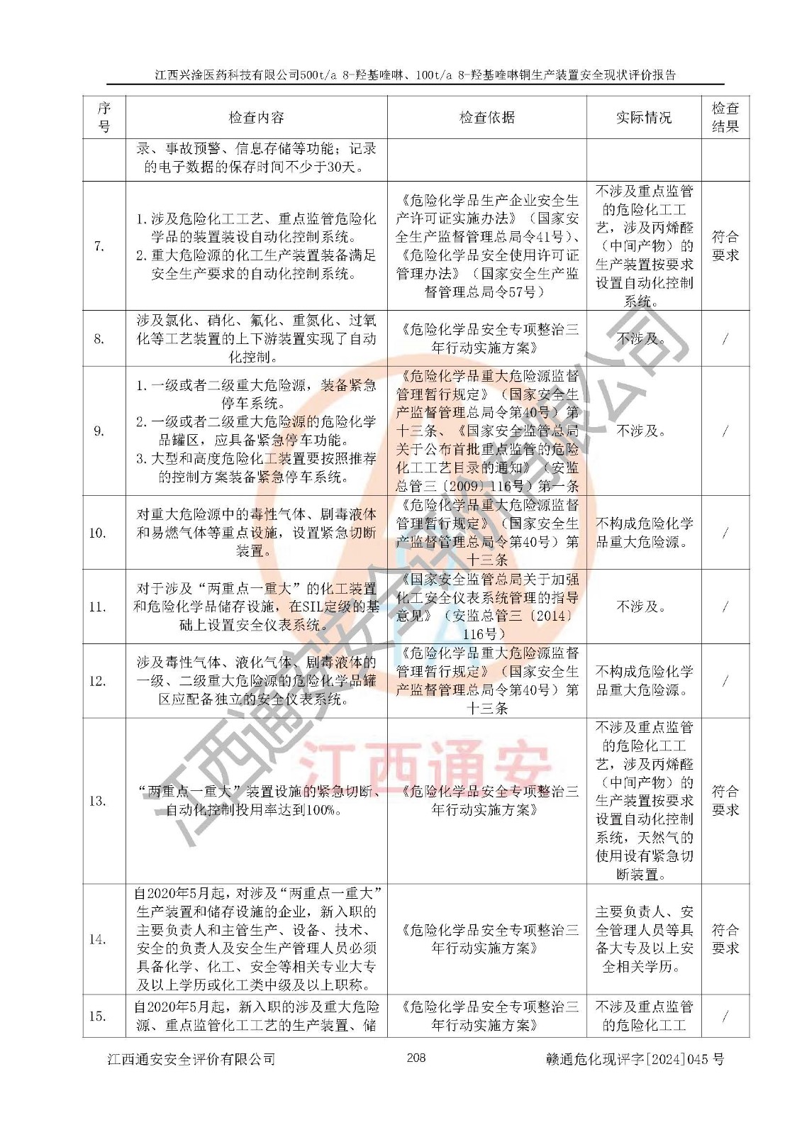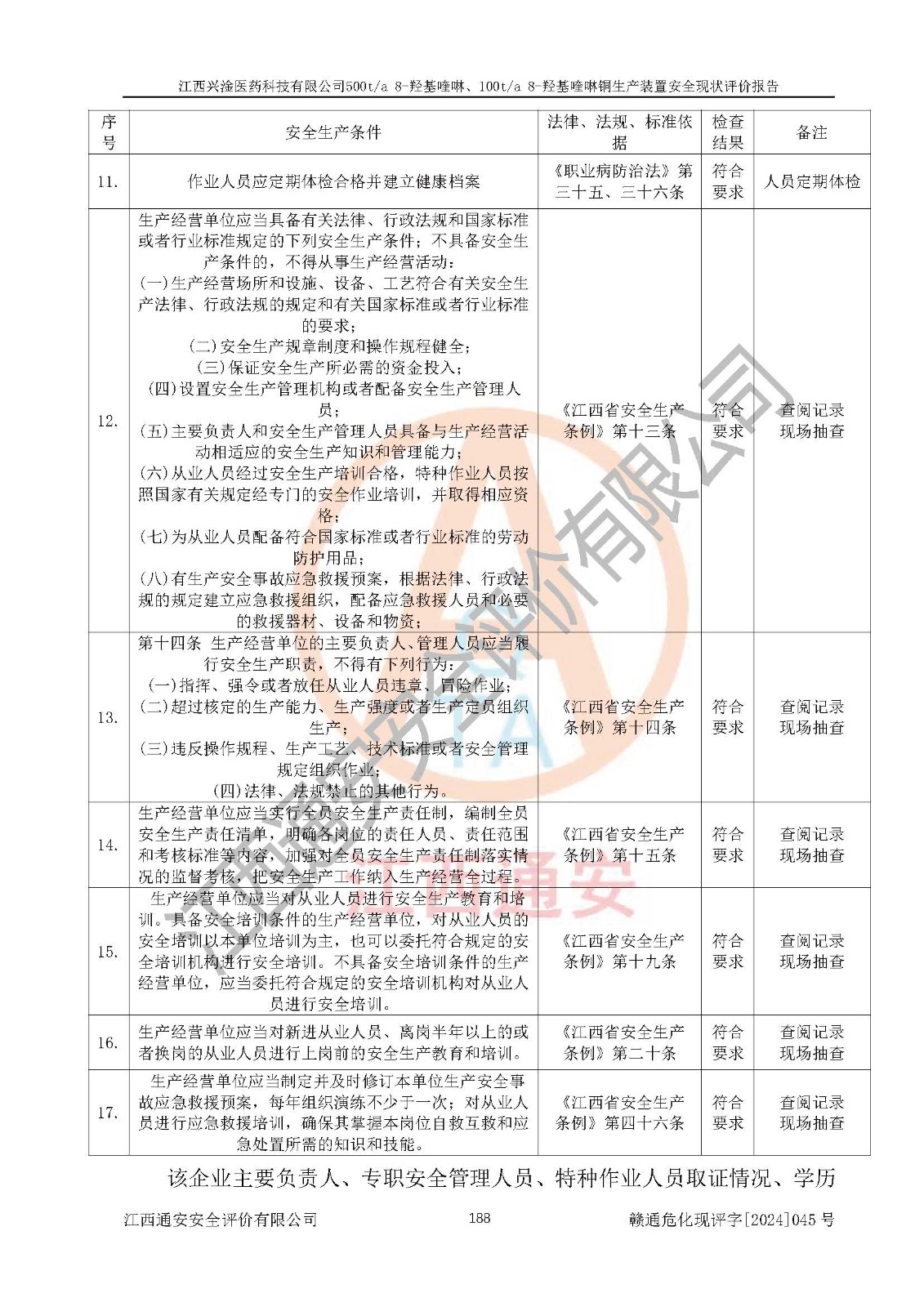 評價結(jié)論 | 評價結(jié)論:本報告認(rèn)為,江西興淦醫(yī)藥科技有限公司500t/a 8-羥基喹啉、100t/a 8-羥基喹啉銅生產(chǎn)裝置現(xiàn)場情況與設(shè)計圖紙一致,自動控制系統(tǒng)設(shè)計符合要求且運行正常,有關(guān)從業(yè)人員資質(zhì)符合《江西省危險化學(xué)品安全專項整治三年行動實施方案》要求,安全設(shè)施及安全管理符合**及有關(guān)部門關(guān)于安全生產(chǎn)法律、法規(guī)、標(biāo)準(zhǔn)的要求,安全設(shè)施正常投用且運行**,安全風(fēng)險是可以控制的,其風(fēng)險程度是可以接受的,安全現(xiàn)狀符合安全生產(chǎn)條件,能夠滿足安全生產(chǎn)的要求。 | |||