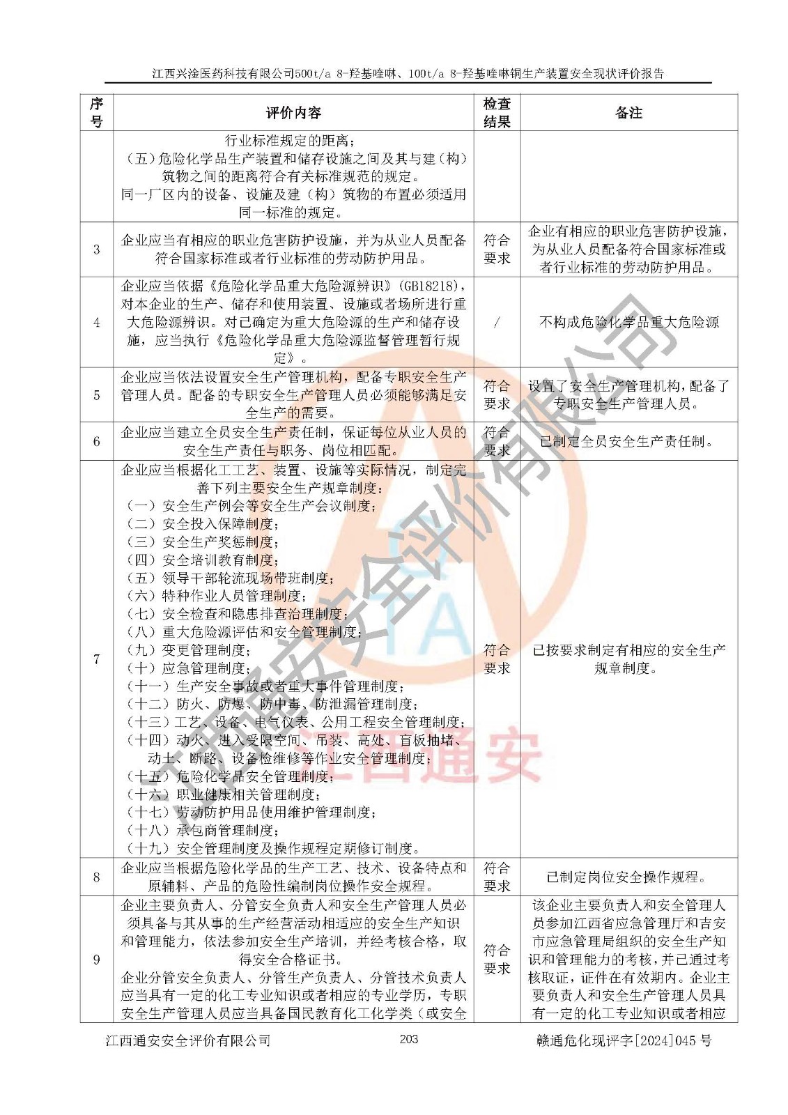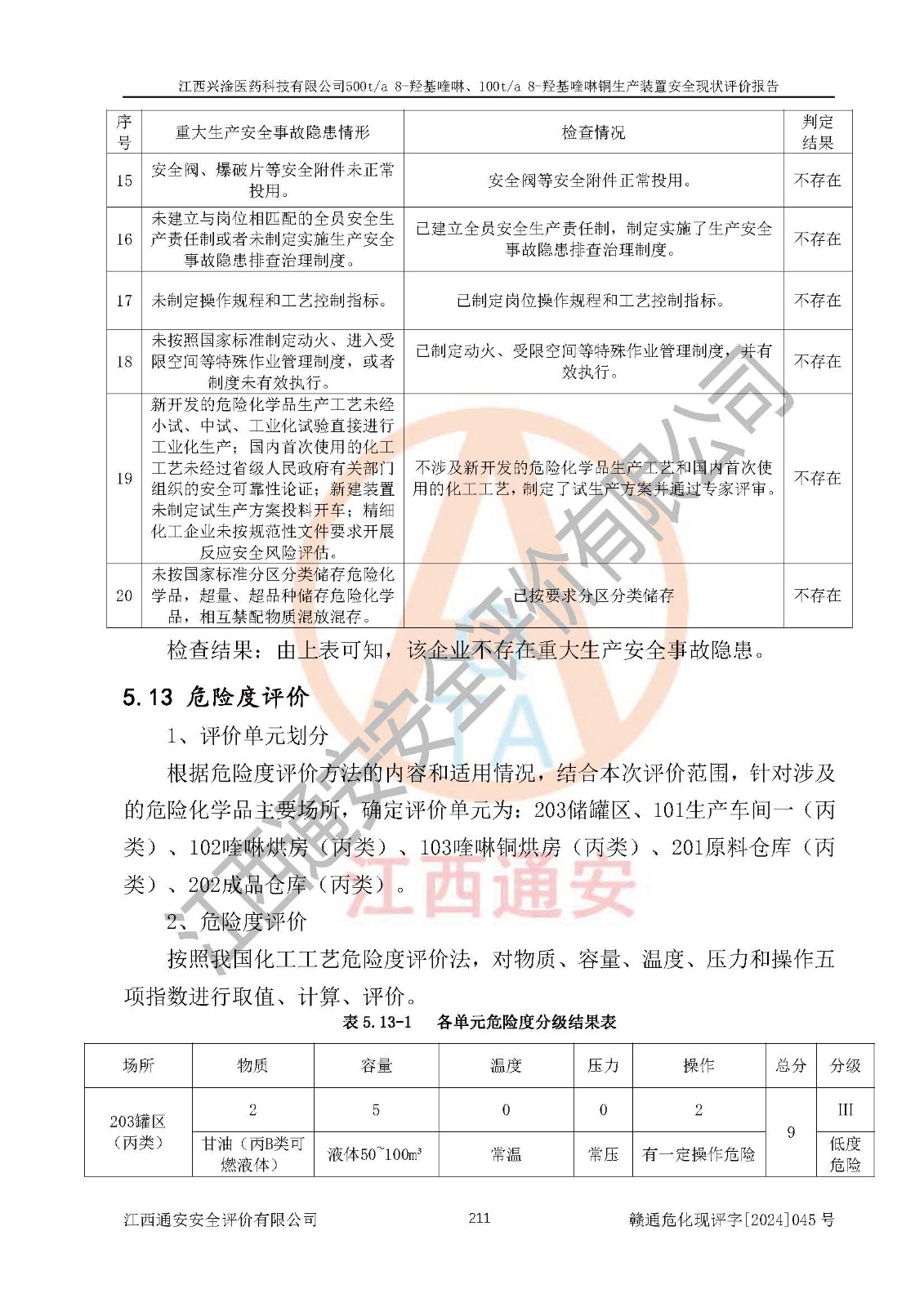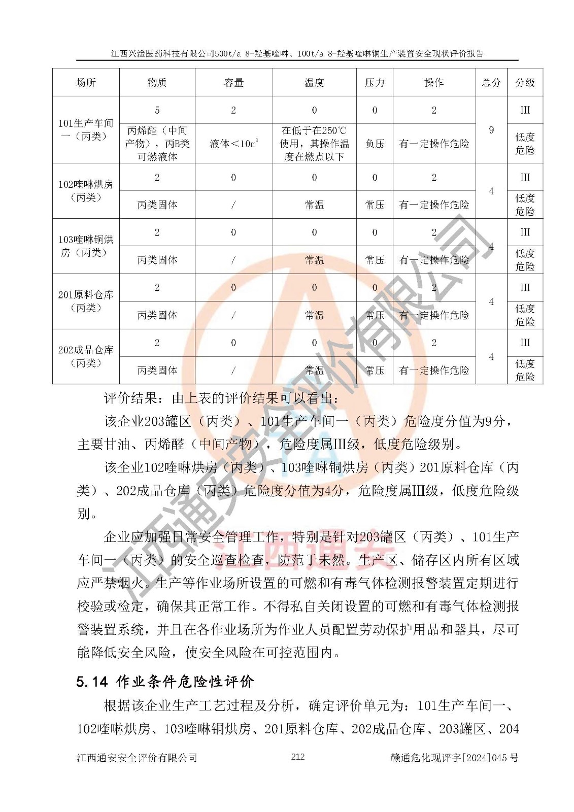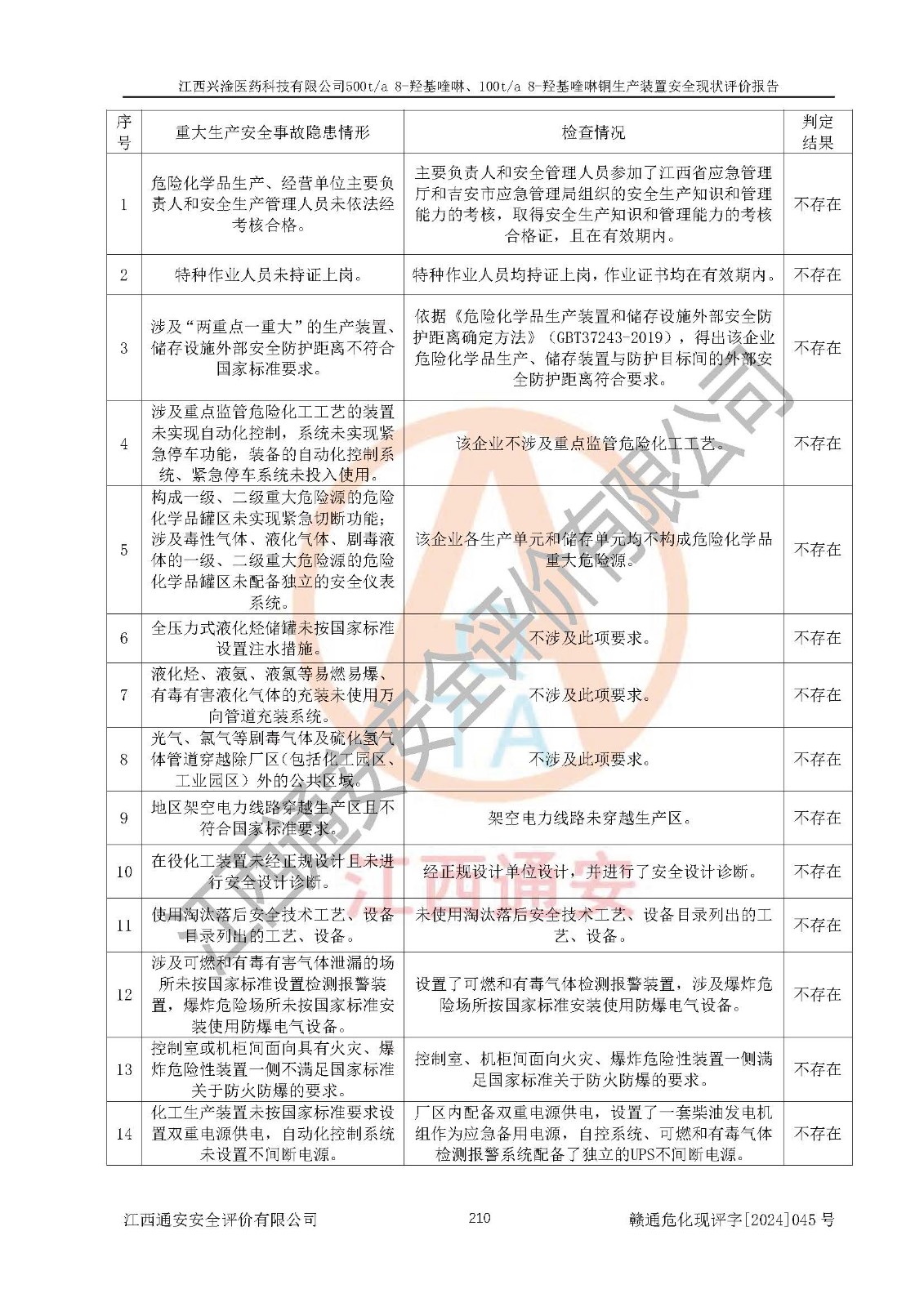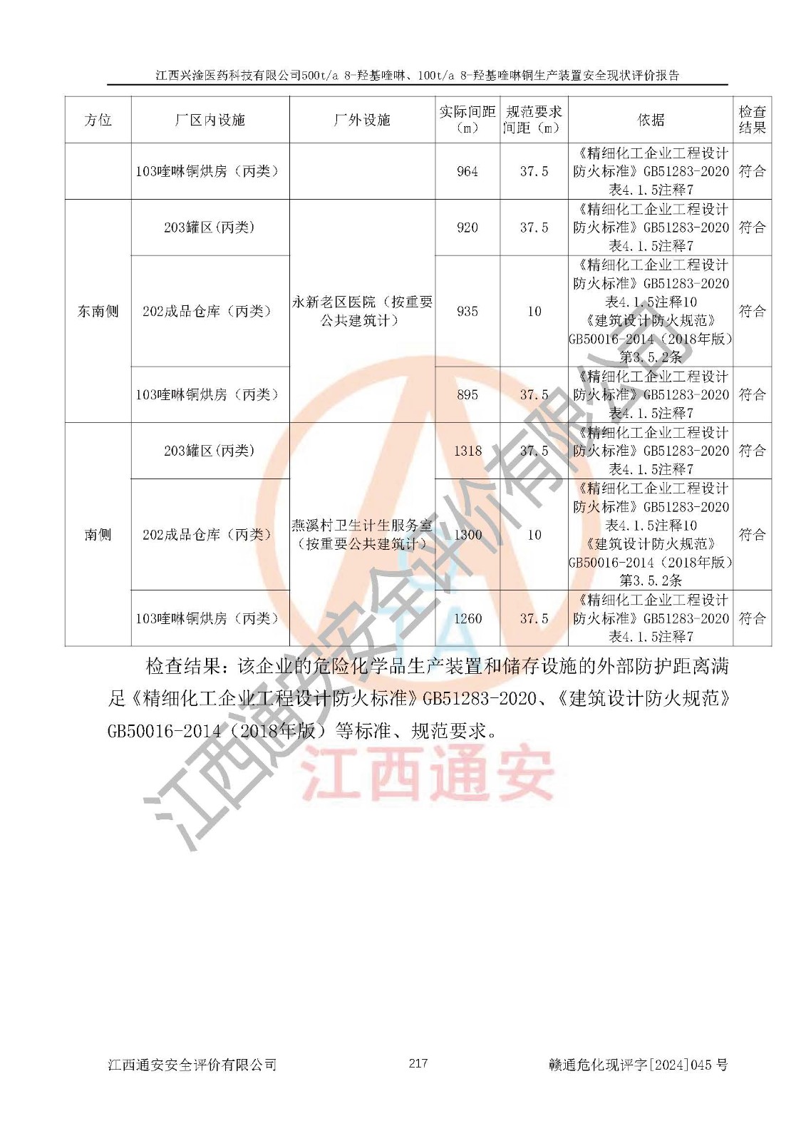 評價結(jié)論 | 評價結(jié)論:本報告認(rèn)為,江西興淦醫(yī)藥科技有限公司500t/a 8-羥基喹啉、100t/a 8-羥基喹啉銅生產(chǎn)裝置現(xiàn)場情況與設(shè)計圖紙一致,自動控制系統(tǒng)設(shè)計符合要求且運行正常,有關(guān)從業(yè)人員資質(zhì)符合《江西省危險化學(xué)品安全專項整治三年行動實施方案》要求,安全設(shè)施及安全管理符合**及有關(guān)部門關(guān)于安全生產(chǎn)法律、法規(guī)、標(biāo)準(zhǔn)的要求,安全設(shè)施正常投用且運行**,安全風(fēng)險是可以控制的,其風(fēng)險程度是可以接受的,安全現(xiàn)狀符合安全生產(chǎn)條件,能夠滿足安全生產(chǎn)的要求。 | |||