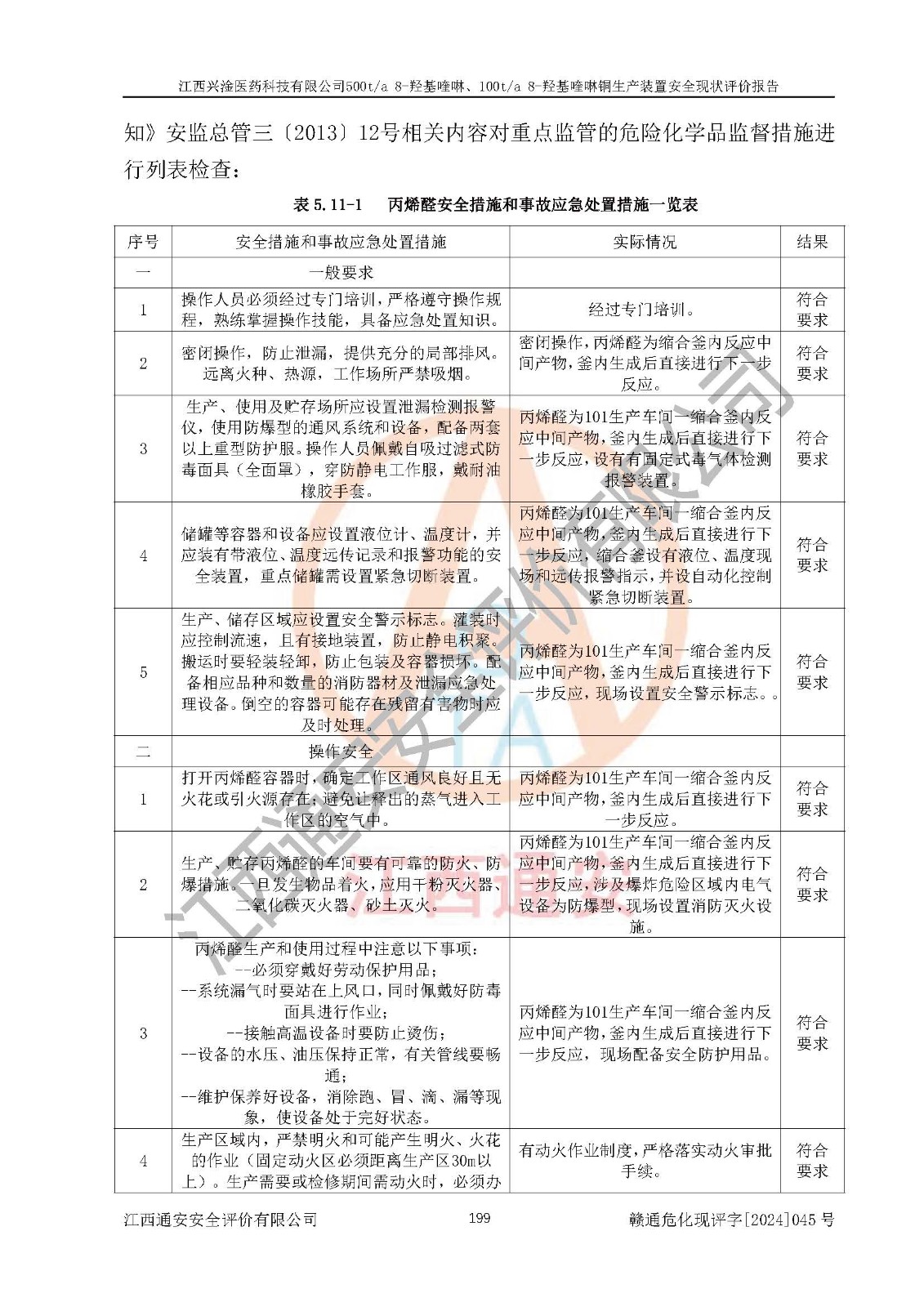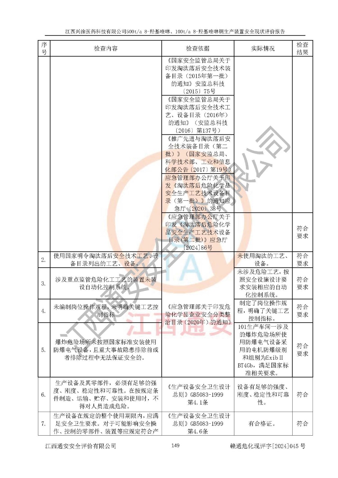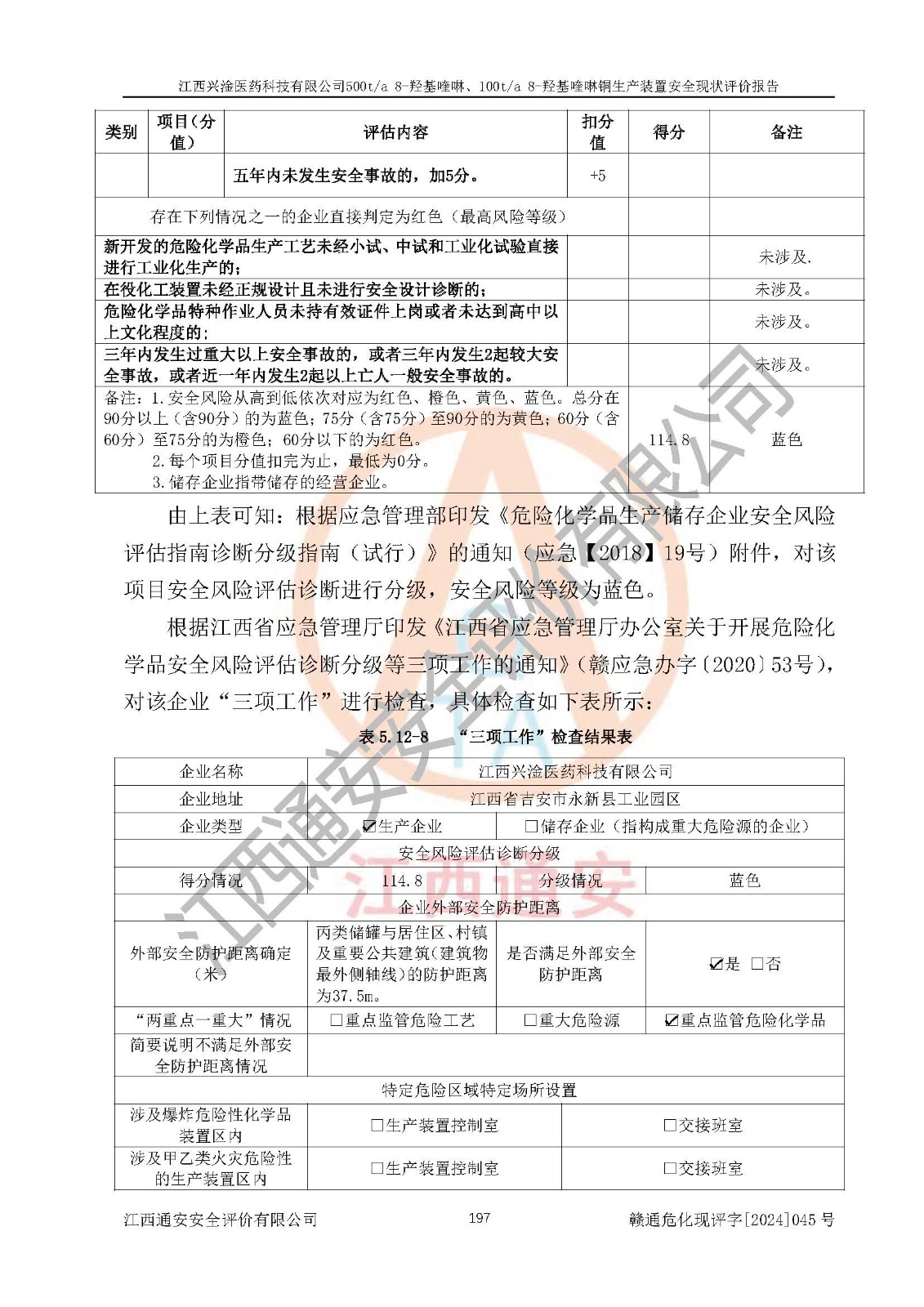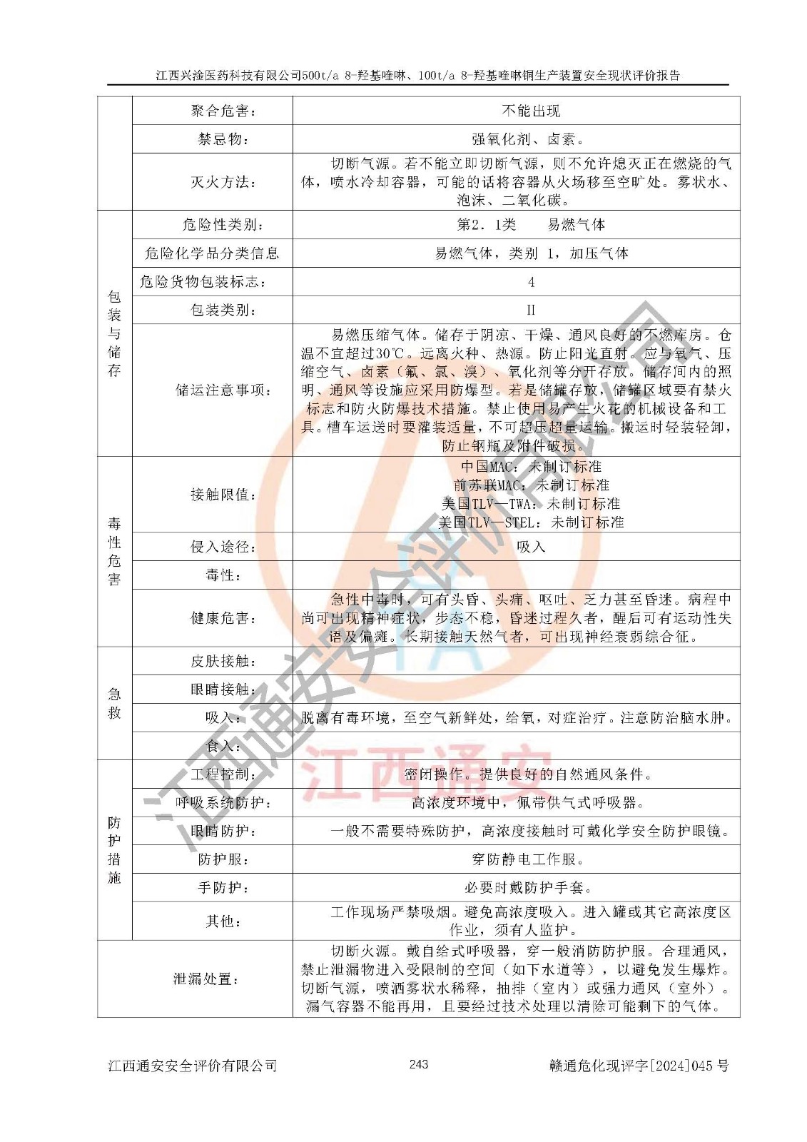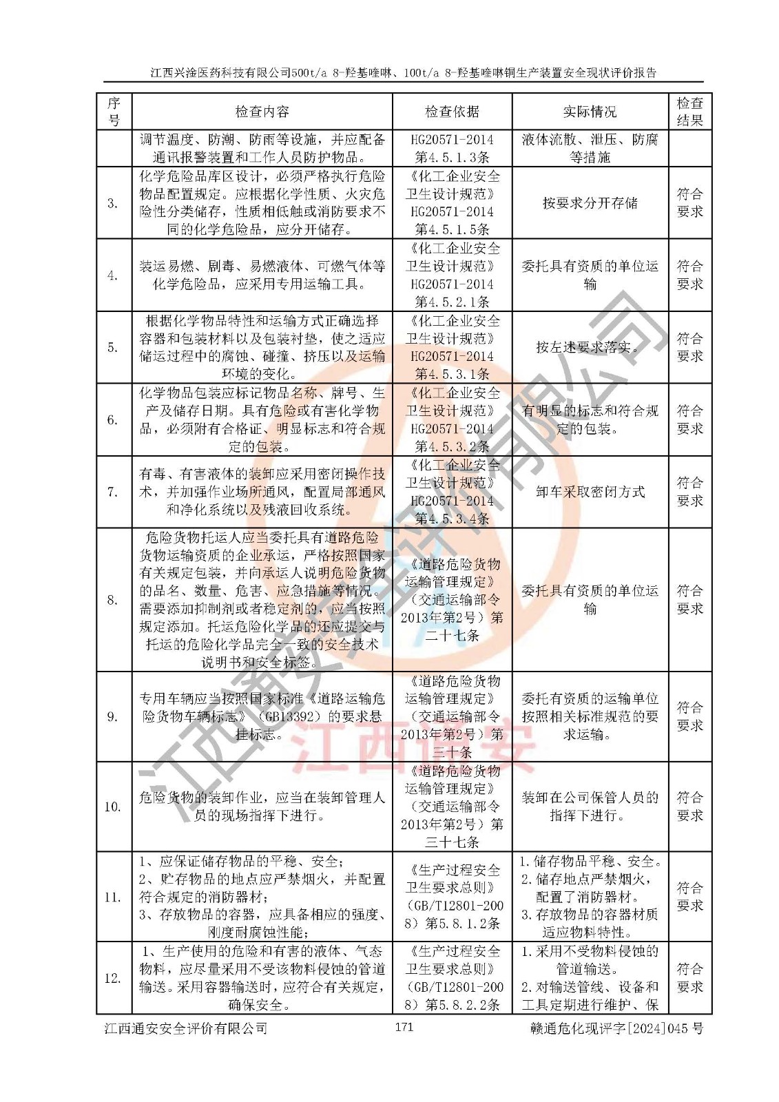 評價結(jié)論 | 評價結(jié)論:本報告認(rèn)為,江西興淦醫(yī)藥科技有限公司500t/a 8-羥基喹啉、100t/a 8-羥基喹啉銅生產(chǎn)裝置現(xiàn)場情況與設(shè)計圖紙一致,自動控制系統(tǒng)設(shè)計符合要求且運行正常,有關(guān)從業(yè)人員資質(zhì)符合《江西省危險化學(xué)品安全專項整治三年行動實施方案》要求,安全設(shè)施及安全管理符合**及有關(guān)部門關(guān)于安全生產(chǎn)法律、法規(guī)、標(biāo)準(zhǔn)的要求,安全設(shè)施正常投用且運行**,安全風(fēng)險是可以控制的,其風(fēng)險程度是可以接受的,安全現(xiàn)狀符合安全生產(chǎn)條件,能夠滿足安全生產(chǎn)的要求。 | |||